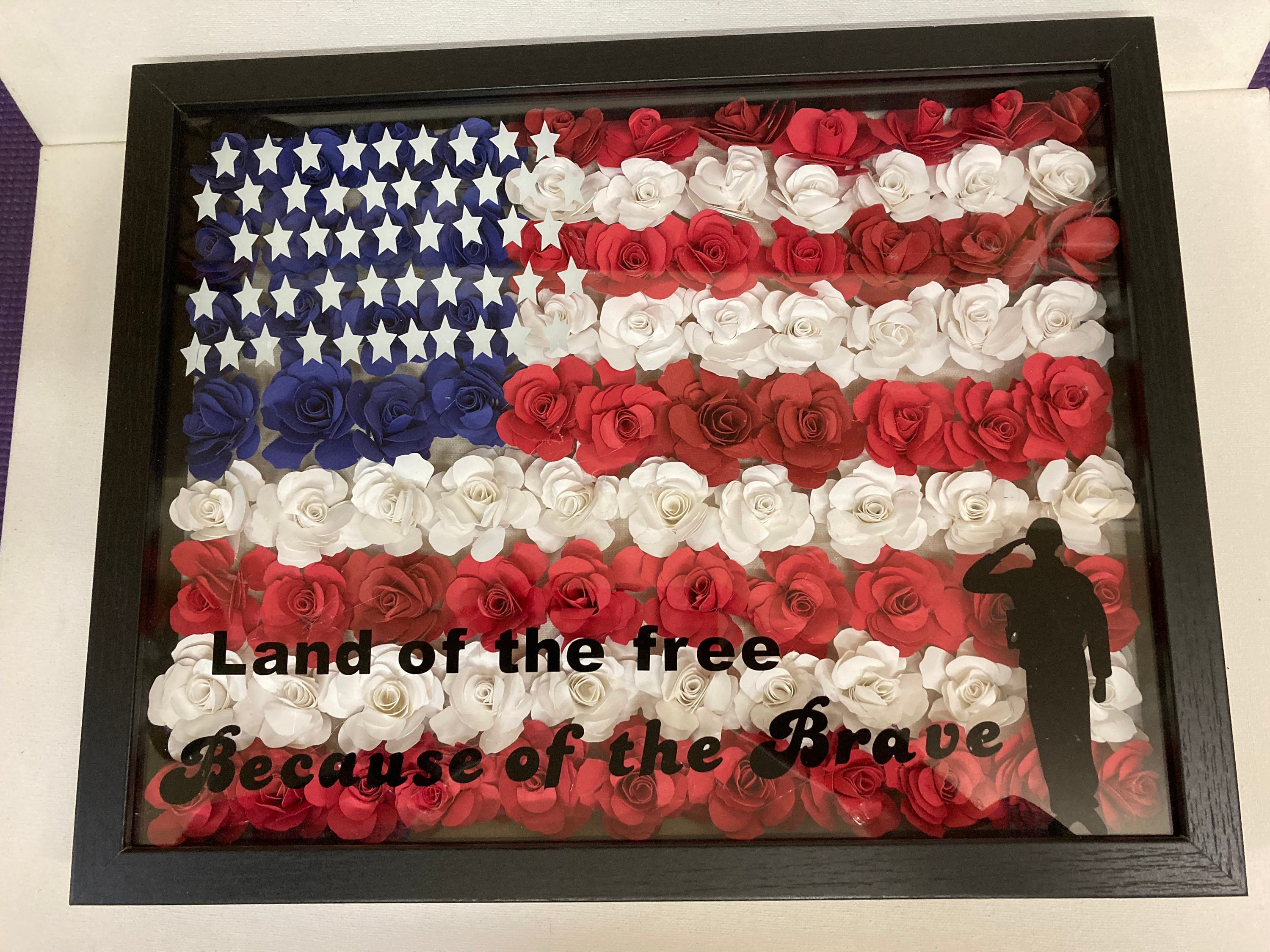 USA Patriotic Decor, American Flag Flower Shadow box, Red White & BlueLand Of Free,Because Of the Brave