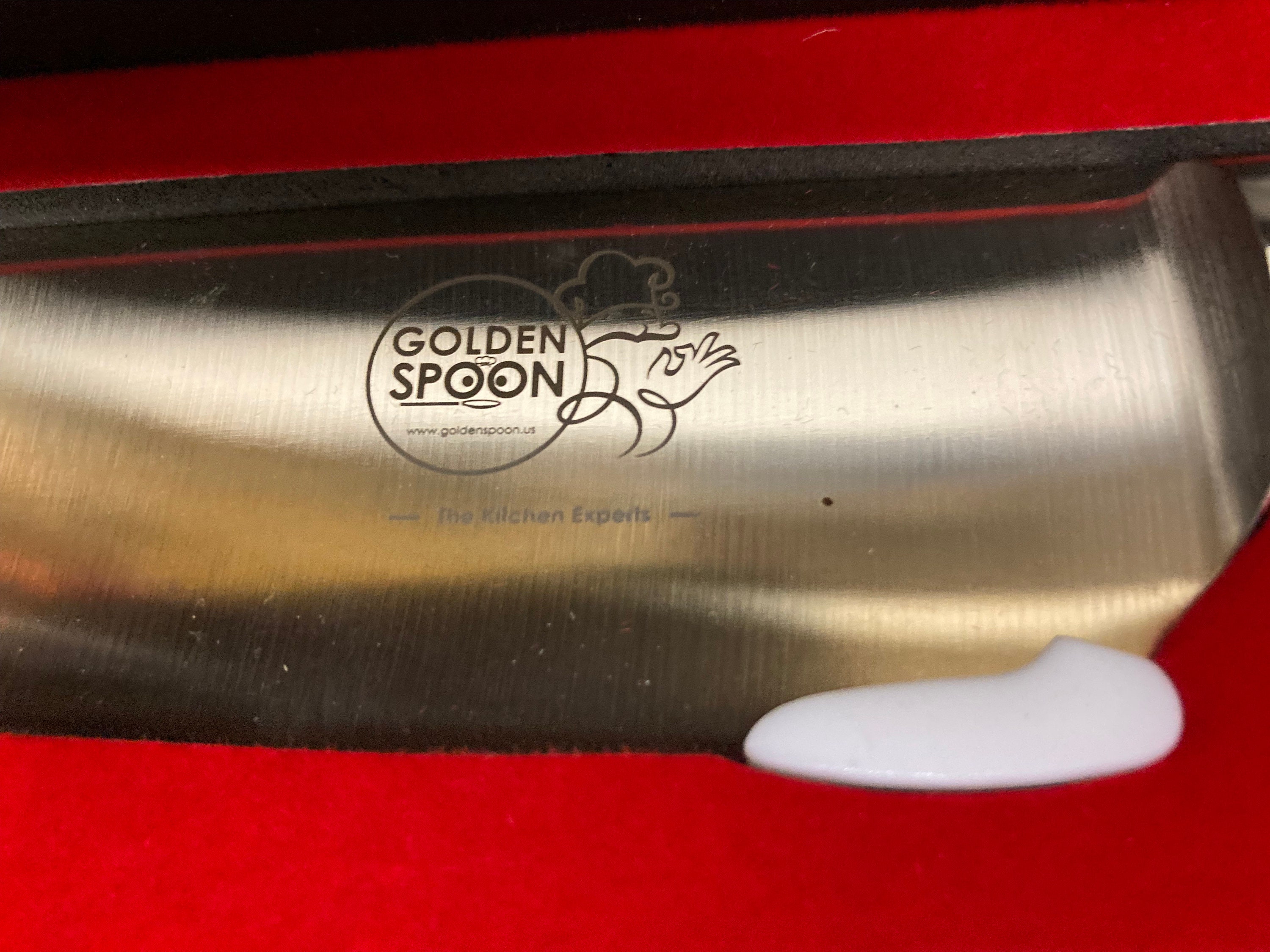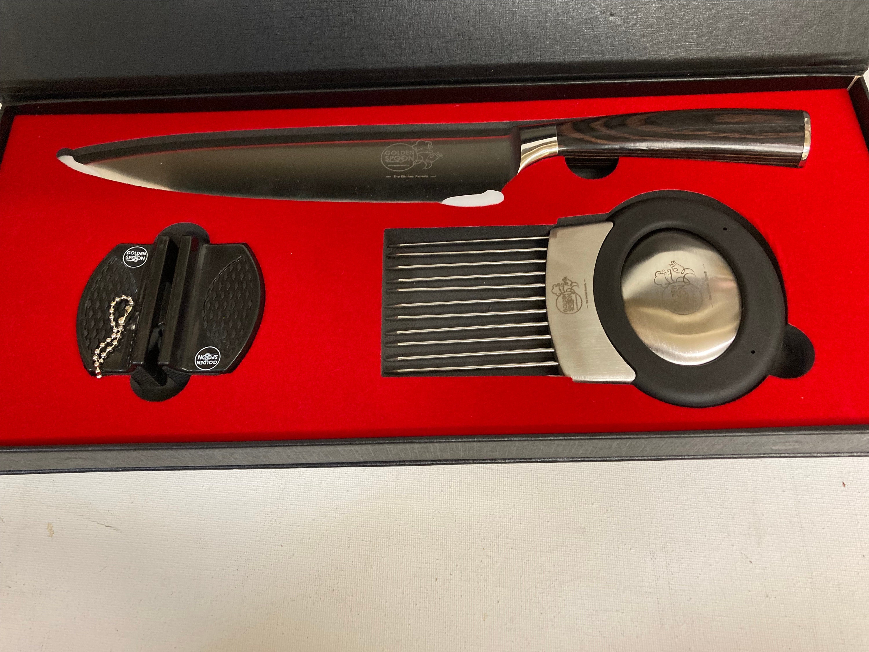 1)8" inch Chef Knife Kitchen Knives Cutting ToolChef Knife Stylish PatternSanding Stainless Steel Sharp 2)Shapner3)Meat TenderizerAll in A Gift Box