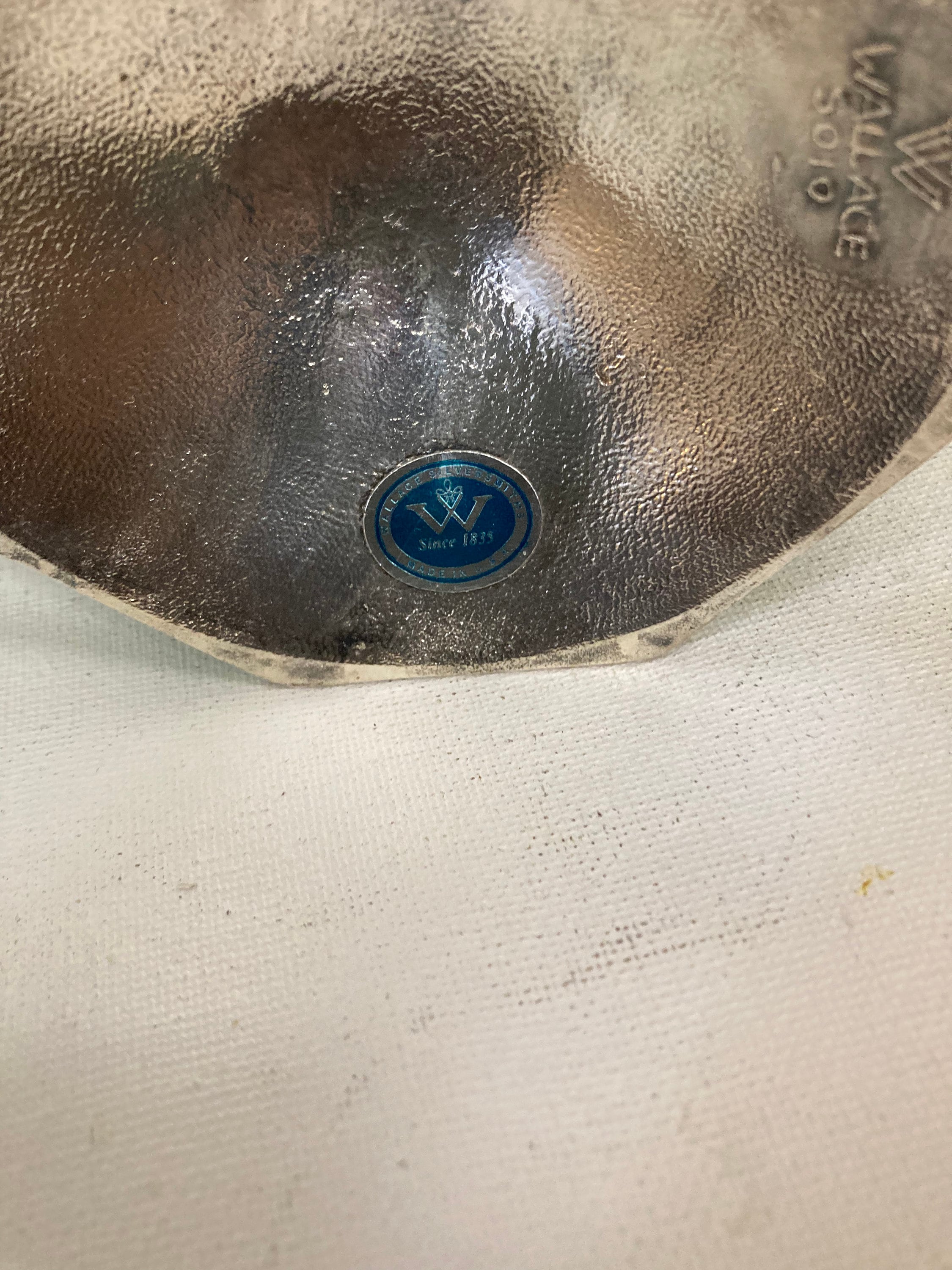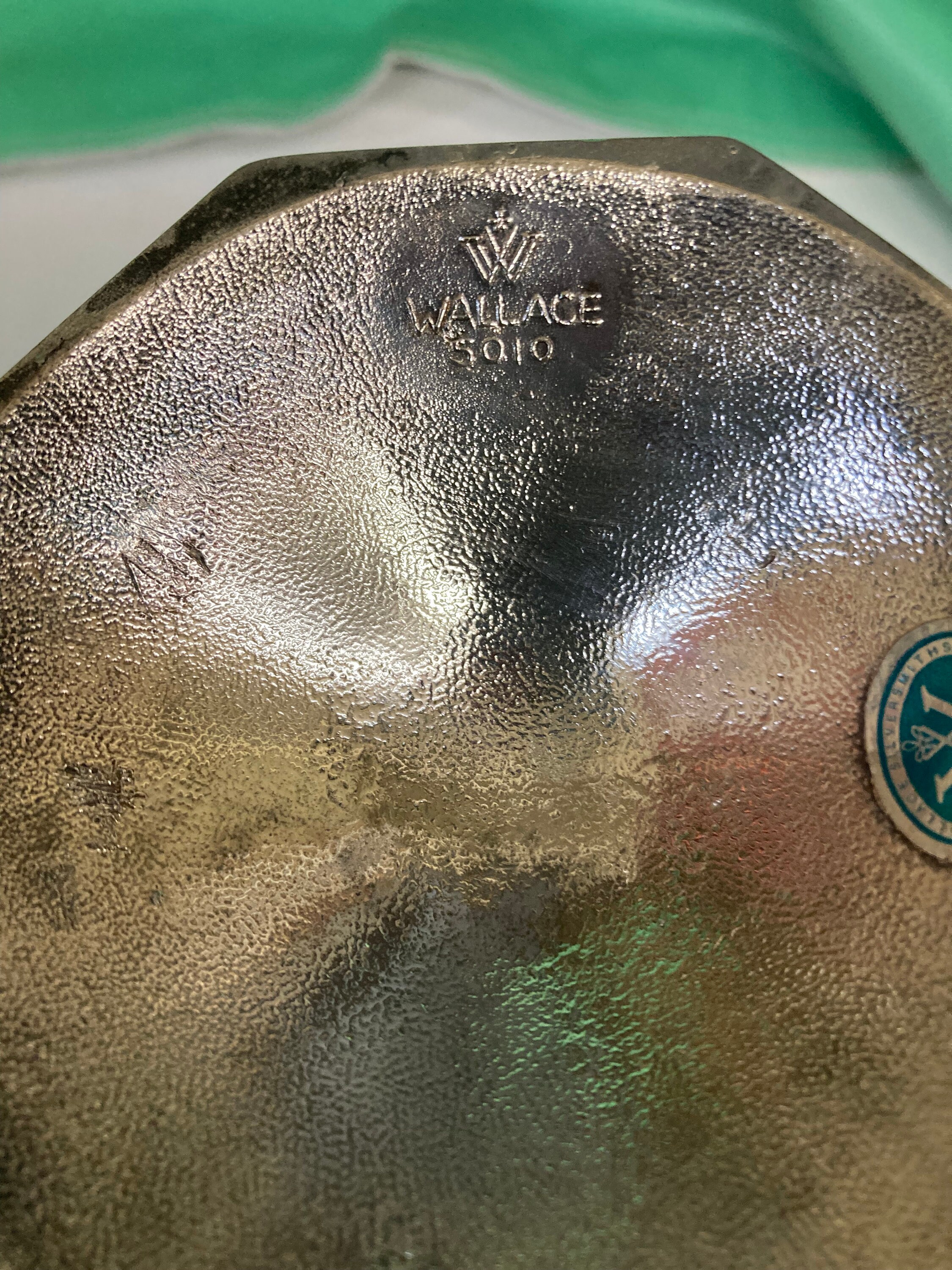 This listing is for a wonderful pair of vintage Wallace Bros Silver Co (as signed on the base) 8" tall and 3 3/4 " at base.candlestick holders that have a wonderful Art Deco design. These are silver plated and also have hand engraved and stamped codes on the bottom. The stamped code is 5010 . These come as you see pictured in the listing and noted above. Each candlestick has a weight of approx 2.5 lbs so they are weighted as well. Needs a Good Polish