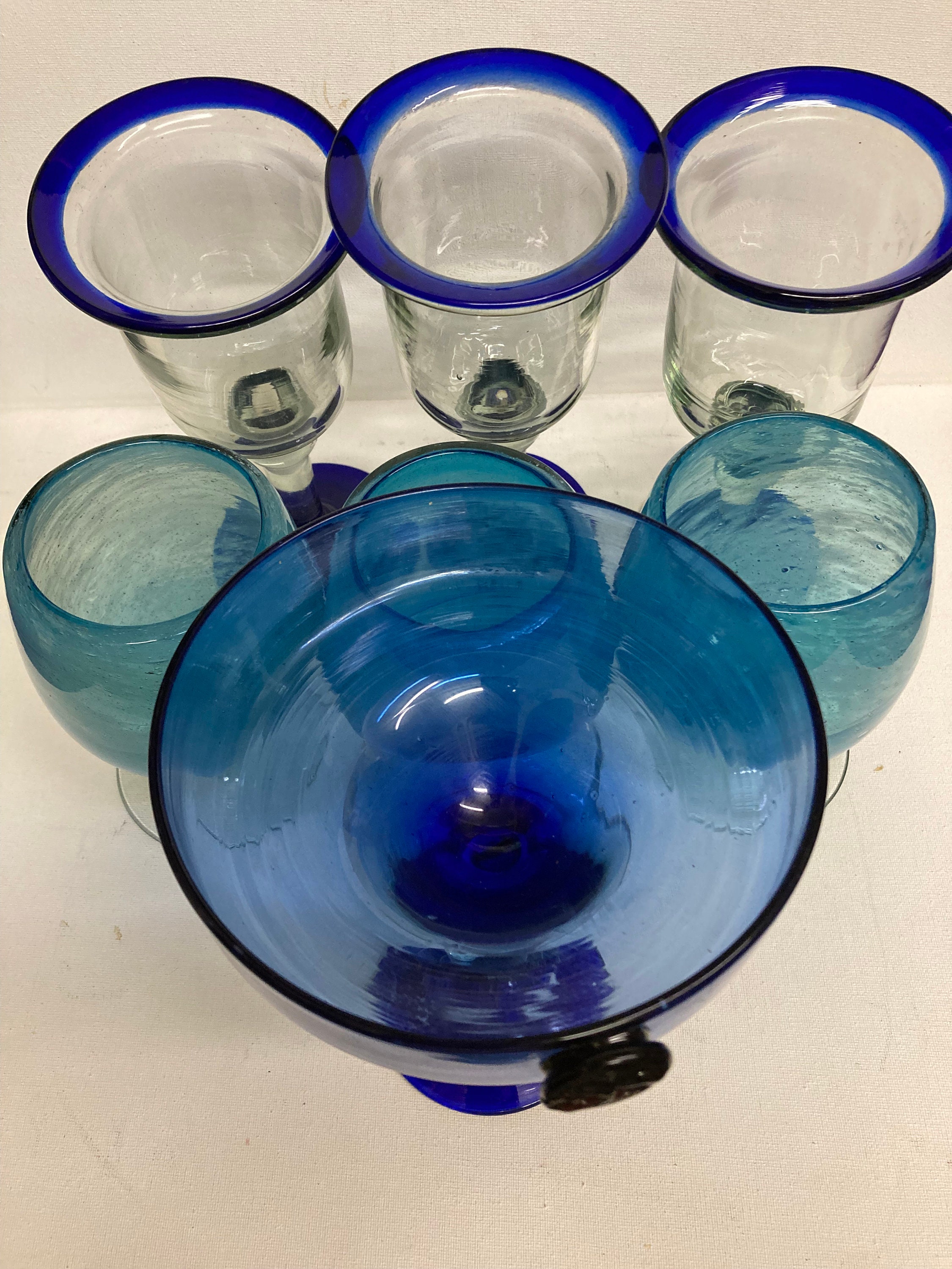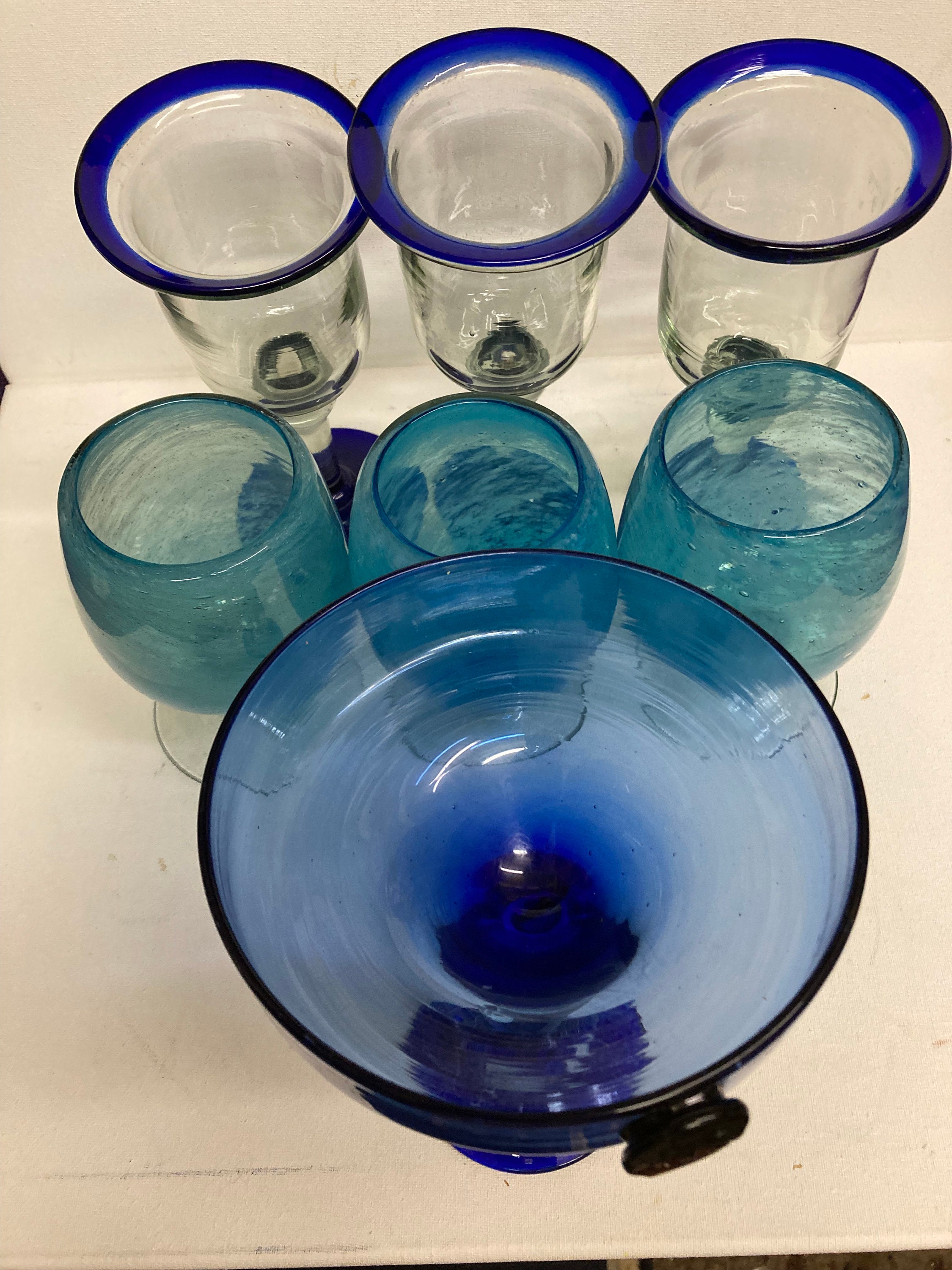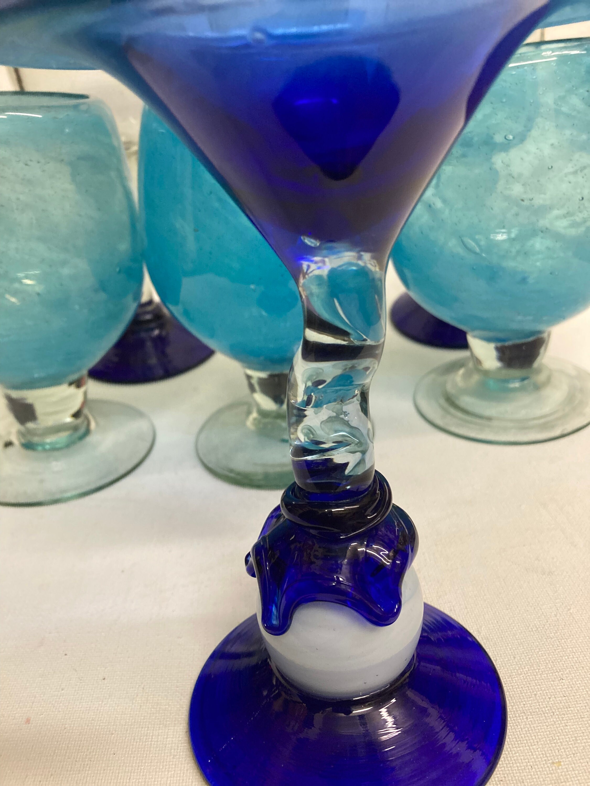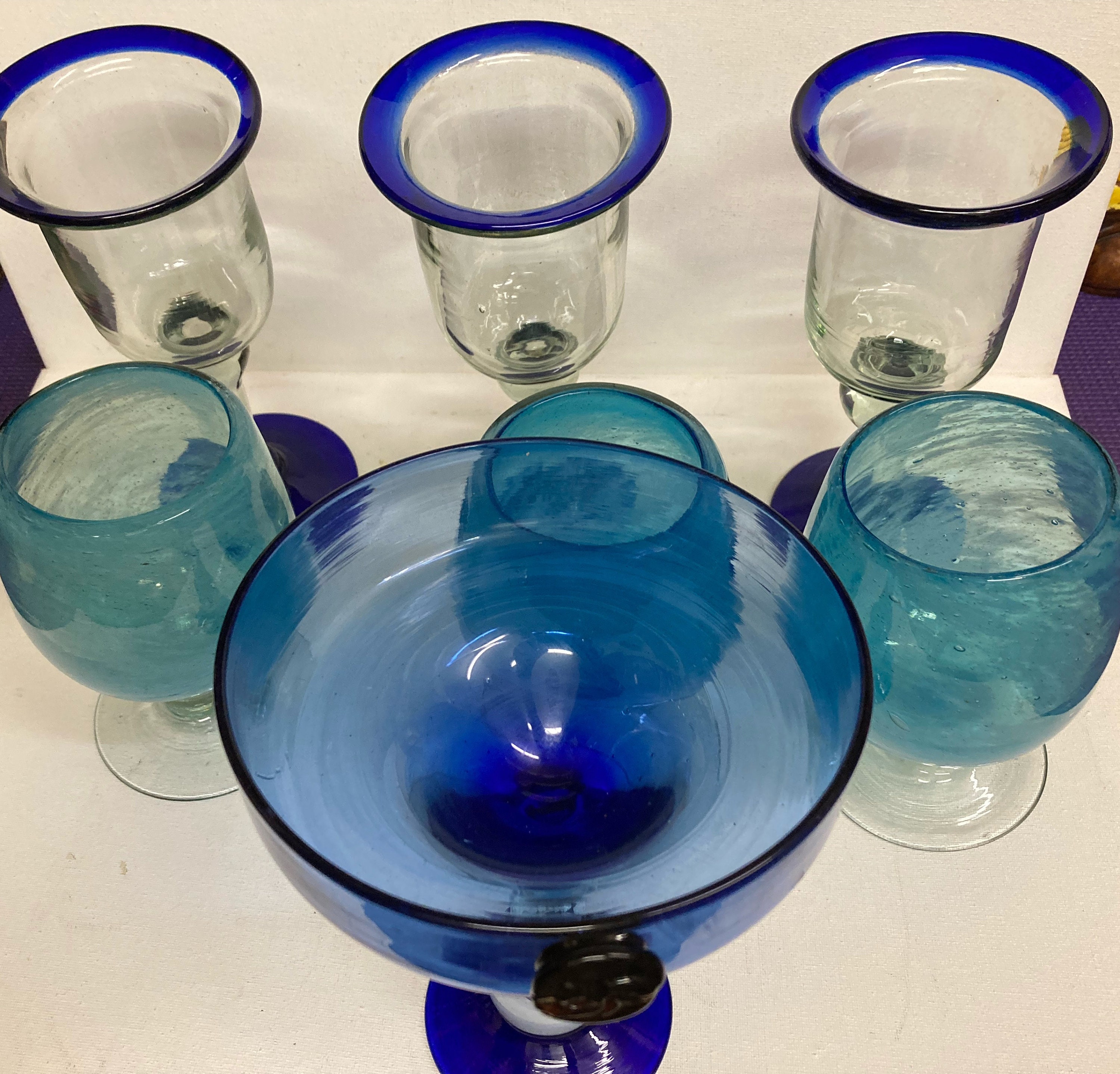 One Tall Blue , Clear and White Glass .possible use of fruit cocktail, or Martini 8 x 5.5 x 3Three Clear and Cobalt Blue Glasses 8 1/4 x 3 3/4 x 3Three Clear and Light Blue Glasses 6x 3.5 x 3