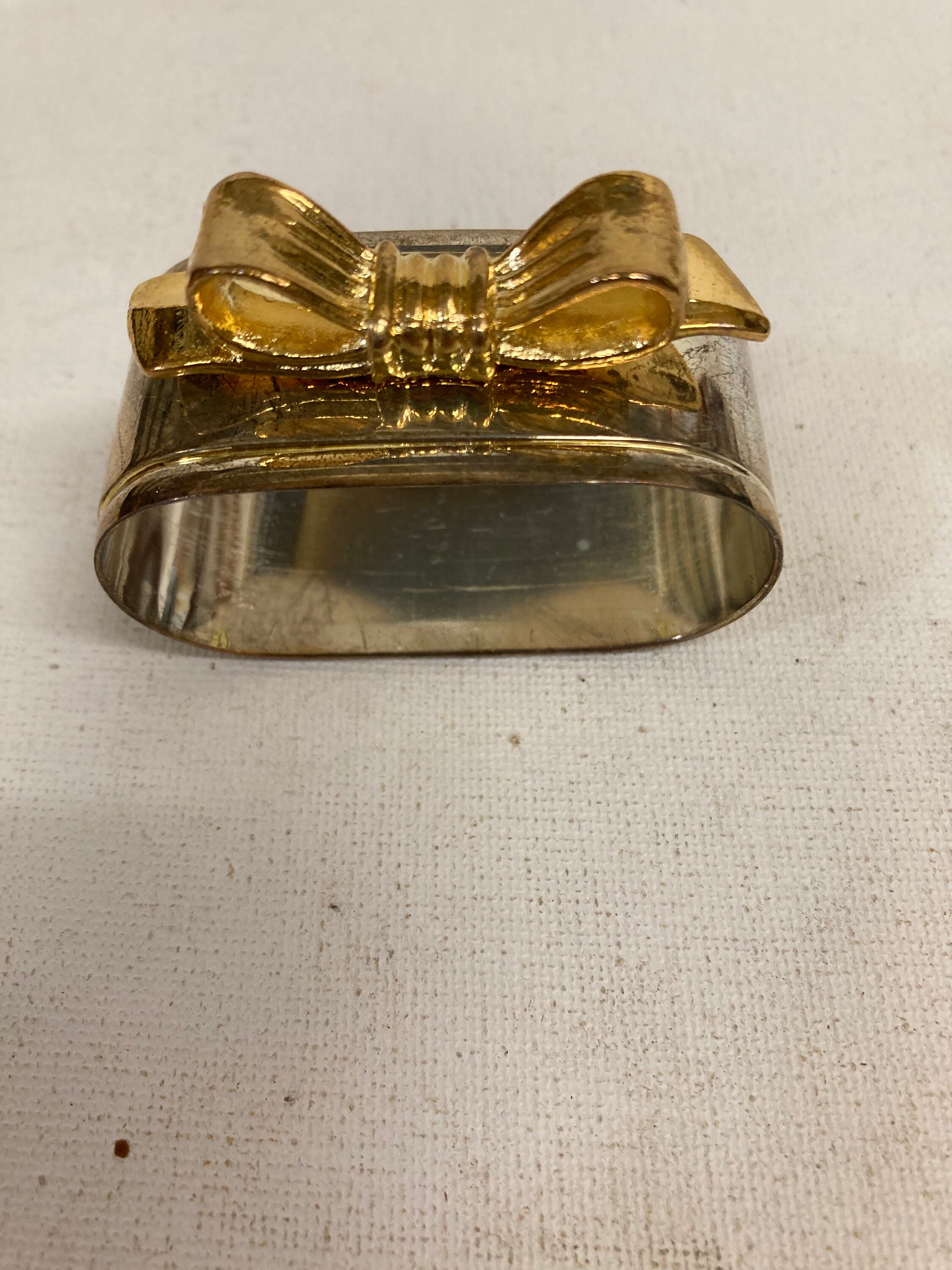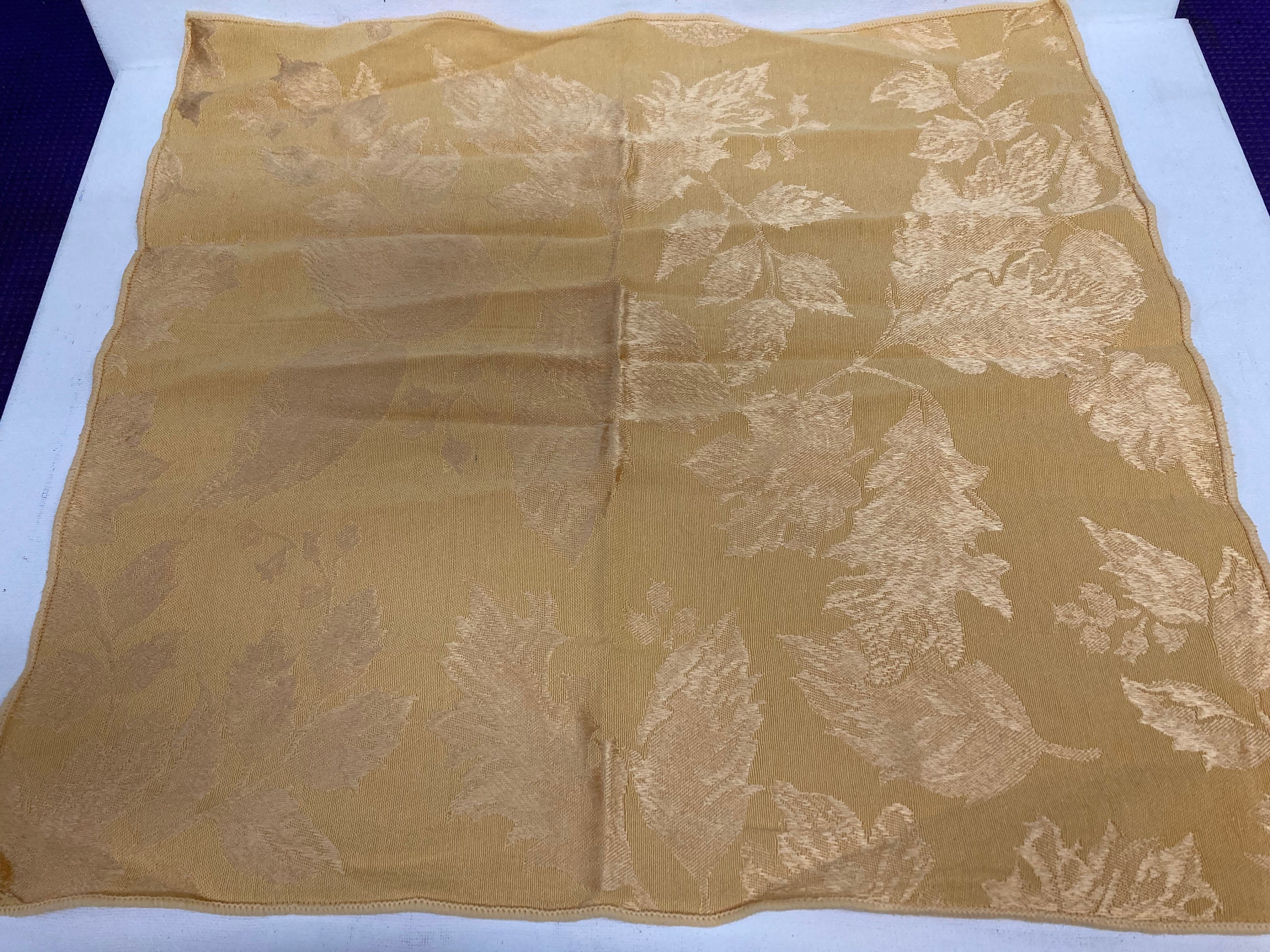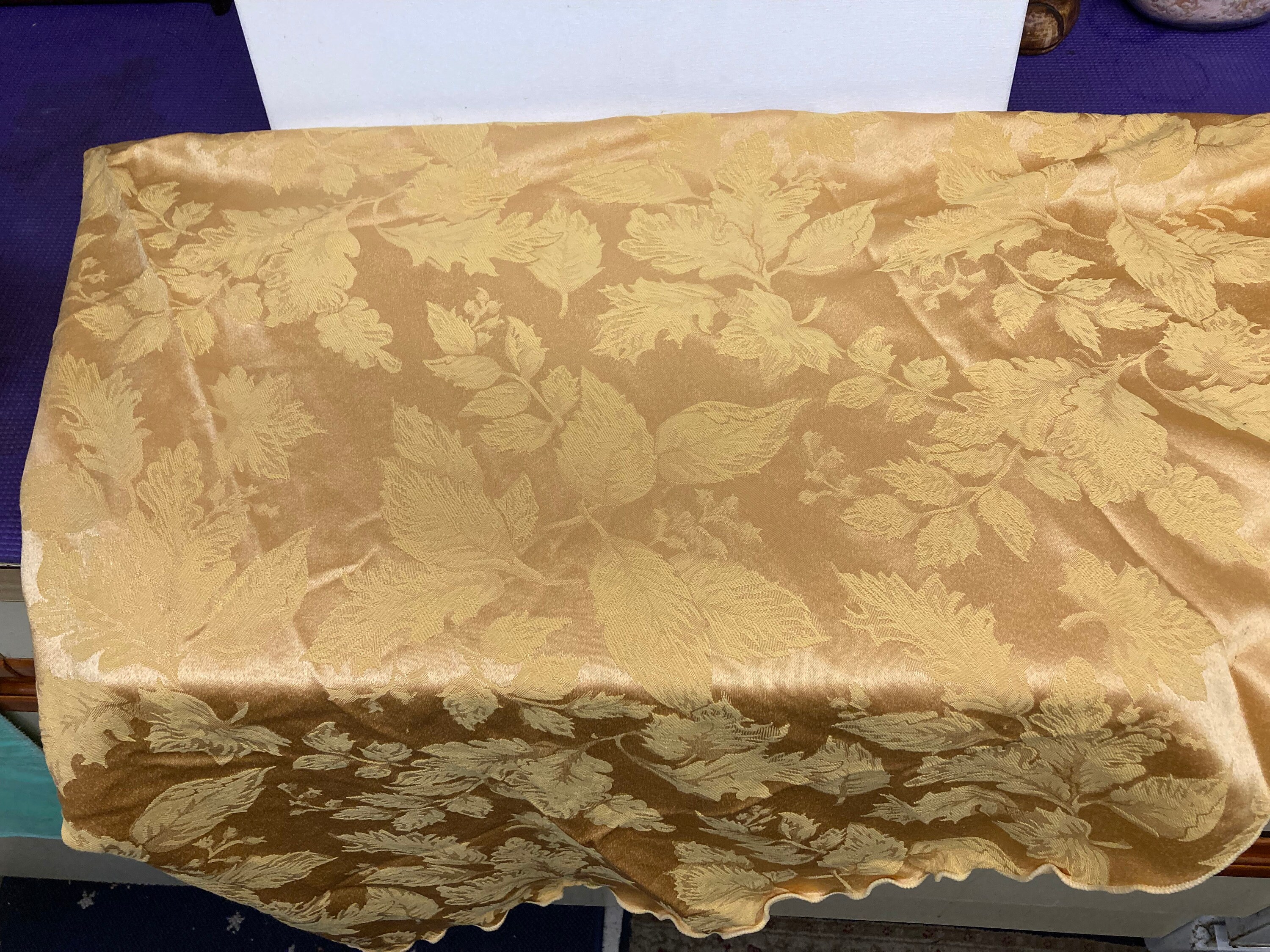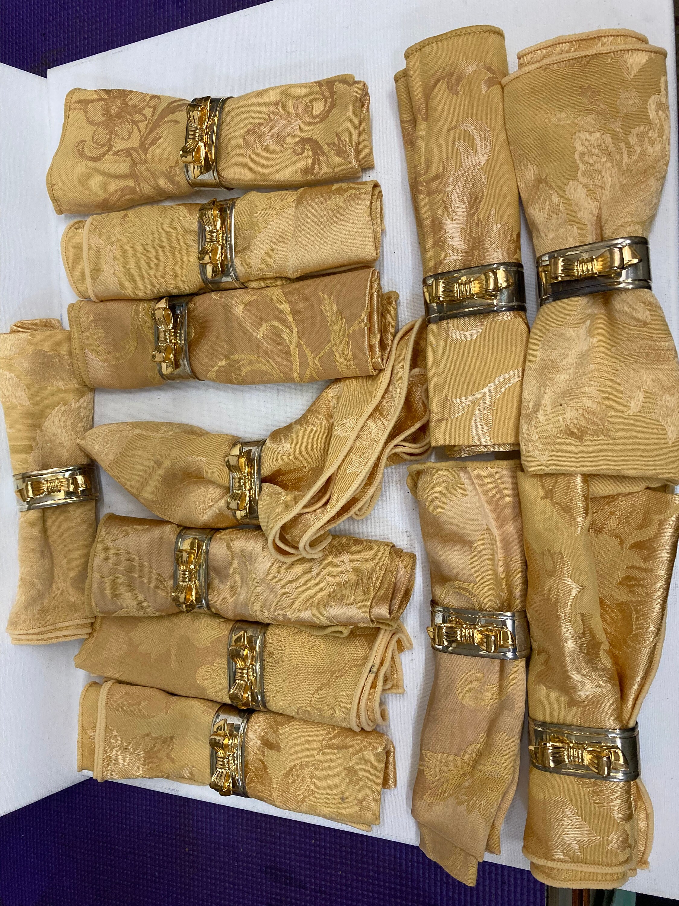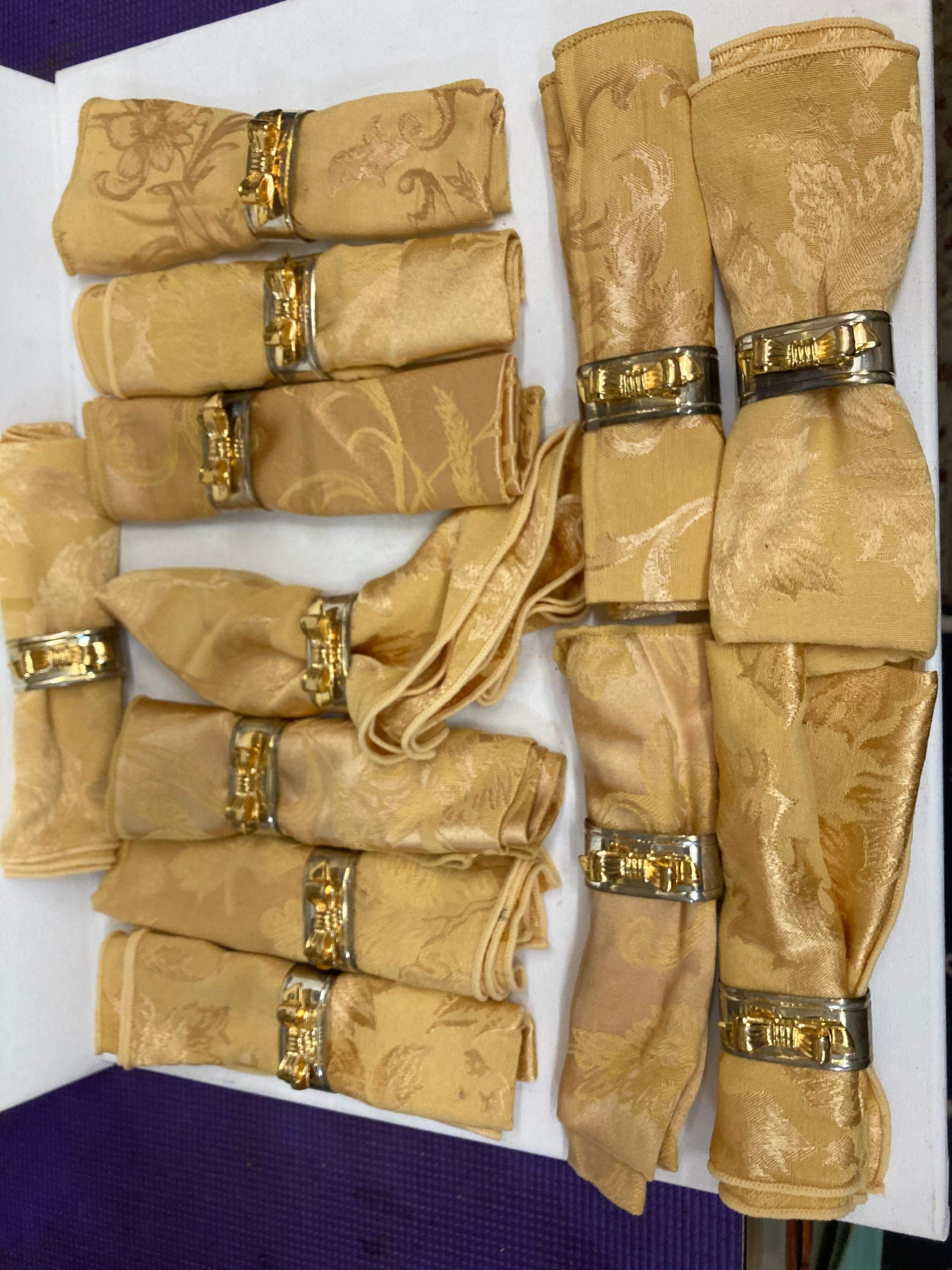 Elegant Gold Color 70 Inch in Diameter Round Table Cloth Comes with 12 Napkins ( 16 x 17) and 12 Silver Plate with Golden Bow RingsUnknown Maker . From an Estate Sale.