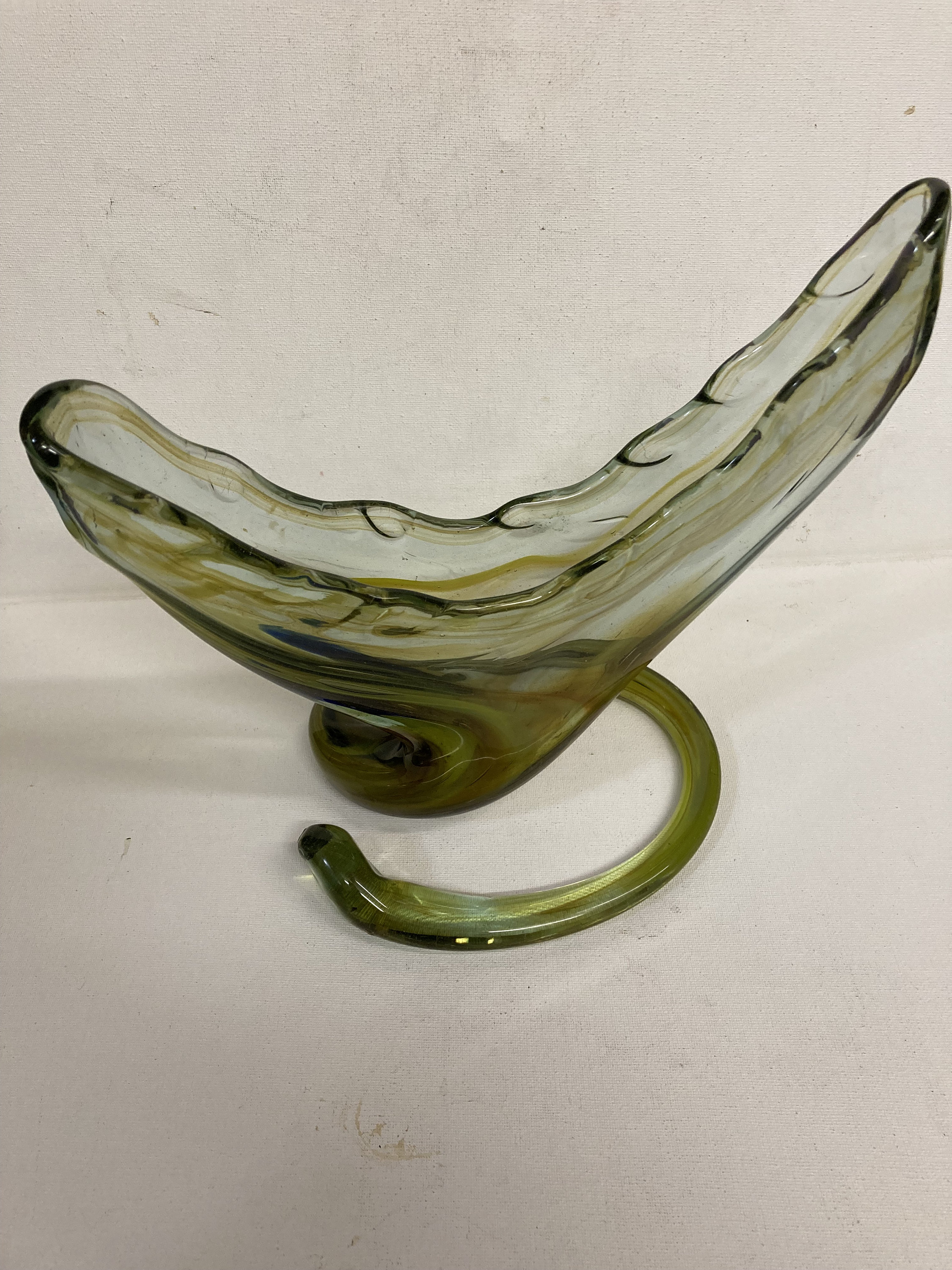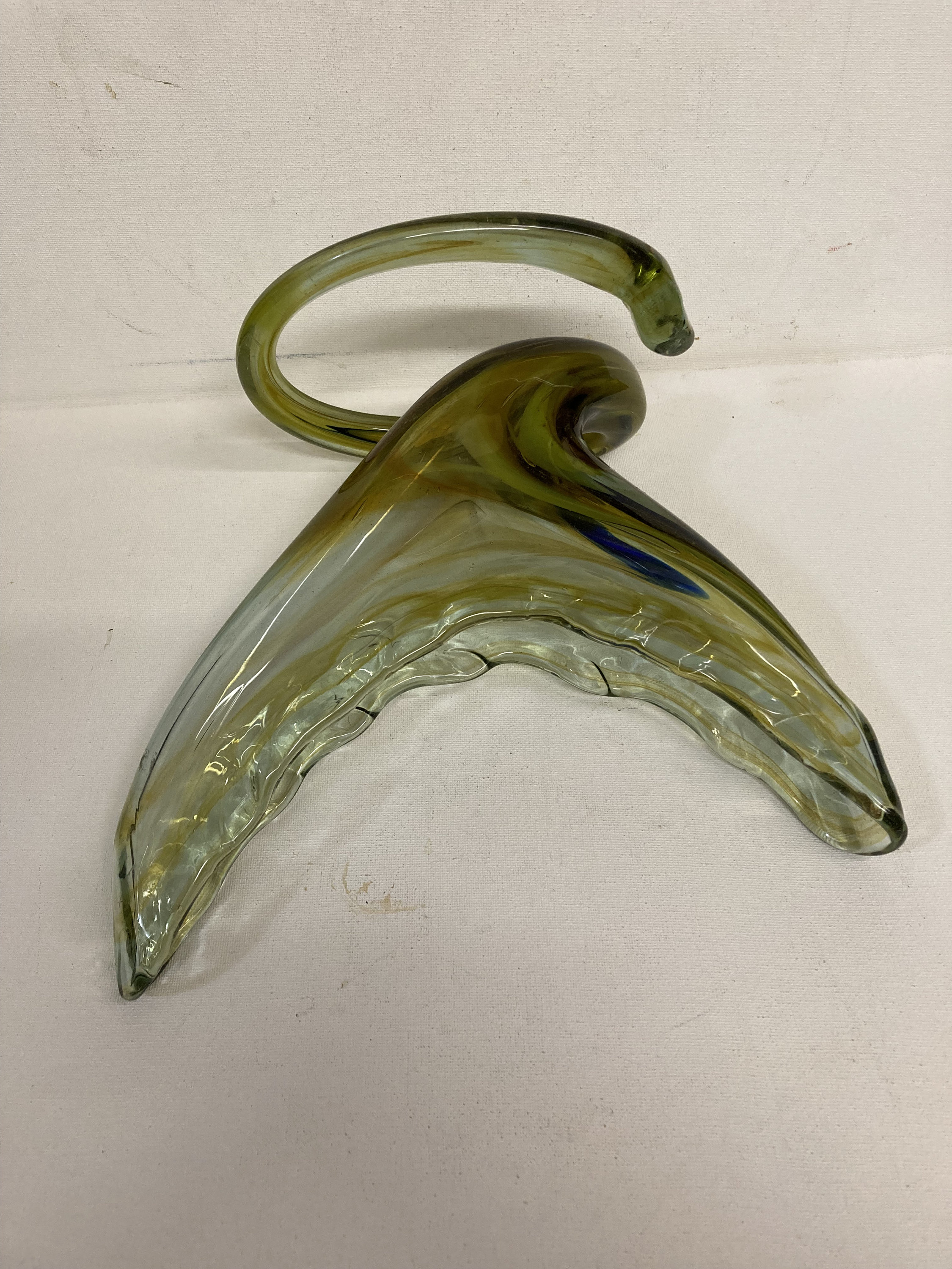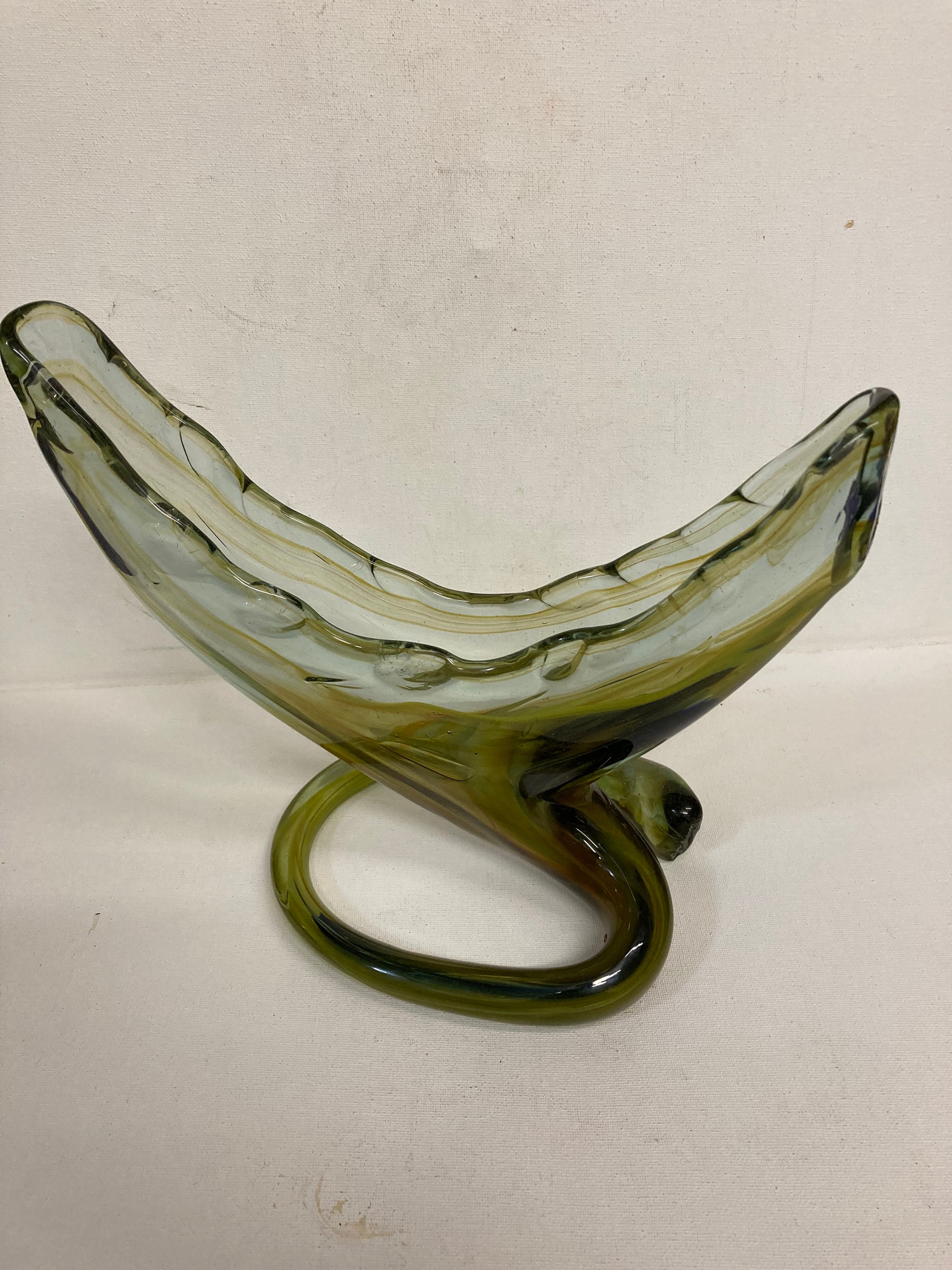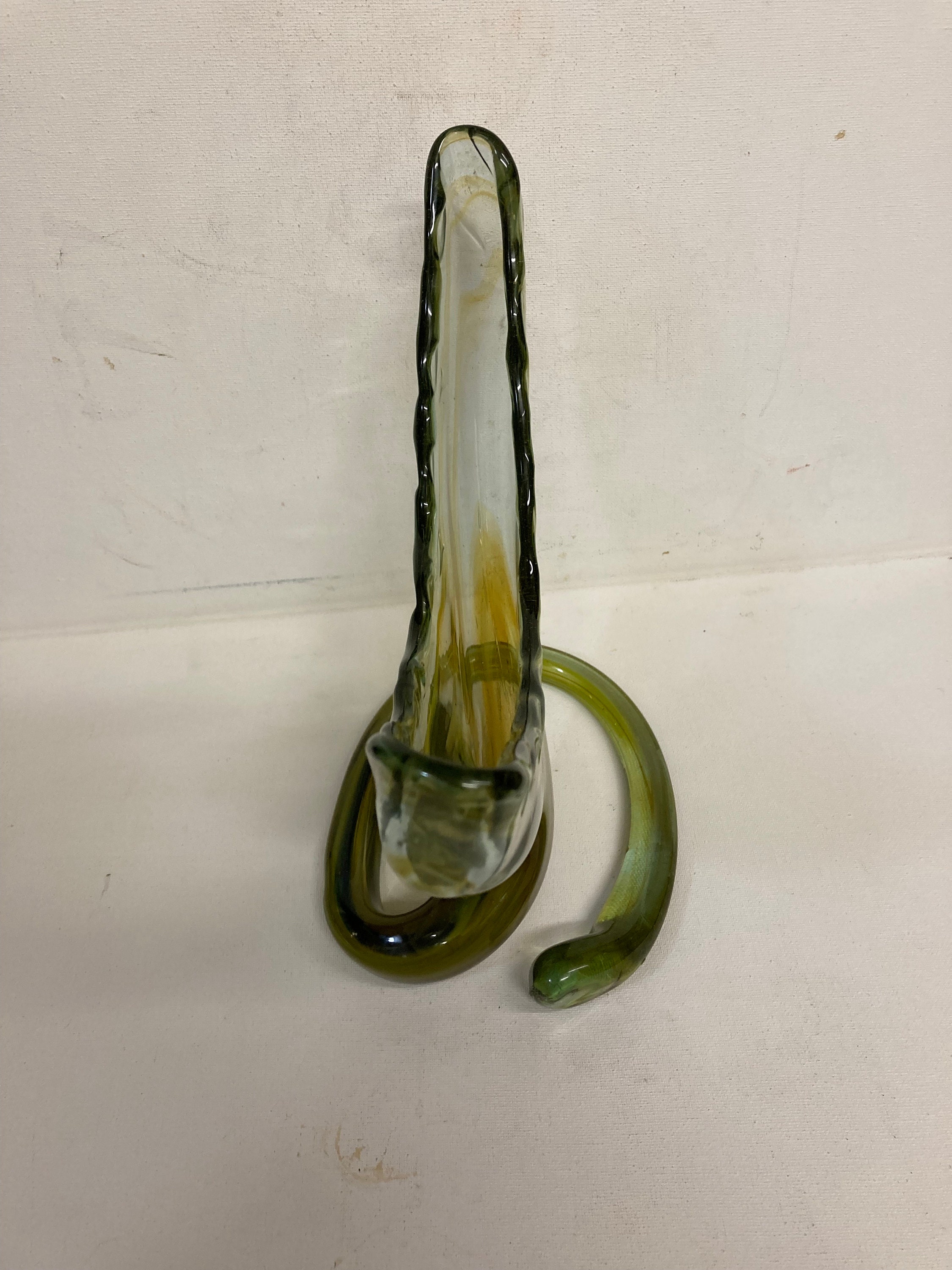 This unusual looking vase is 9.5 " at the top 9 " tall & 6.5 " at the base Mix of different shade of green.Light at the mouth to dark at the base. Unusual for sure, Looks like a hungry sea creature,,,,, but it's art