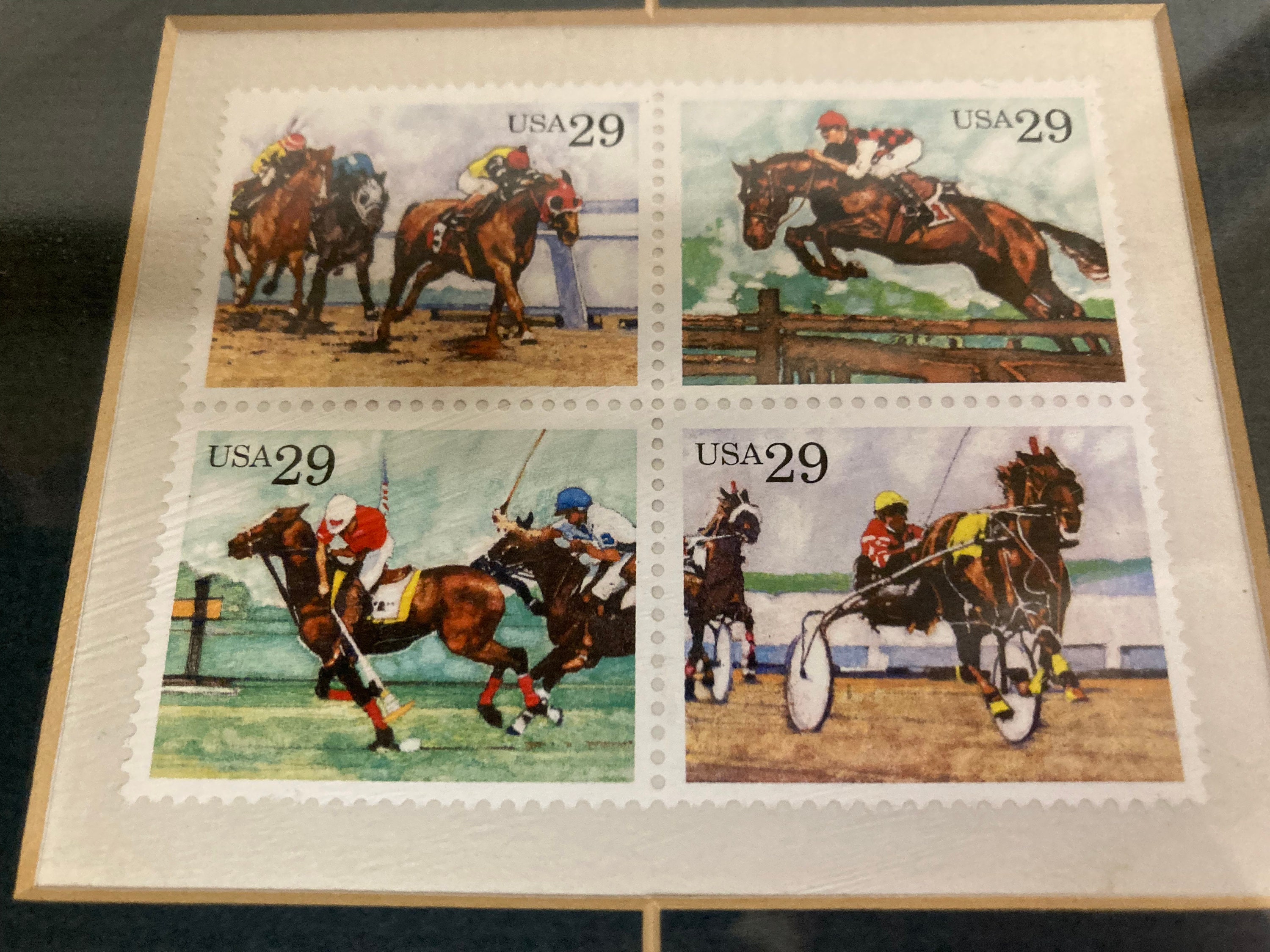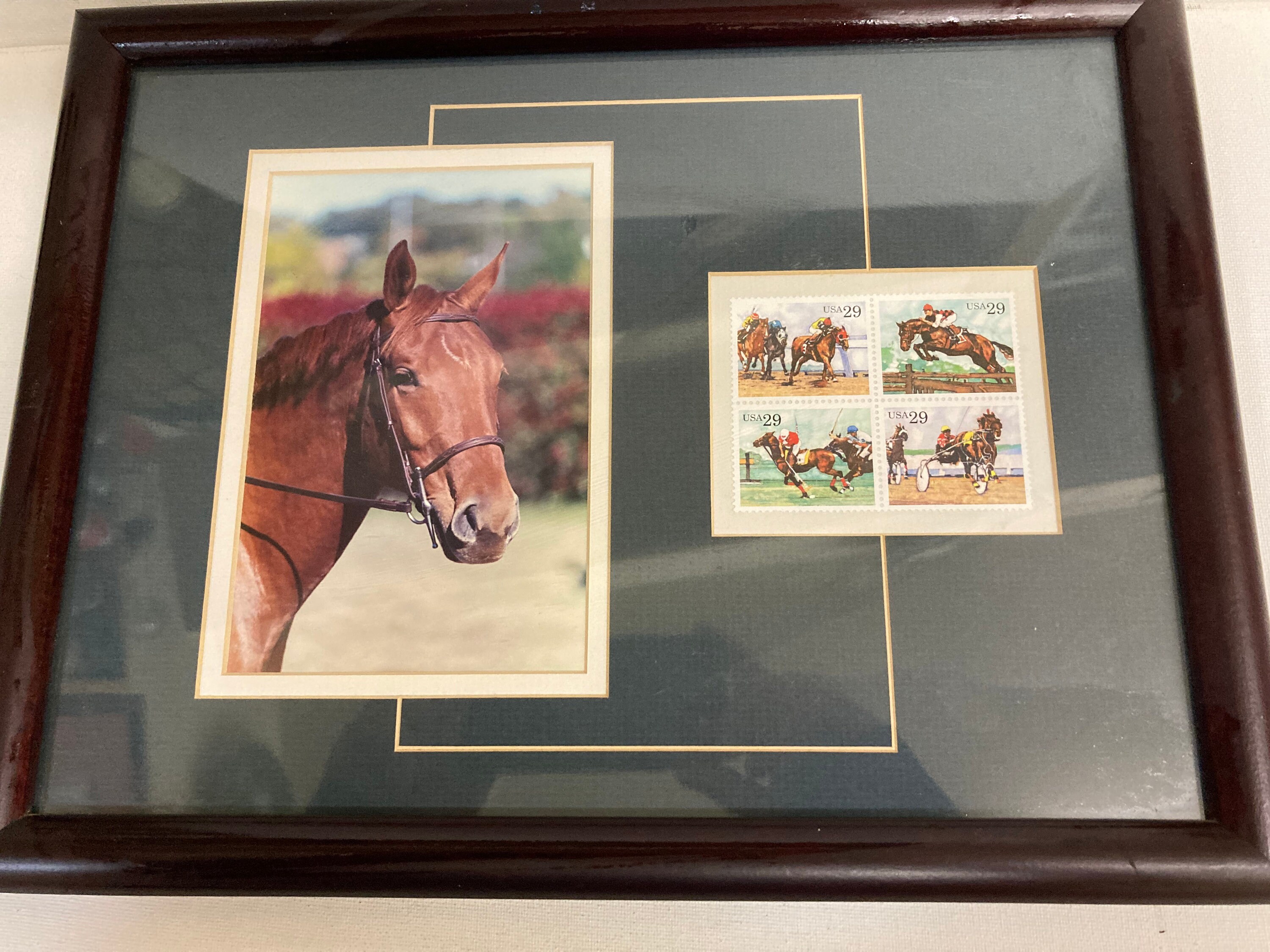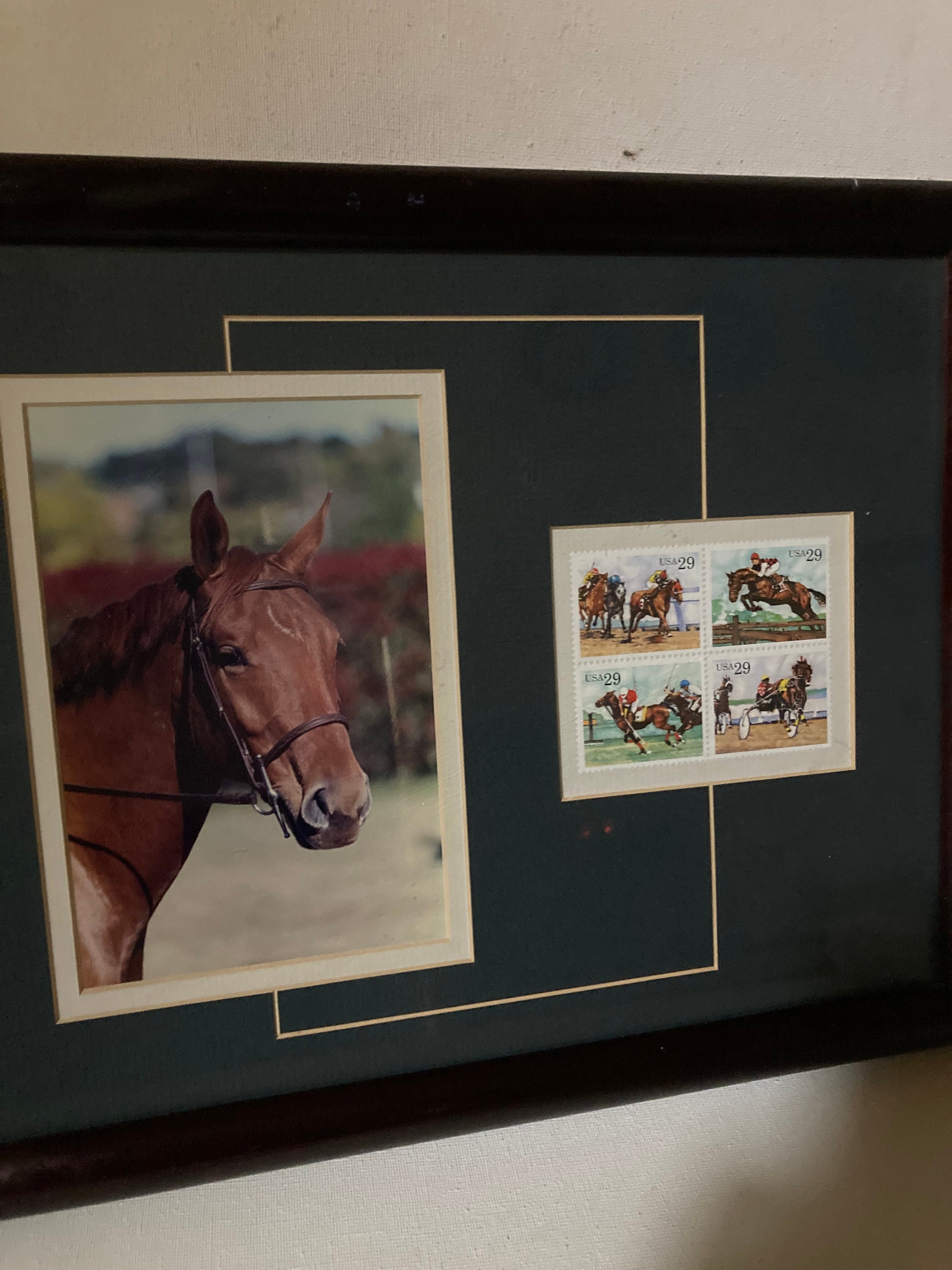 Framed picture of Racing horse with 4 stamps made in 90'sSeeemingly the horse is a Prize winner of Kentucky Derby