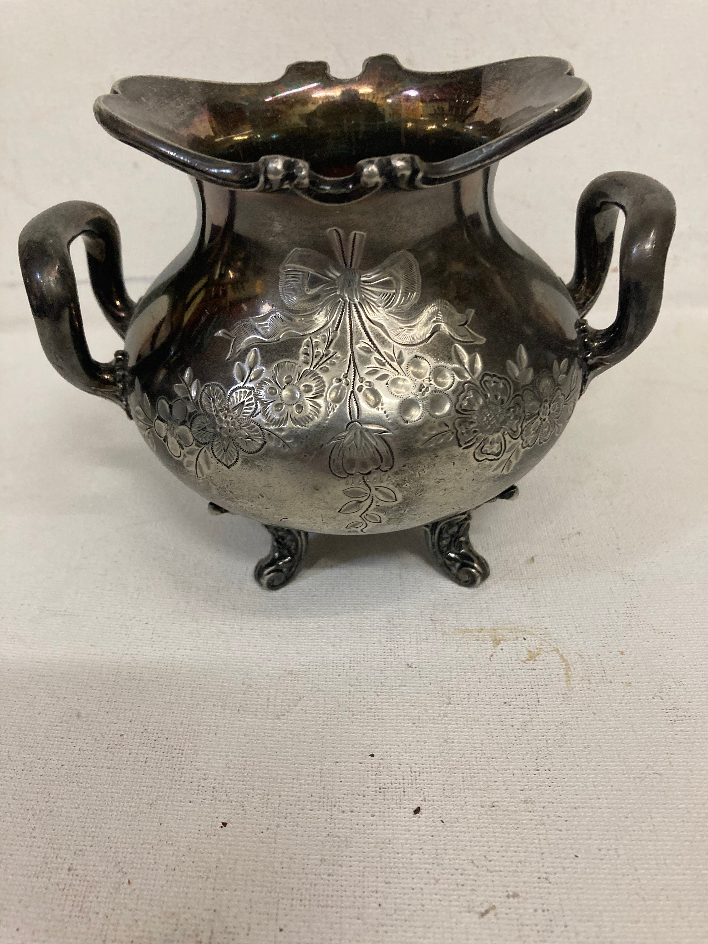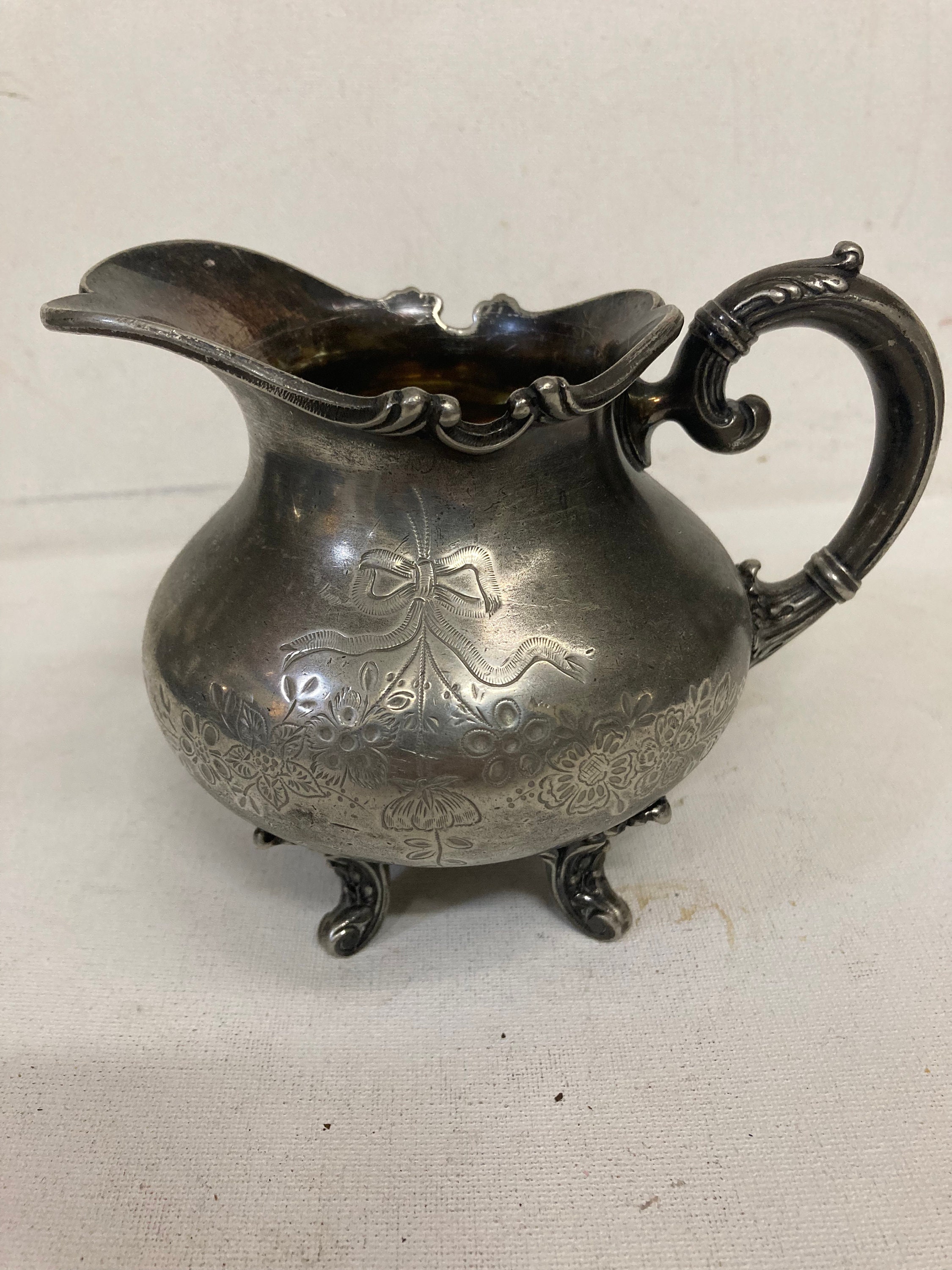 Creamer: 5 3/4" W (handle to spout), 4 1/2" D, 4 3/4" H >>>>>( small dent )