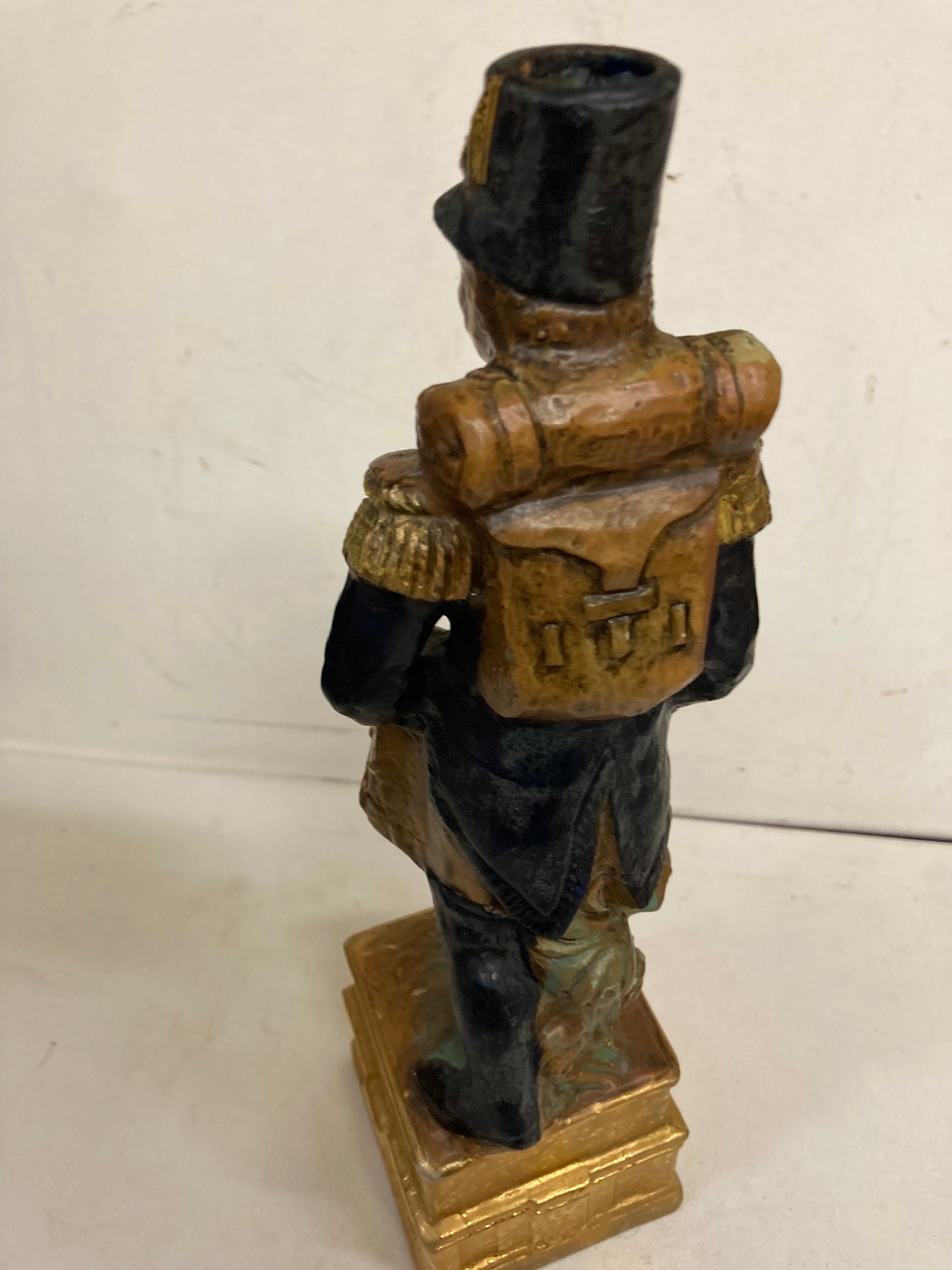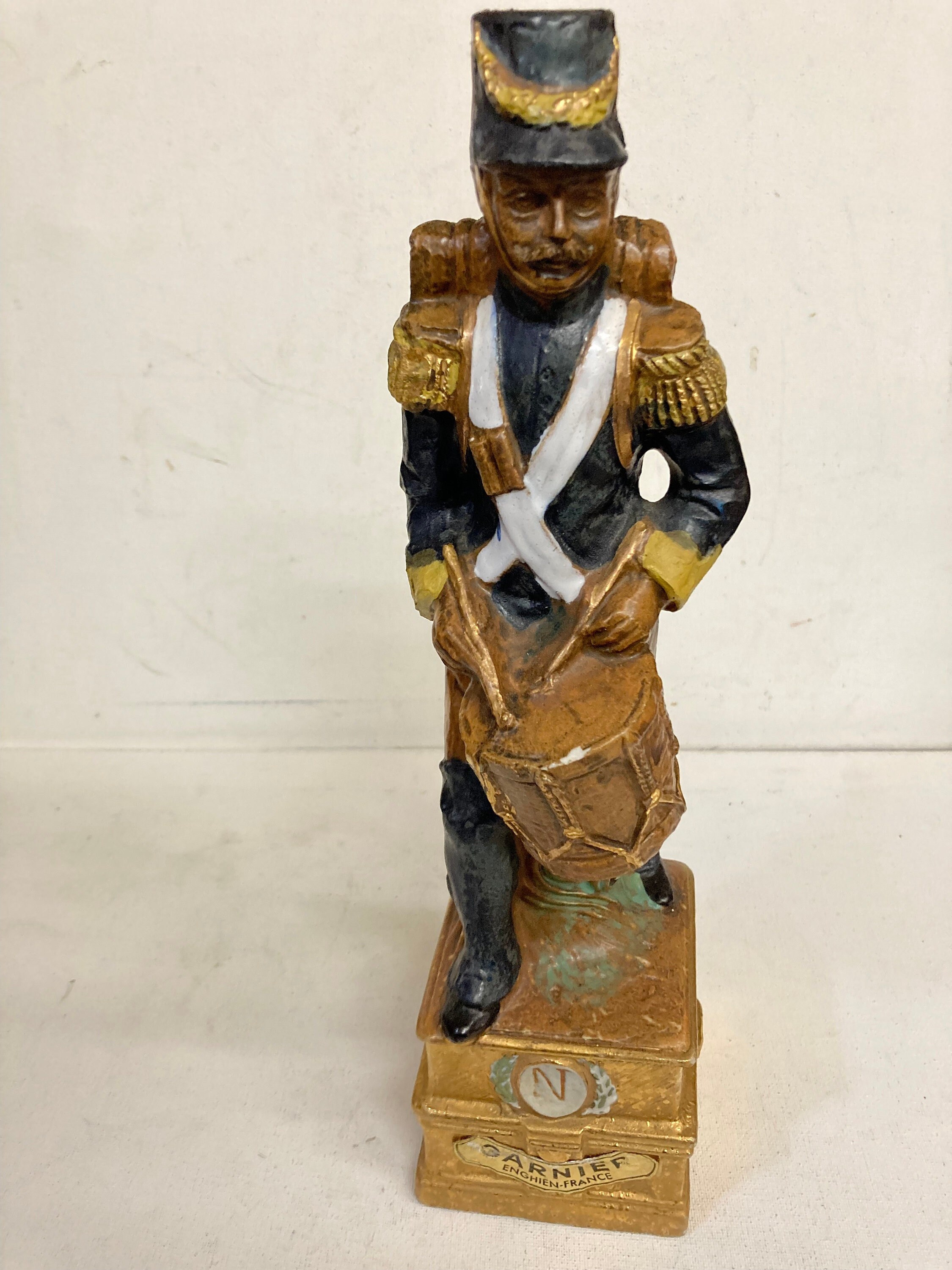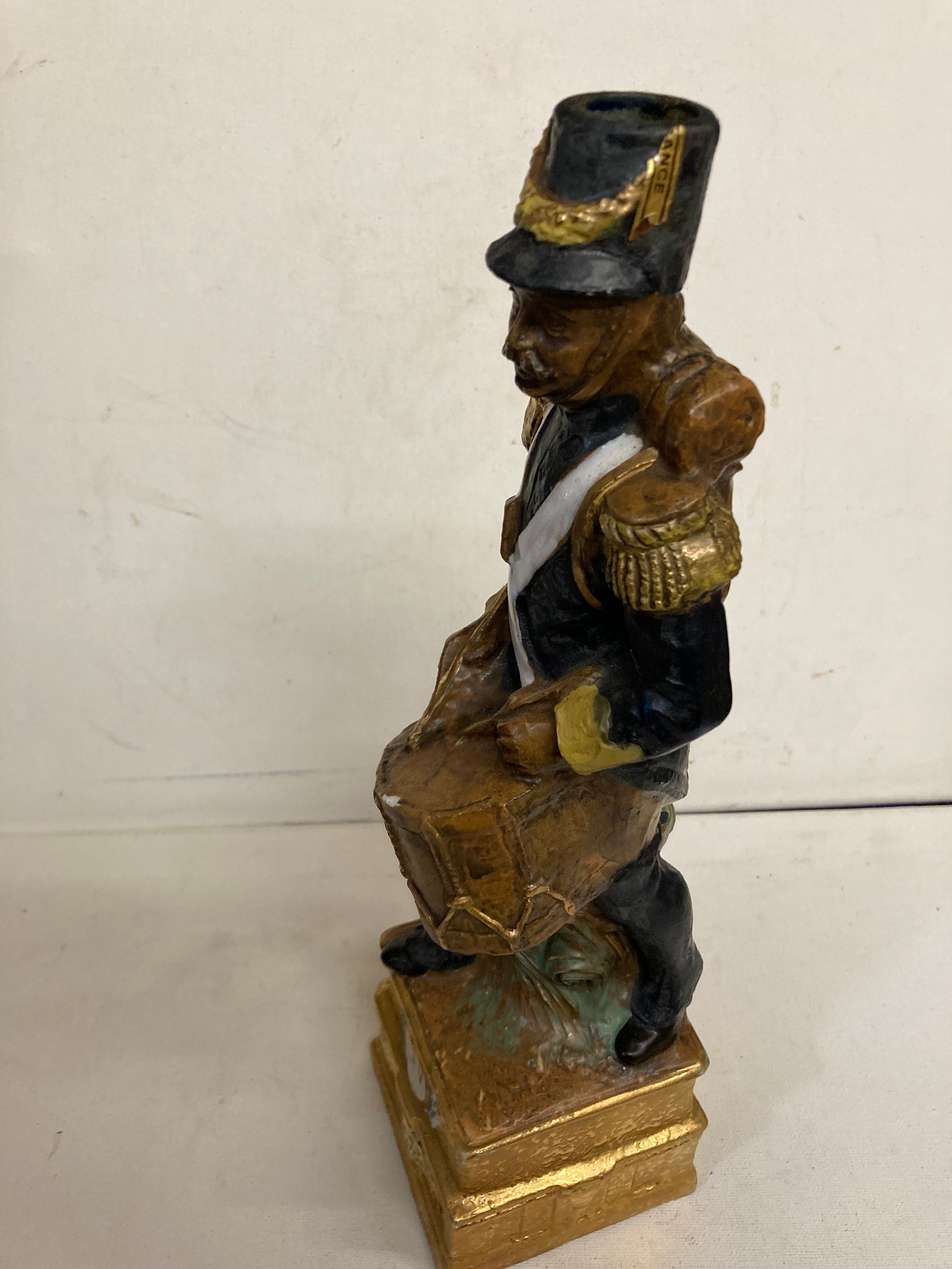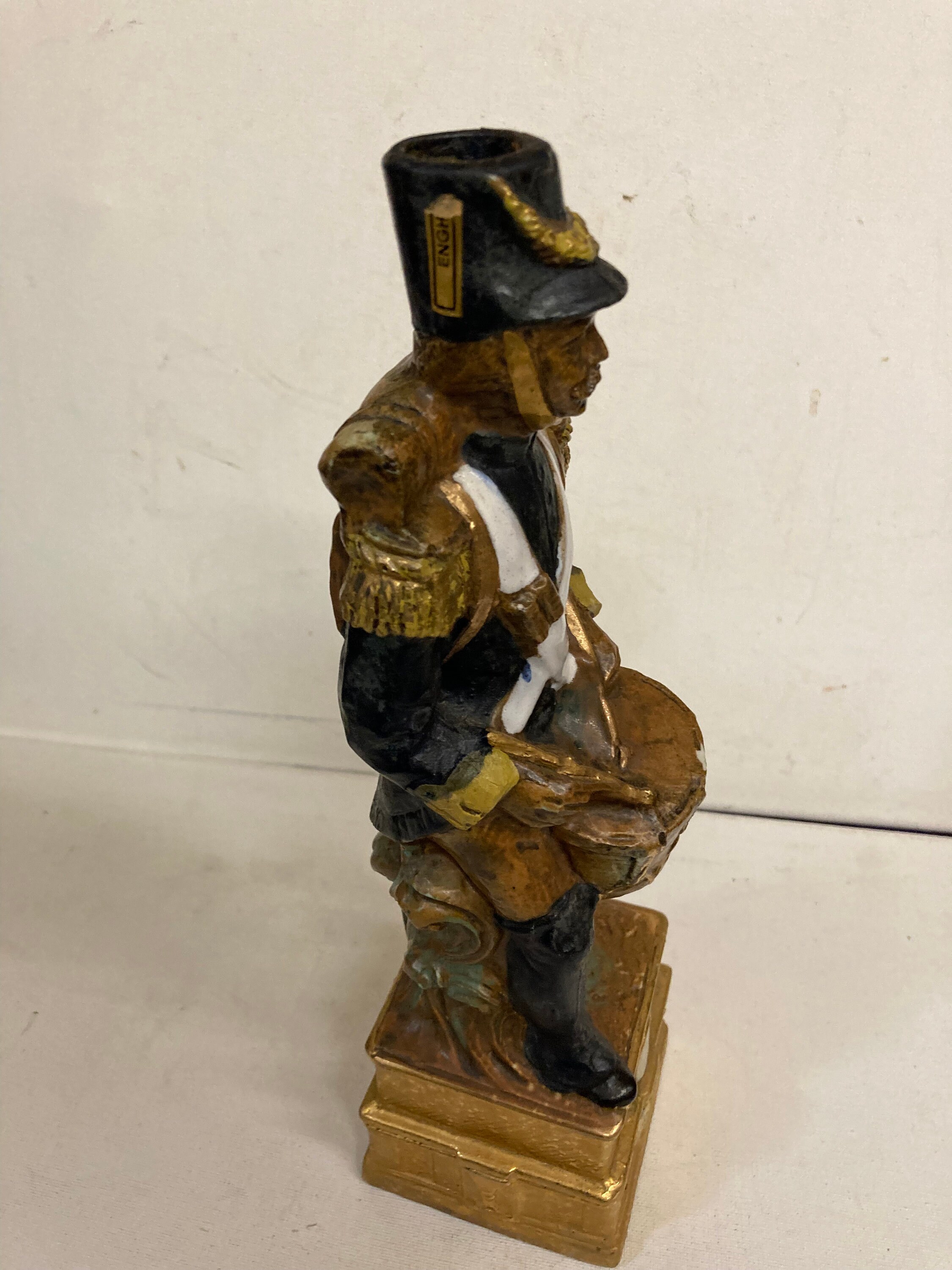 VINTAGE #1970'. / USED NAPOLEON ERA FRENCH SOLDIER -- DRUMMER,Liquor Bottle Decanter Statue, #1970's yrs. Approx. size is: 3.45" inches in length( BASE) x 12.25" inches tall