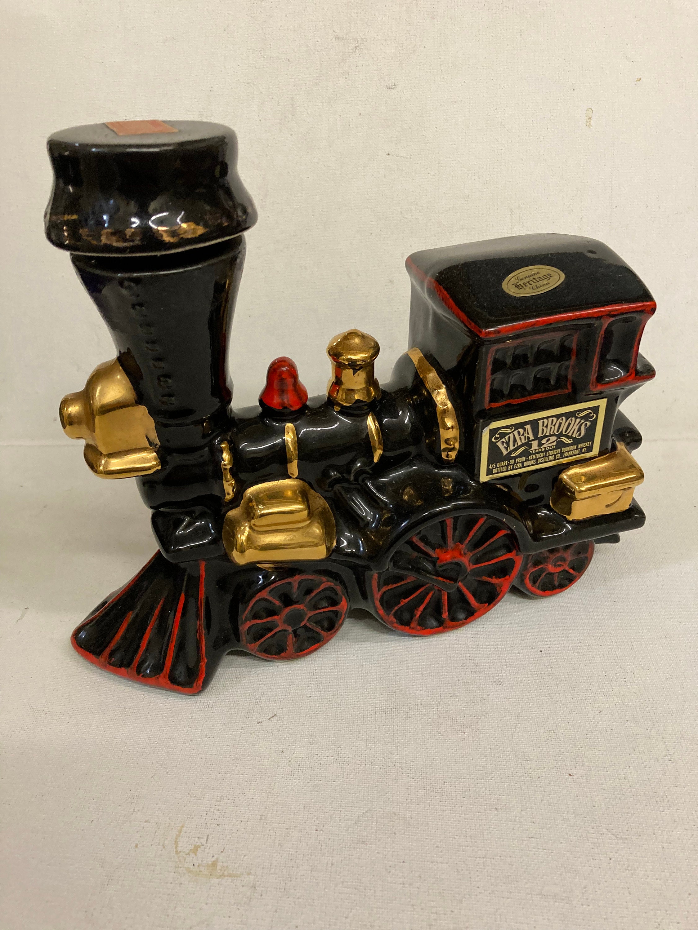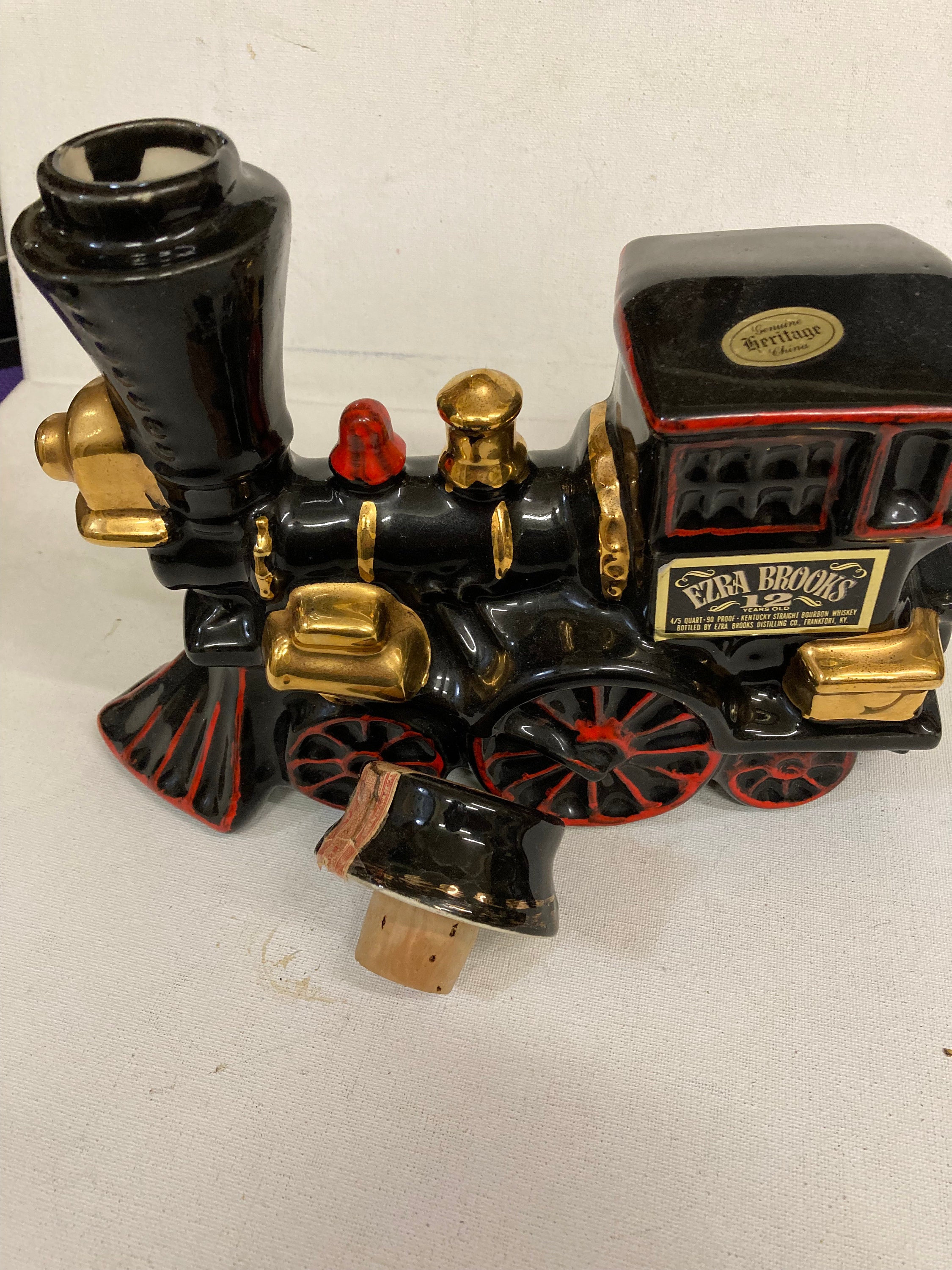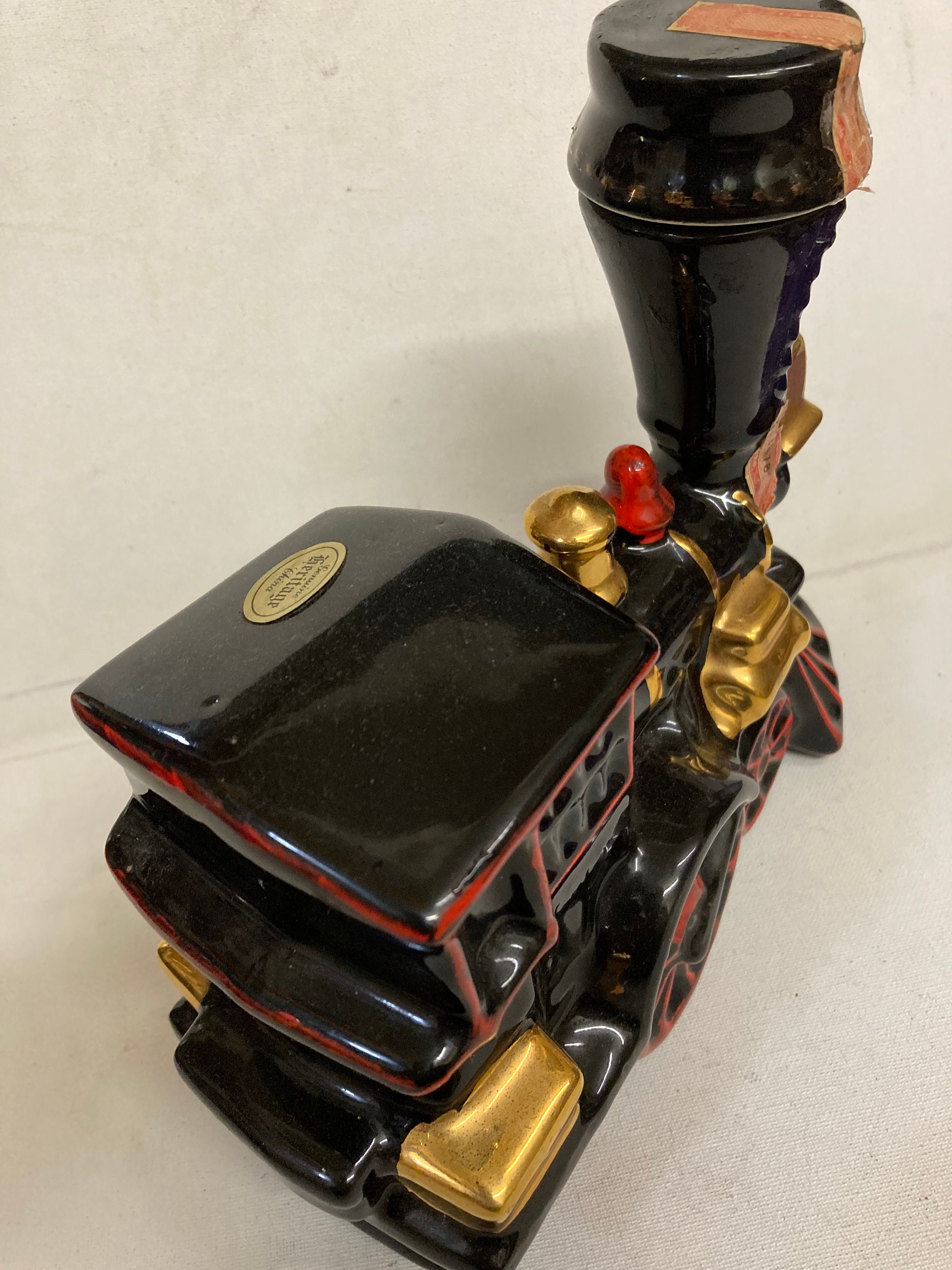 Vintage Ezra Brooks Kentucky Straight Bourbon Whiskey Locomotive. Empty Decanter Beautiful Black, Red, Gold Colors Ceramic With Cork LidGenuine Heritage China. Bottle is Empty 10" Long 8" Tall 3.75" Wide