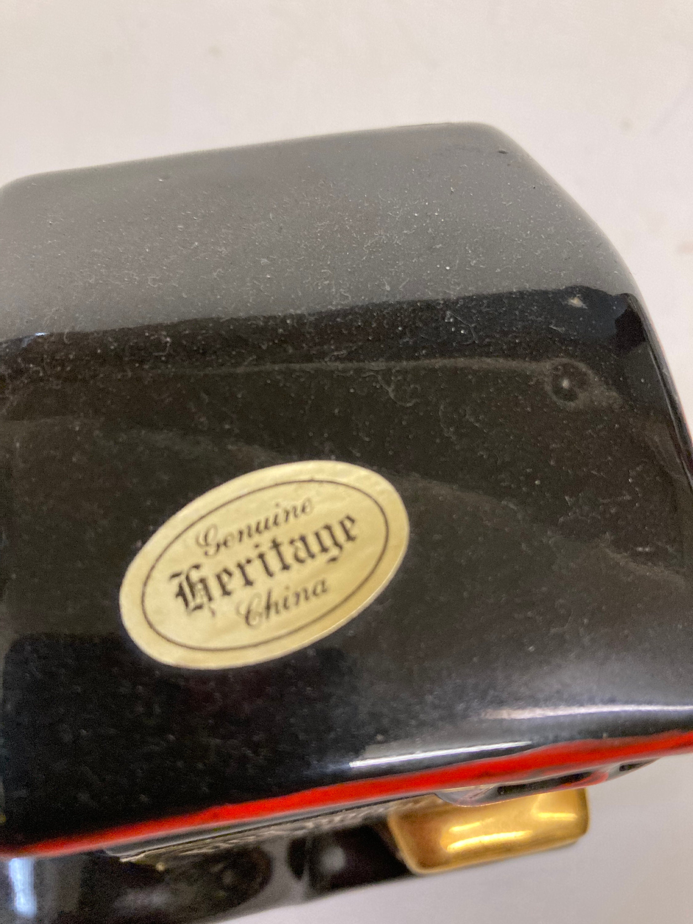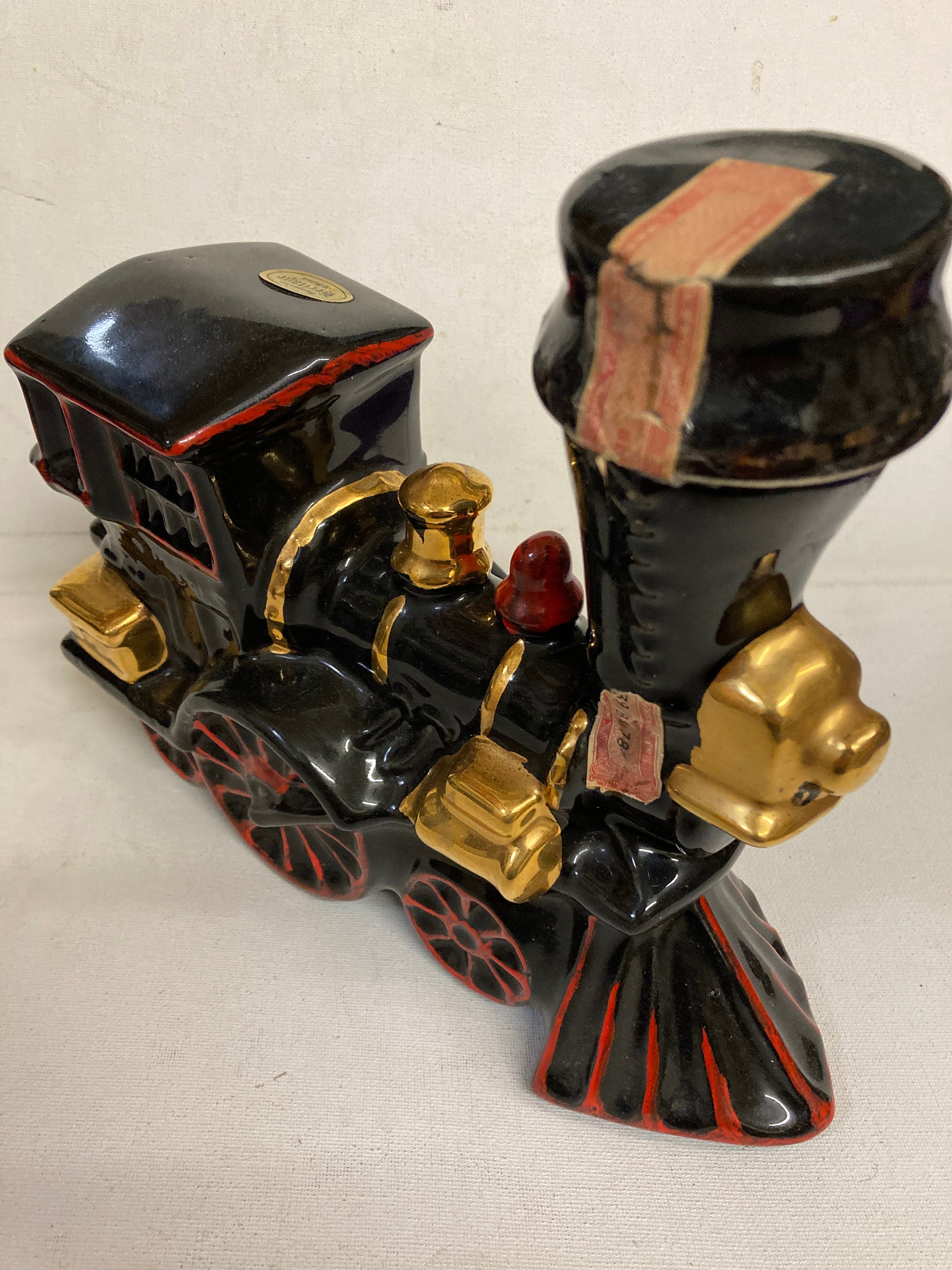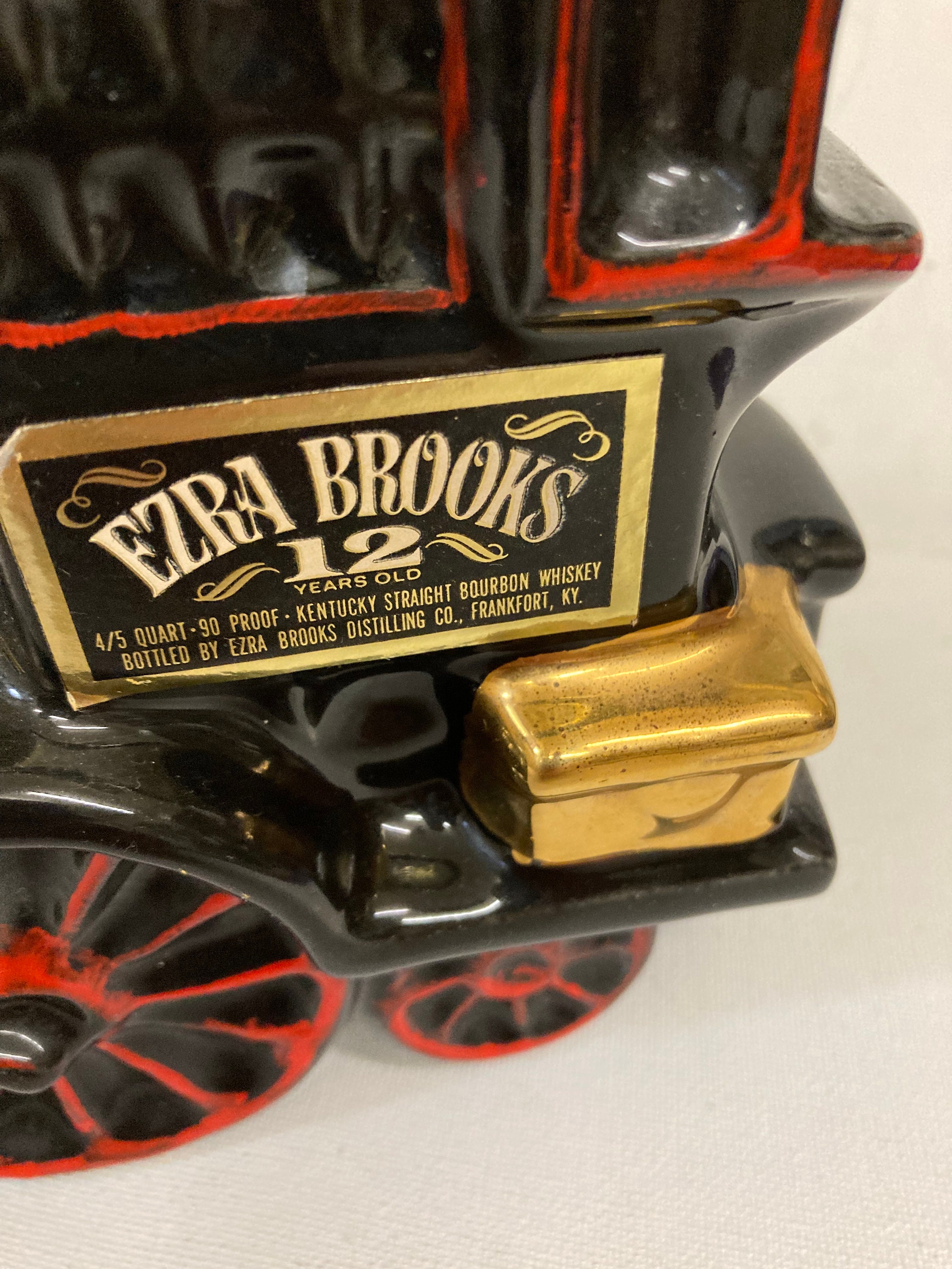 Vintage Ezra Brooks Kentucky Straight Bourbon Whiskey Locomotive. Empty Decanter Beautiful Black, Red, Gold Colors Ceramic With Cork LidGenuine Heritage China. Bottle is Empty 10" Long 8" Tall 3.75" Wide