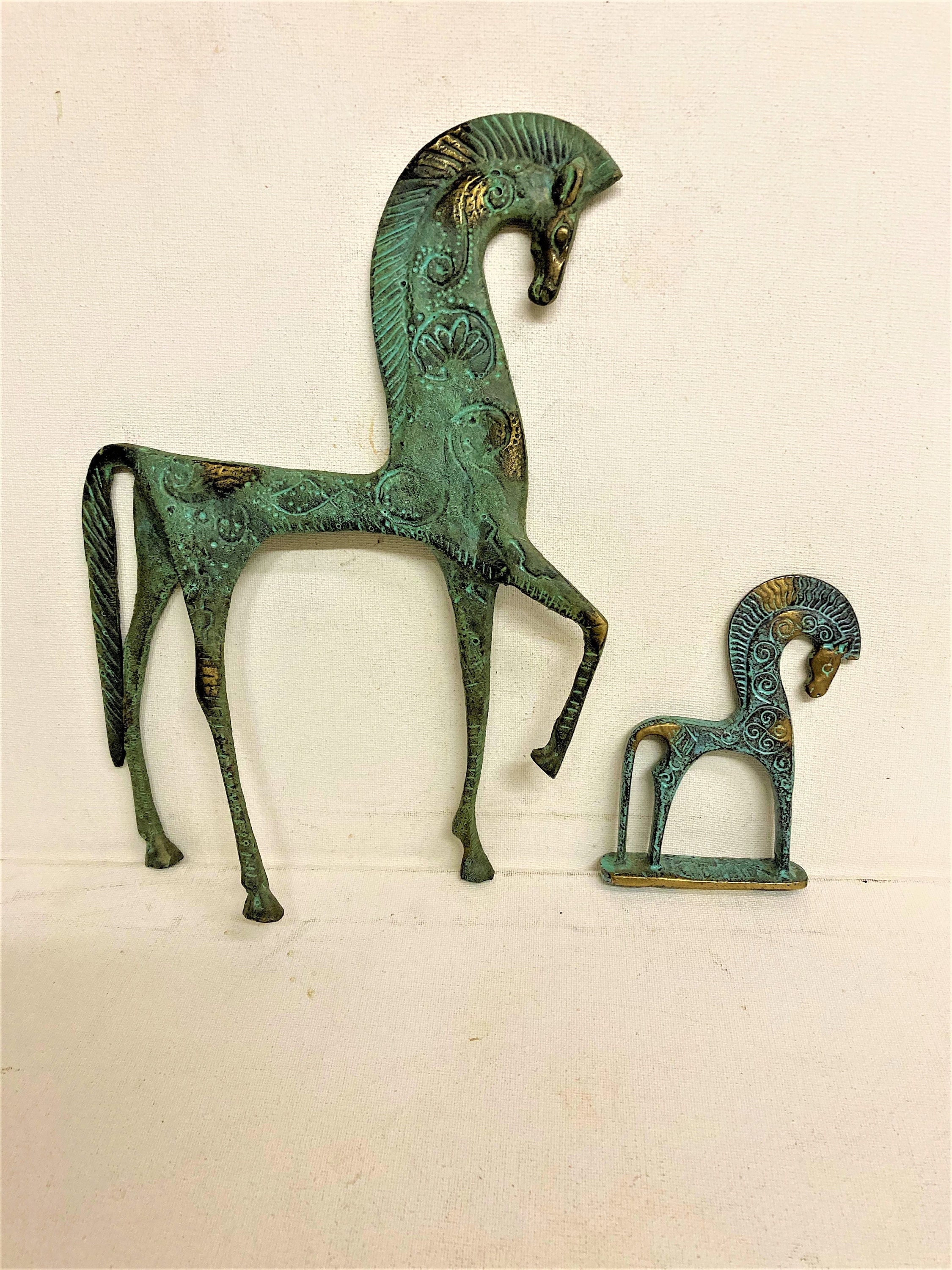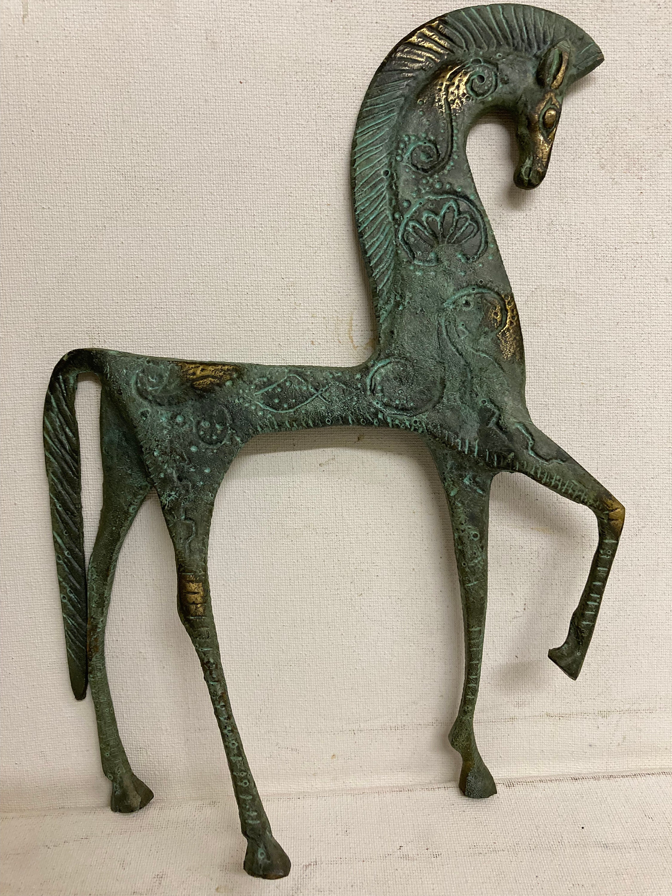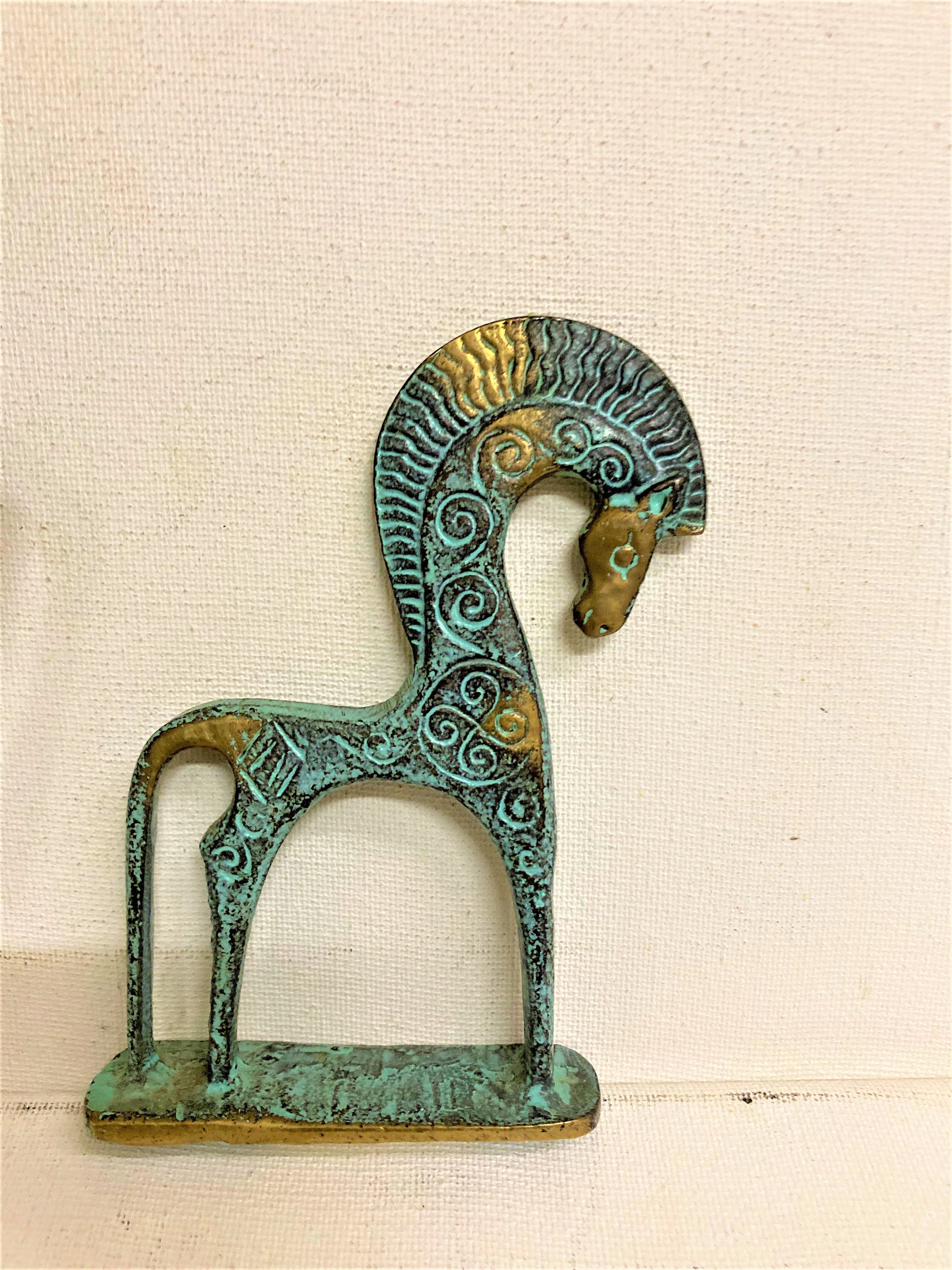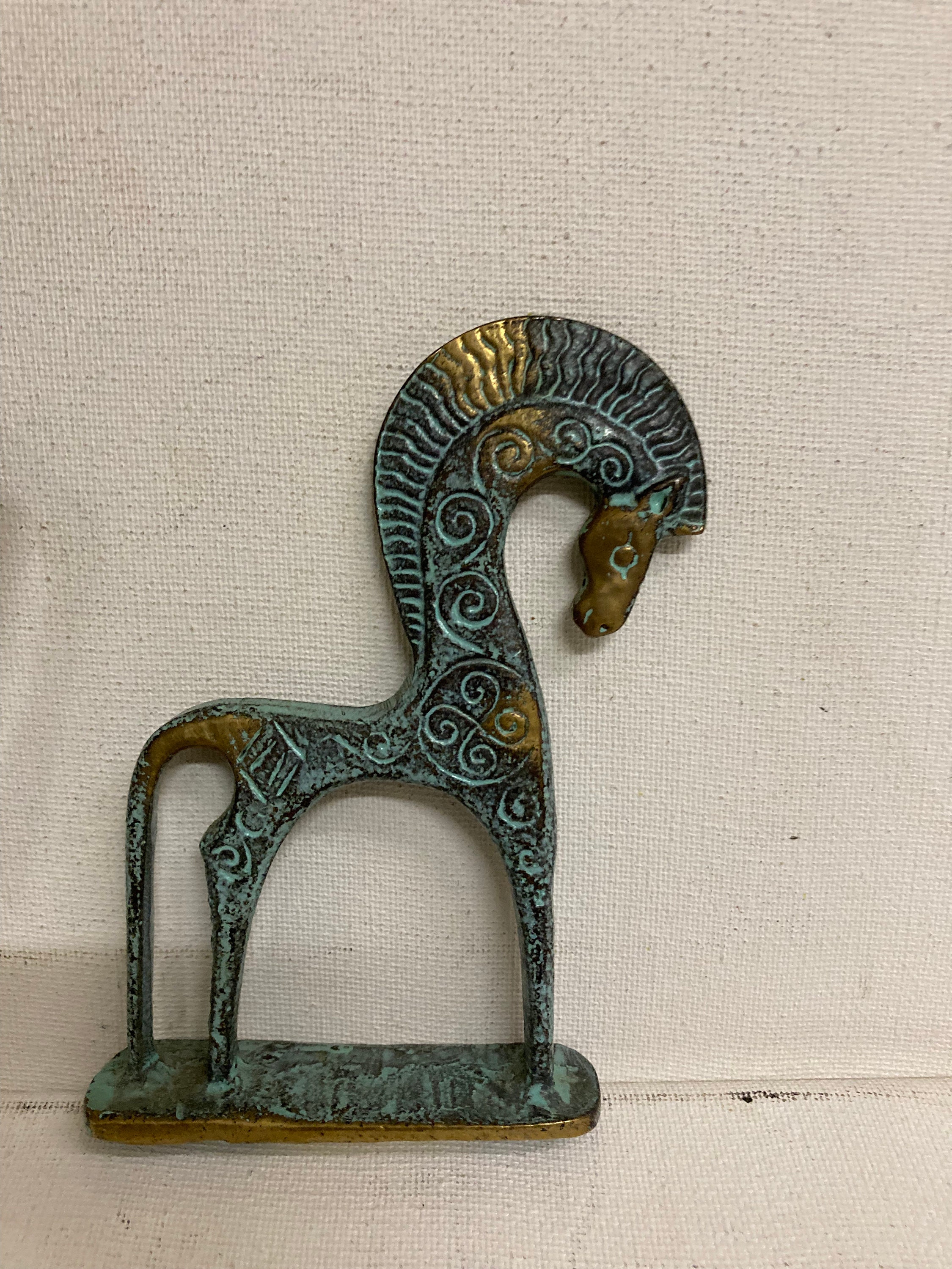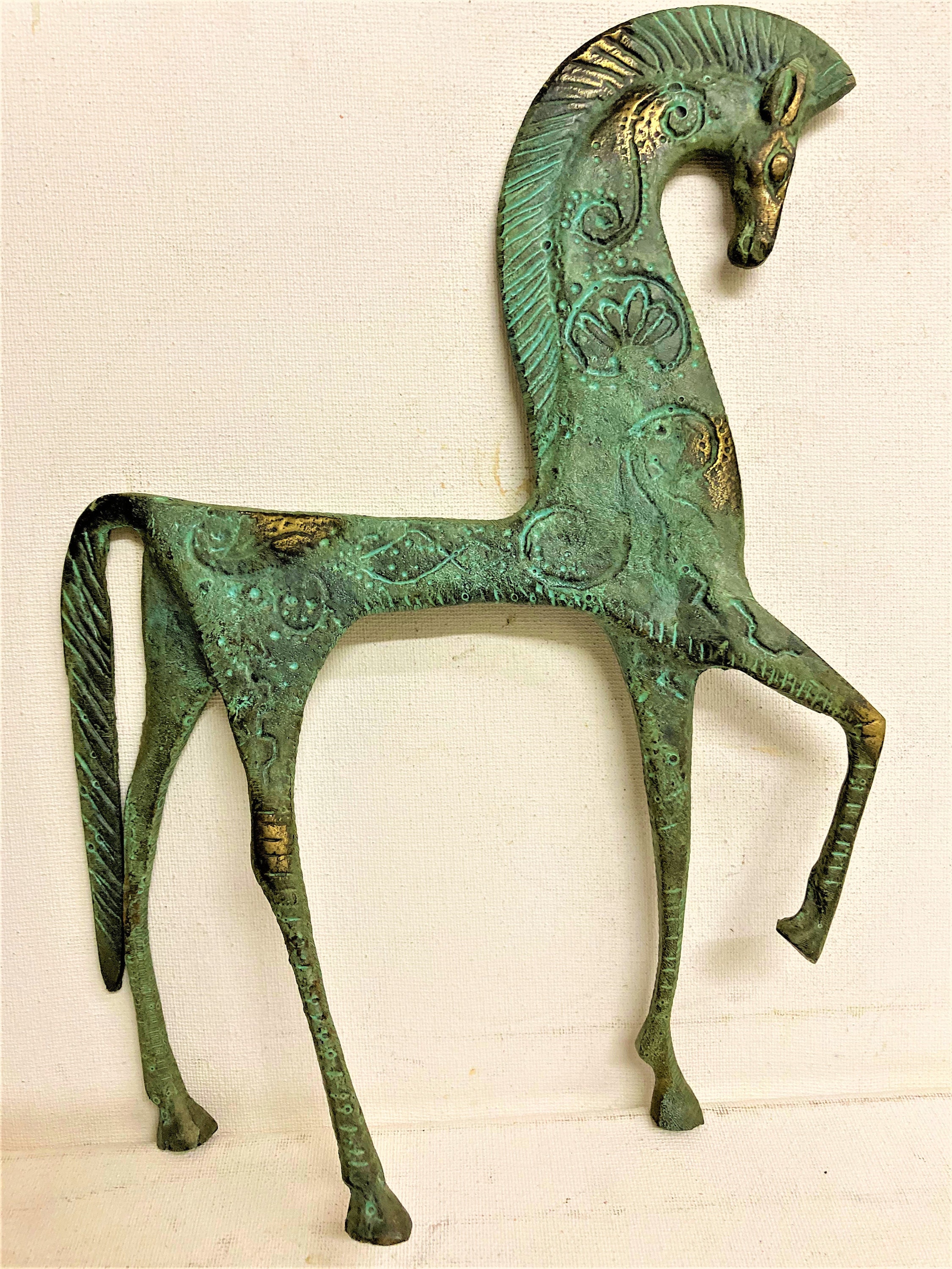 A wonderful Greek Horse figurine inspired by the archeological findings of ancient Greece. The horse is supported on his feet by a thin pedestal of copper alloy, and has the characteristic patterns carved on Greek horse statuettes. A figurine of perfect size for decorating the desk or shelves.