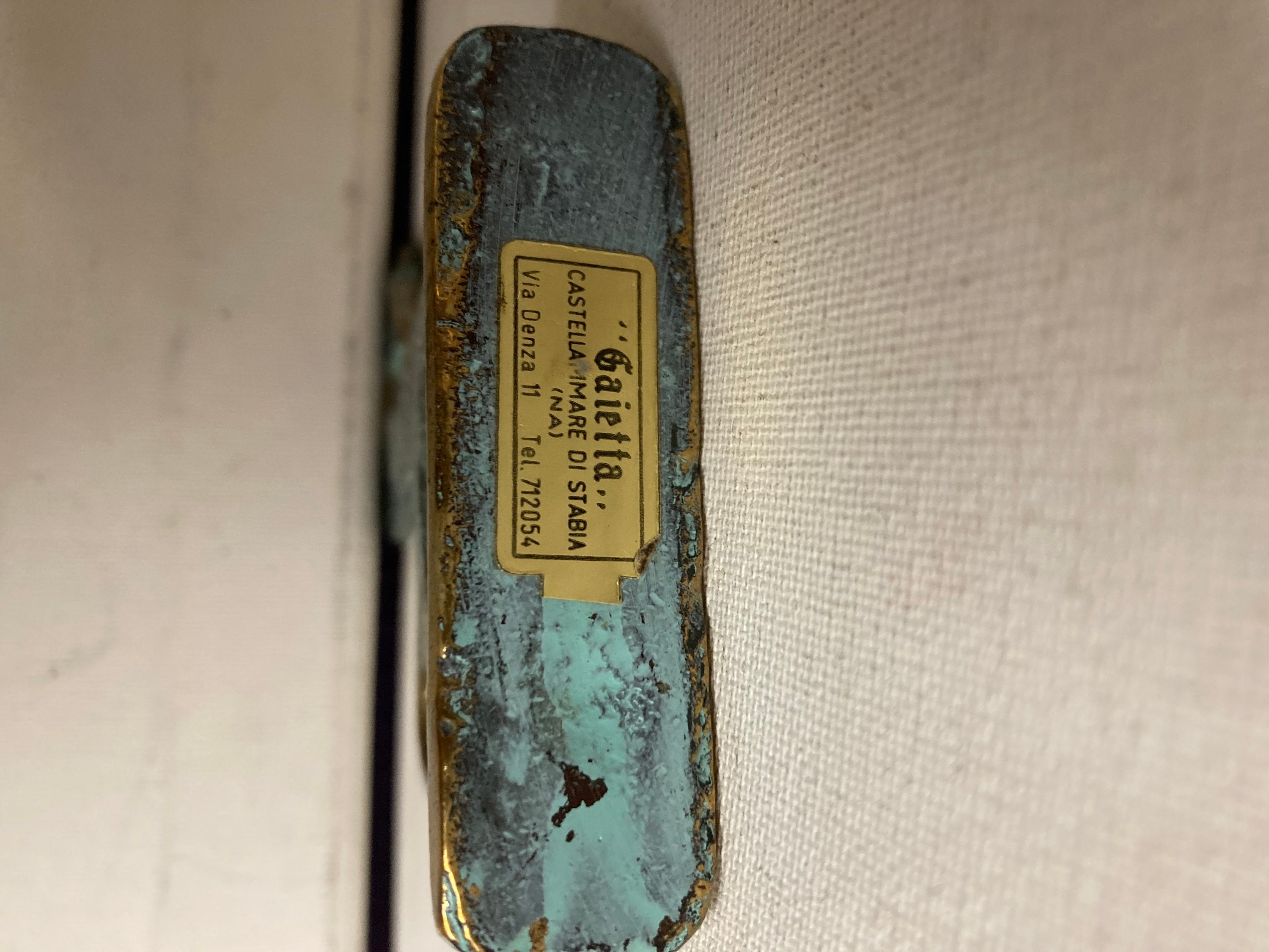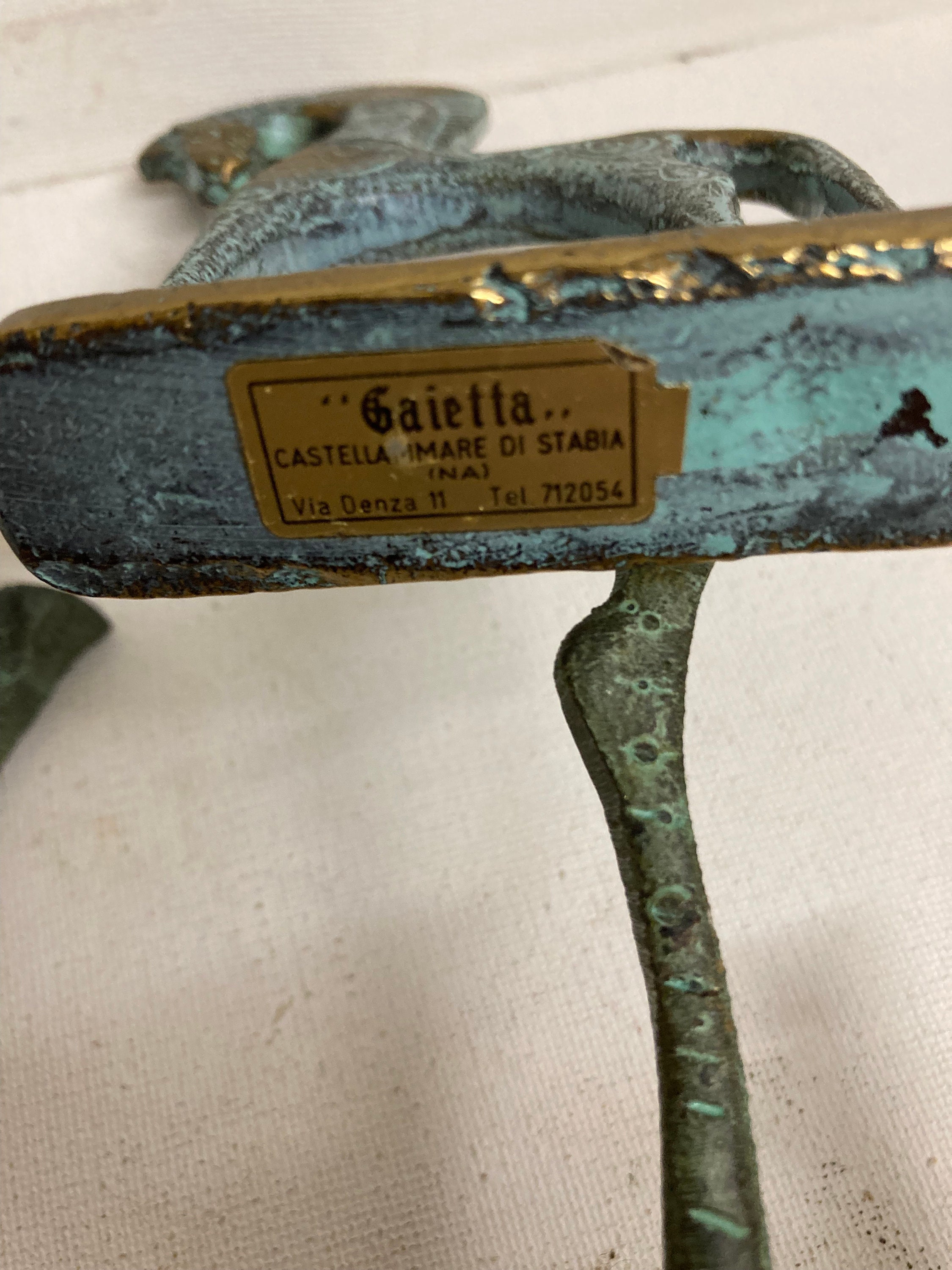 Our sculpture is produced by a unique and proprietary casting process. They are made of copper alloys and brass with a green oxide patina. The sculpture has a look comparable to archealogical copper alloys and bronzes.