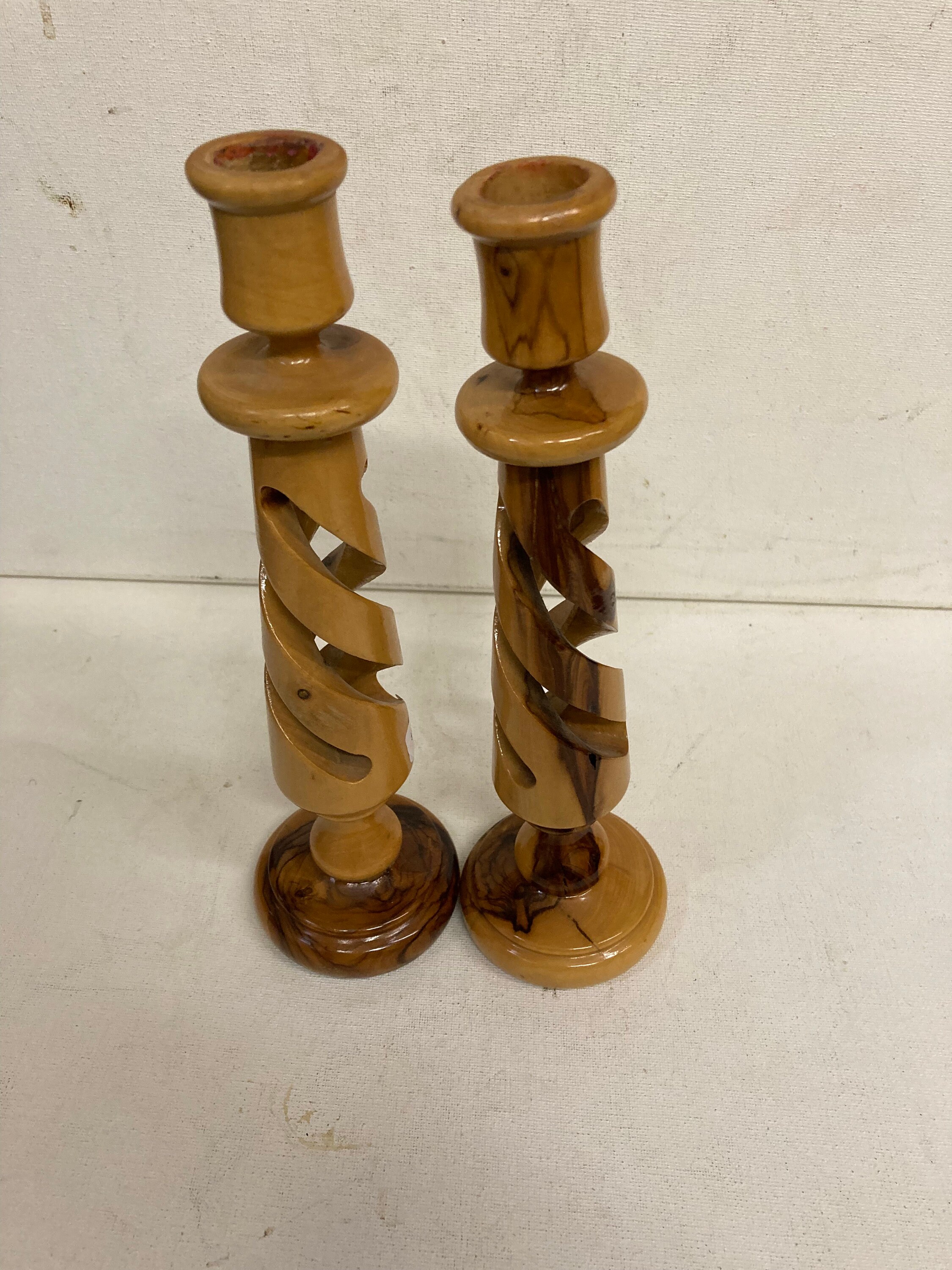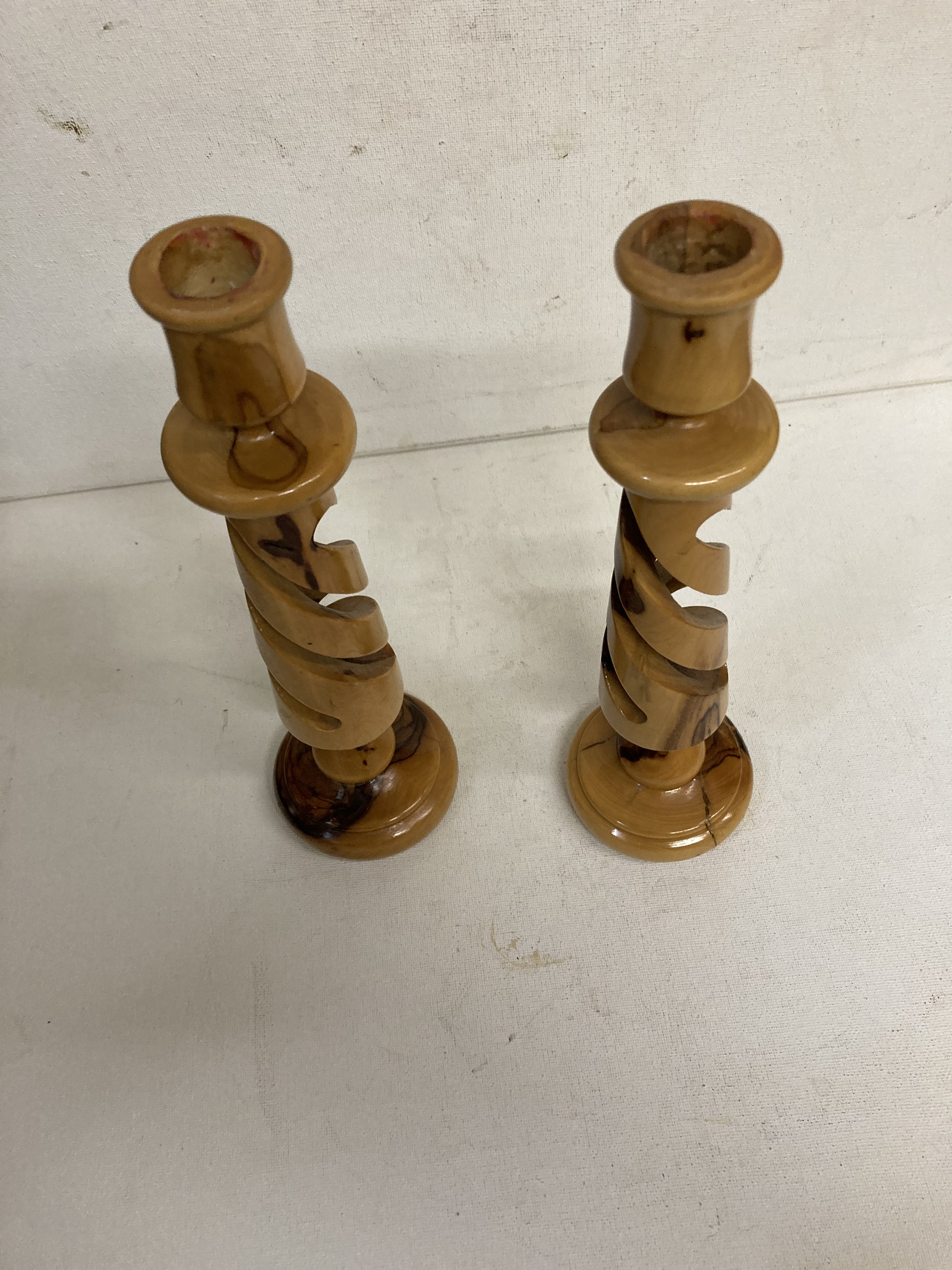 Stunningly formed pair of decorative olive wood spiral candle holders from the Israel