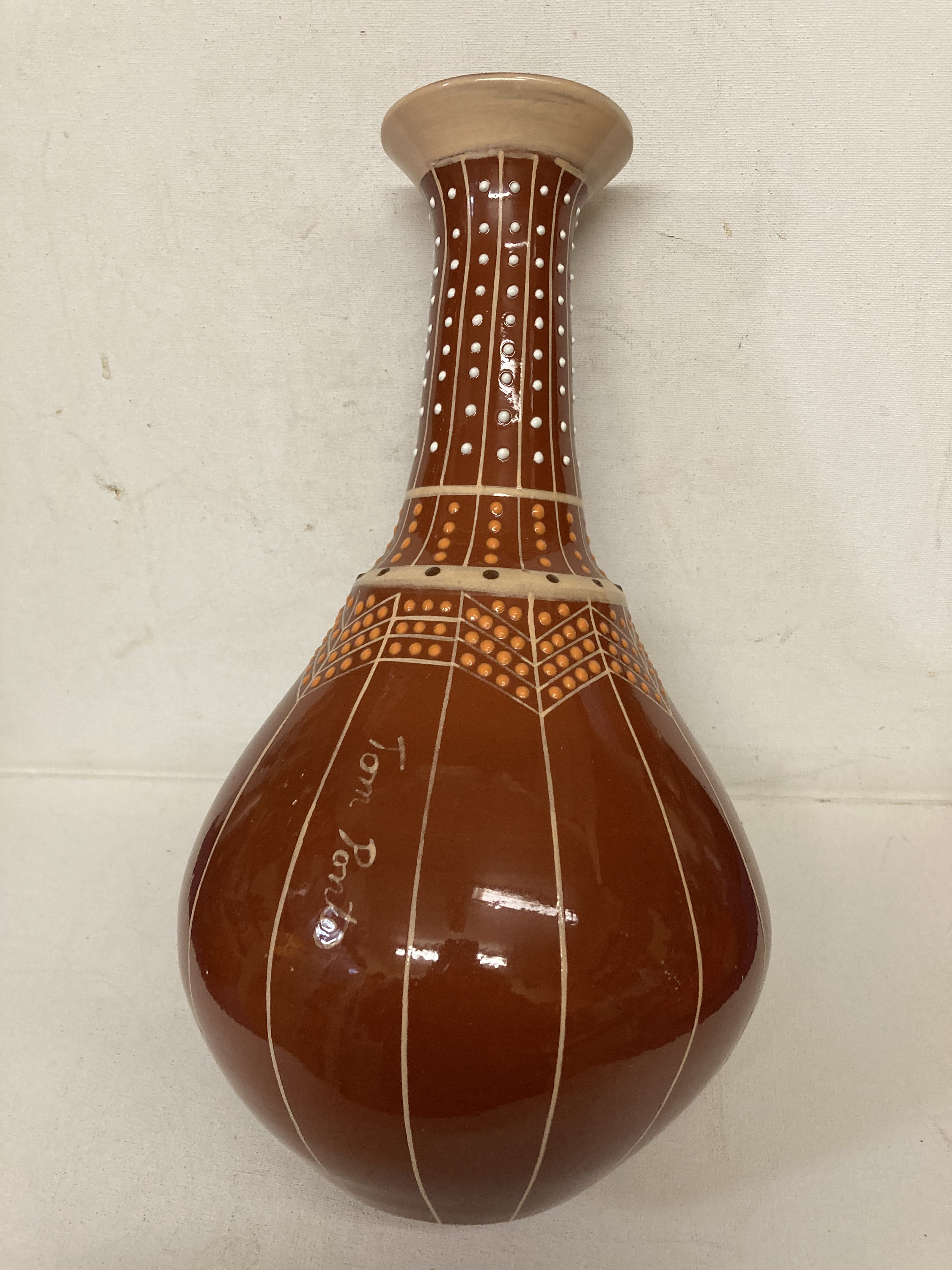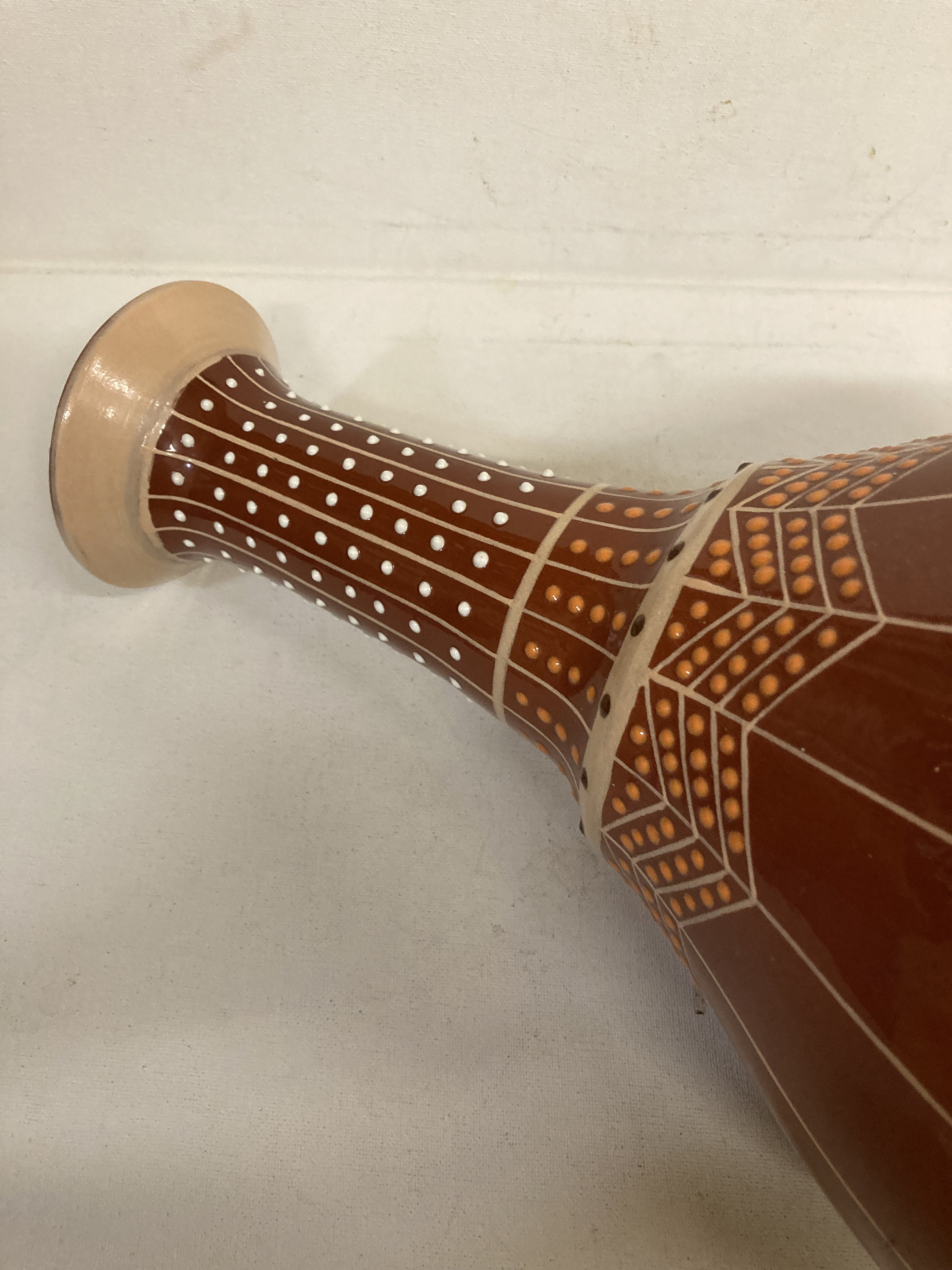 This beautiful vase is intricately decorated with geometric patterns and three dimensional colored dots which cover the vase’s exterior.