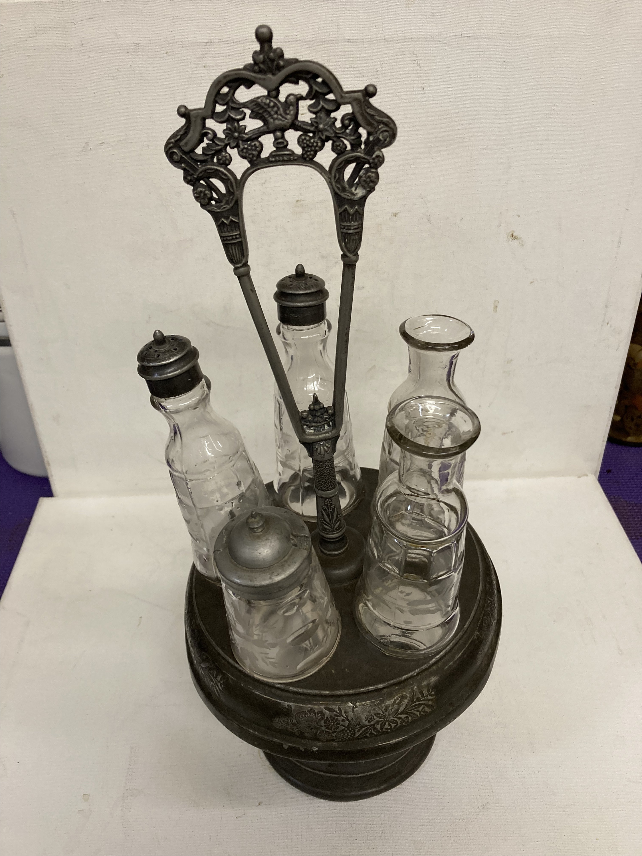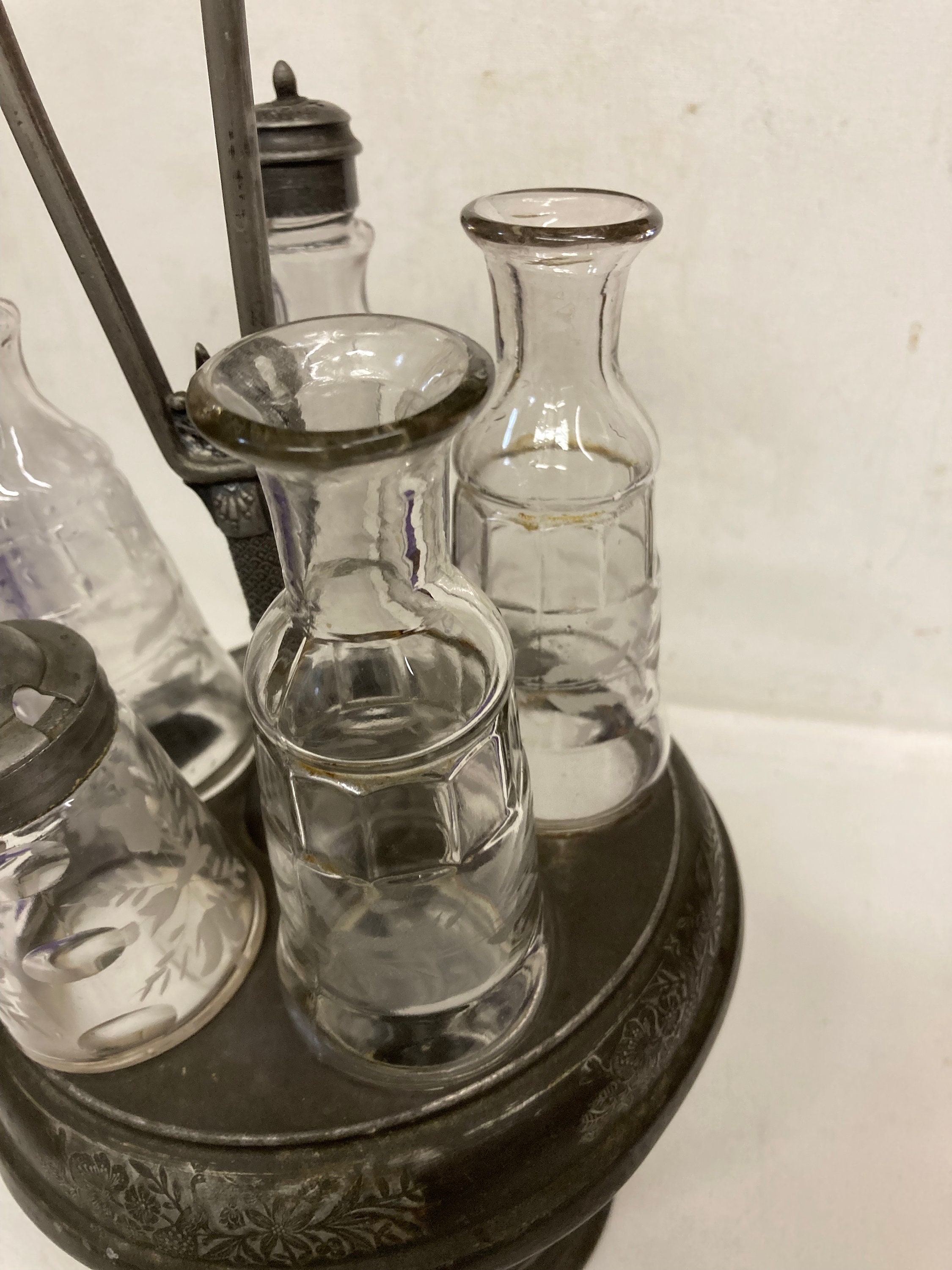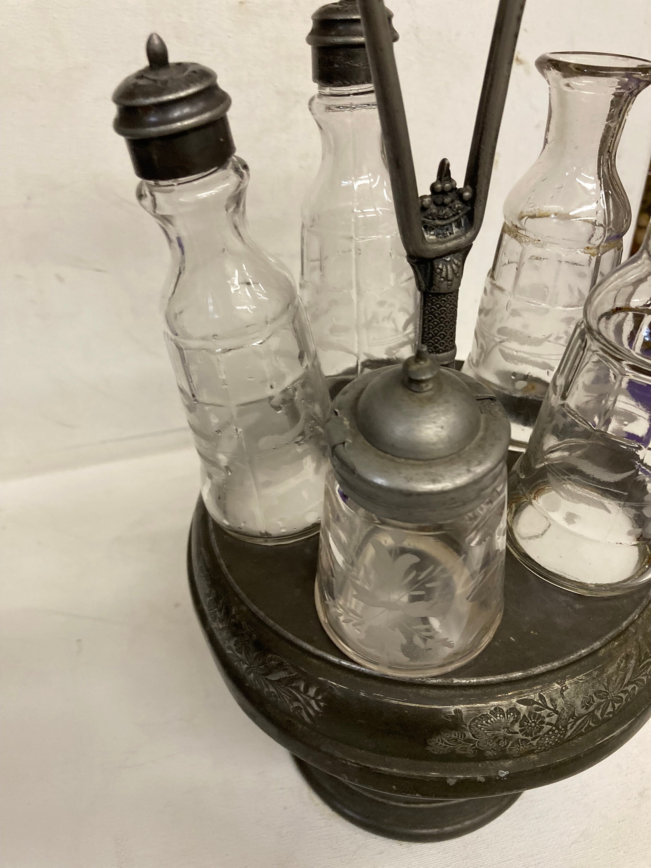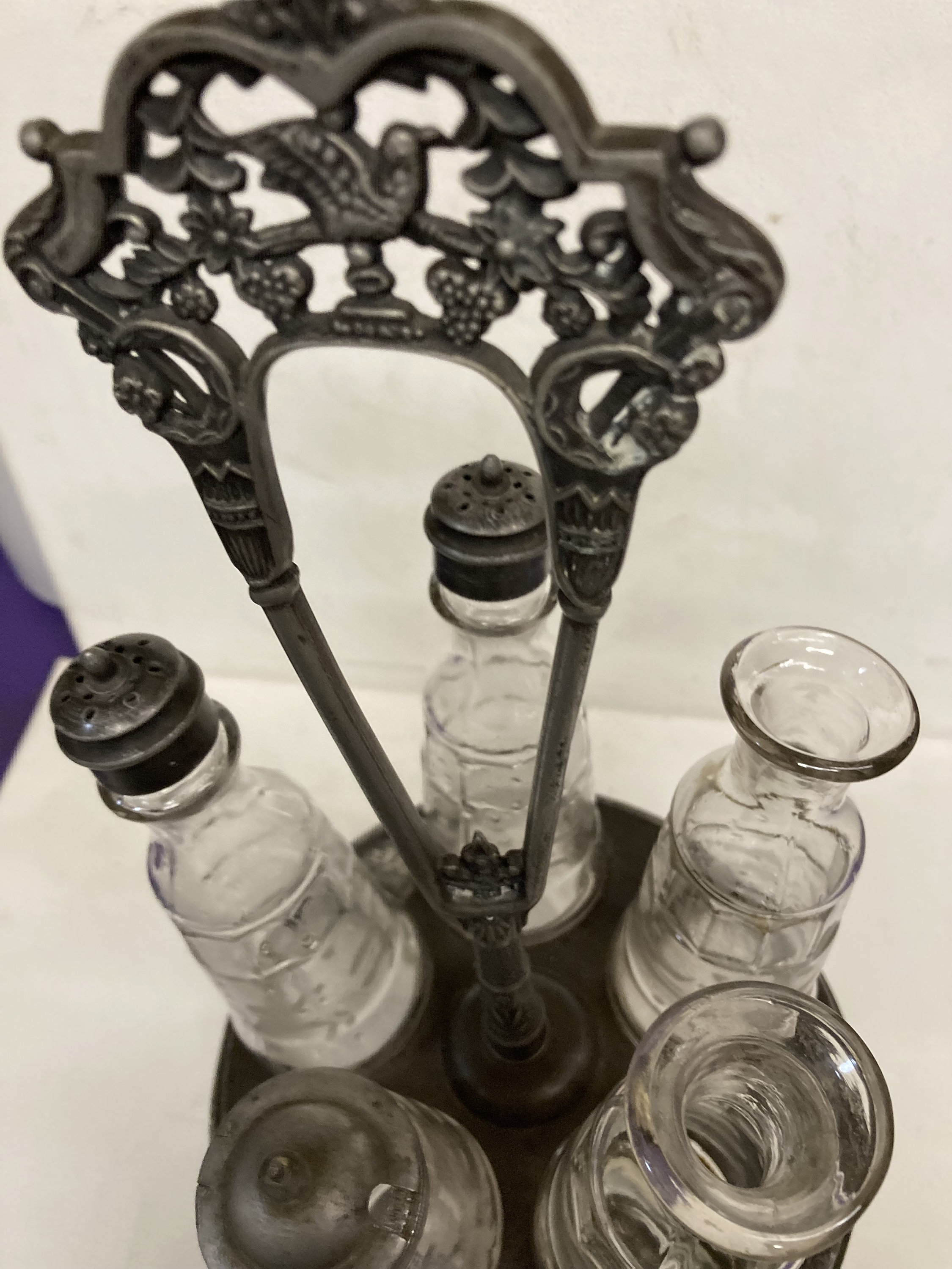 The cruet is beautiful and ornate with intricate design on base and caddy.