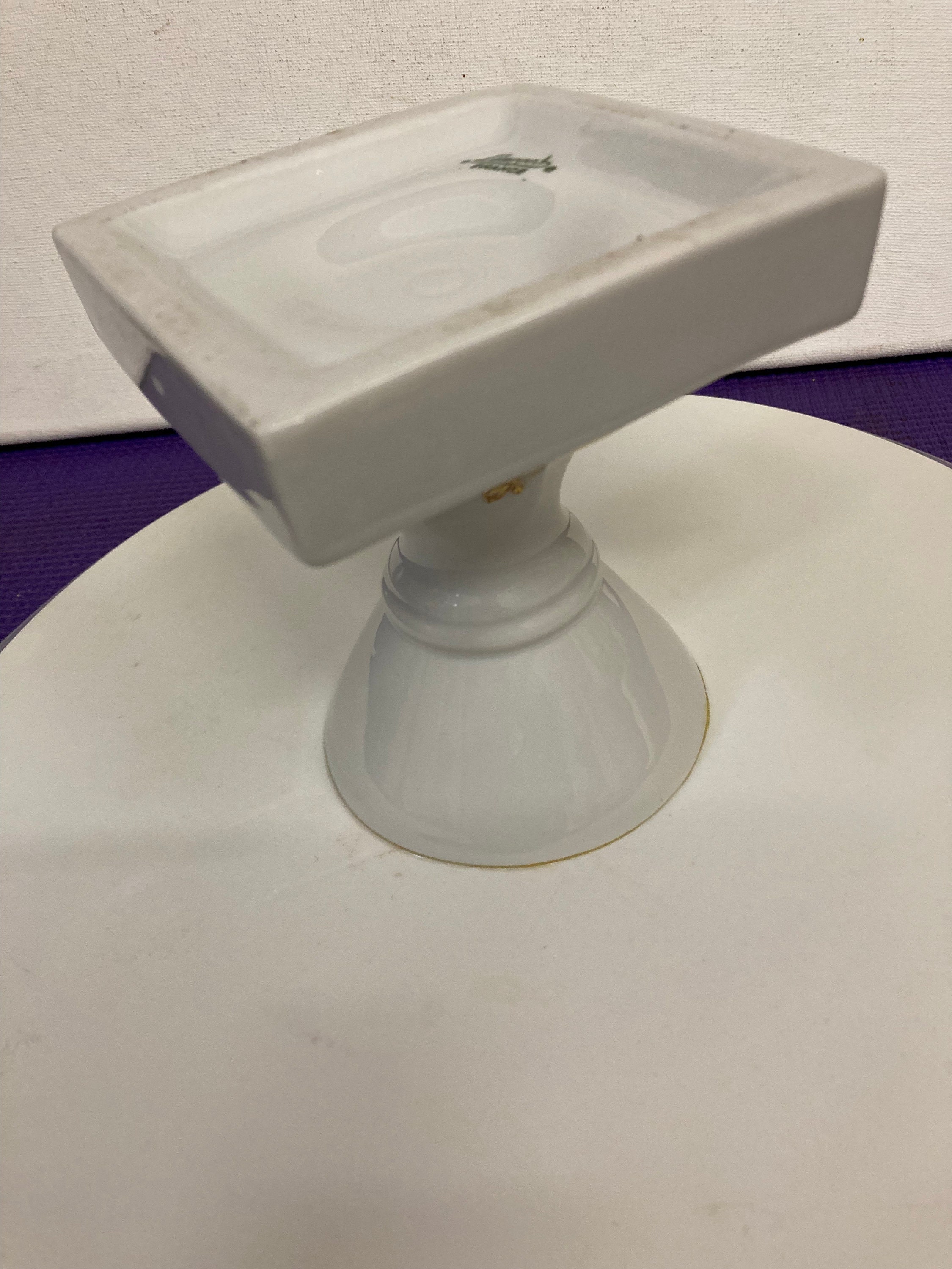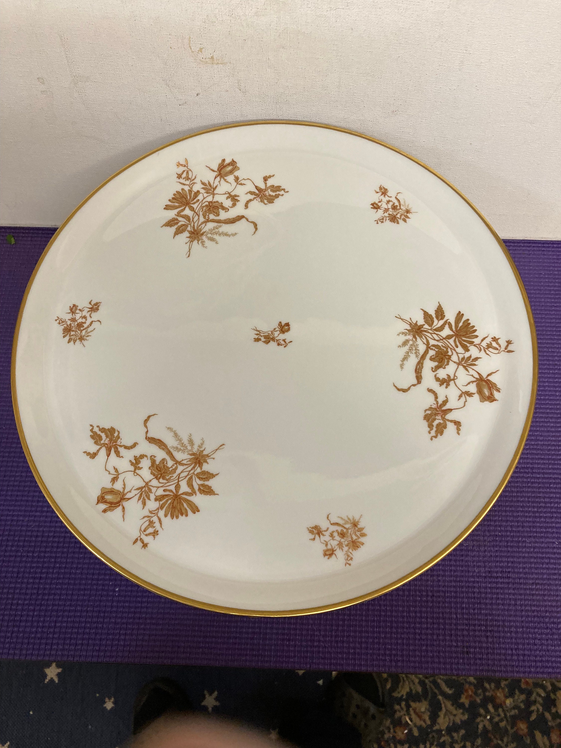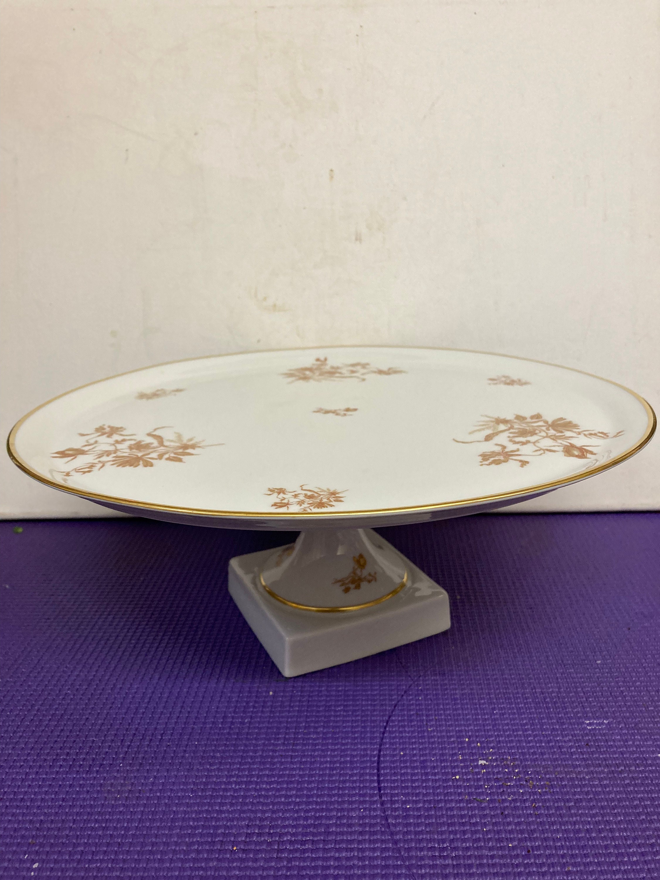 Limoges France White Pedestal Cake Plate with Gold Flowers and Gold Trim,