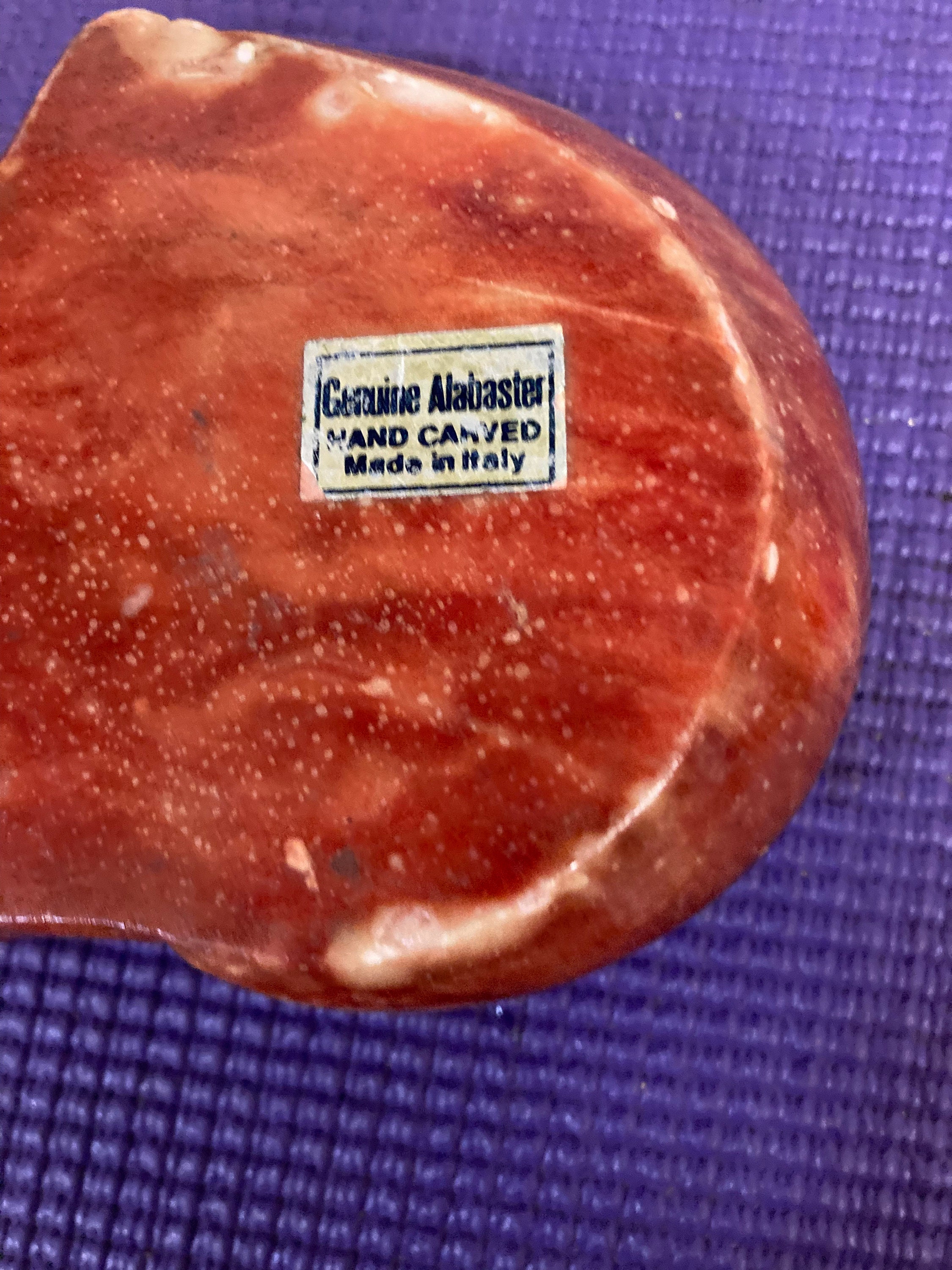 It weights 3.5 lbs is about 8w x 8d x 4t in dimentions Mix of Black and Burgundy colors The Albaster Baby Cat is also handmade and is made in Italy. Weights less than a lb and usefull as paperweight. She measures 3.5 w x 3.5 d x 1.5 t. Both make a great match.