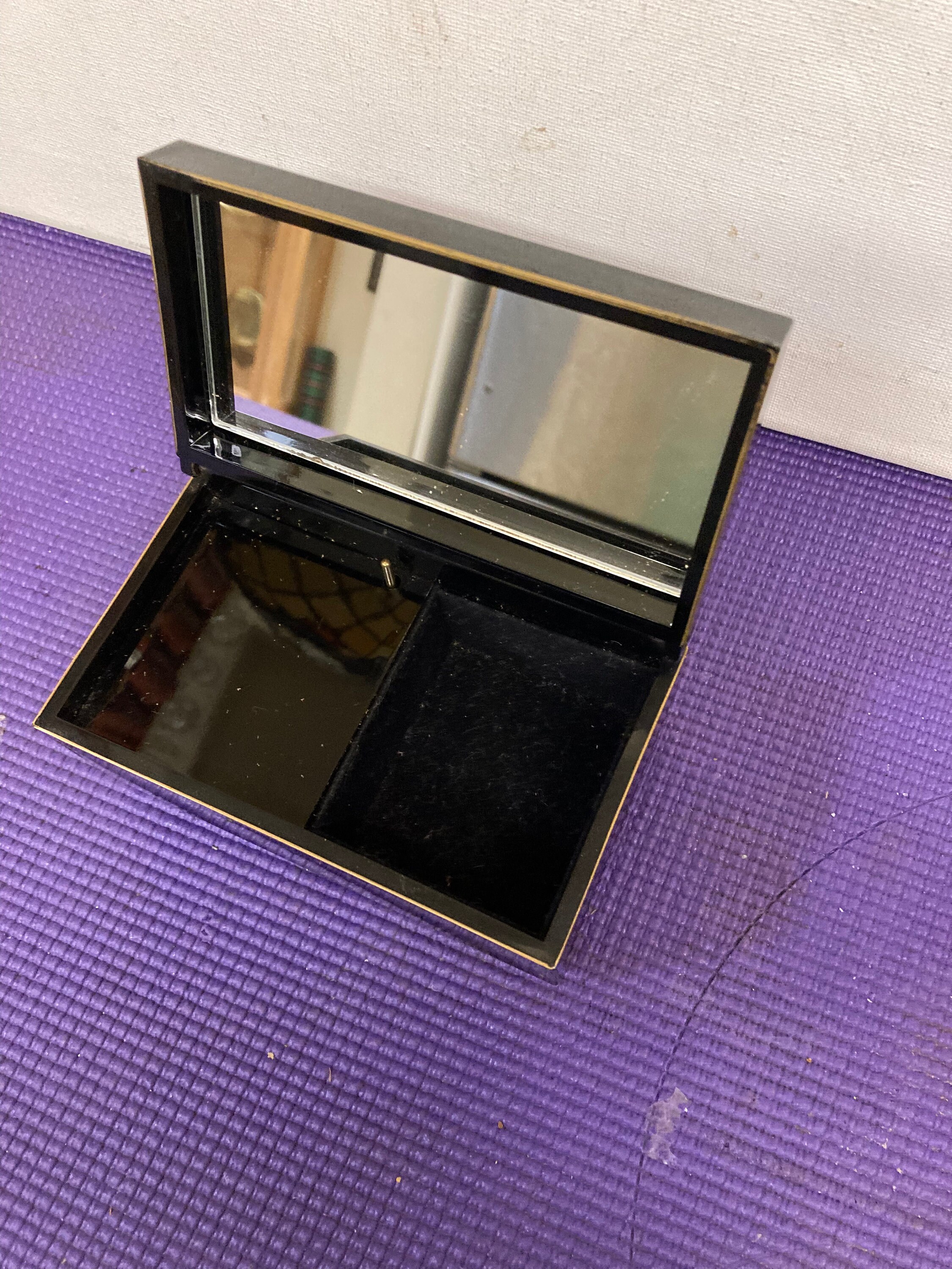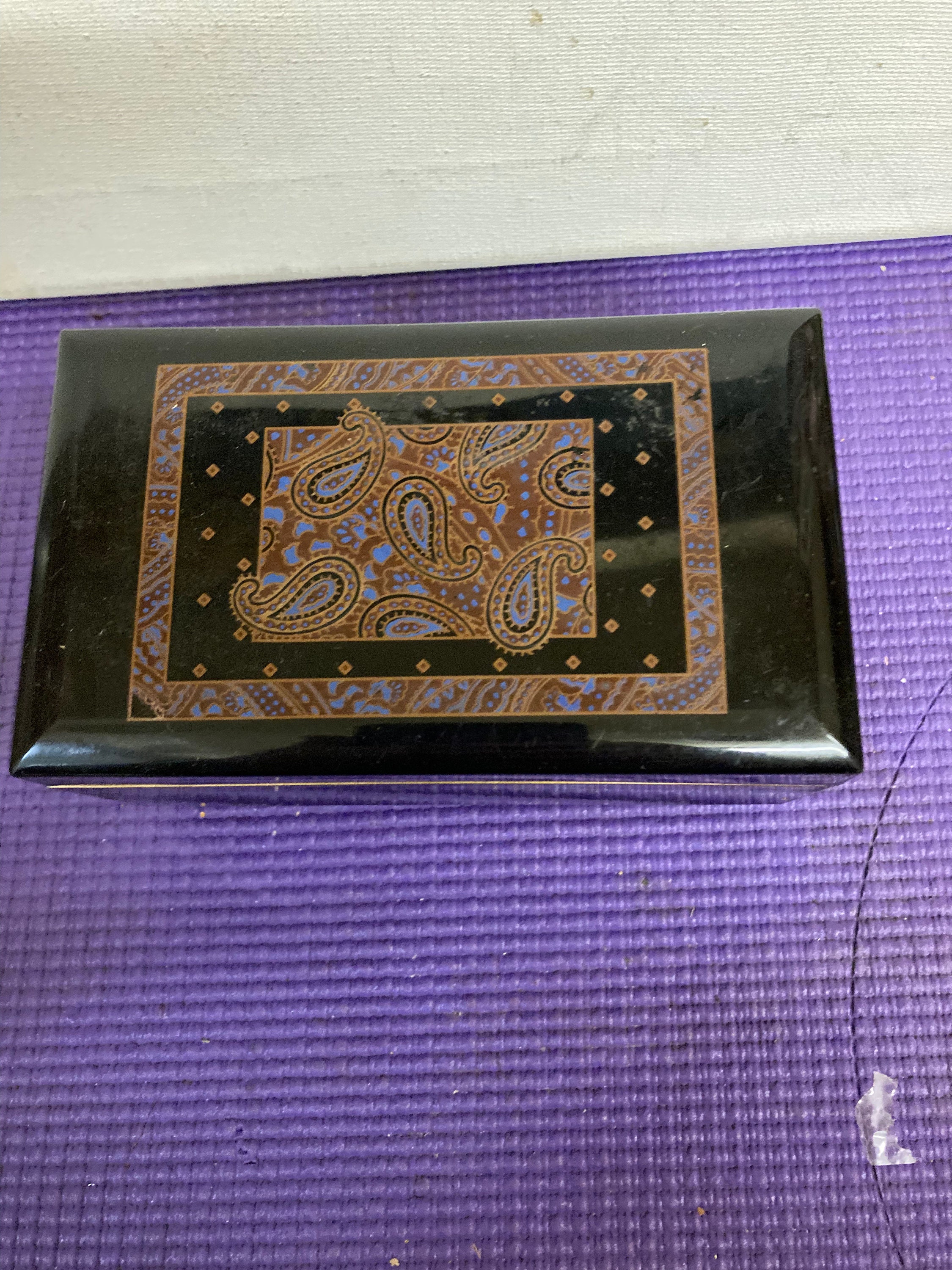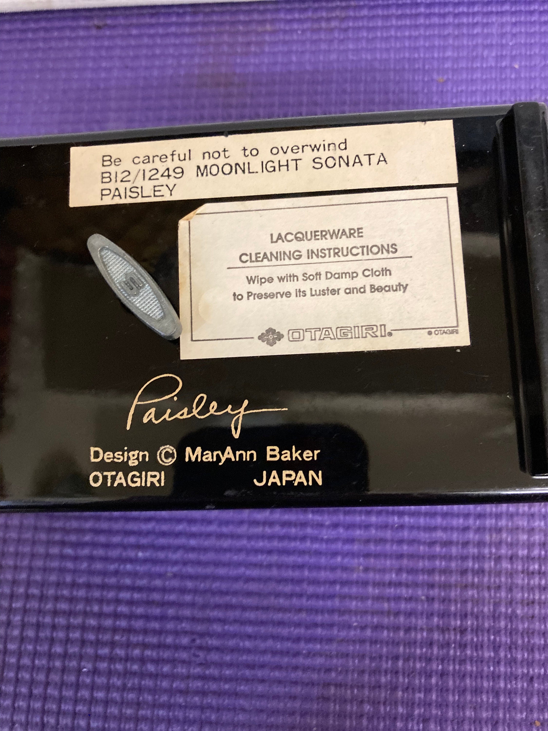 Beautiful and rare condition Otagiri Vintage Black Lacquer Musical Jewelry Box with White Persian Design. Designed by Marry Ann Baker Marked Japan. Original Stickers on bottom. 1960/1970’s. Excellent condition and plays perfect tempo :) See pics for condition and detail mirror is also in perfect condition. Approximately .