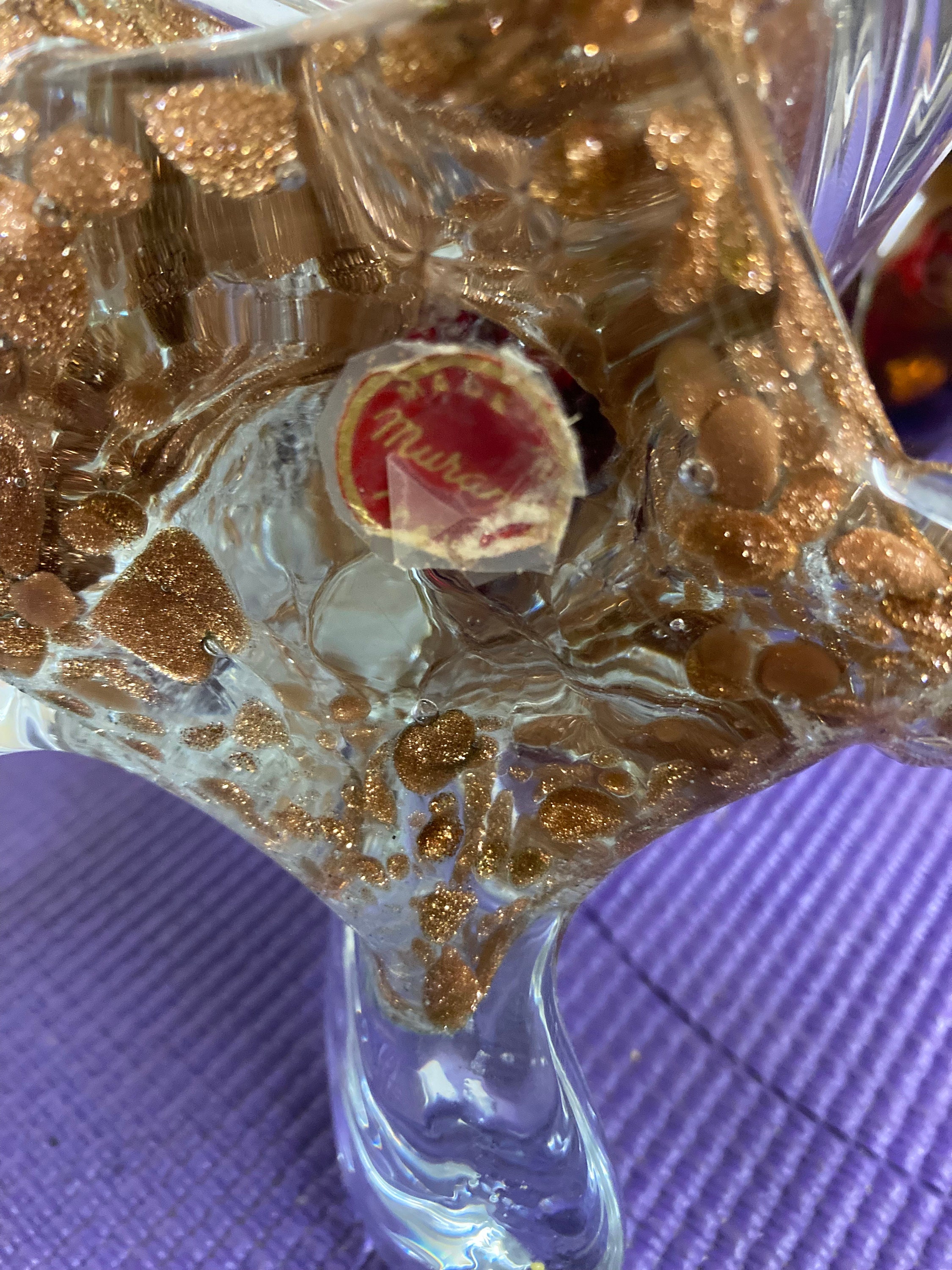 This is a 15 1/4 " inch tall bird by Murano Italian Gold Fleck 9 ( feet) art glass piece Made by the infamous artist Alfredo Barbini of Murano glass. It is approximately 6 inches wide . The condition is pristine no flea bites chips cracks or damage the beak is in pristine condition the day that it was made this has been so well cared for. No damage to the glass bird