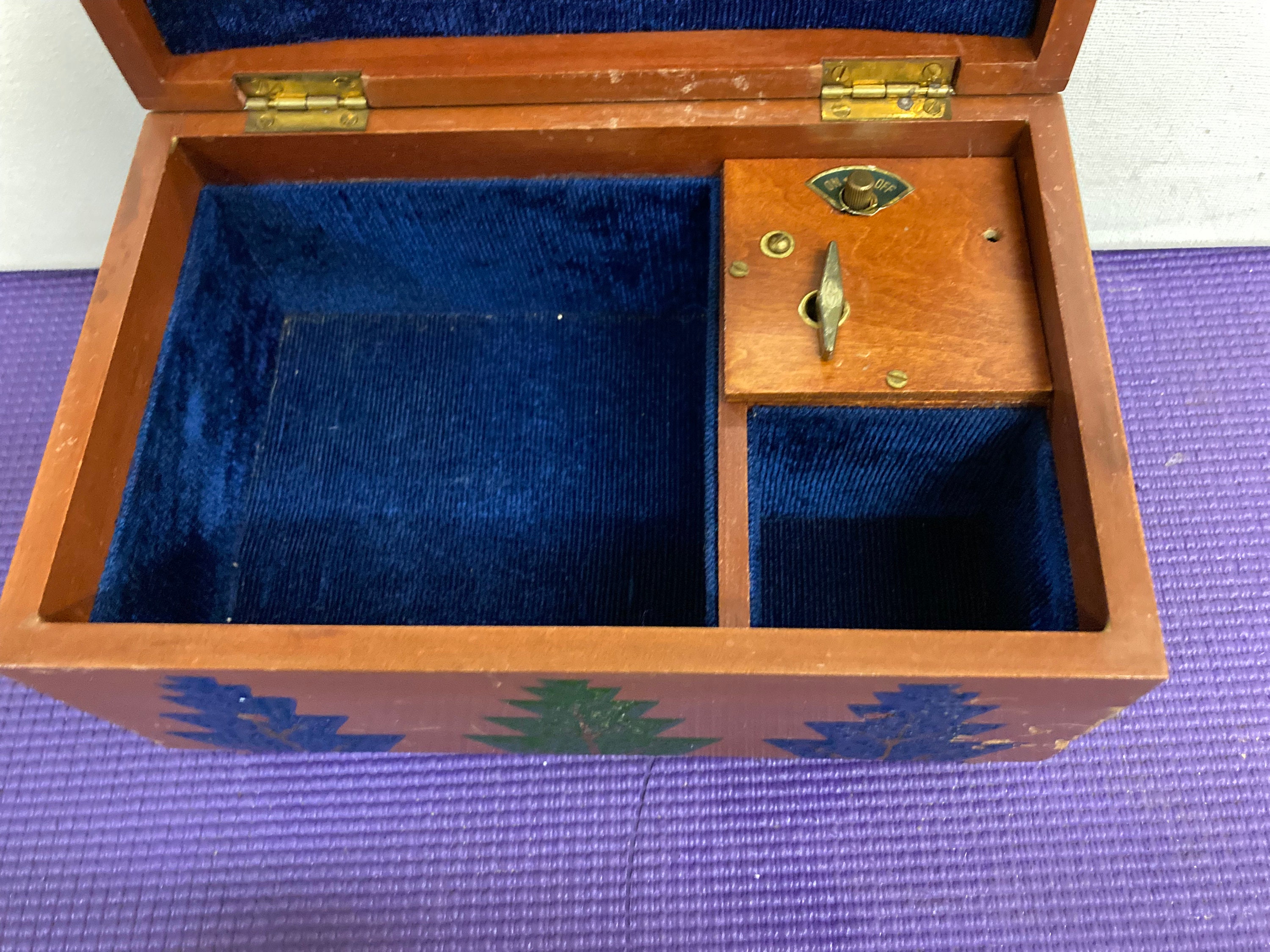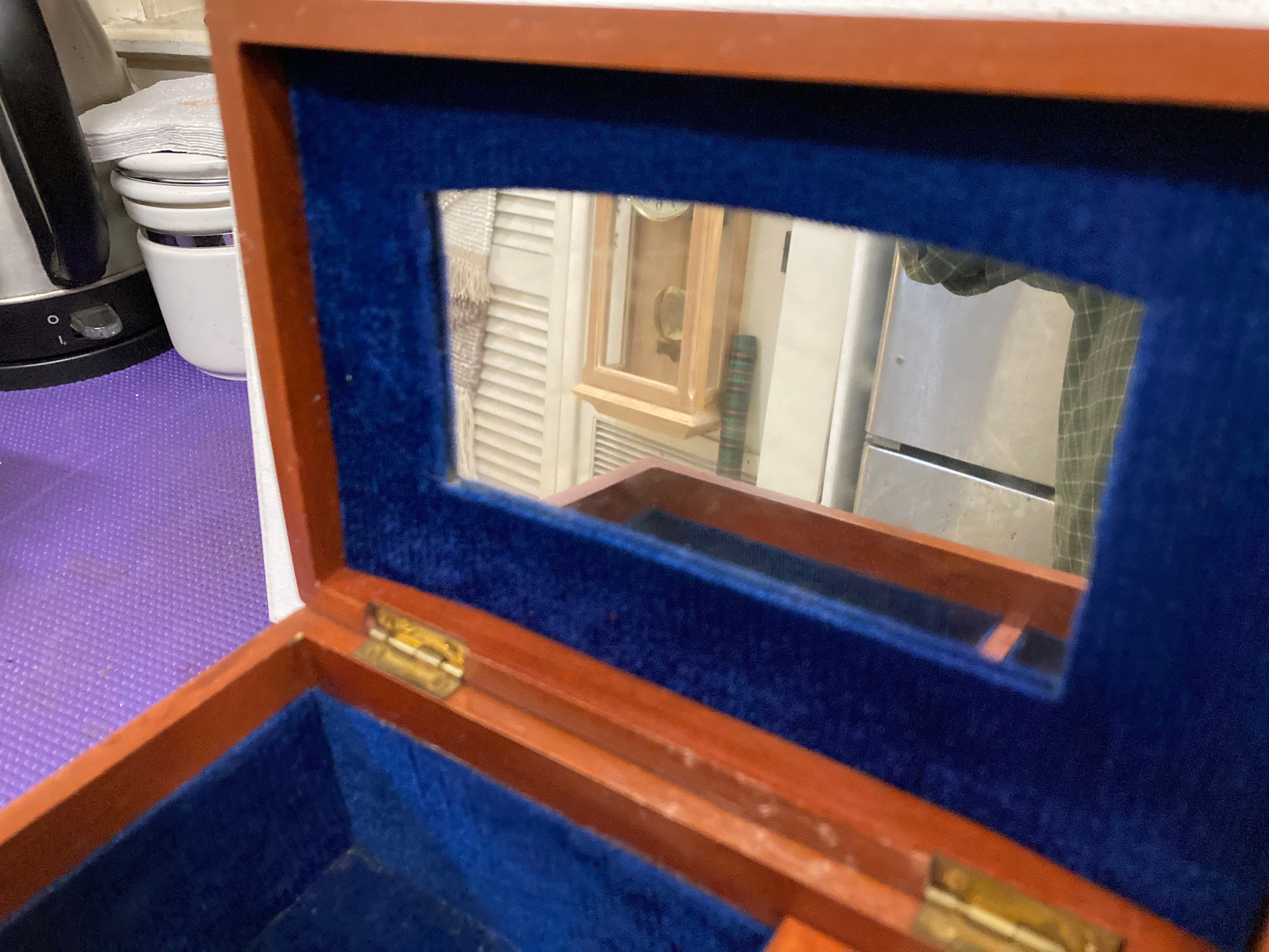 A pretty vintage hand painted Japanese wooden box with mirror and lined with blue velvet. The hinged lid colourfully decorated with hand painted Japanese lady wearing a traditional Japanese adesigns.