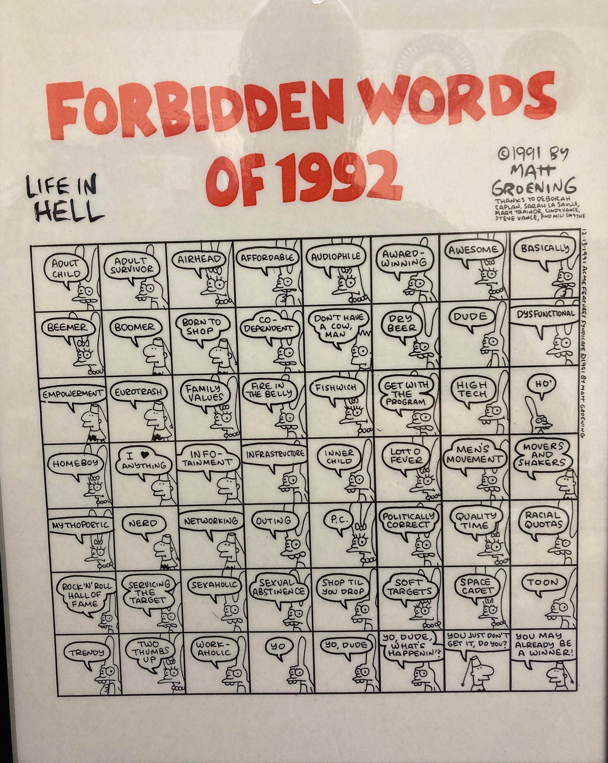 When I began drawing “Life in Hell” exactly 500 weeks ago, I compiled a list of “forbidden words”–catch phrases, cliches, slang, Republican doublespeak, buzzwords–that bugged me. Amazingly enough, although I forbade their use, people kept saying and writing those words. But I haven’t given up. Recently I compiled a new list of “Forbidden Words of the 1990s,” printing it in recent installments of “Life in Hell.” I figured I’d done my linguistic duty for the next decade. But late at night, lying in bed, staring into darkness, I keep coming up with more words to forbid–“extravaganza,” “porno,” “crack is wack,” etc. Here, then, are the uncensored “Forbidden Words” leftovers (including all the filthy stuff I wouldn’t stick in the comic strip), along with a few new words I thought of while making up this list. Please do not read the following aloud.