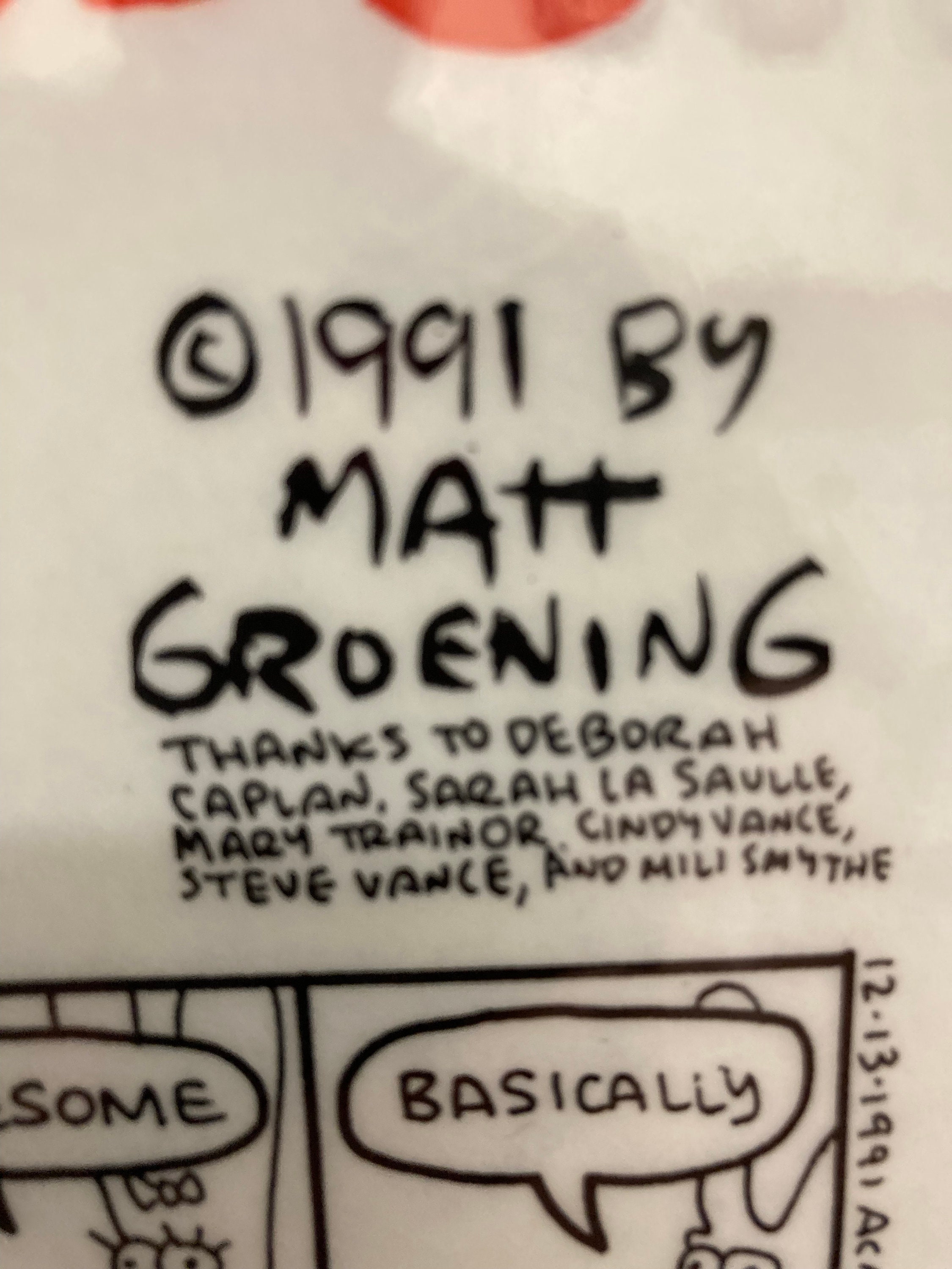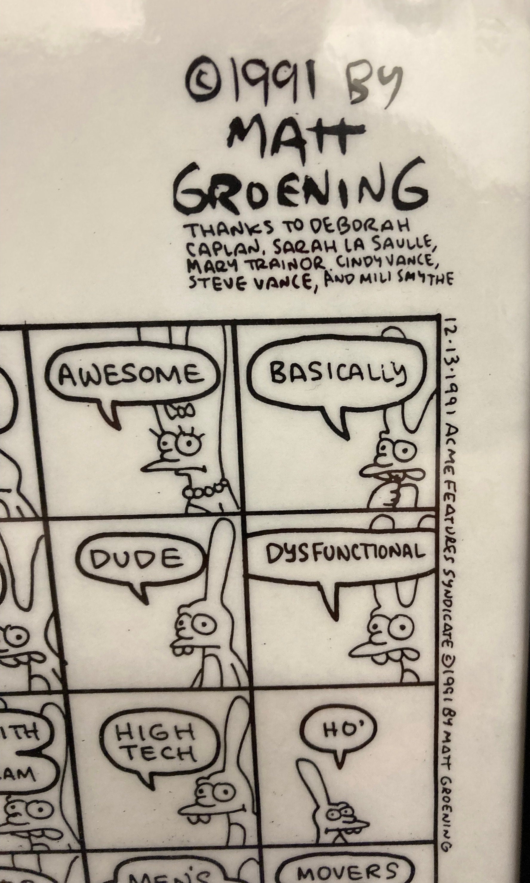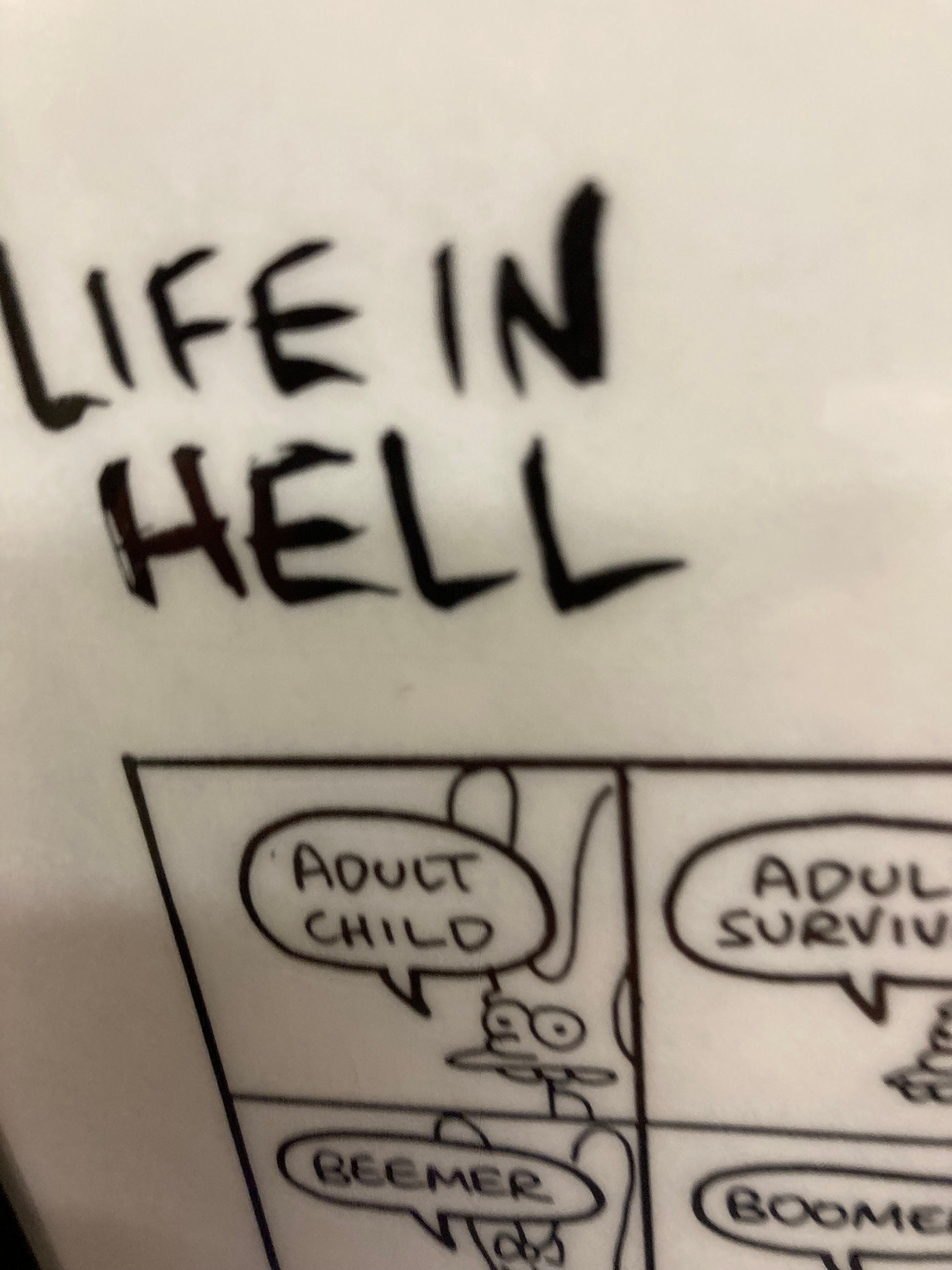 Life in Hell is a weekly comic strip by Matt Groening. The strip features anthropomorphic rabbits and a pair of gay lovers. Groening uses these characters to explore a wide range of topics about love, sex, work, and death. His drawings are full of expressions of angst, alienation, self-loathing, and fear of inevitable doom
