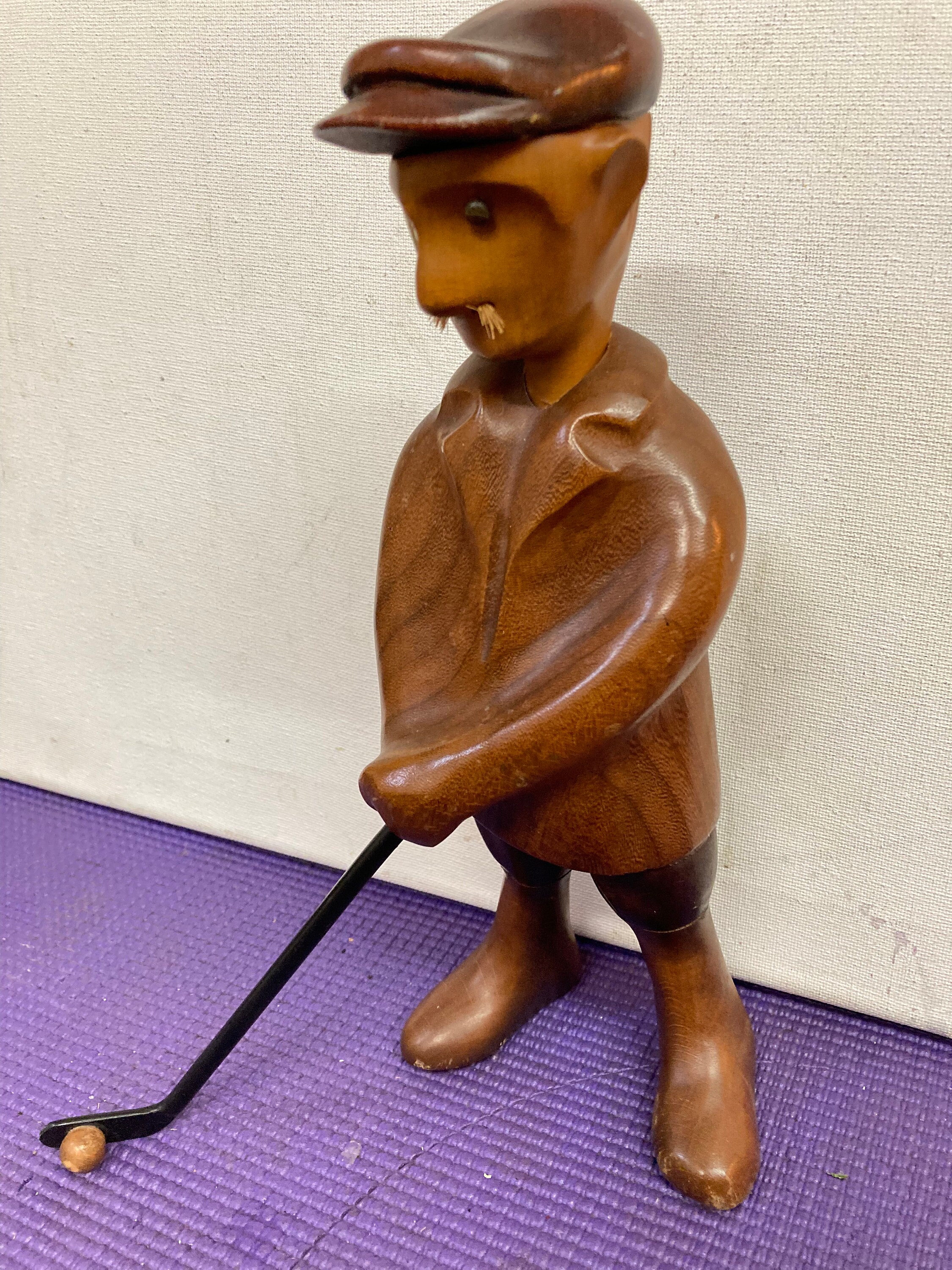 -Very nicely carved folk figural, cartoon style of a Golfer