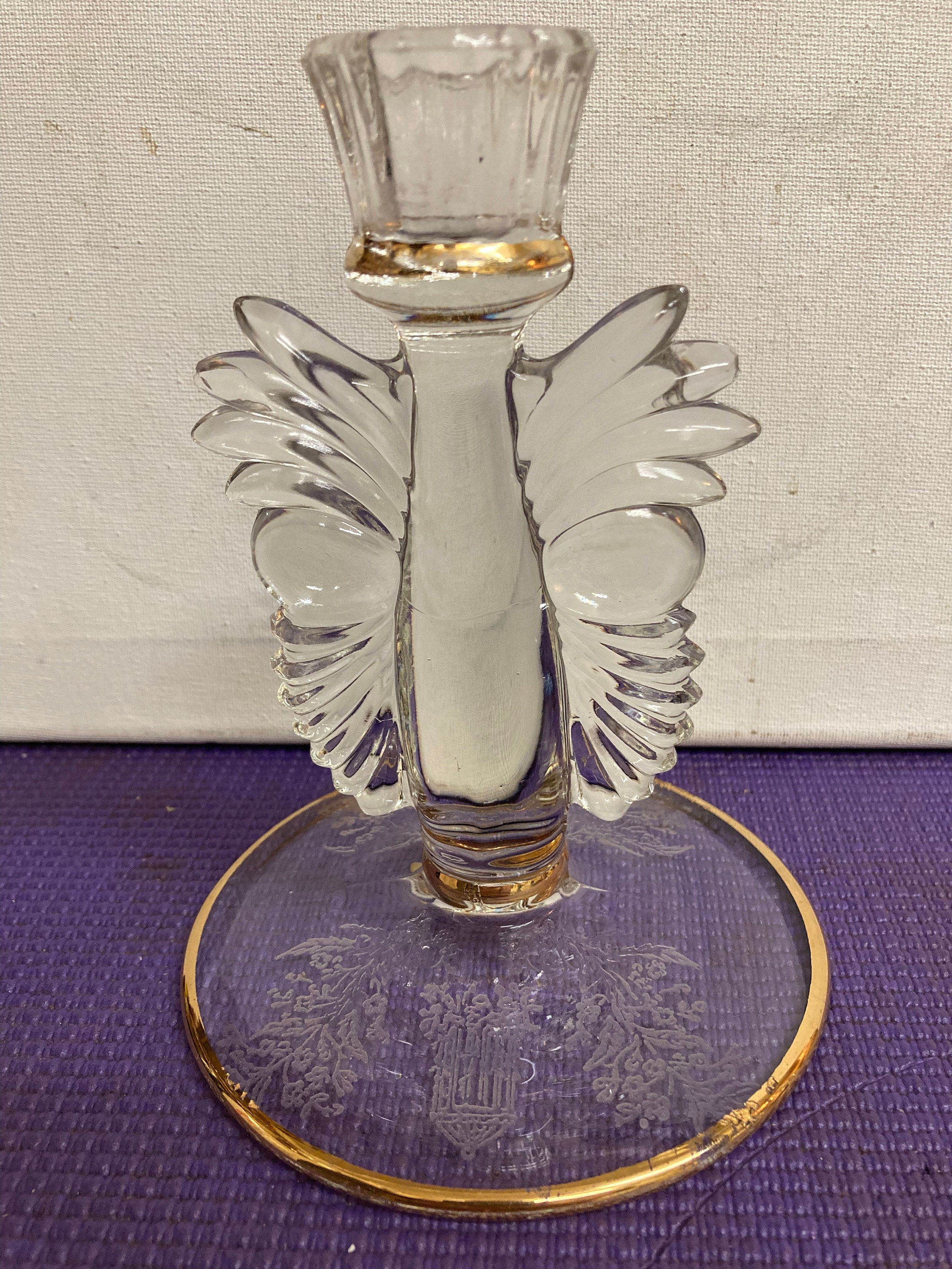 Elegant pair of candlestick holders with 22 K Gold trim.