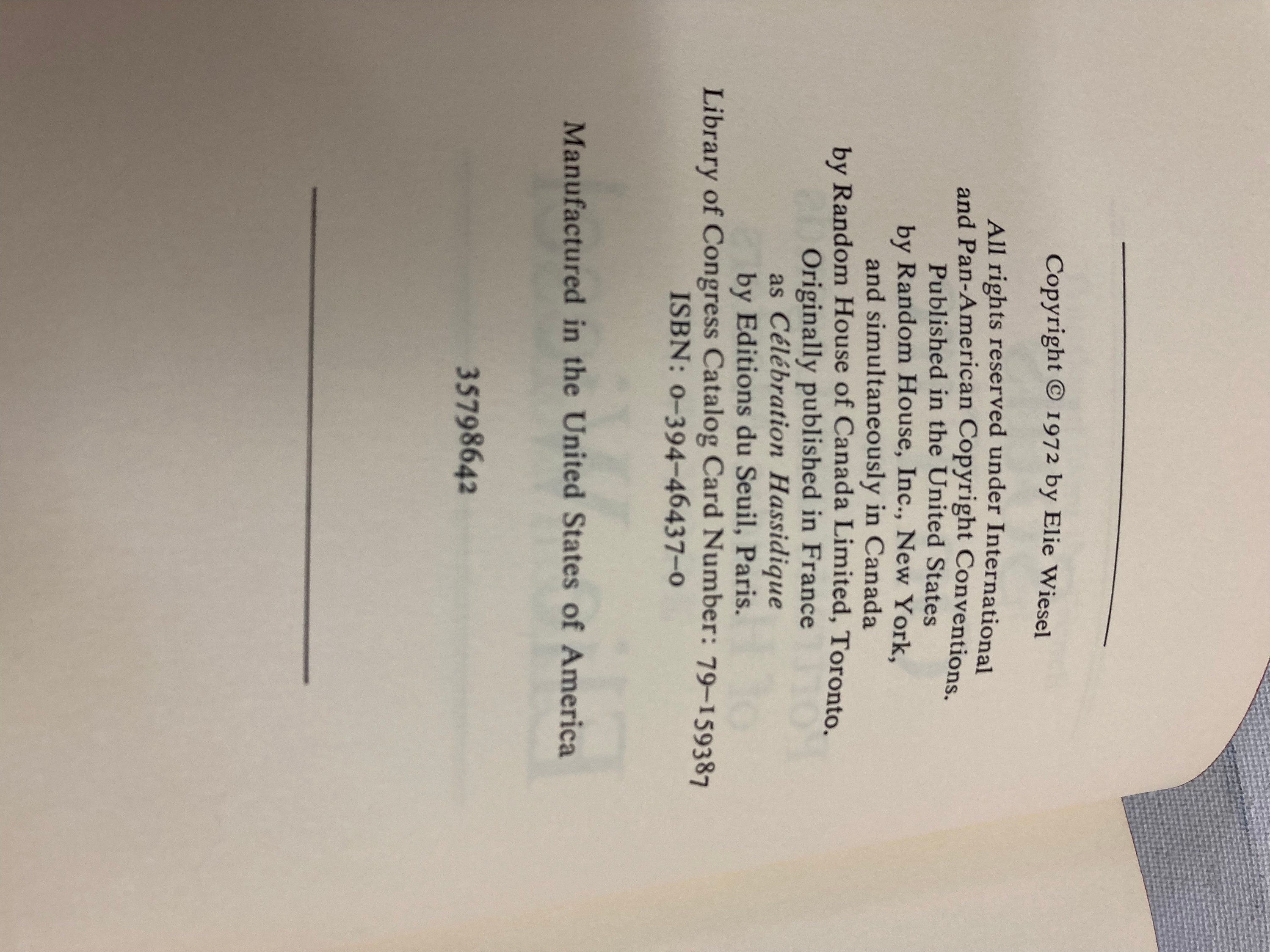 New York: Random House, 1972. First American edition in English. 8vo. Quarter cloth, 268 pp. followed by a Synchronology comparing dates inside the Jewish world with the world at large. The endpapers show the first centers of Hasidism and a tree chart of Hasidic masters and pupil/masters. Fine in fine dust jacket, protected with an archival-quality mylar cover.