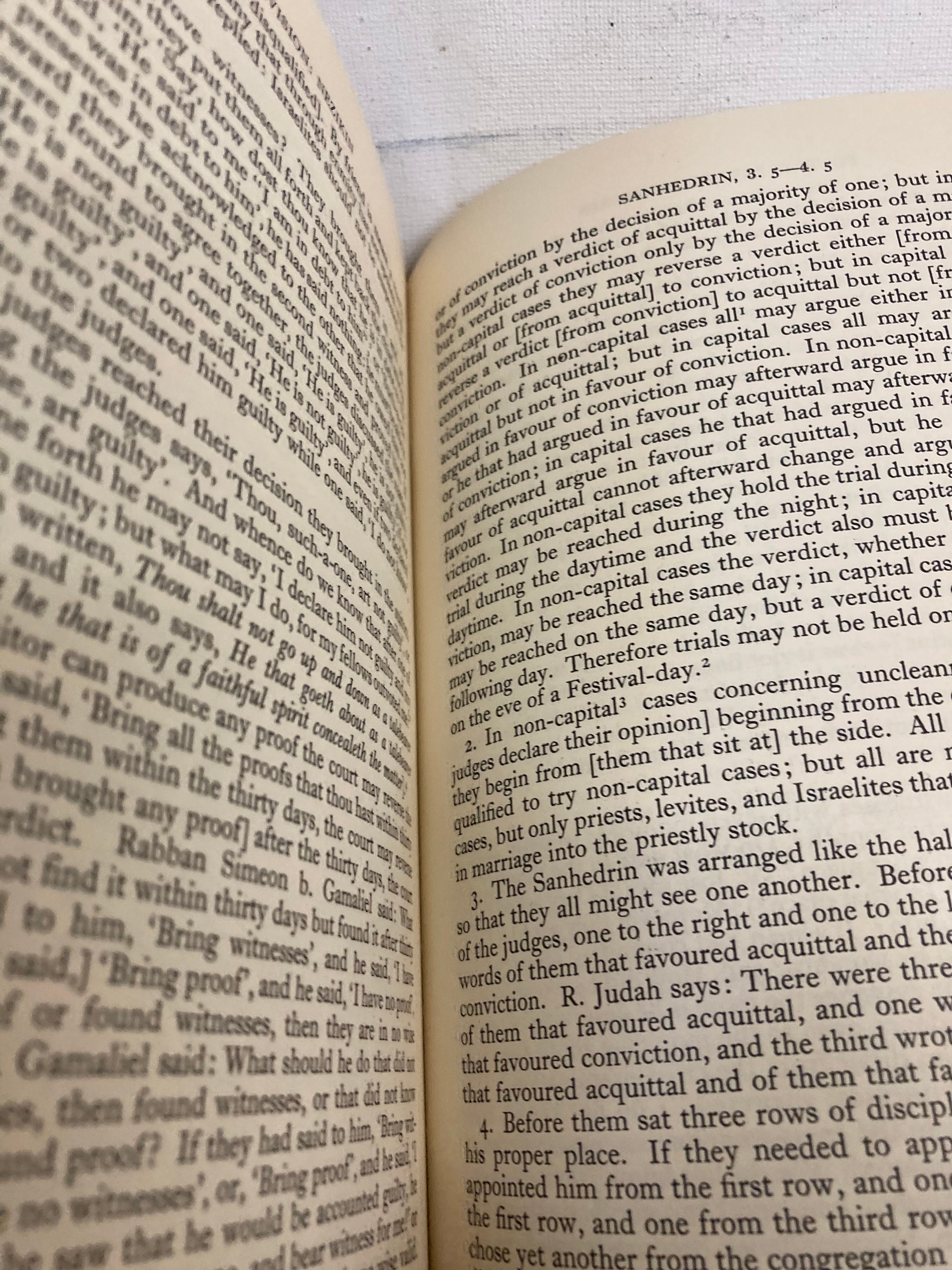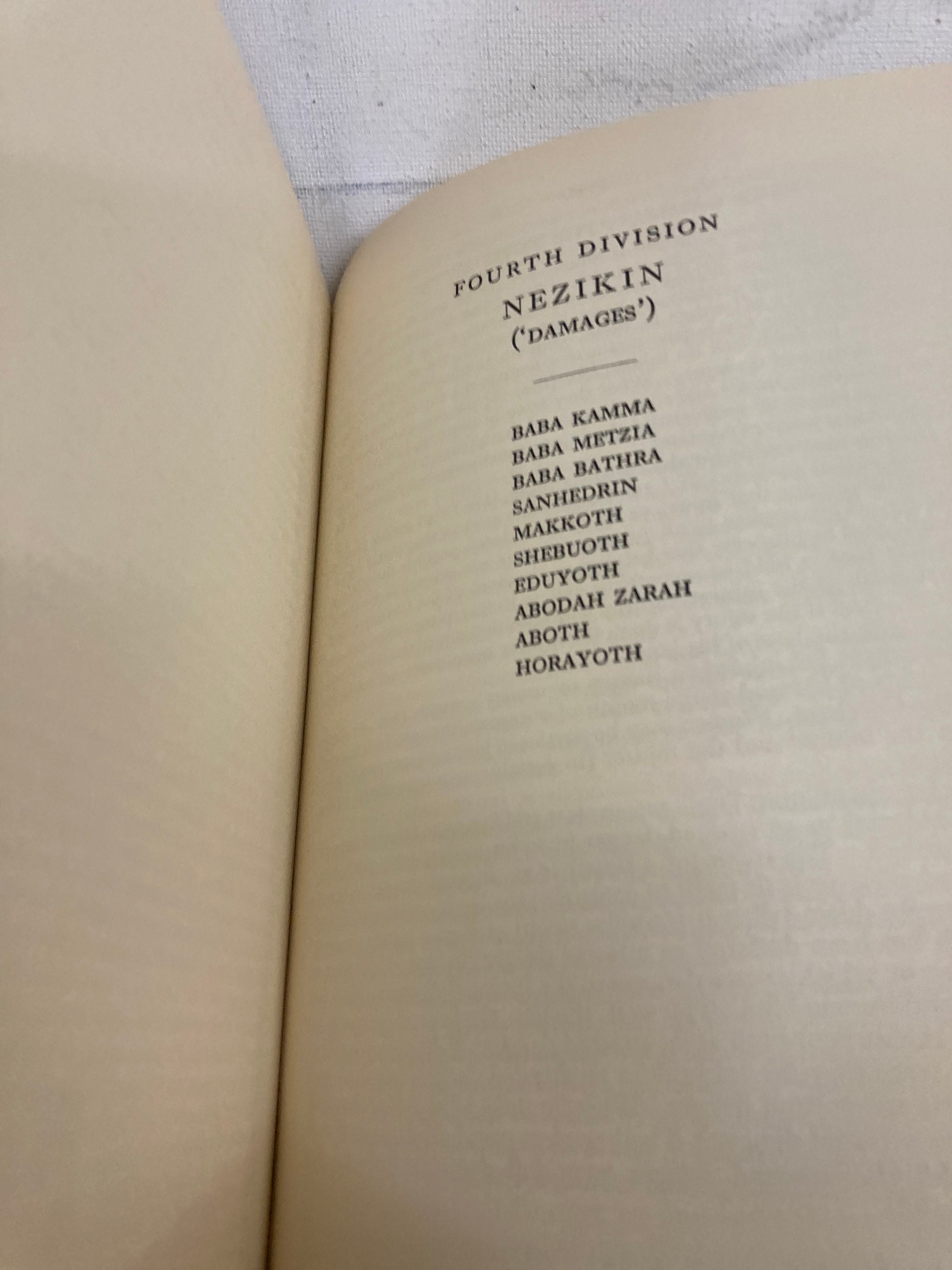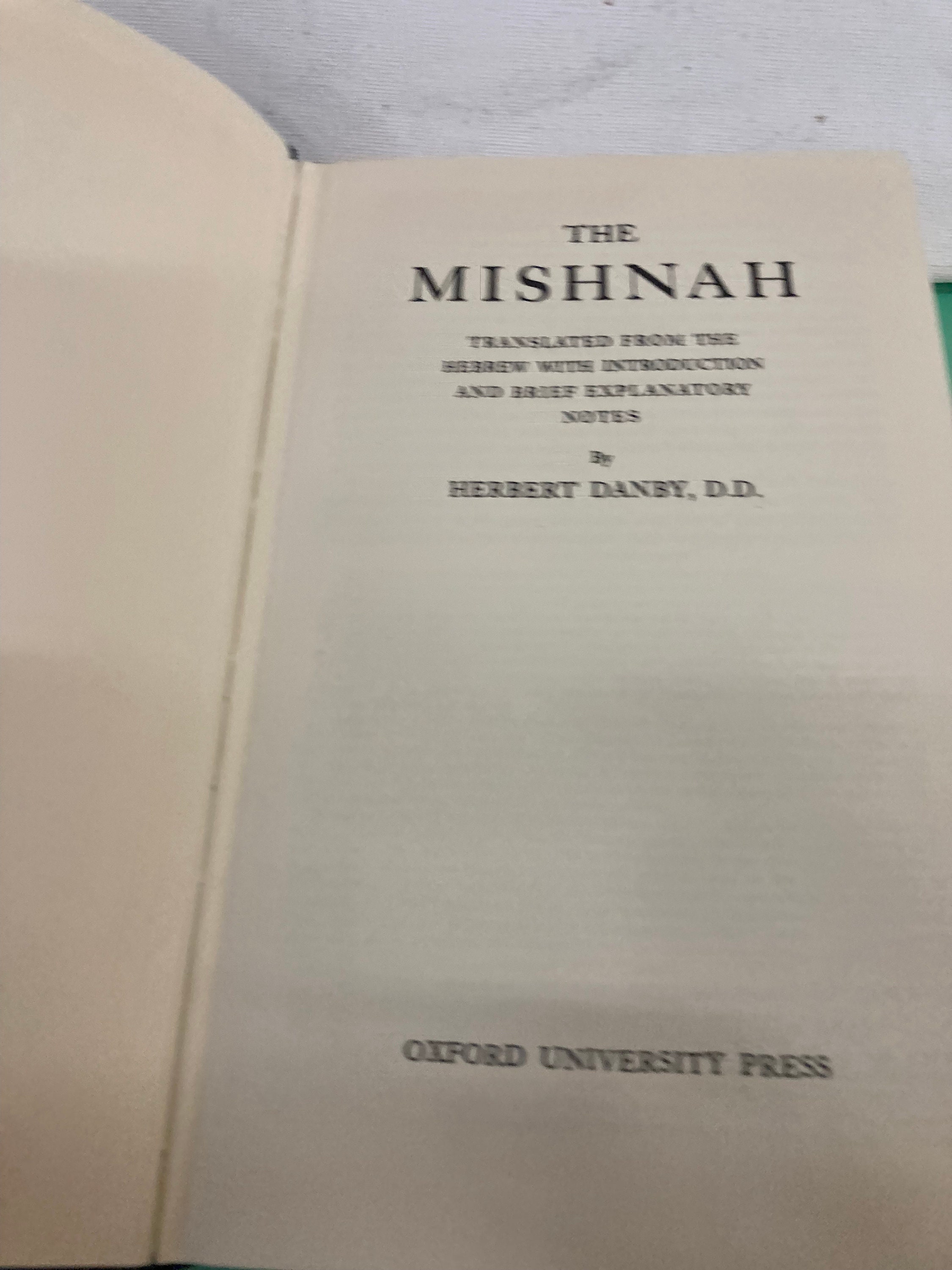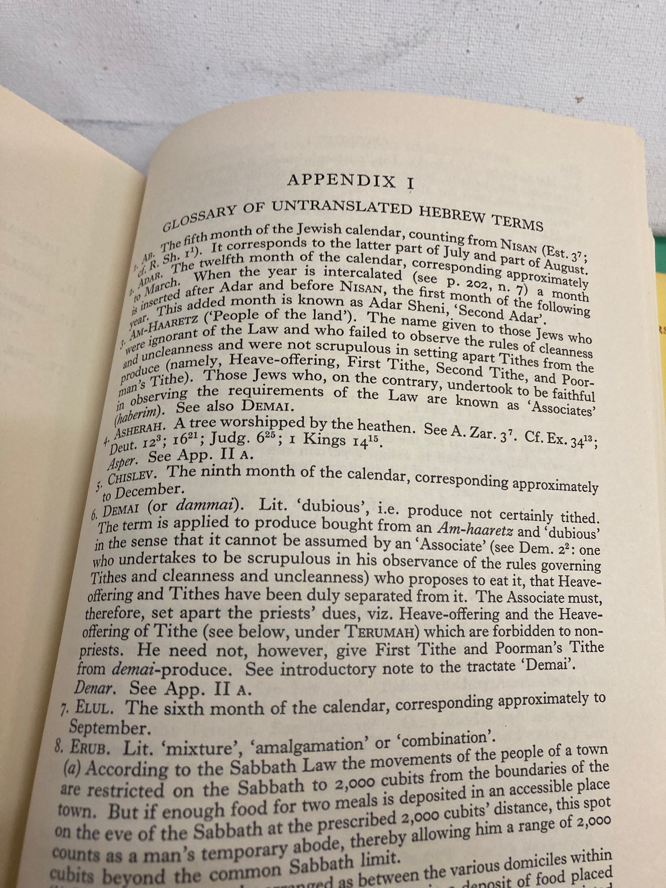 XXXII + 844 PAGES. Includes list of abbreviations, introduction, glossary of untranslated Hebrew terms, tables of money, weights and measures, rabbinical teachers quoted or referred to in the text of the Mishnah, the rules of uncleanness, as summarized by Elijah, the Gaon of Wilna, alphabetical list of abbreviated titles of the tractates of the Mishnah, index of biblical passages quoted in the text of the Mishnah, & general index.