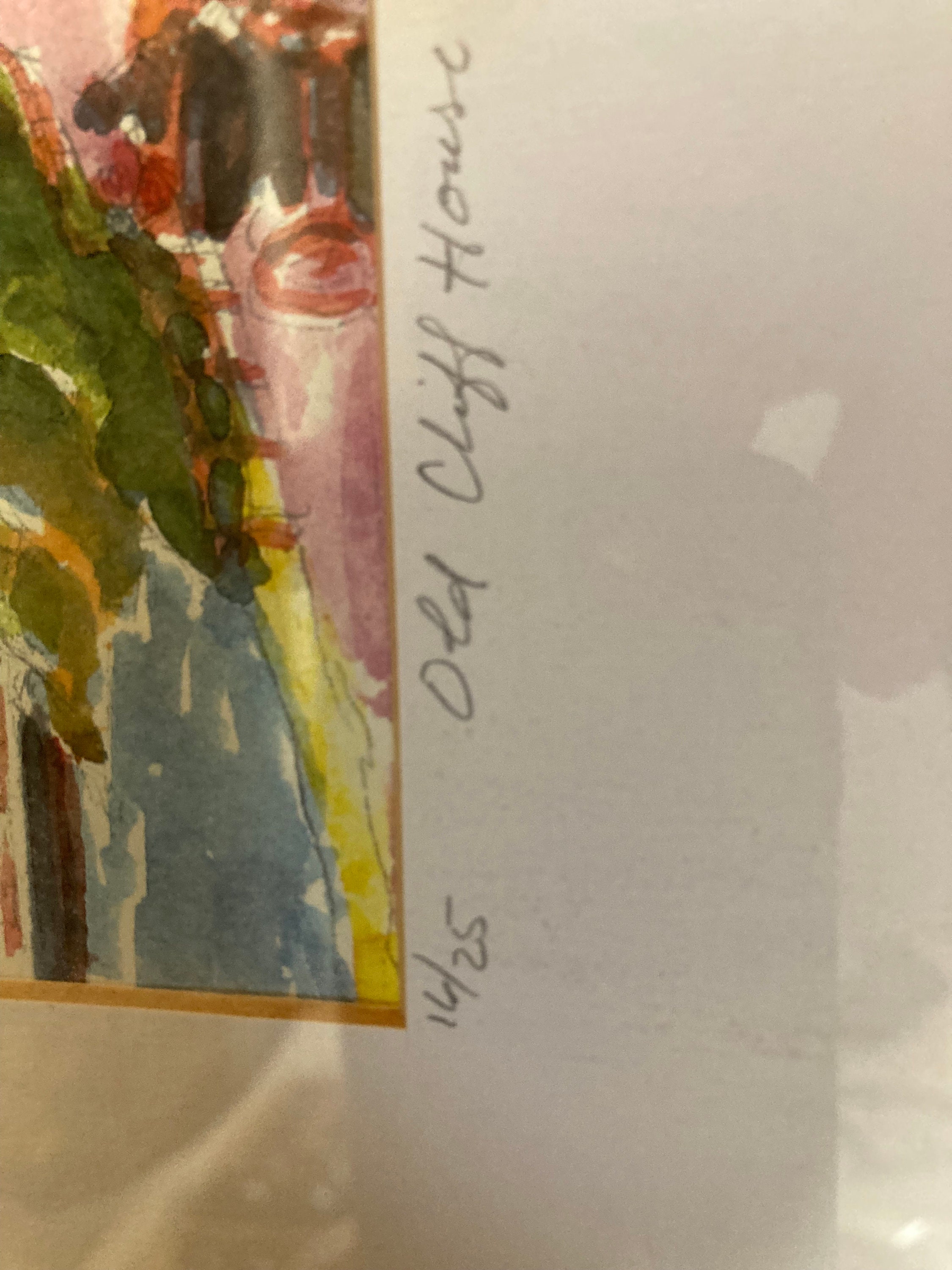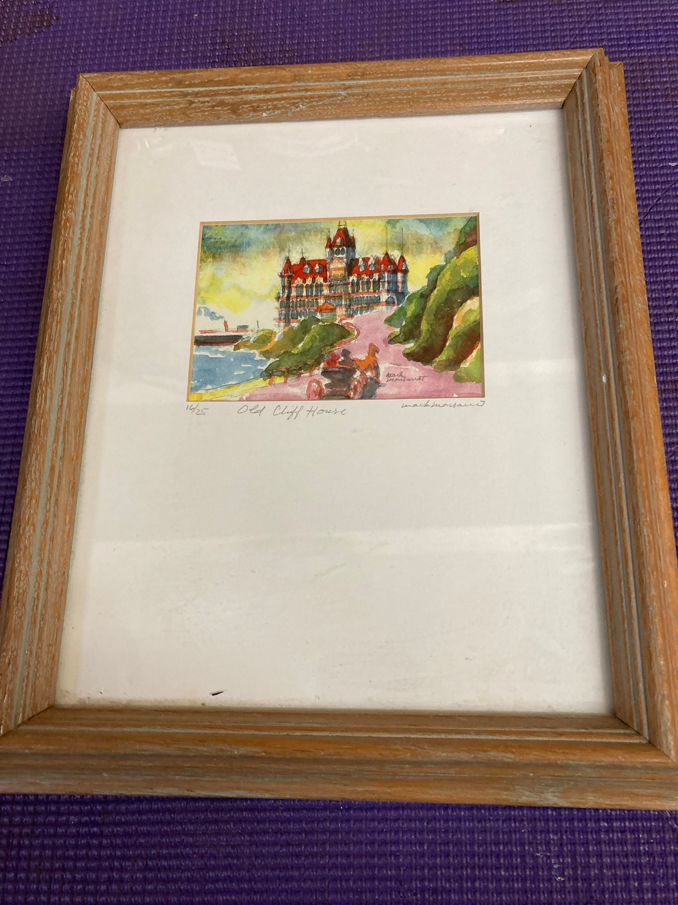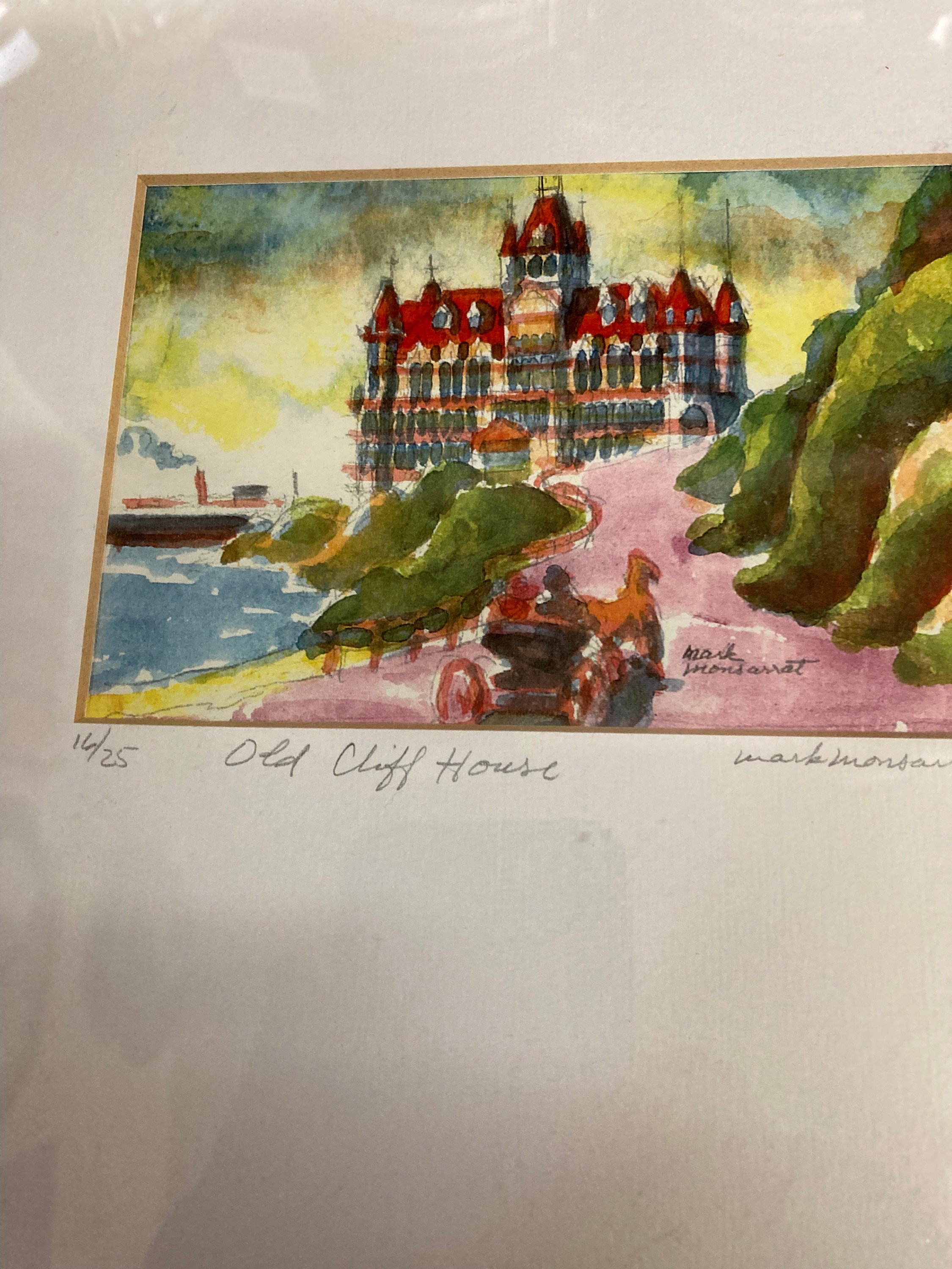 Limited editions (extremely SMALL RUN) laser print of original water color paintings, depicting Old Cliff House in San Francisco, United States by American artist Mark Monsarrat.- Signed, titled and numbered in pencil lower margin- Number 16 of only 25 copies ever produced- Bright and vibrant Framed size 12" x 10" - Image size 4.5" x 3" - Very limited editions print in Mint condition