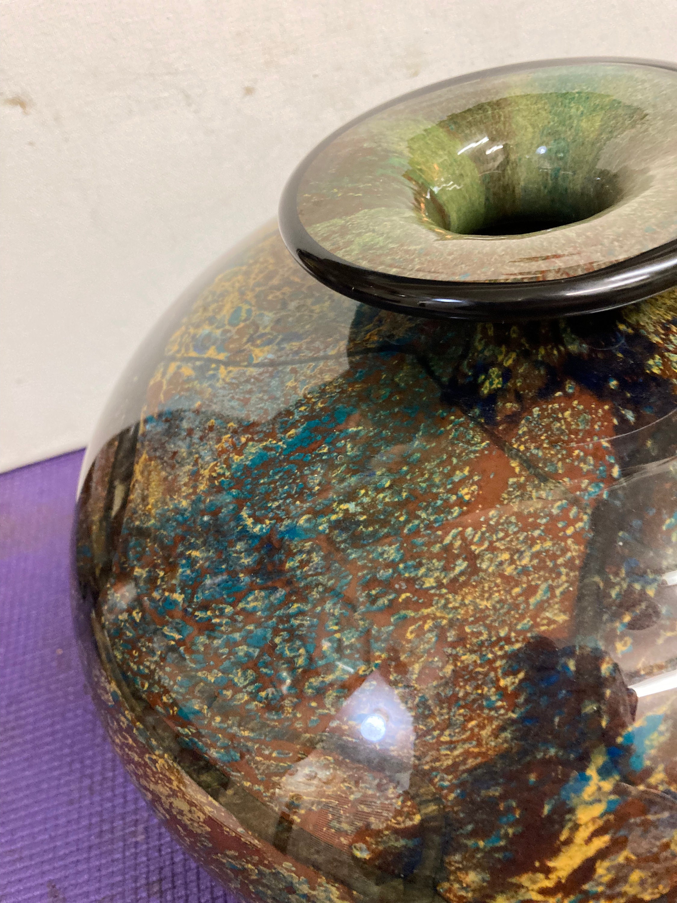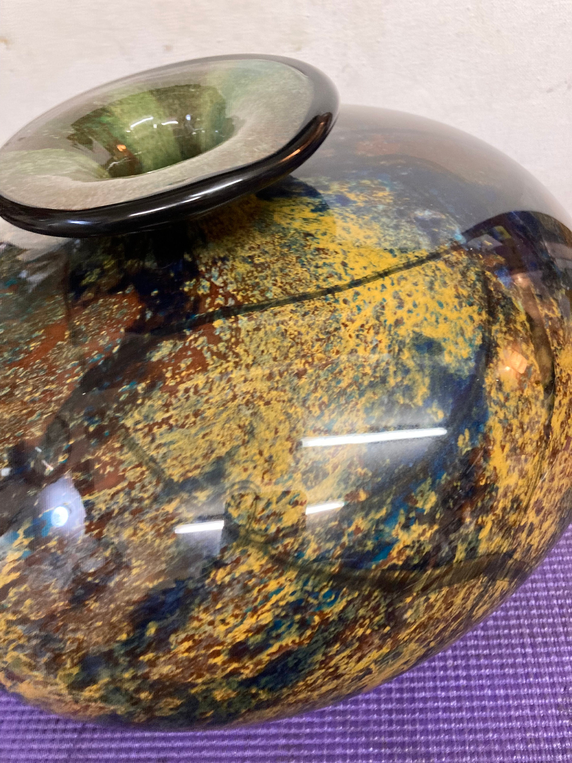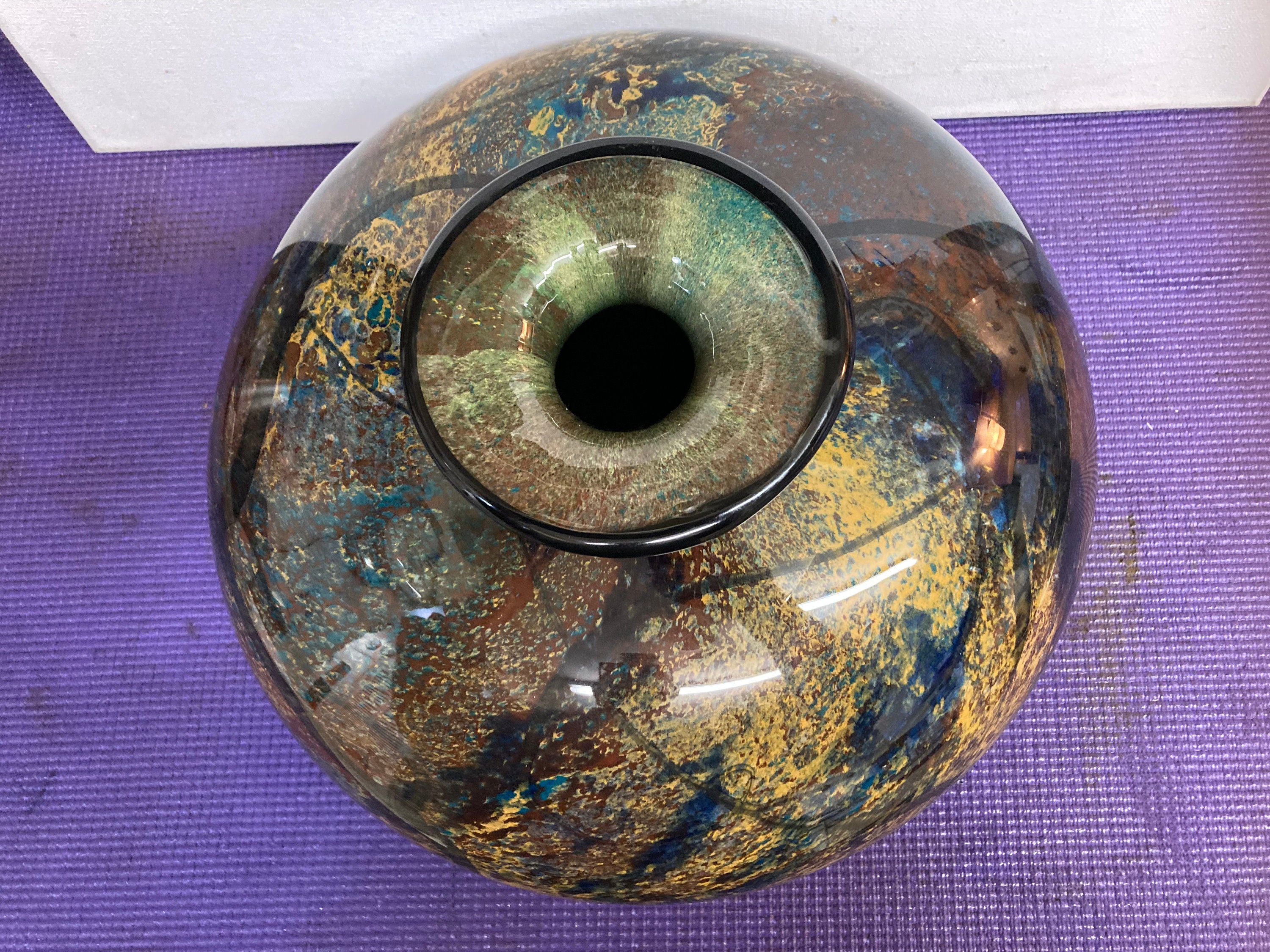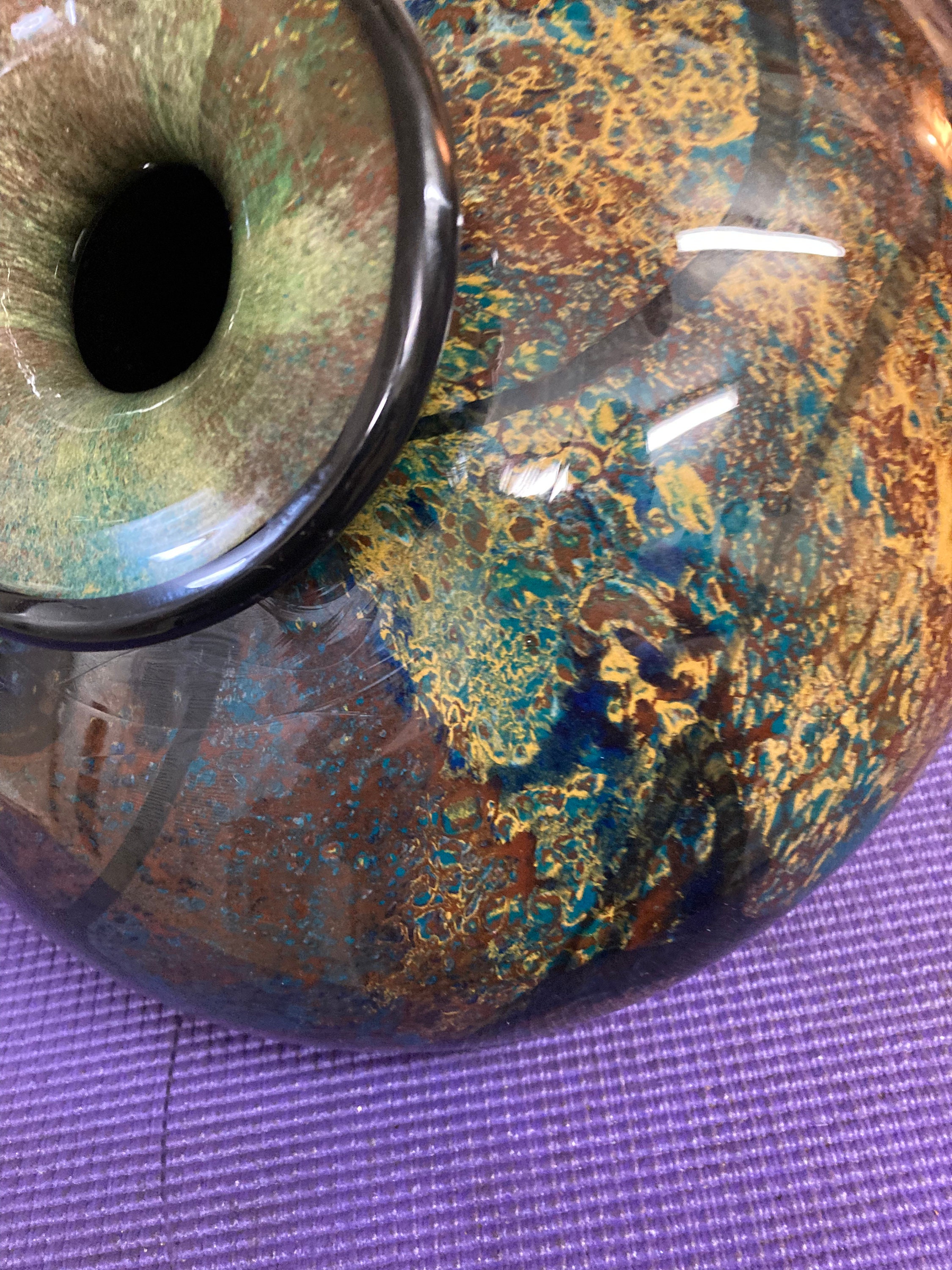 Magnificent multicolor glazed ceramic vase Signed by the artist: Refer to picture pleaseMix of Burgandy, Saphire Blue, Black, Yellow,& BrownVintage Glazed Ceramic Vase8" Tall, 11 " DiameterWeights 7 3/4 lbs