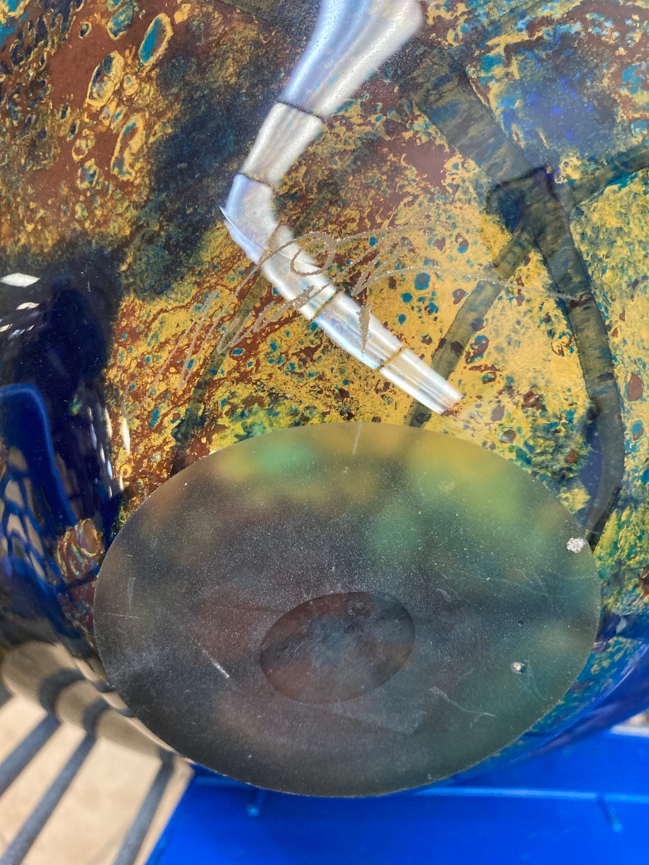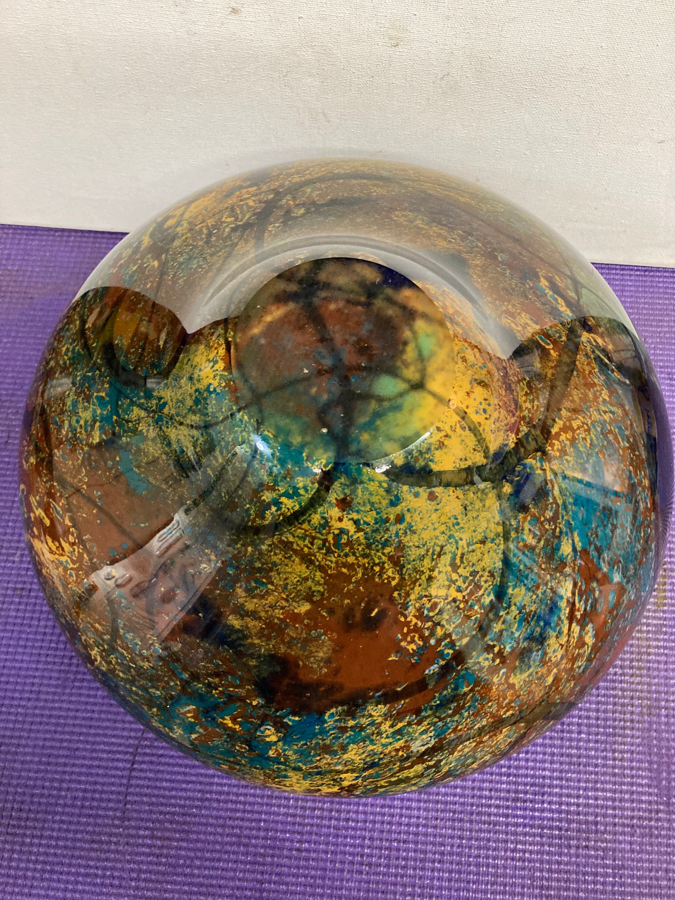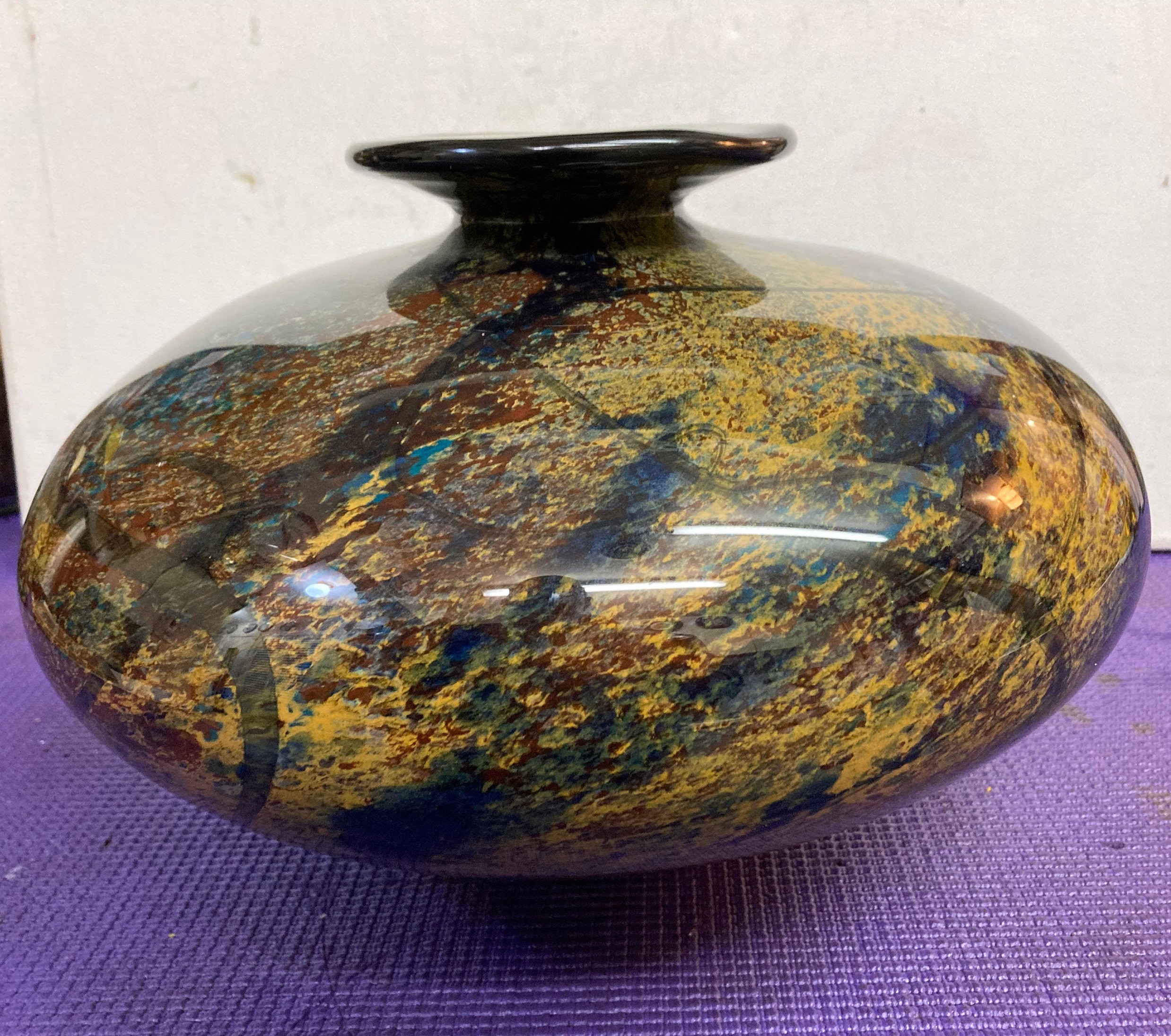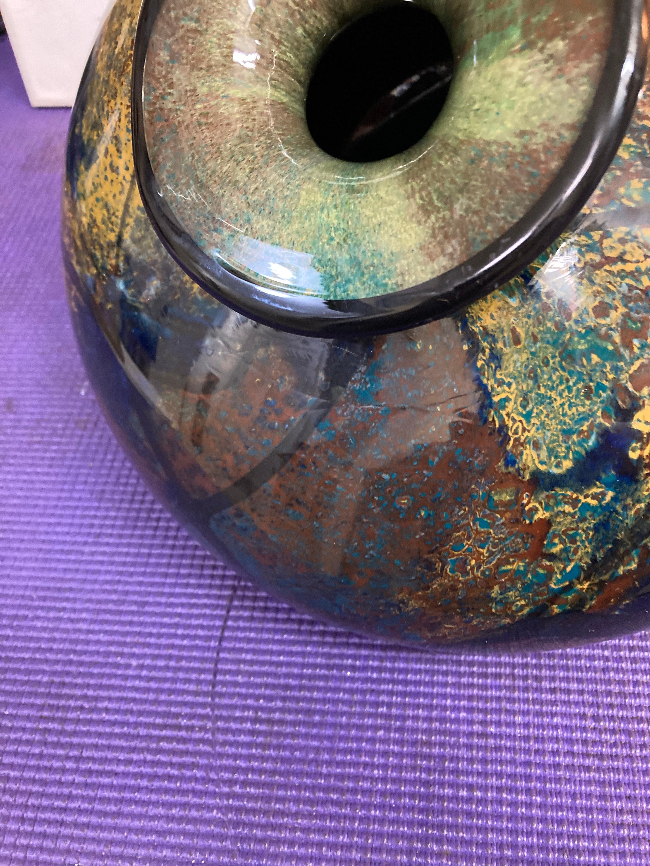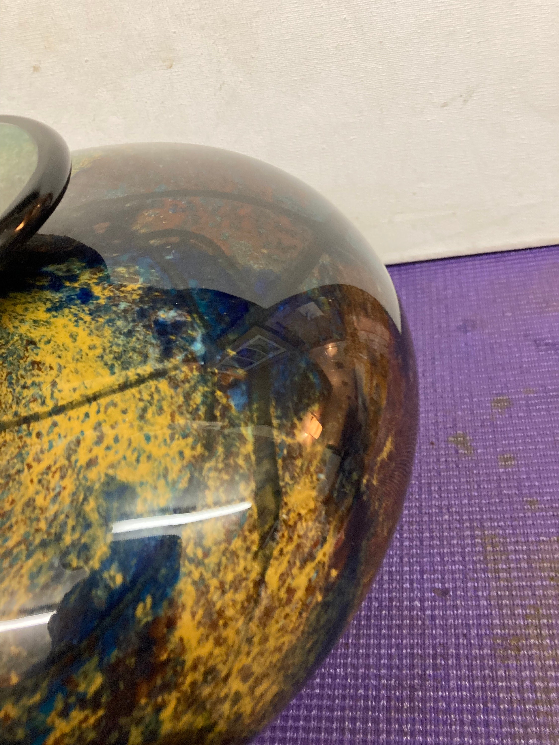 Magnificent multicolor glazed ceramic vase Signed by the artist: Refer to picture pleaseMix of Burgandy, Saphire Blue, Black, Yellow,& BrownVintage Glazed Ceramic Vase8" Tall, 11 " DiameterWeights 7 3/4 lbs