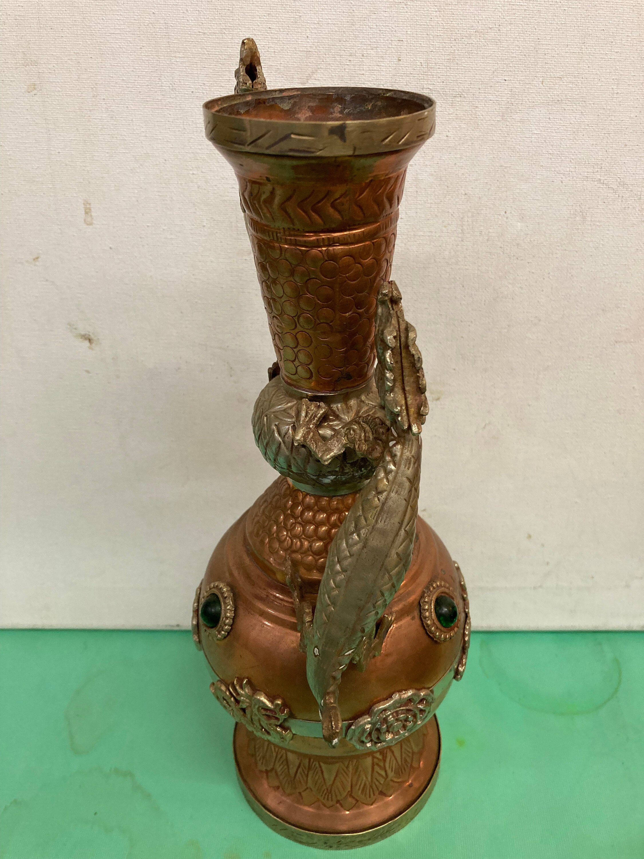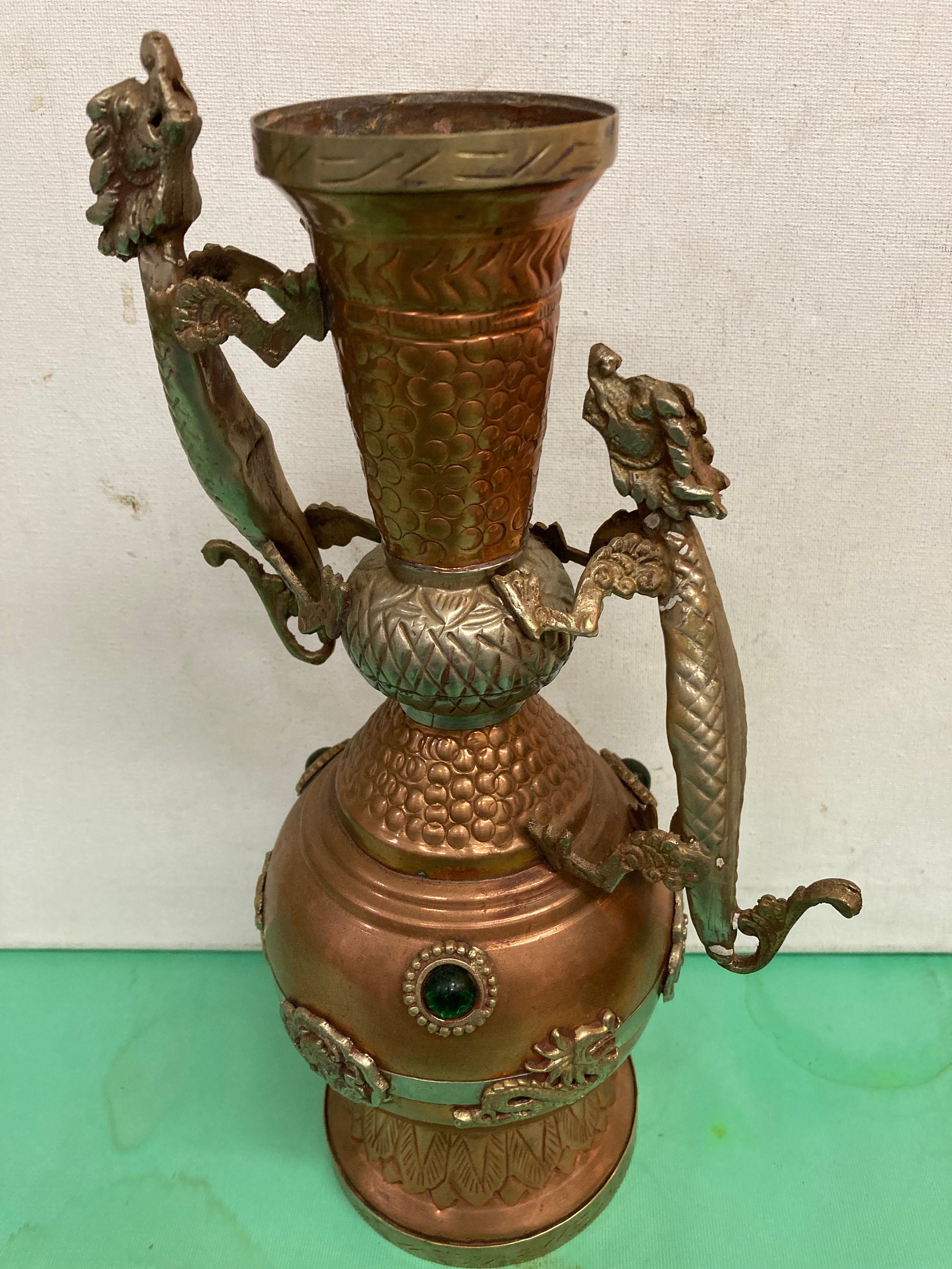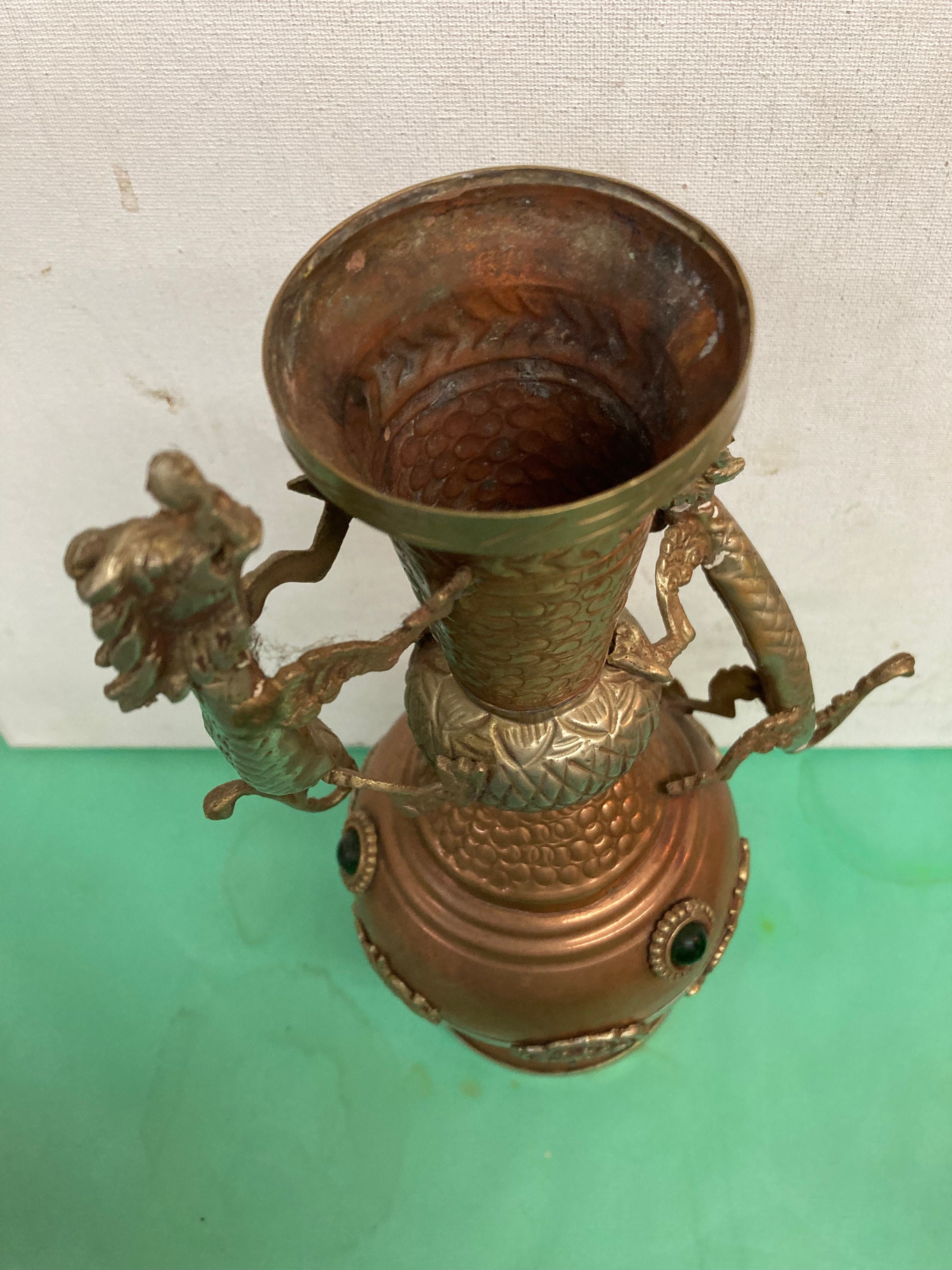 Unusual Design Antique Chinese 11” Copper Vase with 2 Brass Climbing Dragons and a Green Glass Cabochon (maybe ceramic but I’m not sure) . Approximately 11” Tall, 6 1/2” Wide 4 1/2deep, 2 1/4” Top Opening Diameter. Base 3 3/4 " Weighs just over 1lb.