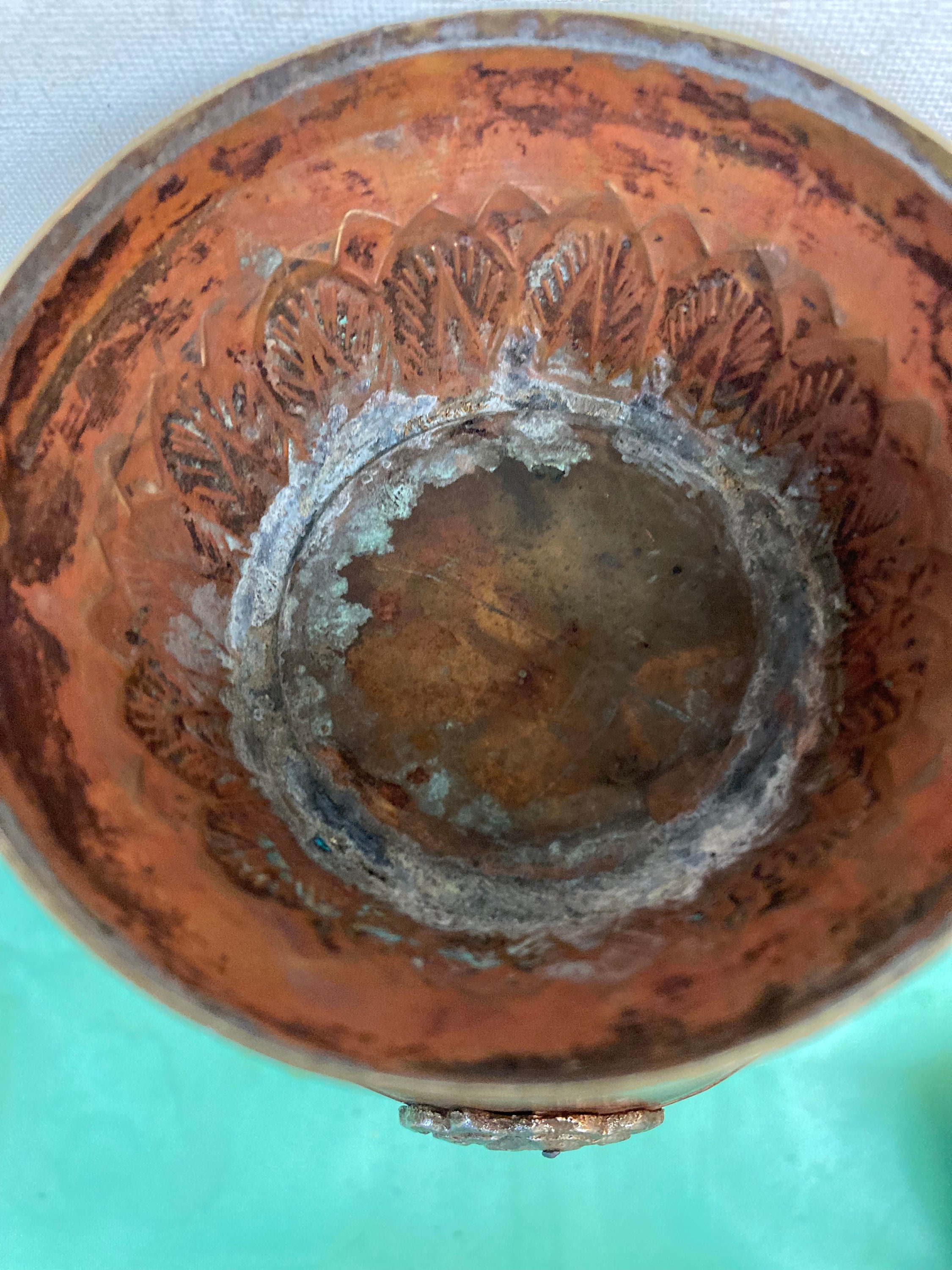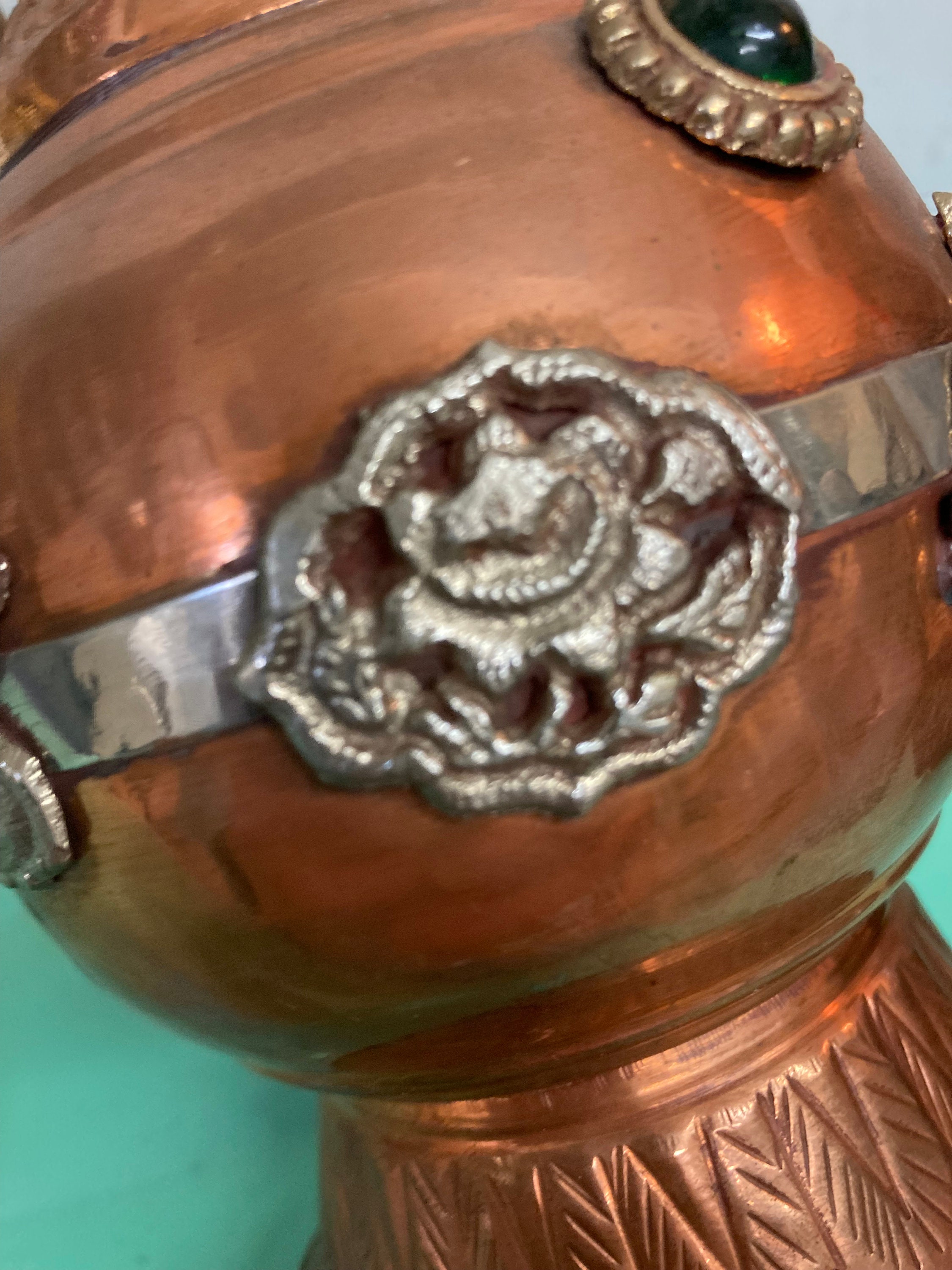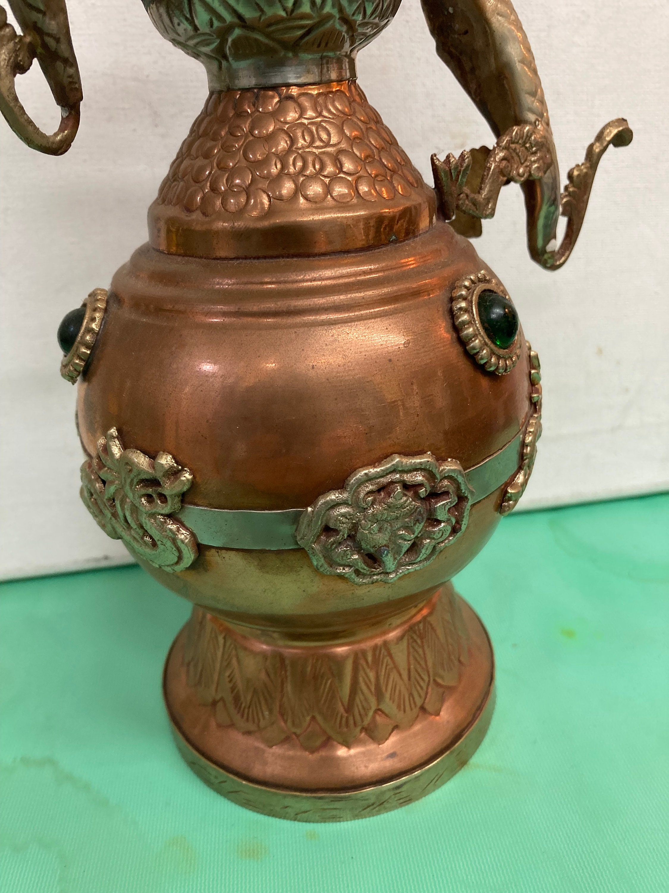 Unusual Design Antique Chinese 11” Copper Vase with 2 Brass Climbing Dragons and a Green Glass Cabochon (maybe ceramic but I’m not sure) . Approximately 11” Tall, 6 1/2” Wide 4 1/2deep, 2 1/4” Top Opening Diameter. Base 3 3/4 " Weighs just over 1lb.