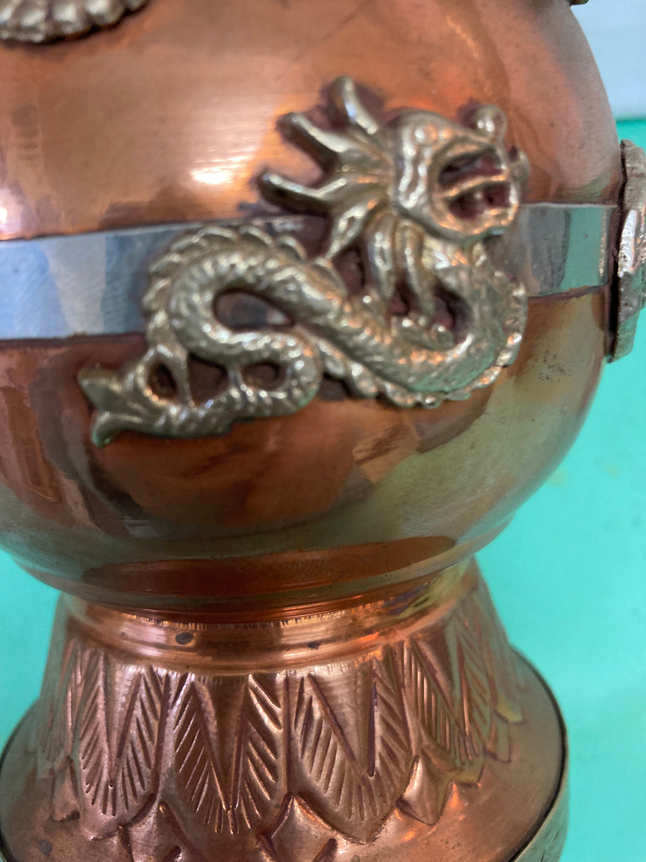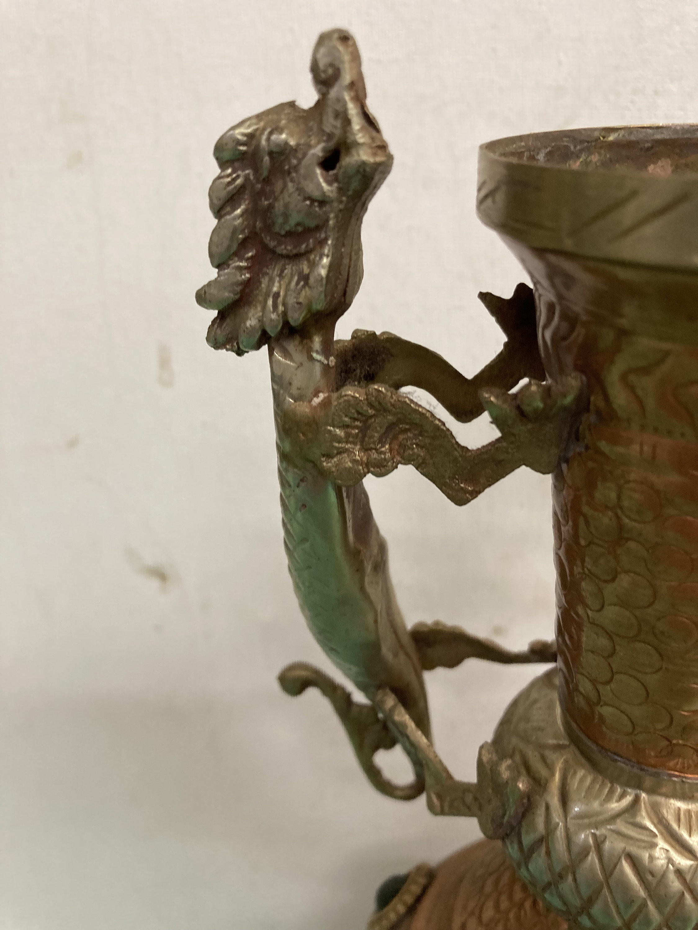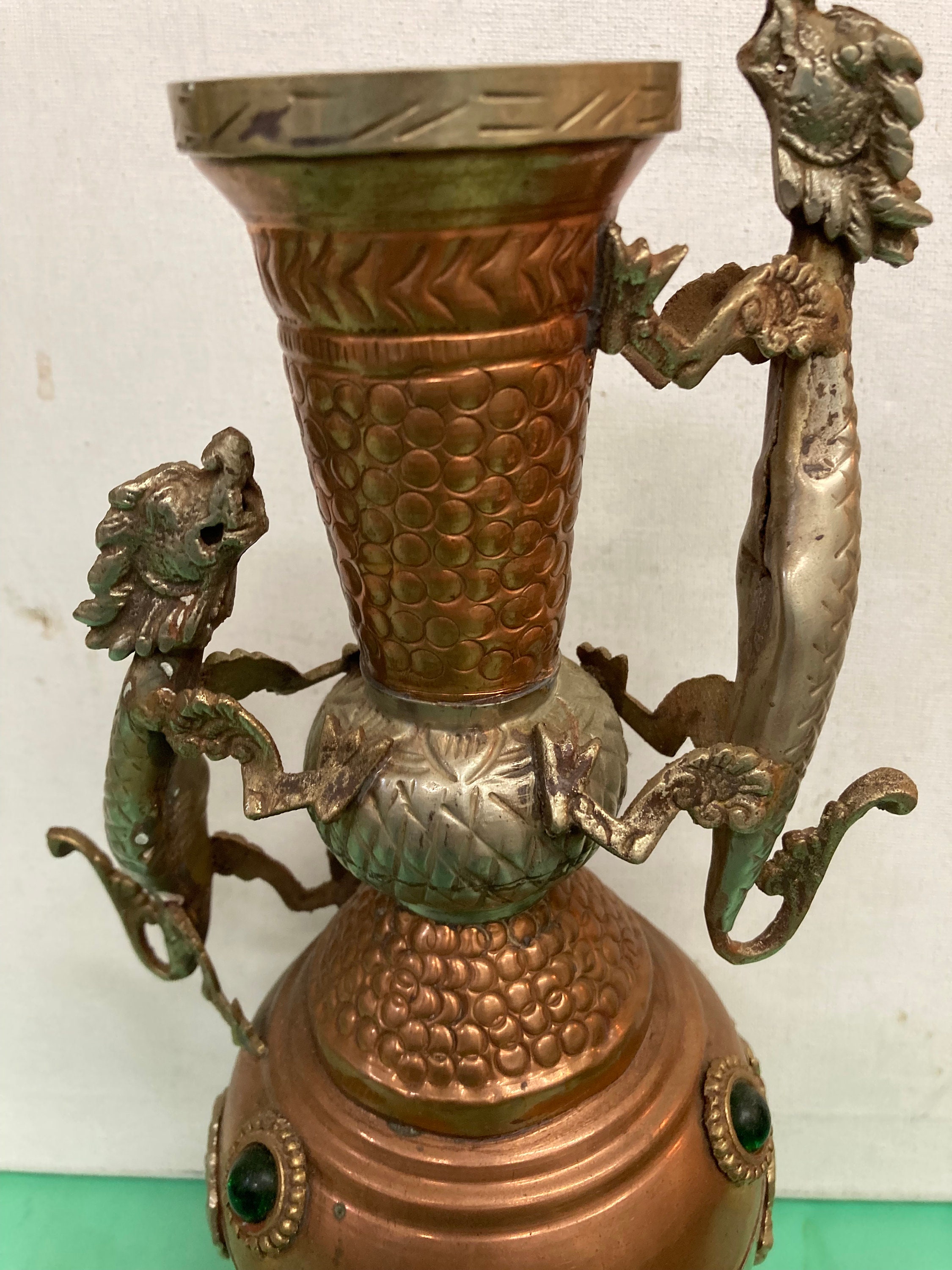 Antique Chinese 11” Tall Copper Vase with 2 Brass Climbing Dragons Unusual Design