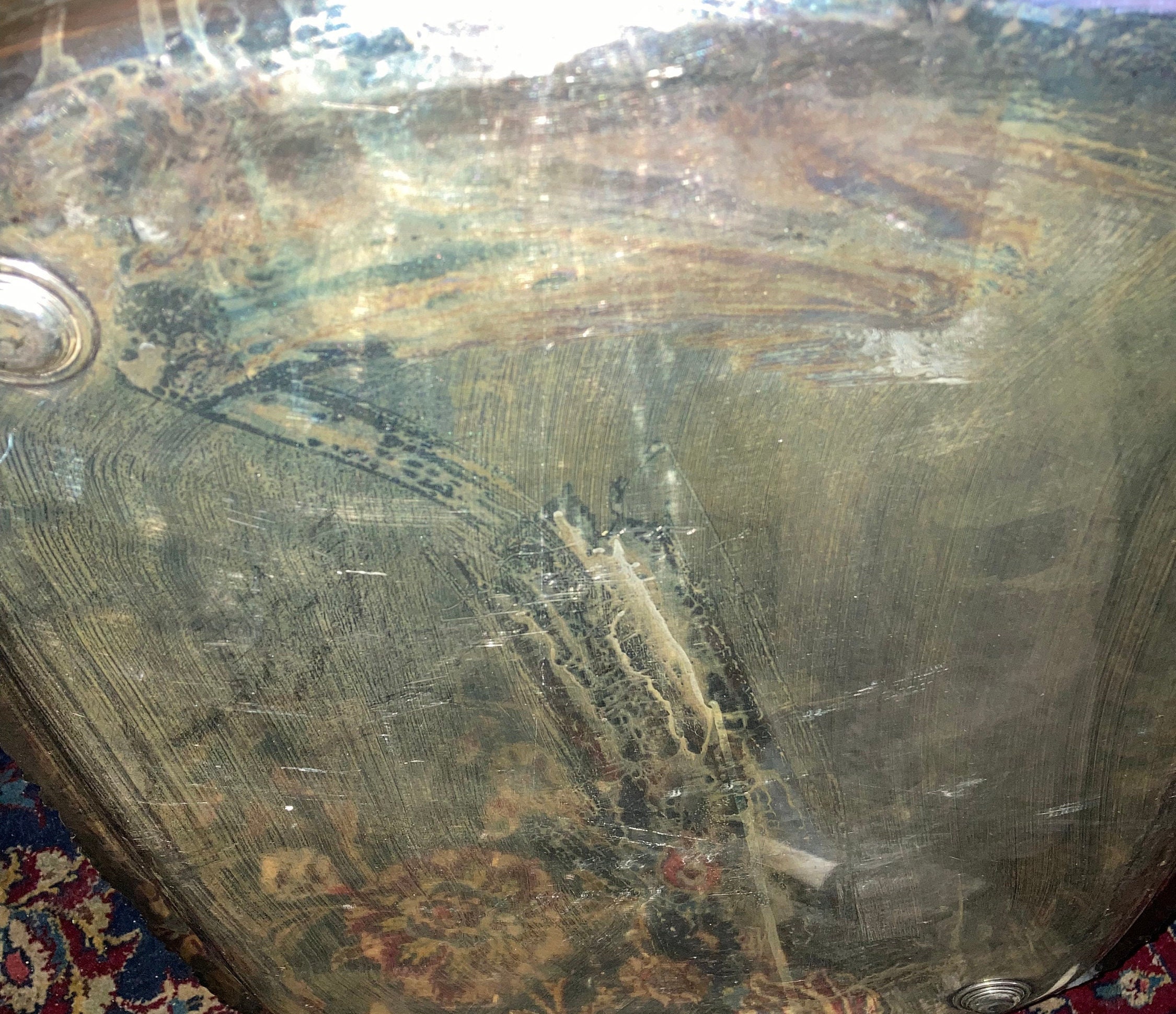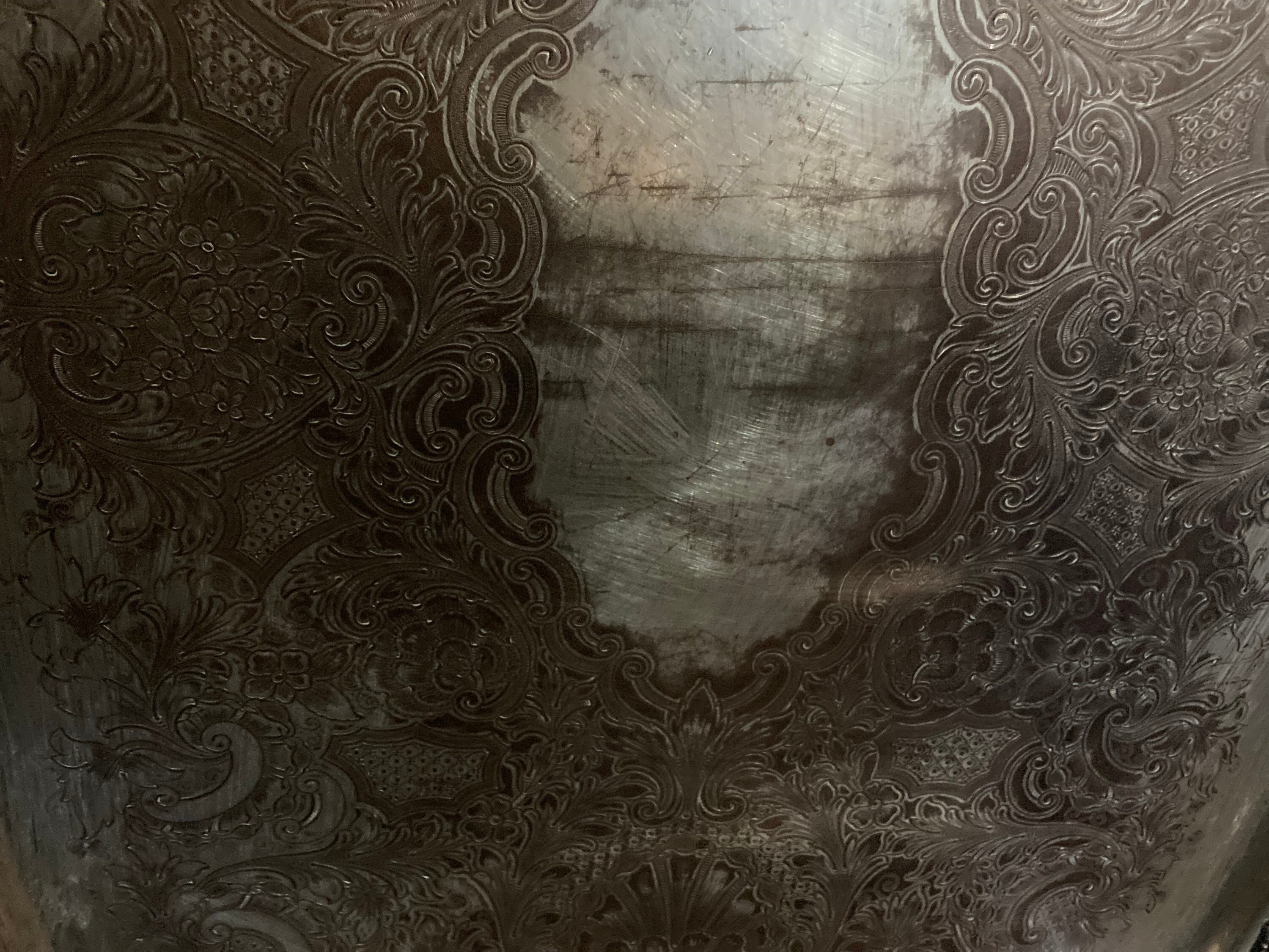 This tray has a beautiful design on the top. There are no dents or dings -- and it has aged to perfection. Some like to polish their silver plated pieces but I much prefer them tarnished and mellowed from decades of use. It's just a lovely piece that you'll be proud to use in your home. It is marked.