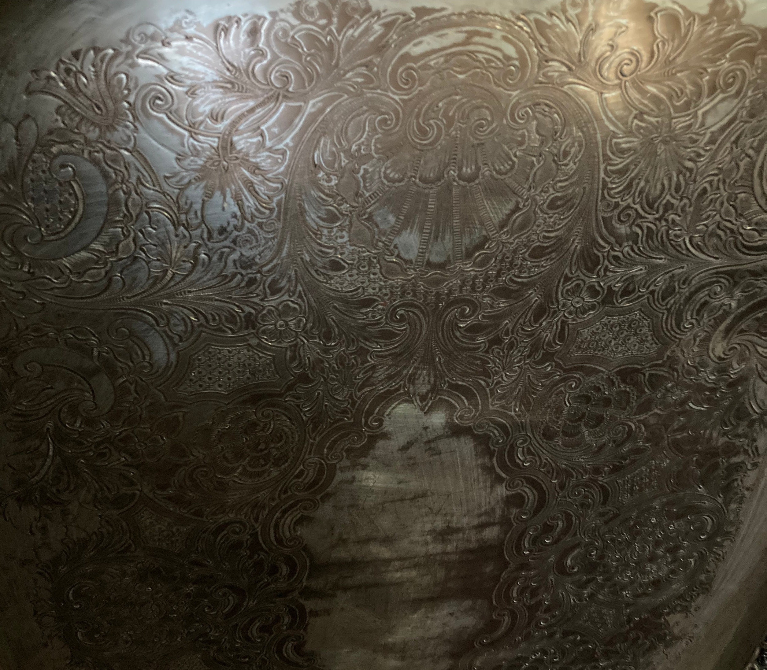 🎆VINTAGE EMBOSSED SILVER TRAY🎉BEAUTIFUL FLORAL DECORATIONS, ,WITH BIG HANDLES,🏫A RARE FIND 🔍