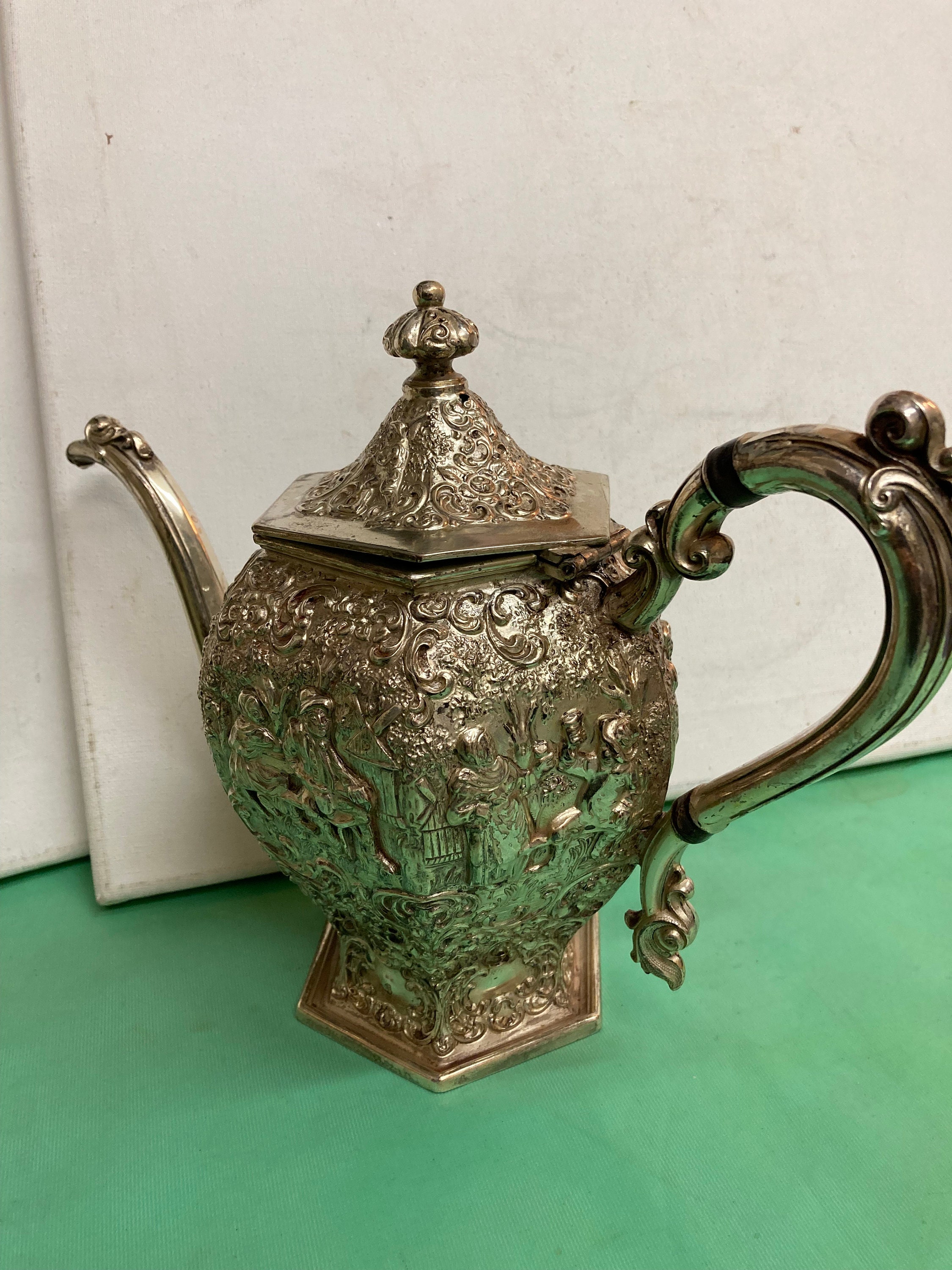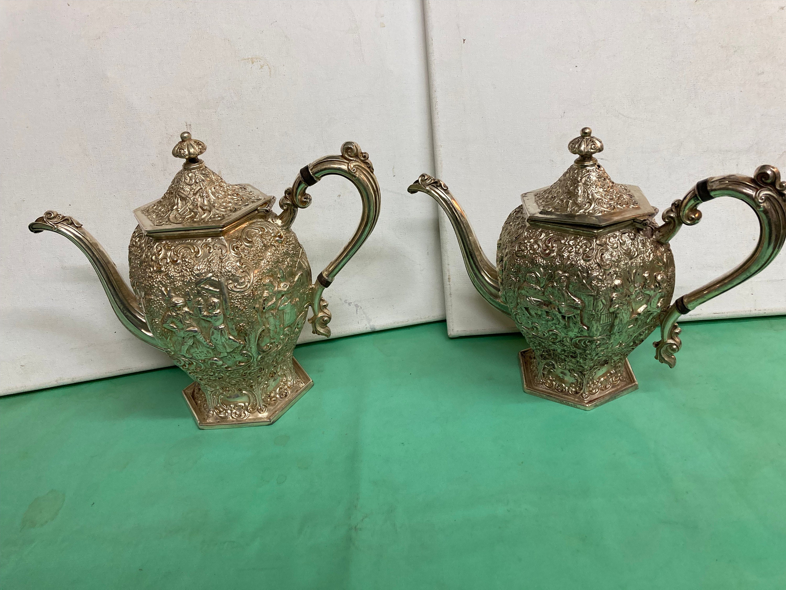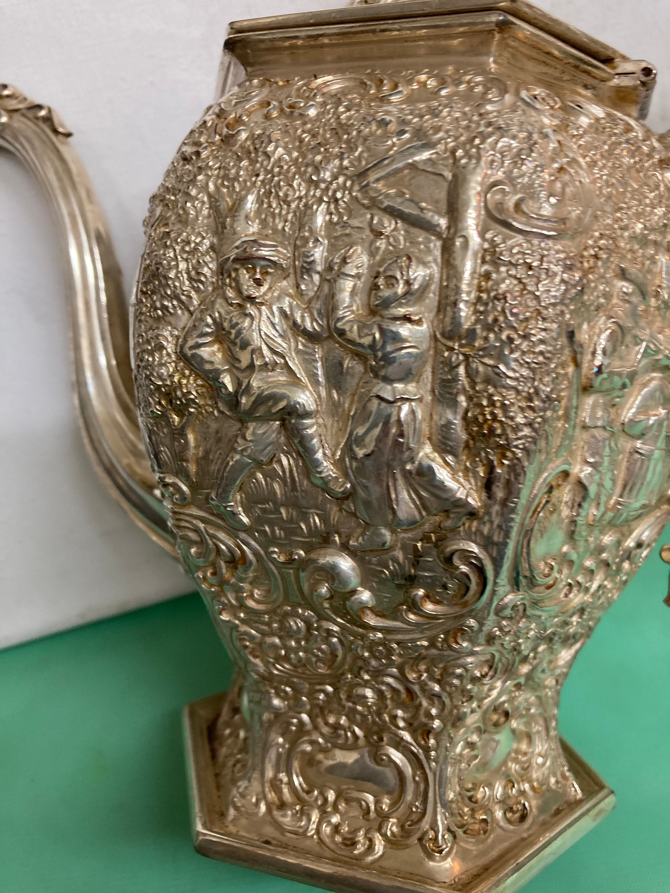 These attractive silver teapots have incredible chasing, raised figures, Dutch inspired, teapot,