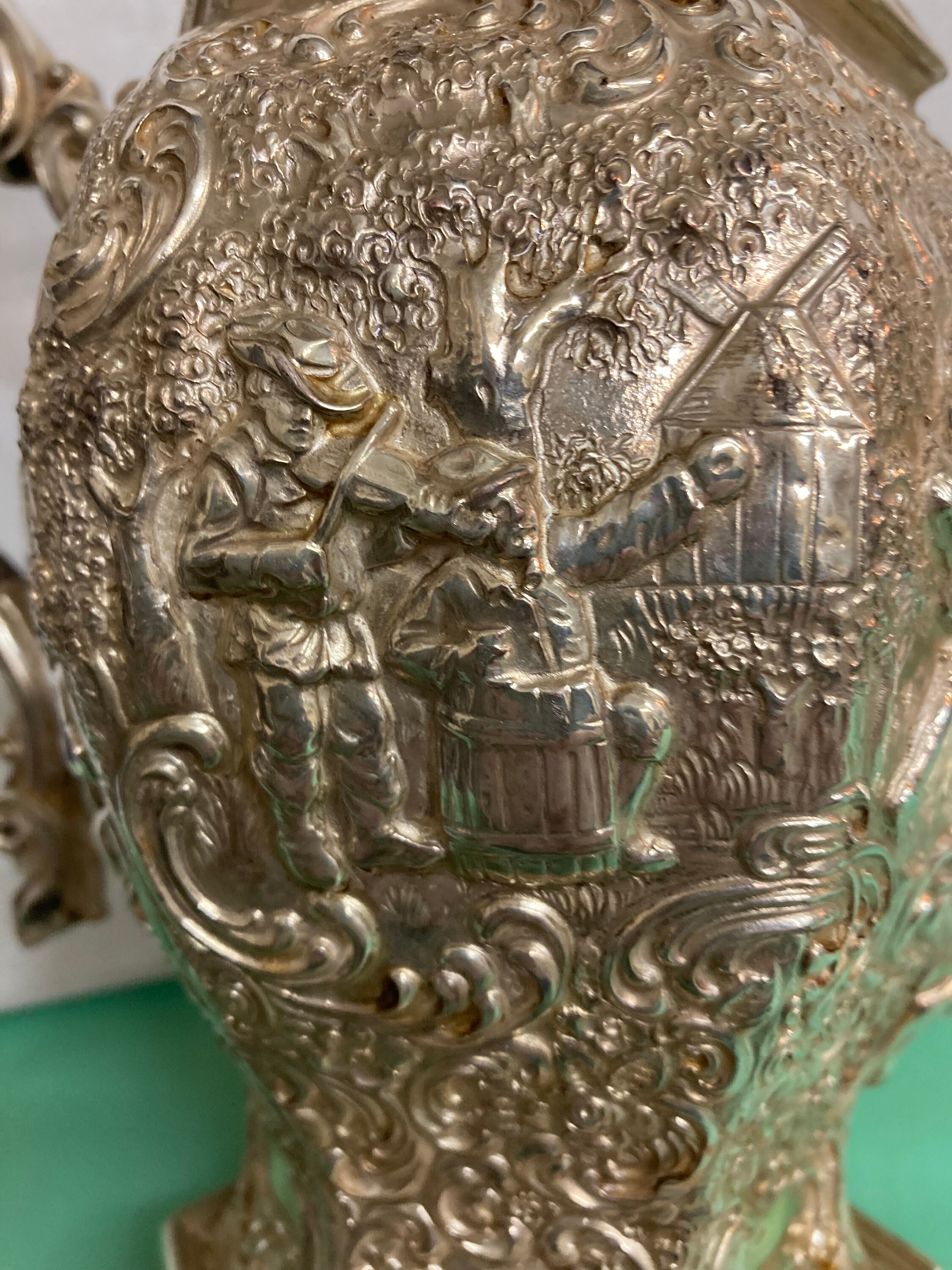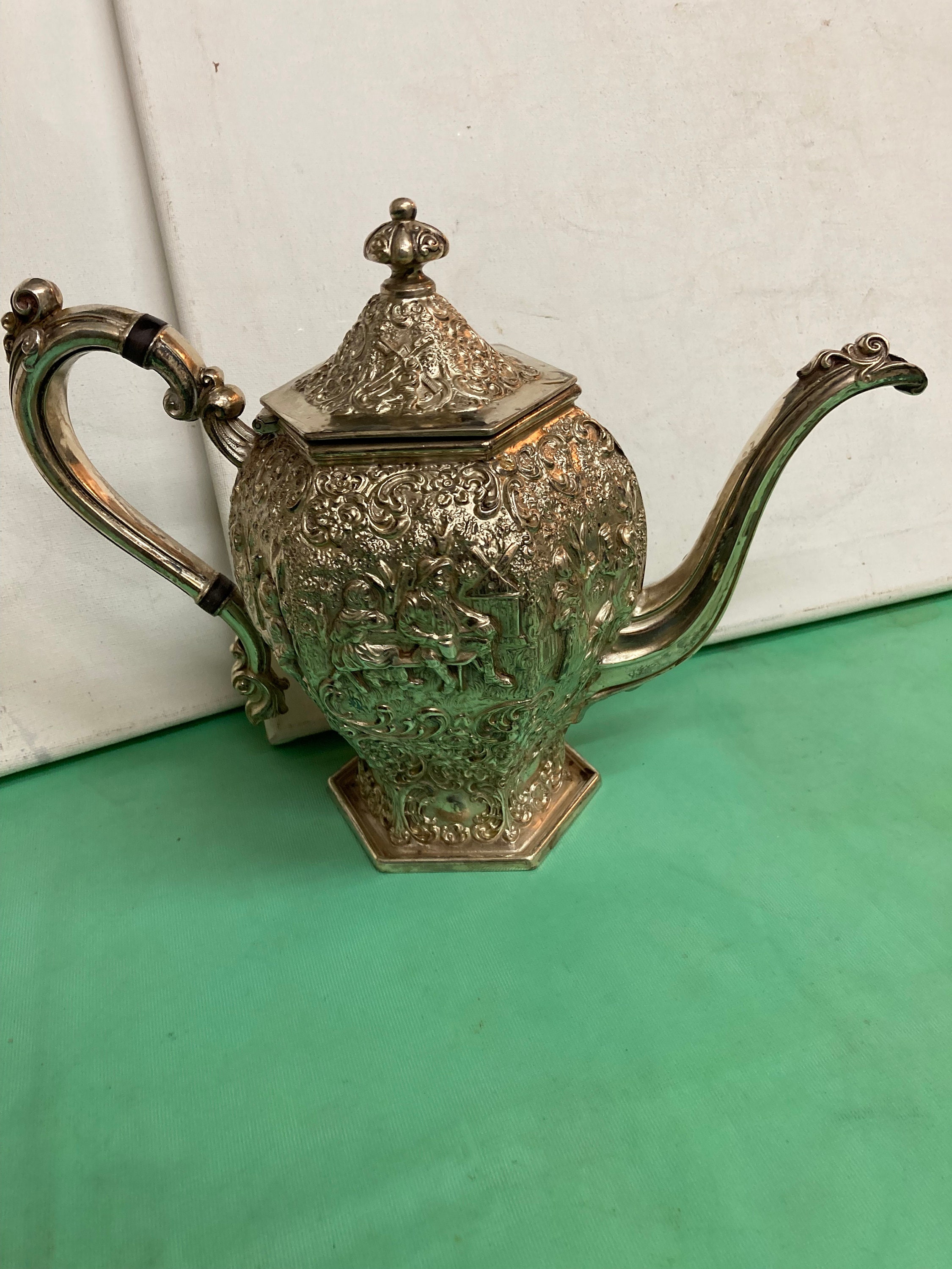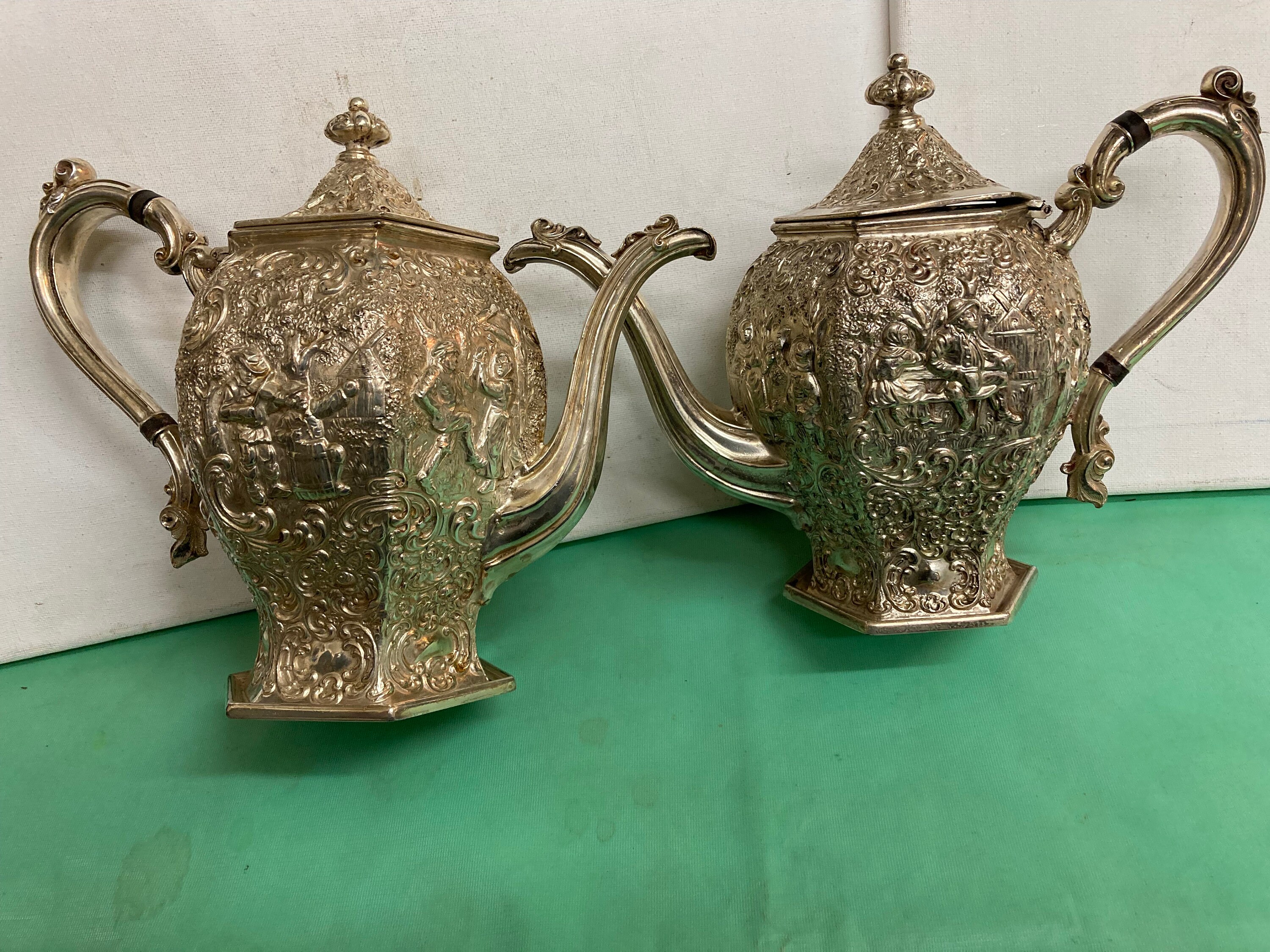 These attractive silver teapots have incredible chasing, raised figures, Dutch inspired, teapot,
