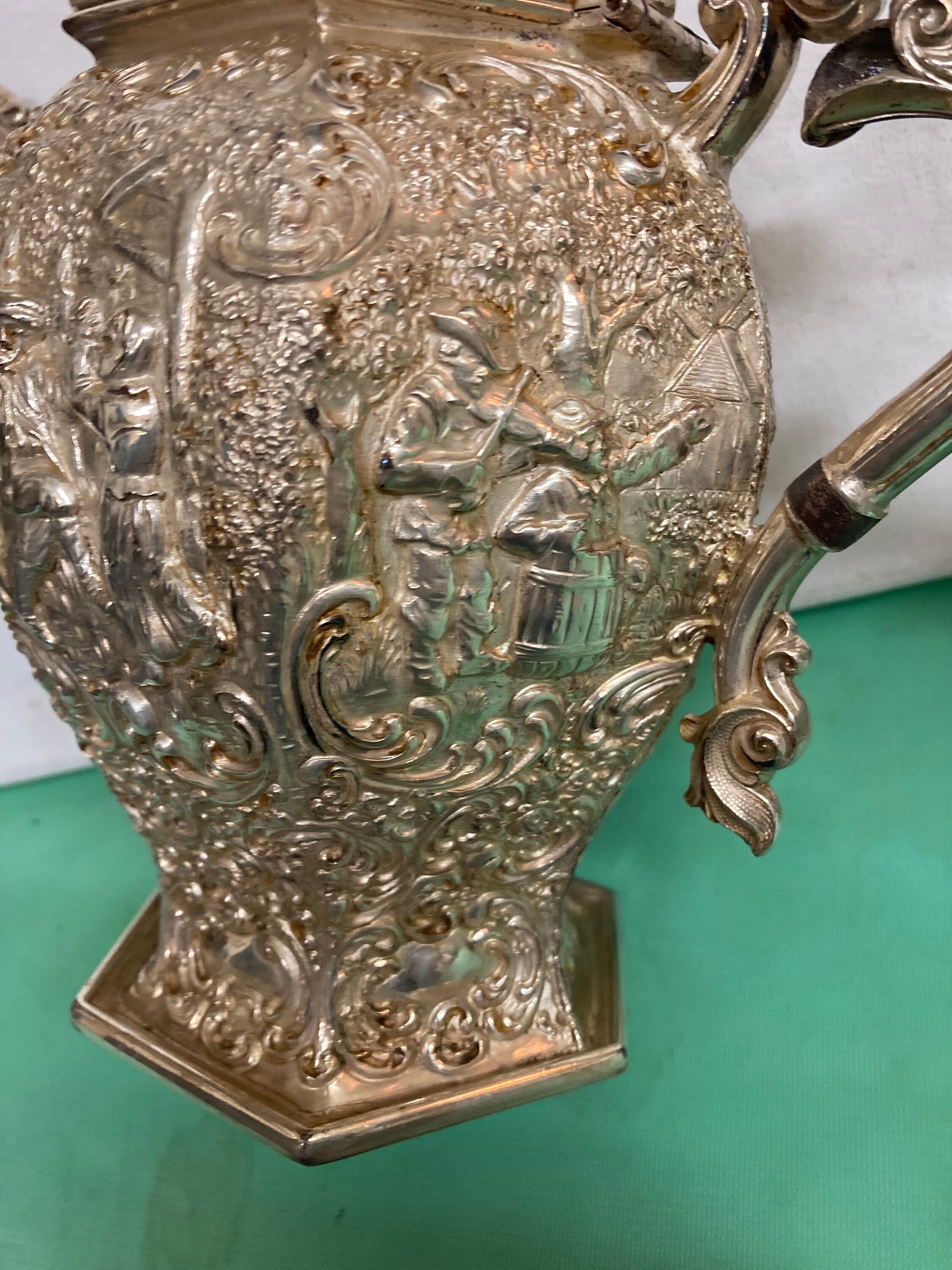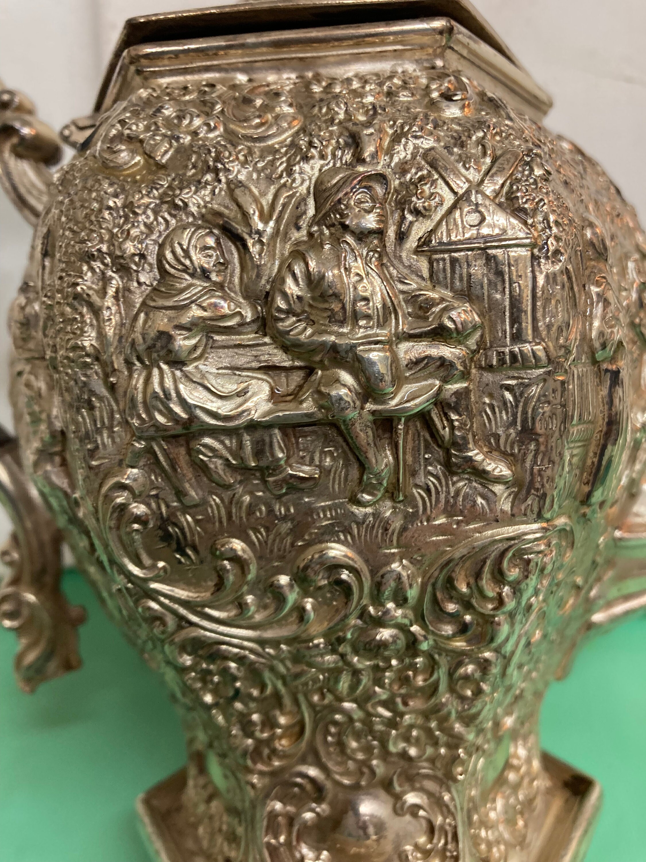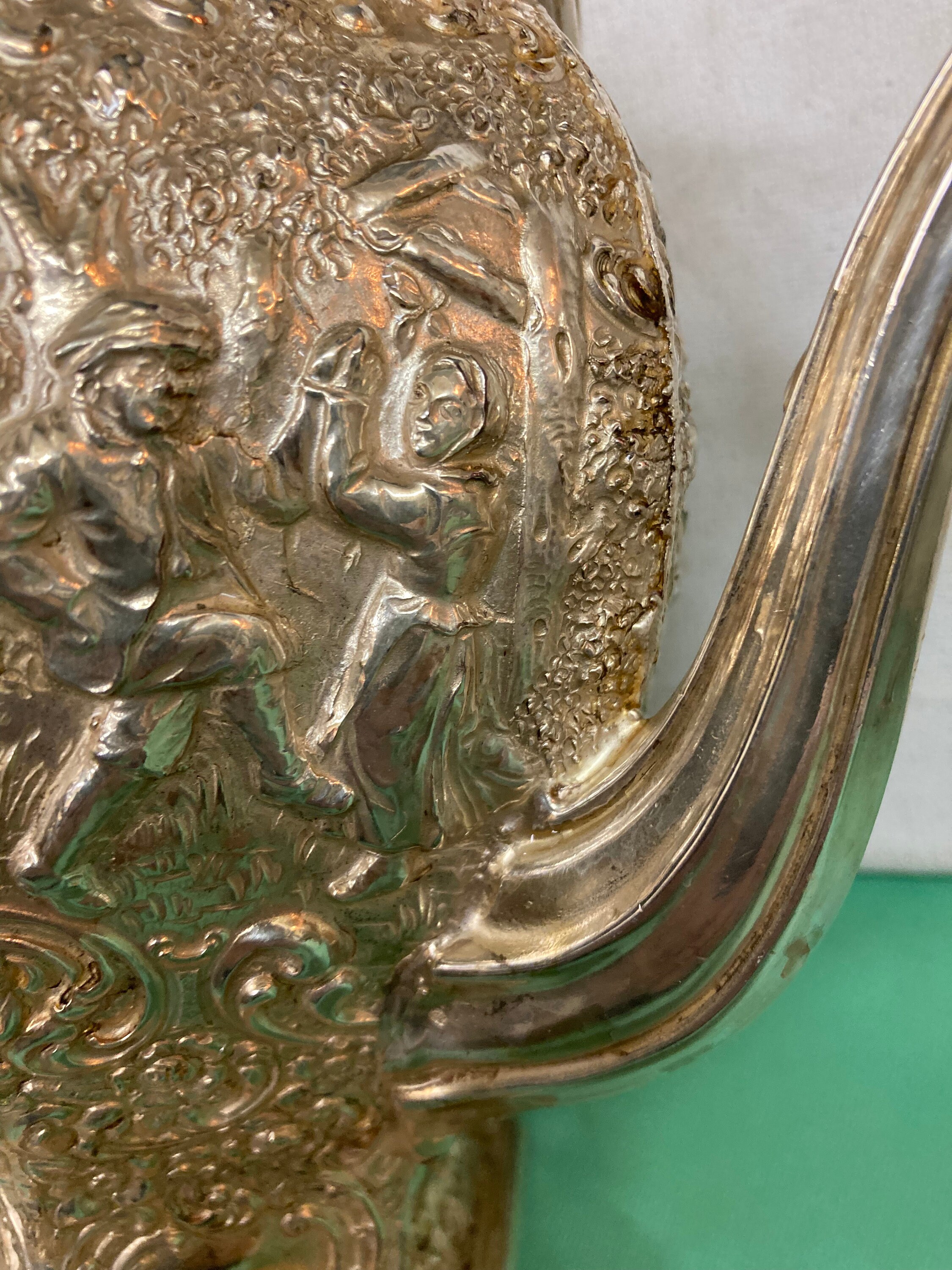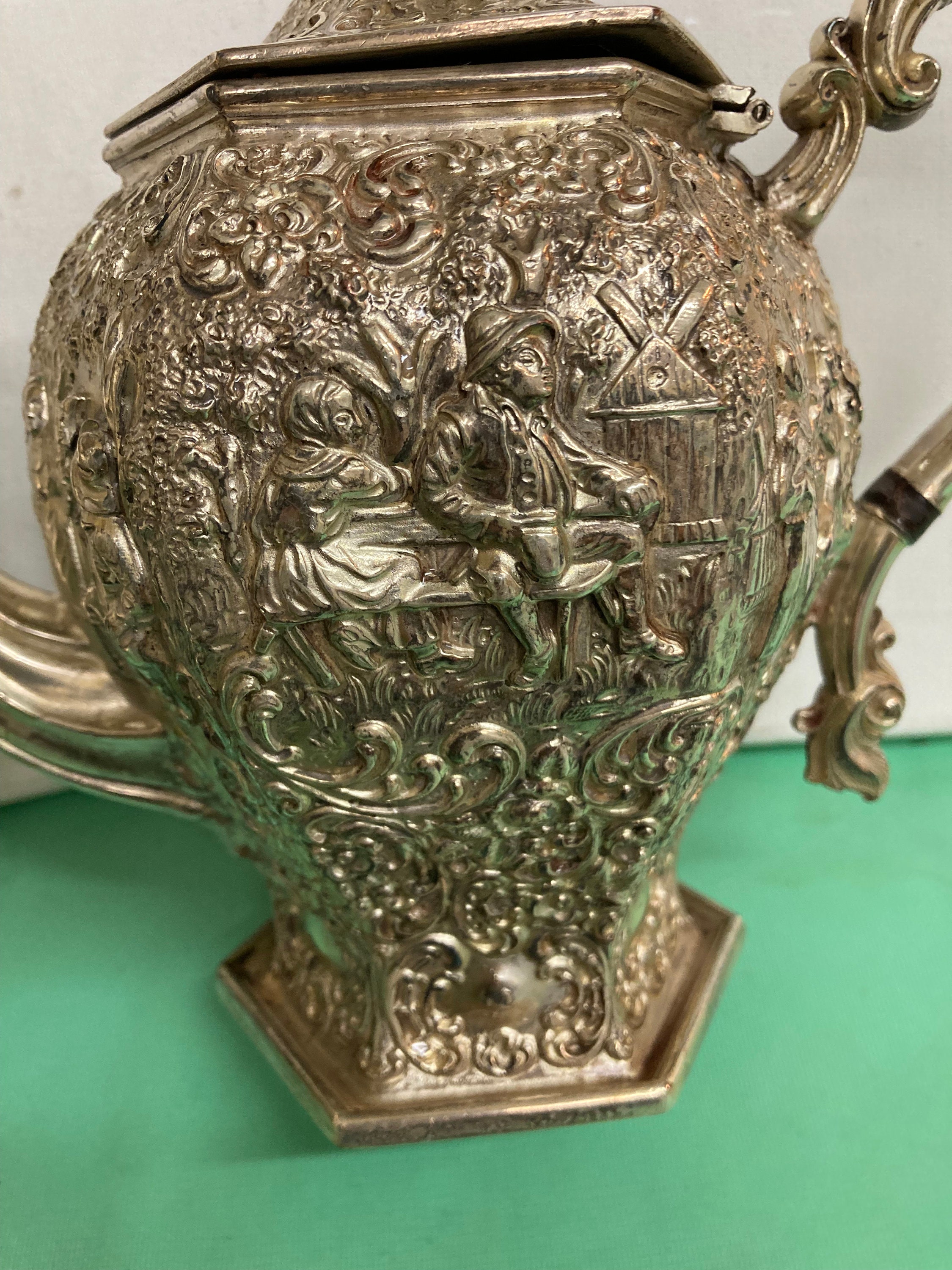 Dutch metal silver tone teapot, raised figurative intricate chasing, floral, with Hallmarks. Engraving symbols of crown & pipes, with number noted : 3175 Incredible workmanship, Windmill lid and handle. aged, very good, without cut or visible imperfection