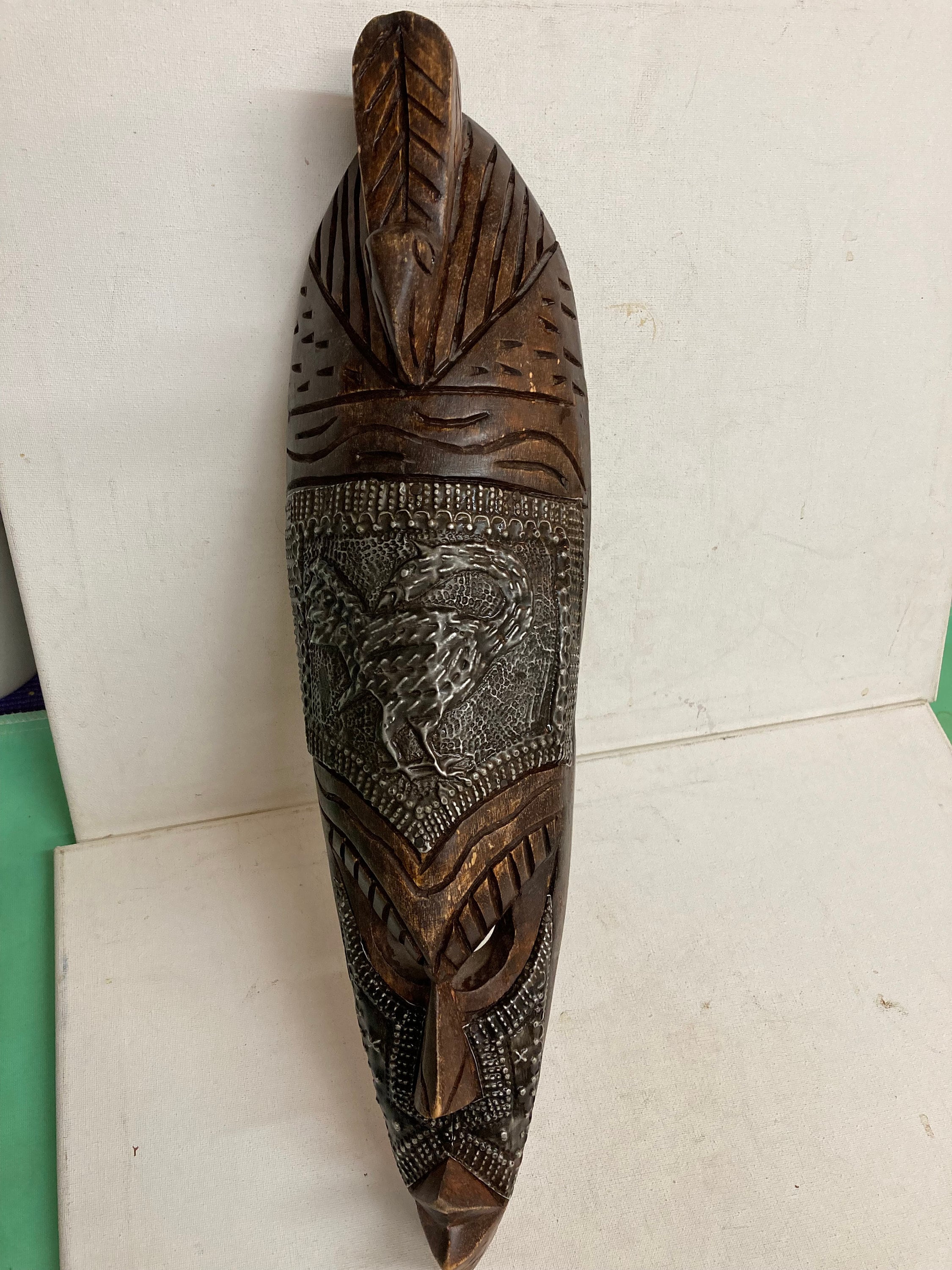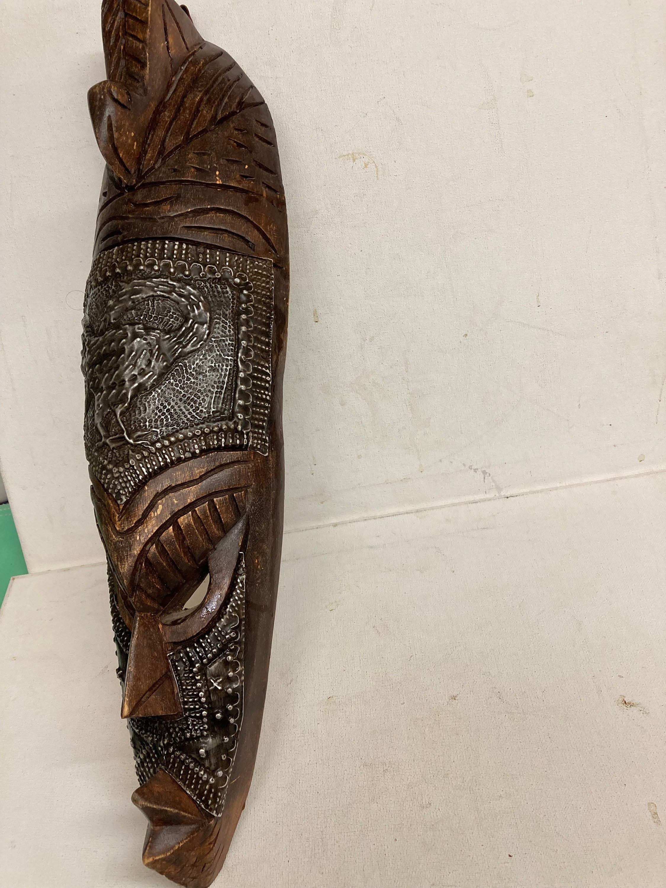 Vintage Handmade African Woodwork Mask with Hand Carved Metal