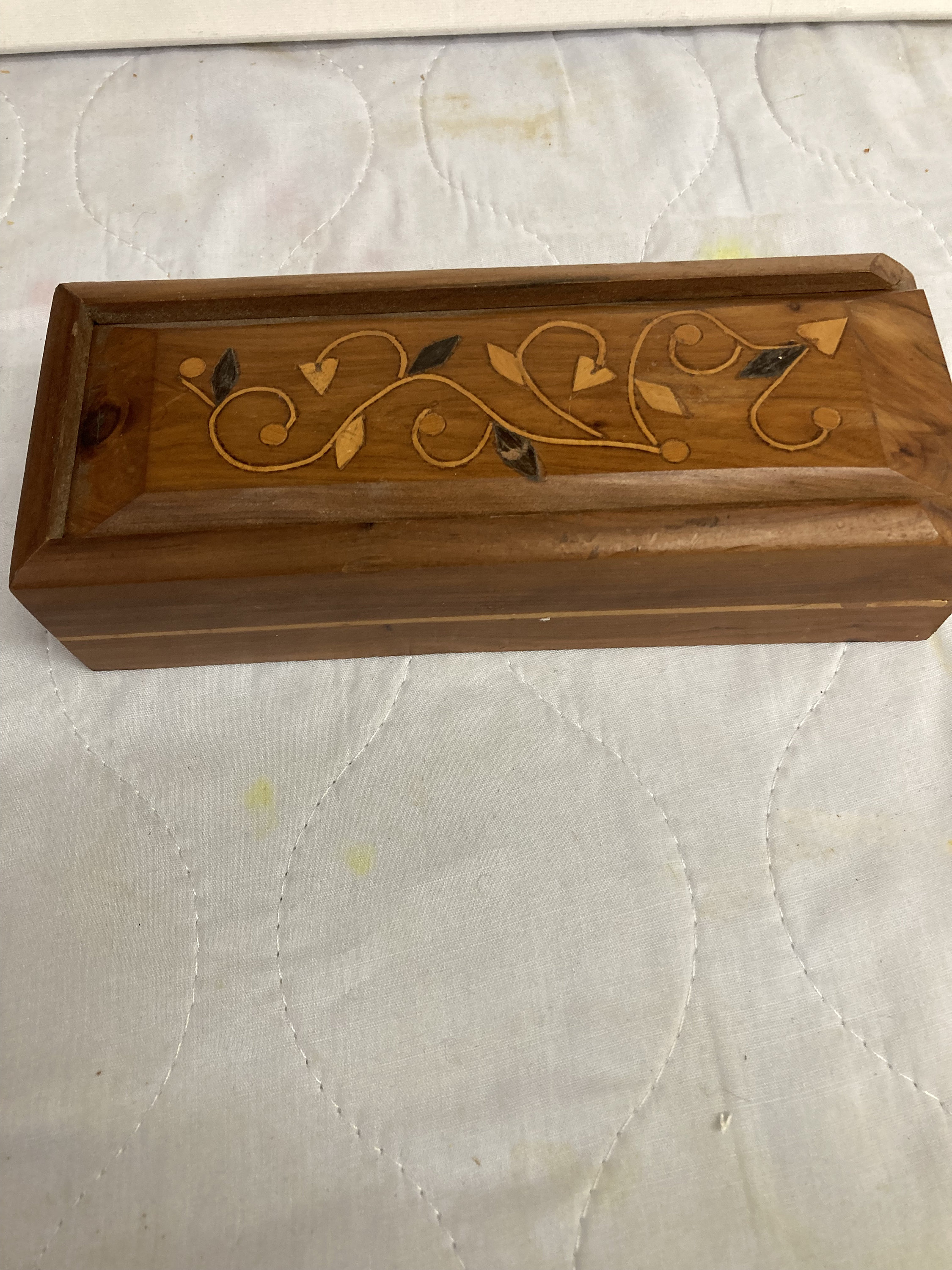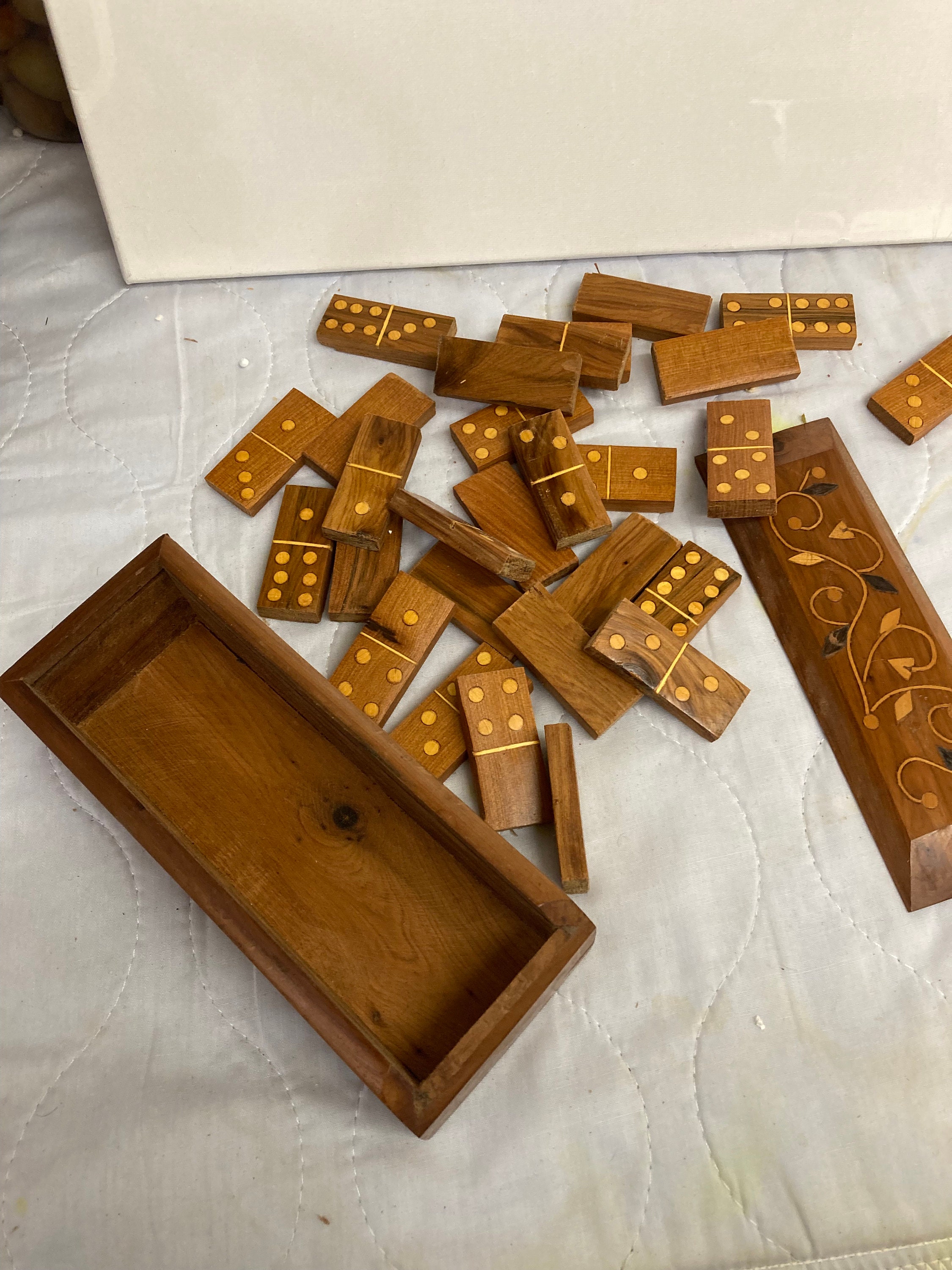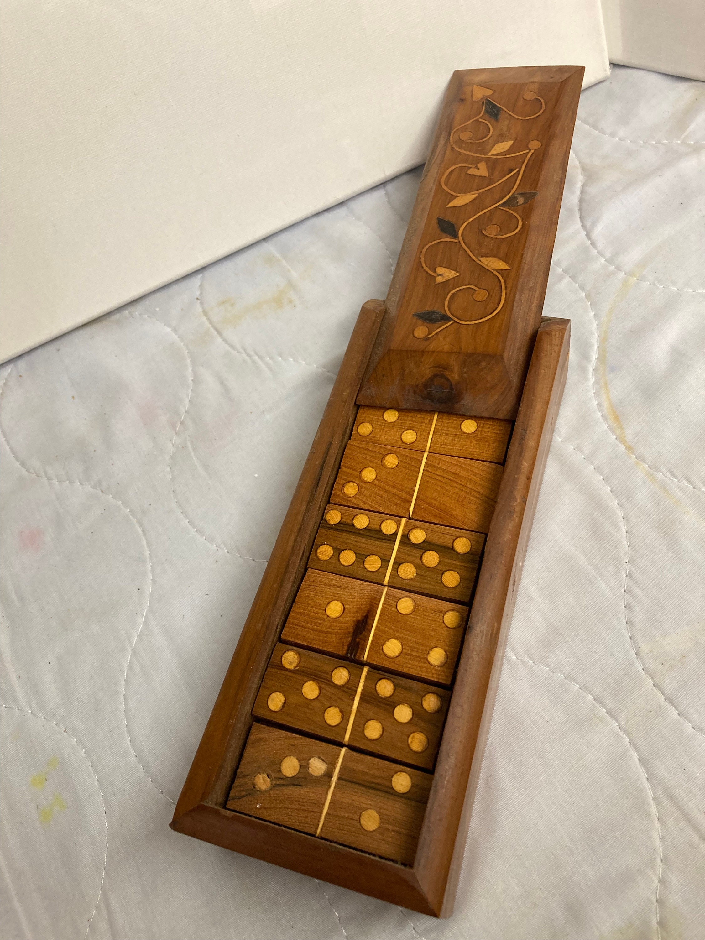 Handmade Domino Set with Box ContainerExcellent ConditionHand Carved Design on The Cover7.5 x 2 x 3