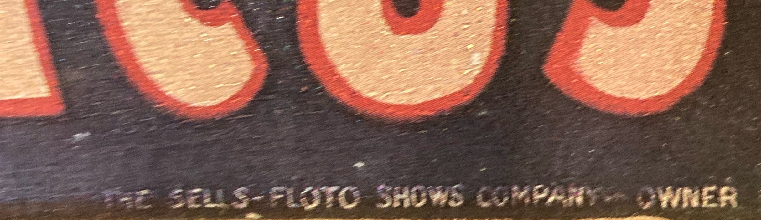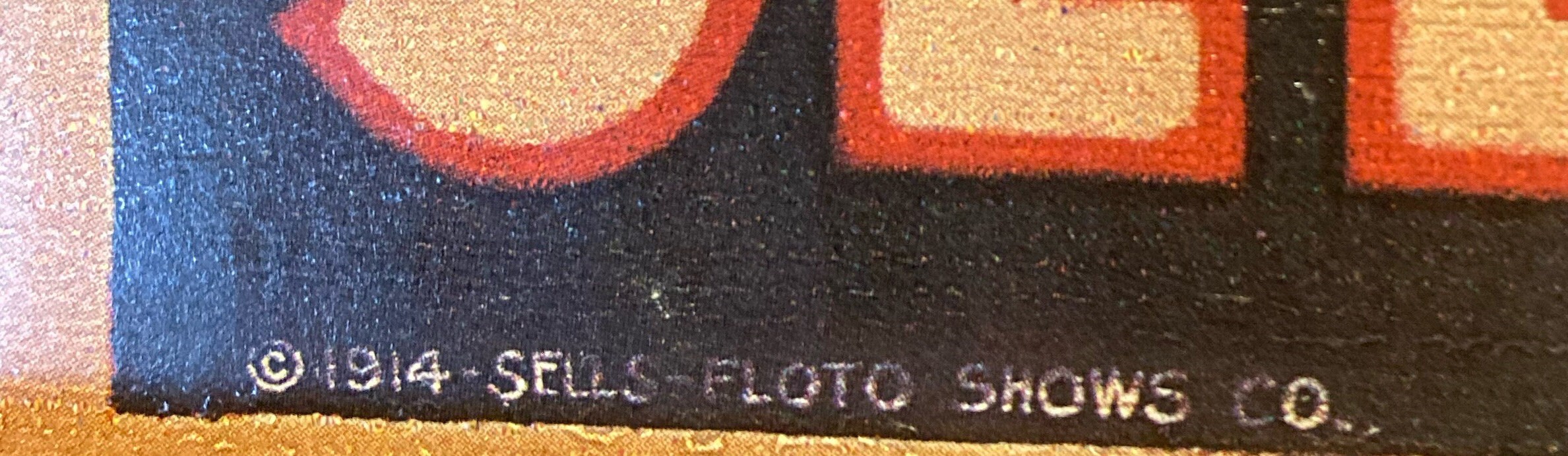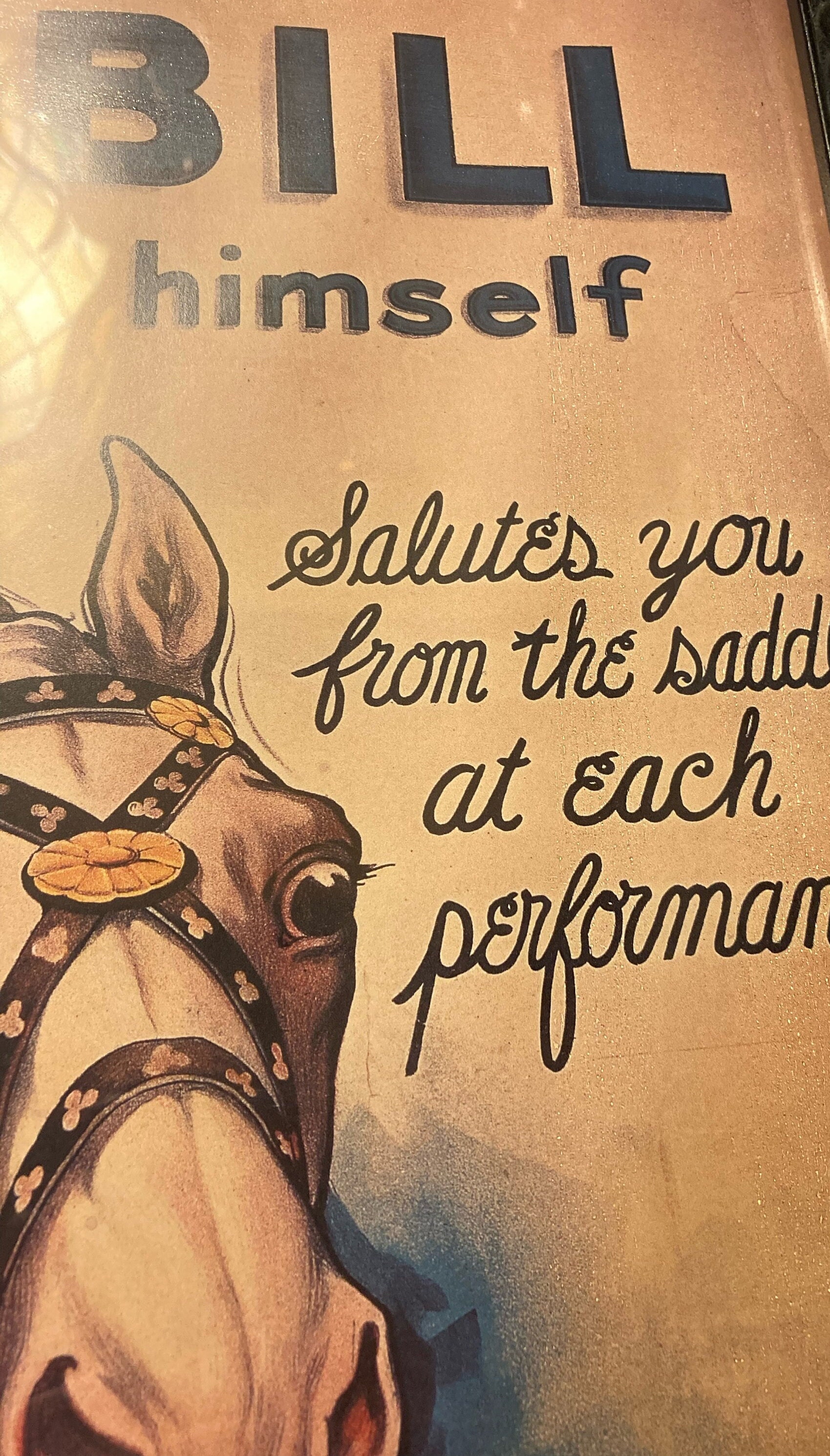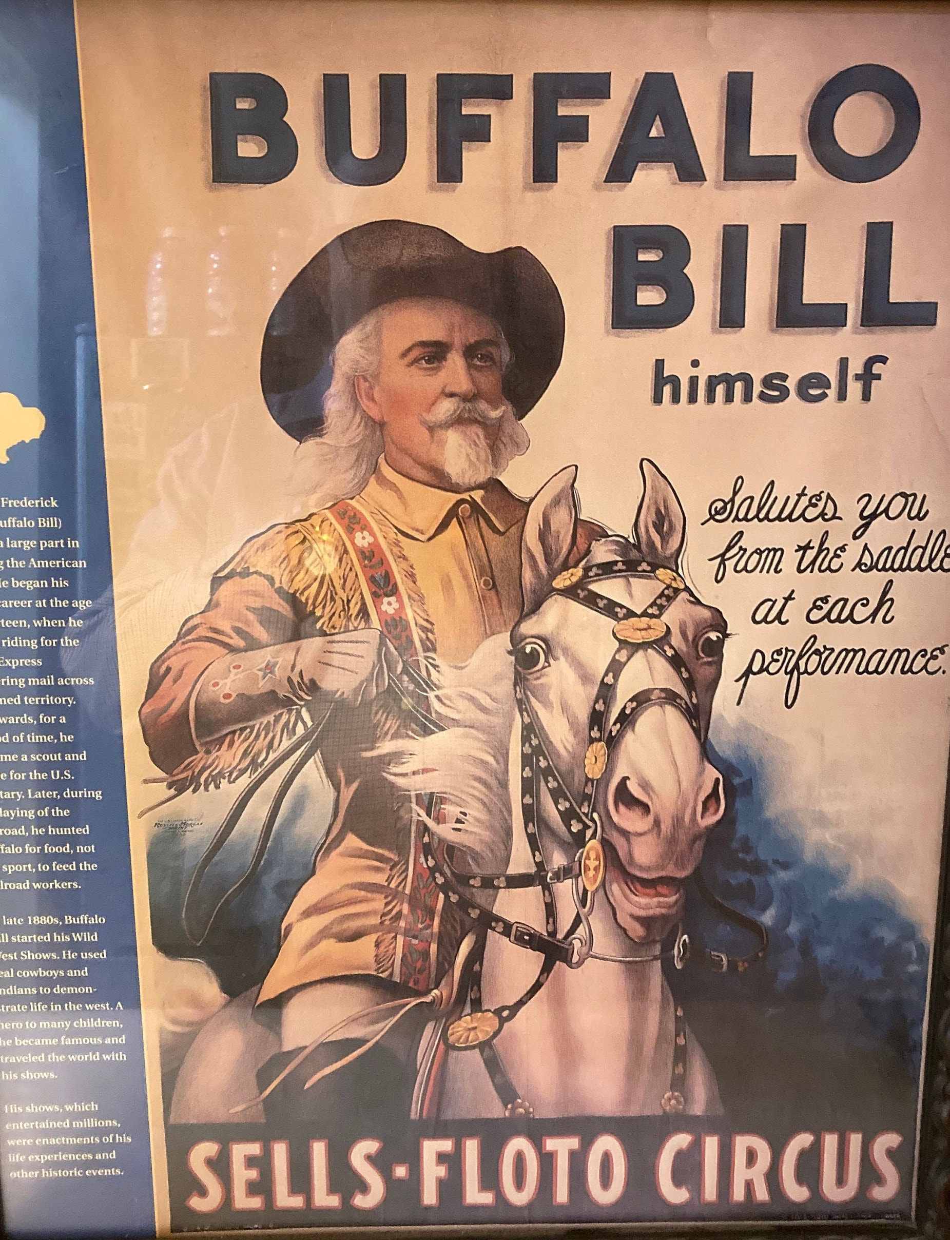 A reproduction Buffalo Bill offset lithograph poster. The poster is a reproduction of a 1914 original featuring Buffalo Bill on his white horse, Isham, for the Sells-Floto Circus. The left-hand margin of poster gives a brief biography of William Frederick Cody (Buffalo Bill) and his part in shaping the American West. The poster is not framed