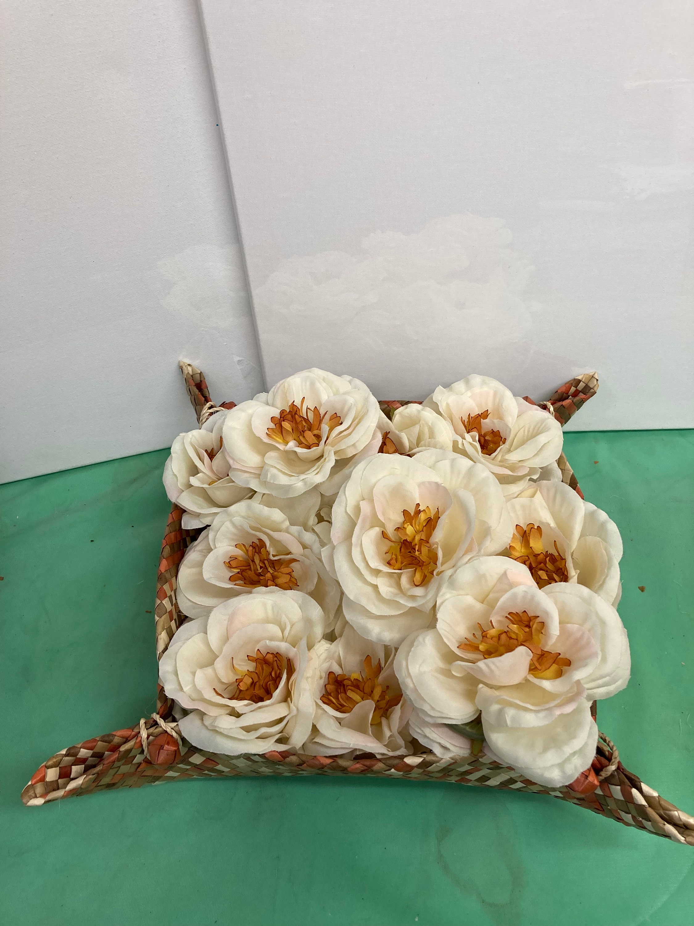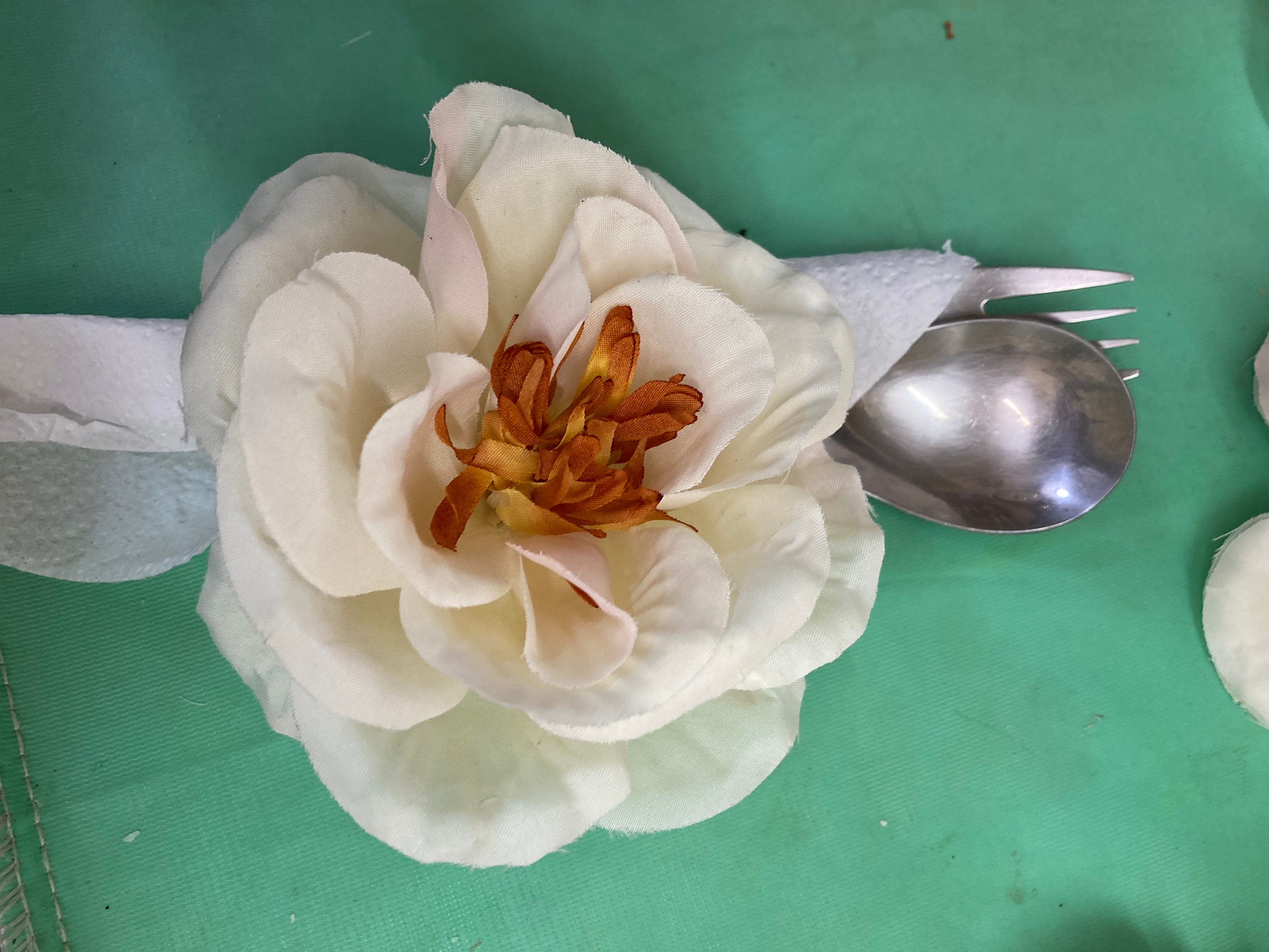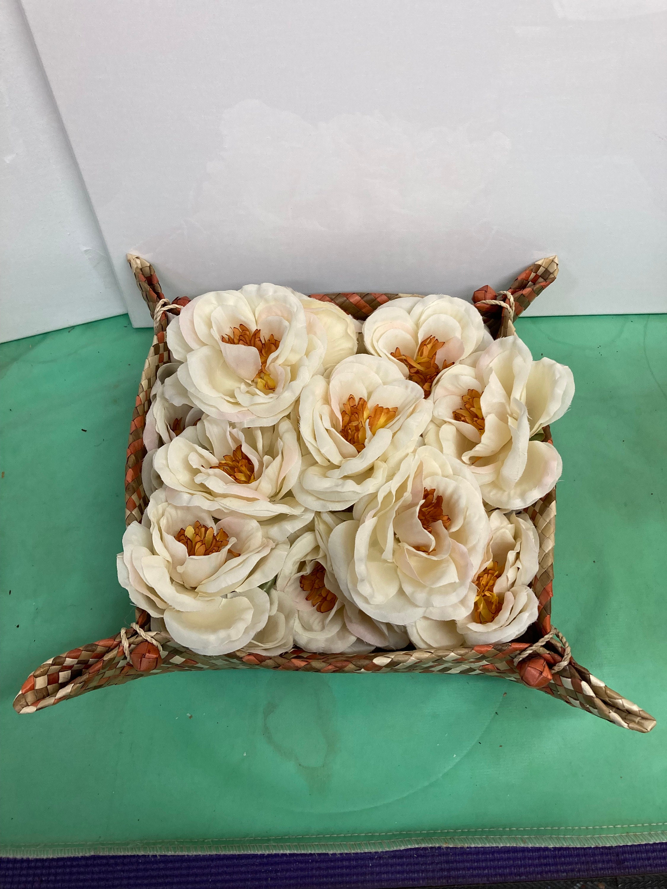 Create a lovely dinner table display with accents like this Pink Peony Napkin Ring. The ring features a large faux pink and peach peony flower with green leaves. The flower sits atop a plastic ring wrapped in green fabric. Pair this napkin ring with complementary tableware for a floral-themed dinner!