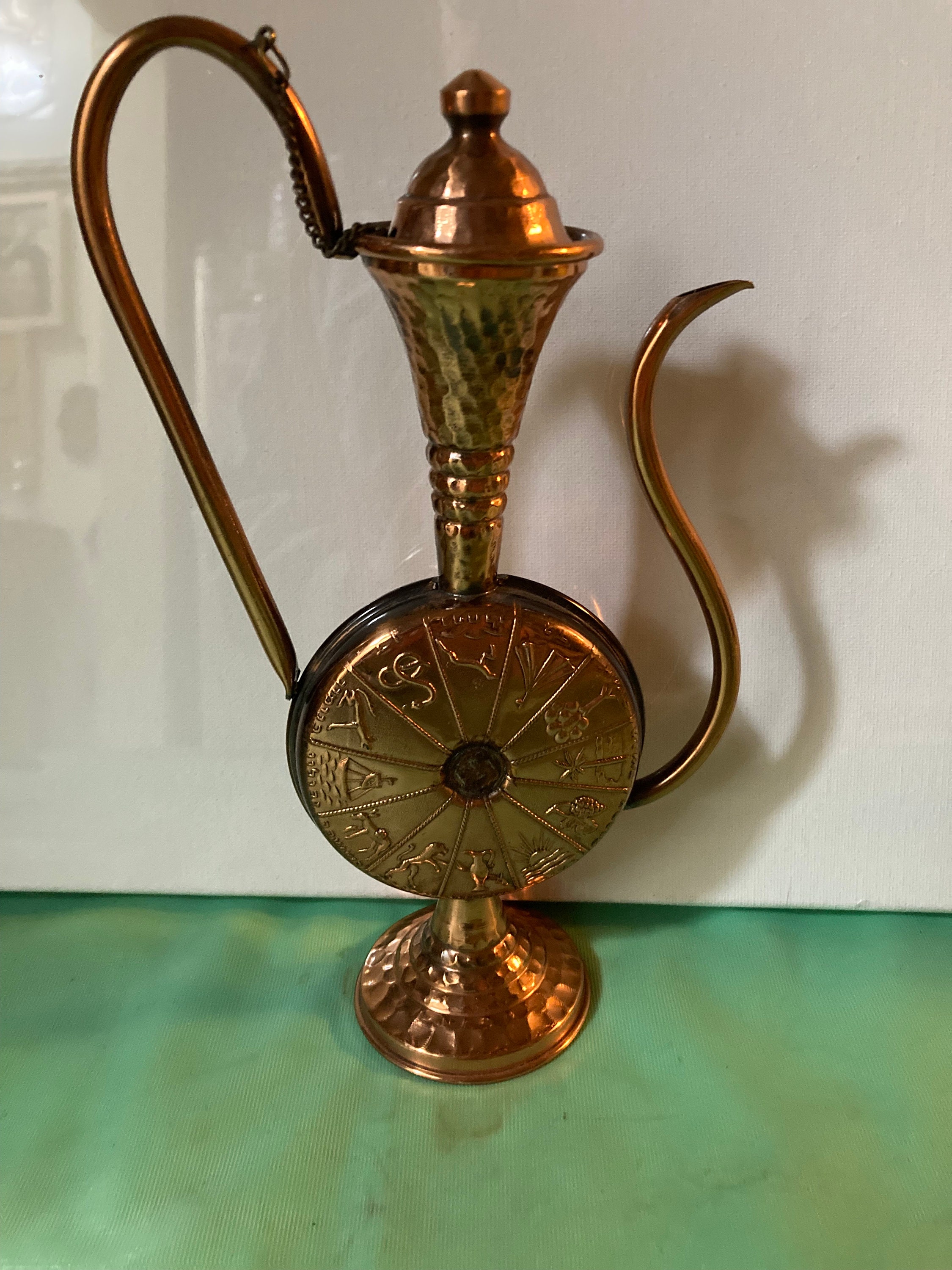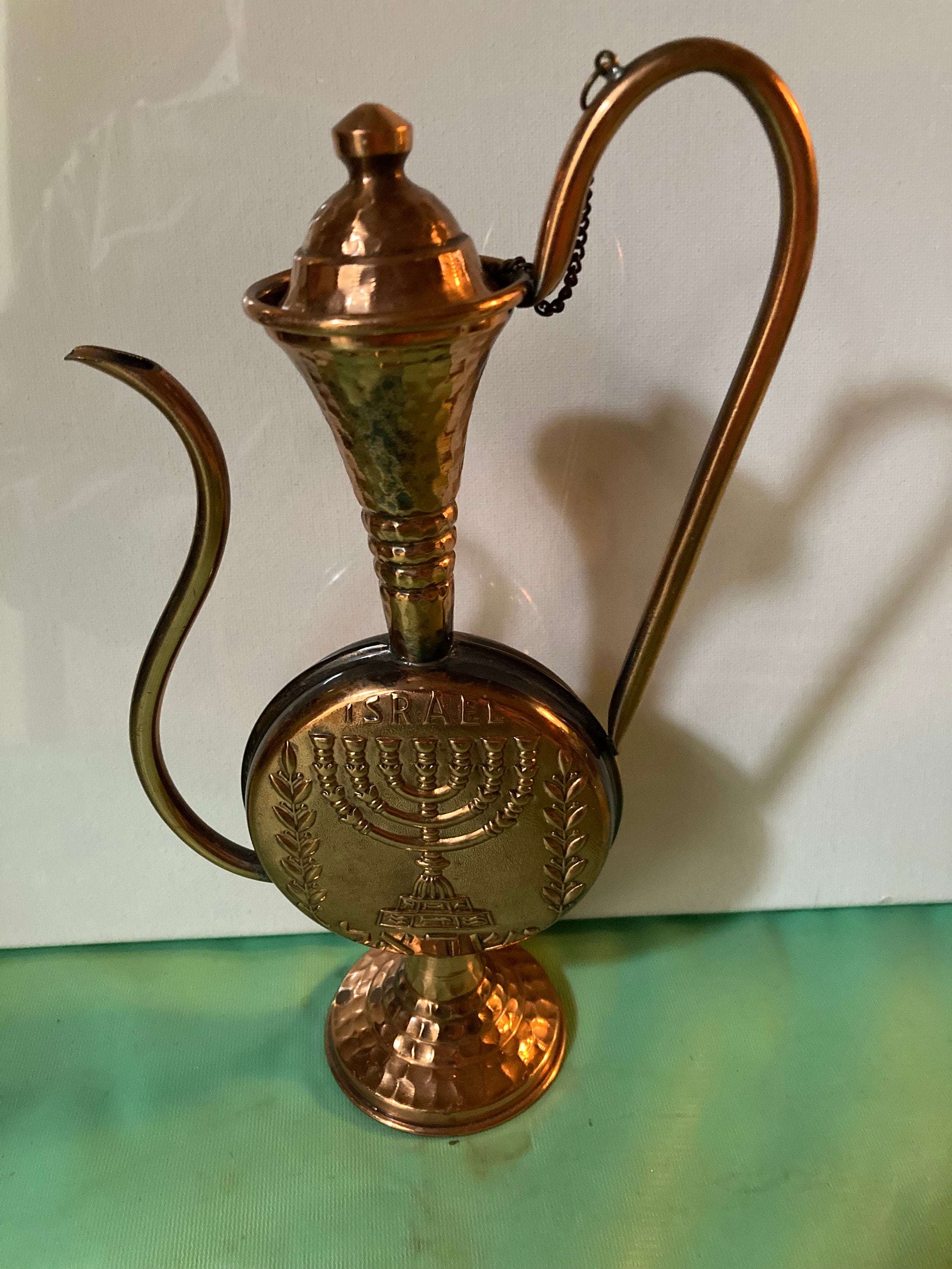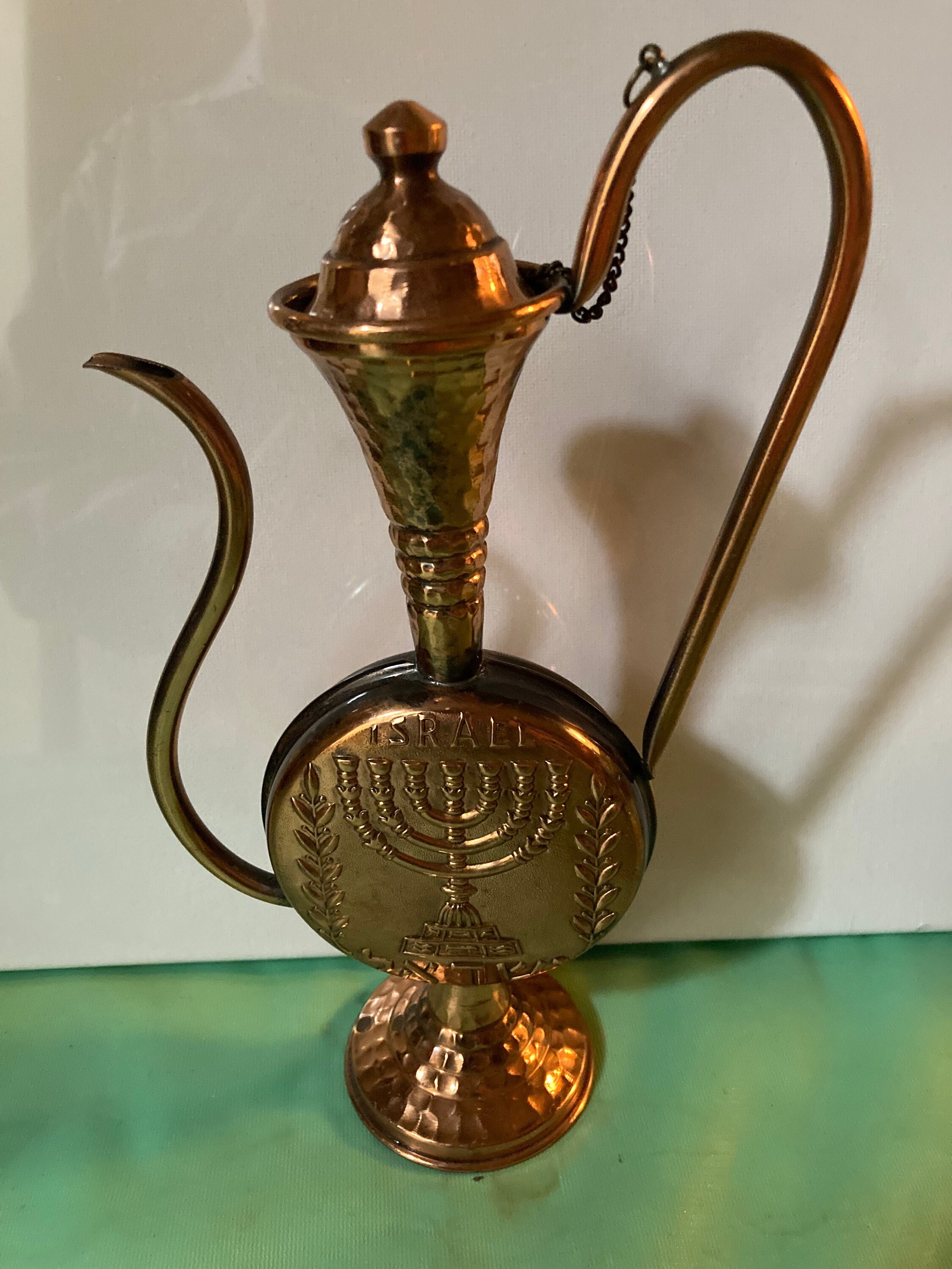 Vintage Copper Hammered Pitcher Souvenir From Jerusalem Israel 9 Inch tall No damages, marks or dents One side is a Menorah, and the other site are 12 tribes of Israel