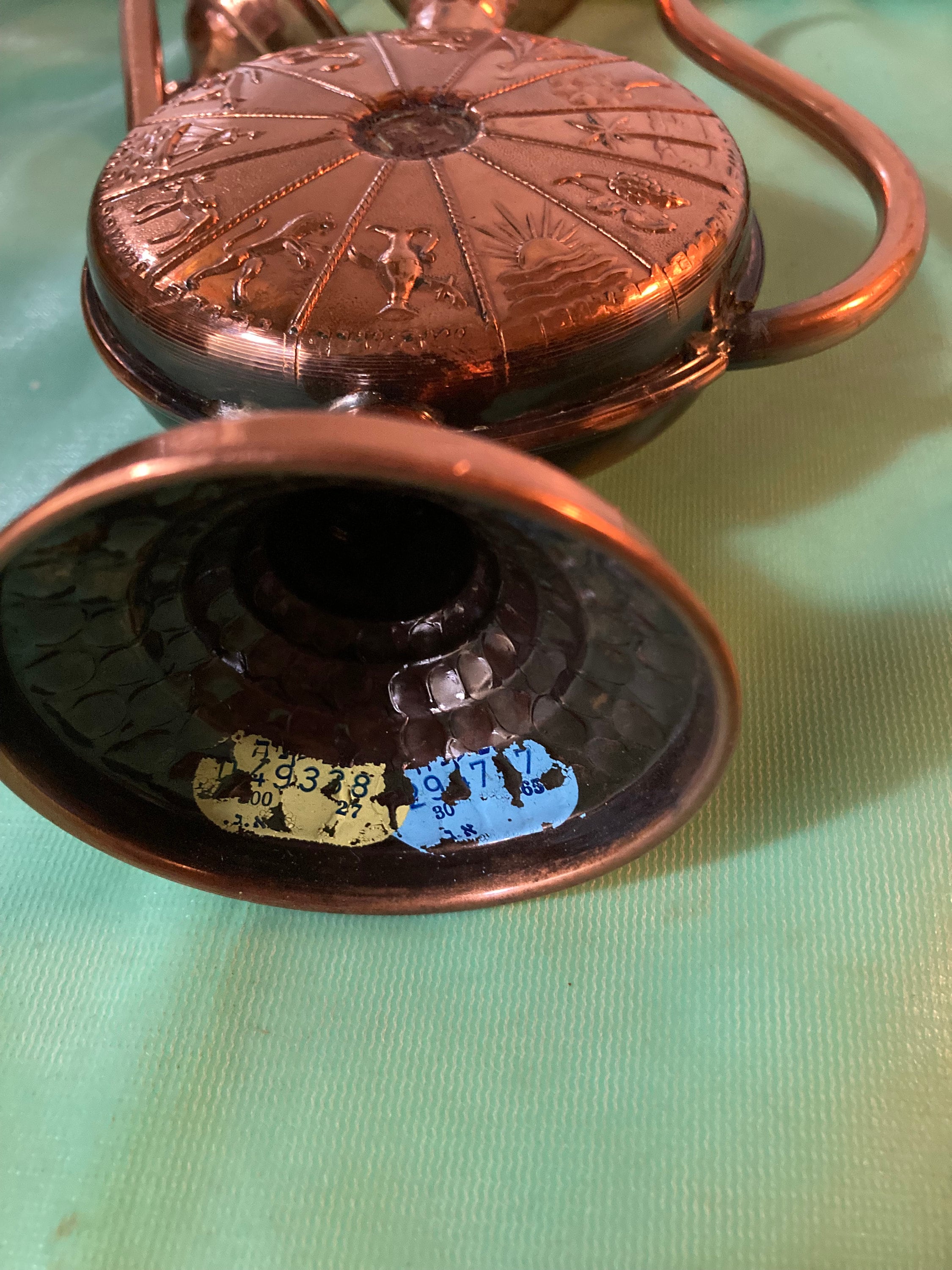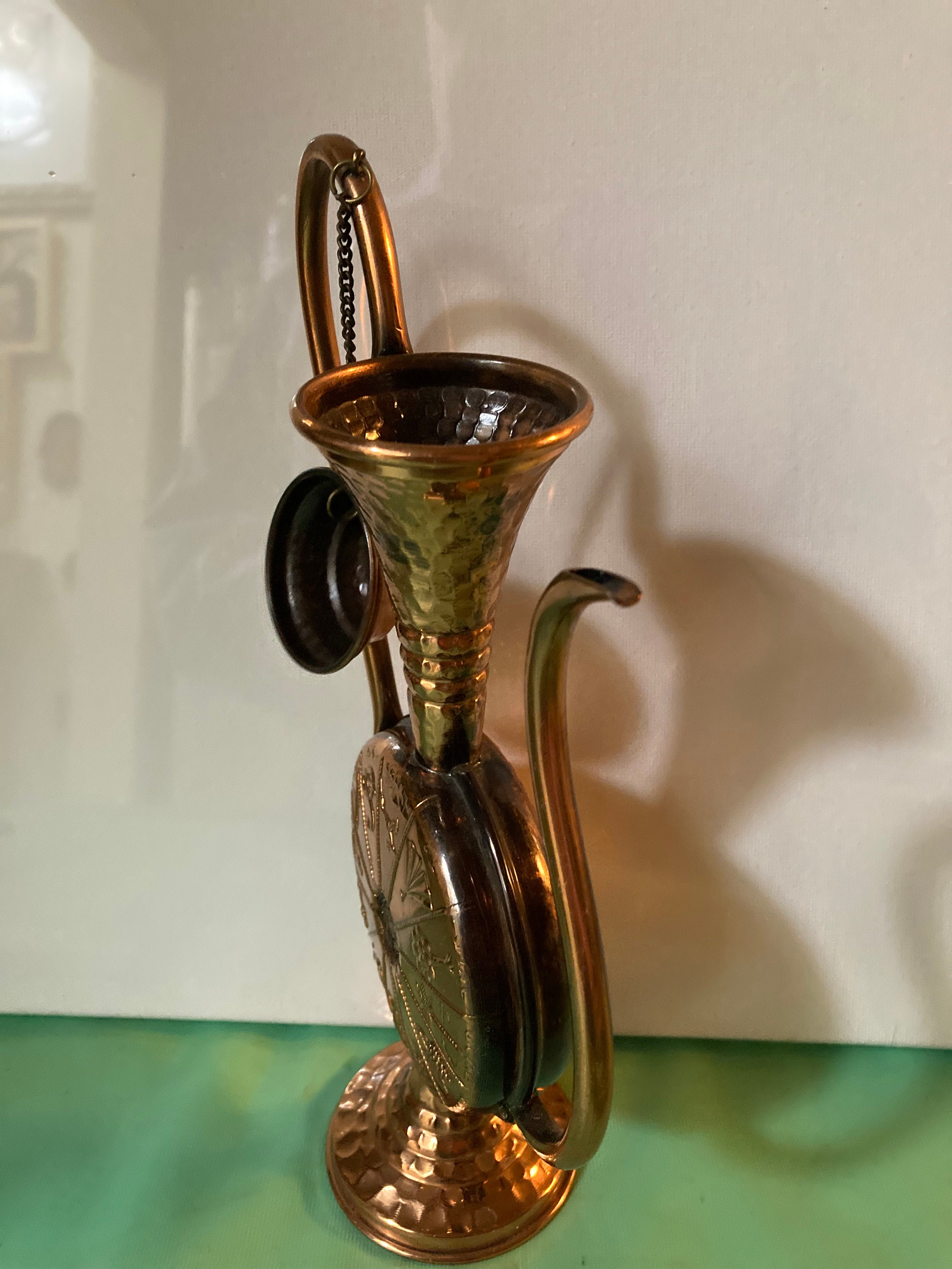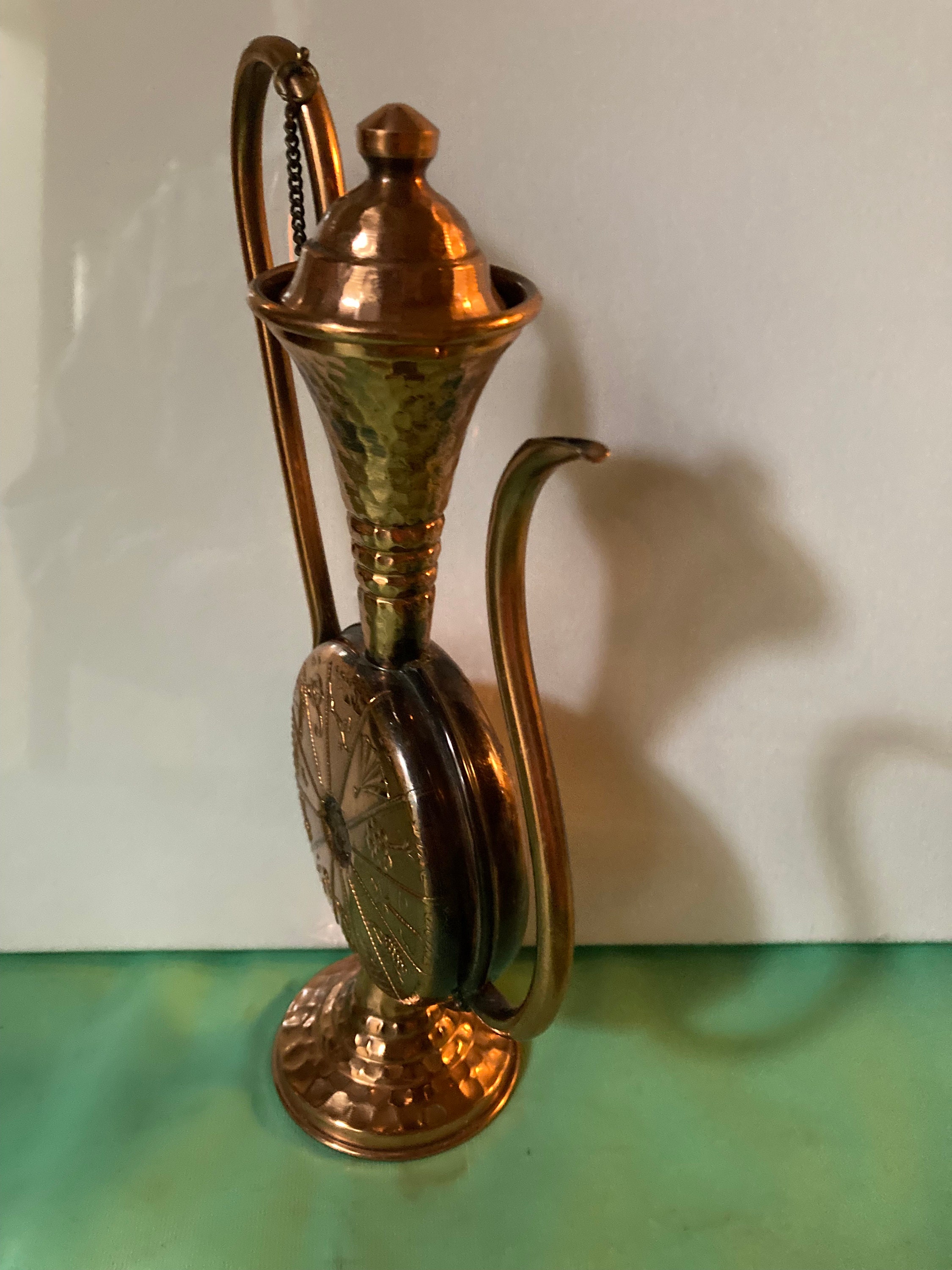 Vintage Copper Hammered Pitcher Souvenir From Jerusalem Israel 9 Inch tall No damages, marks or dents One side is a Menorah, and the other site are 12 tribes of Israel