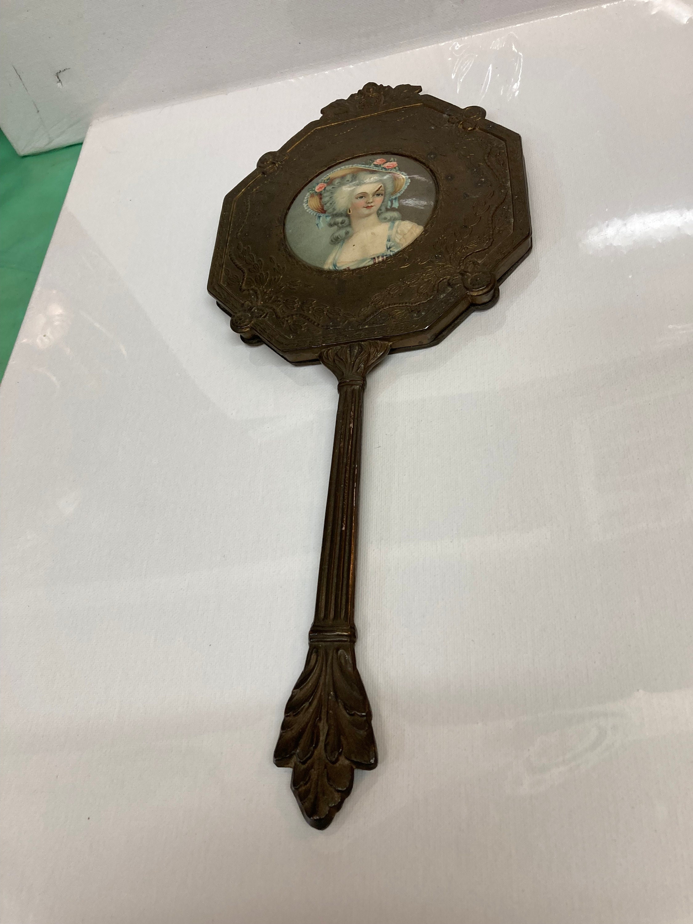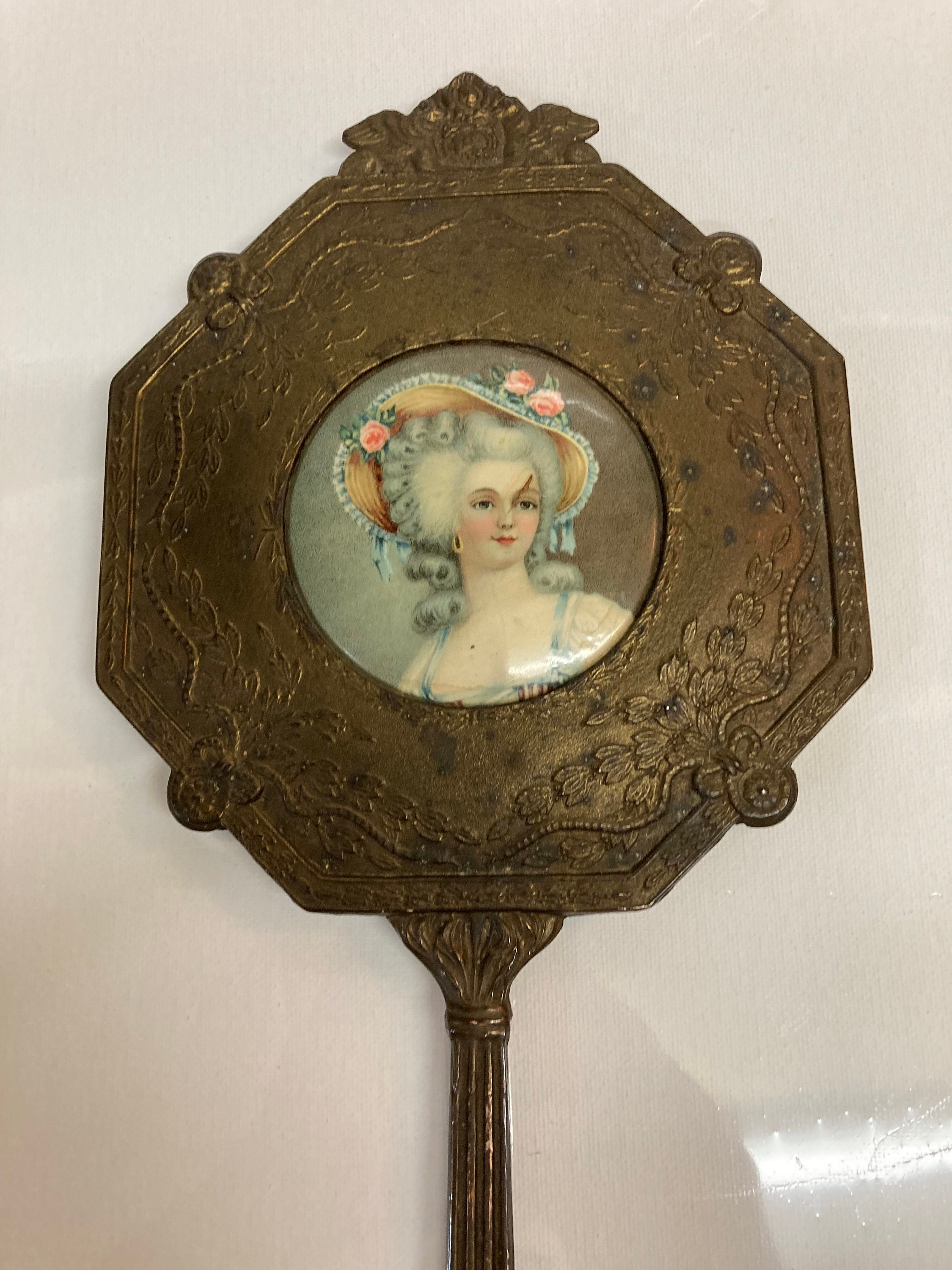 Comments : Richly embellished bronze work throughout highlights the hand painted miniature in this authentic antique hand mirror.