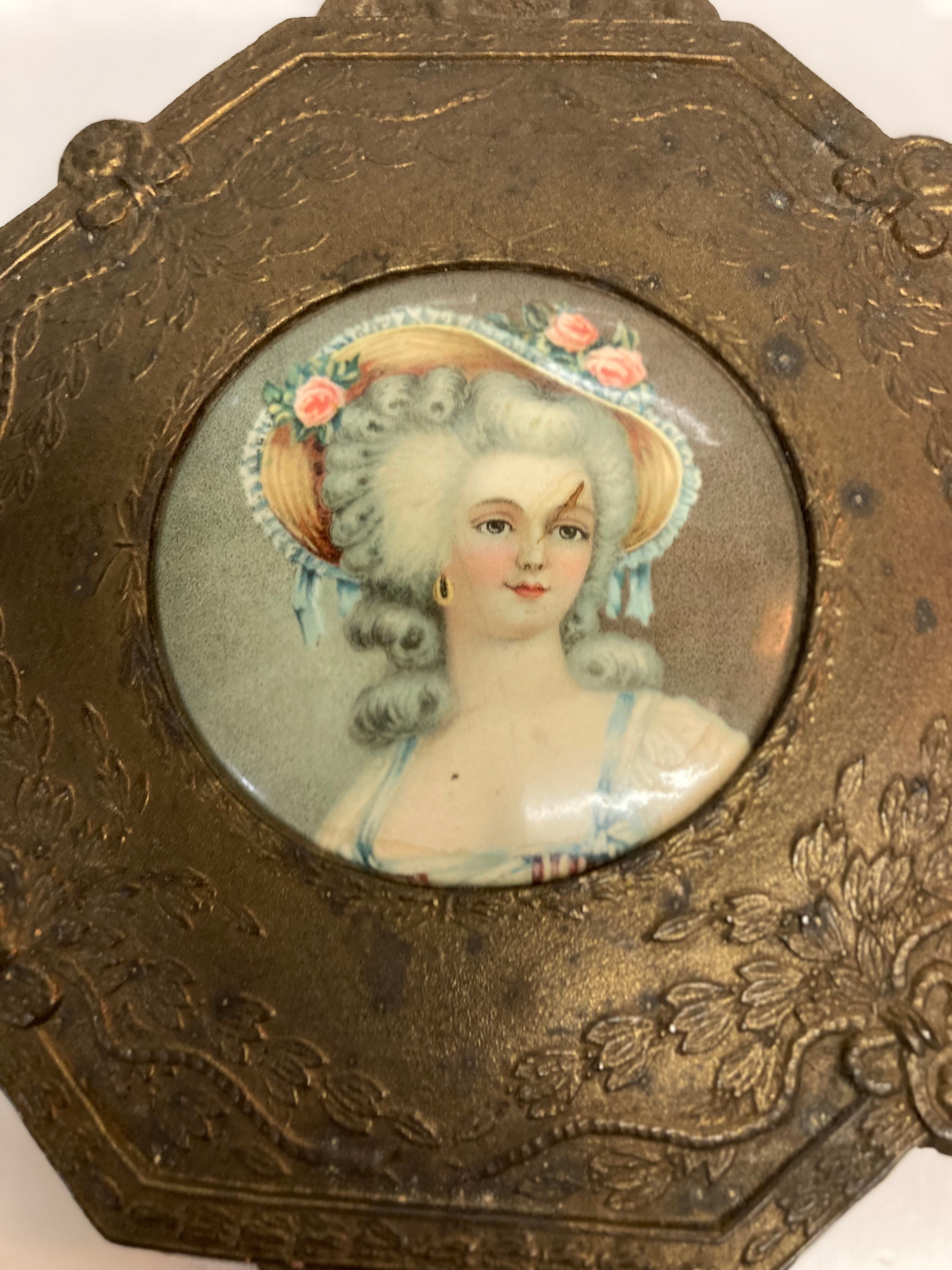 Materials : Bronze , with a bevelled glass mirror and hand painted miniature under glass on an indeterminate surface.