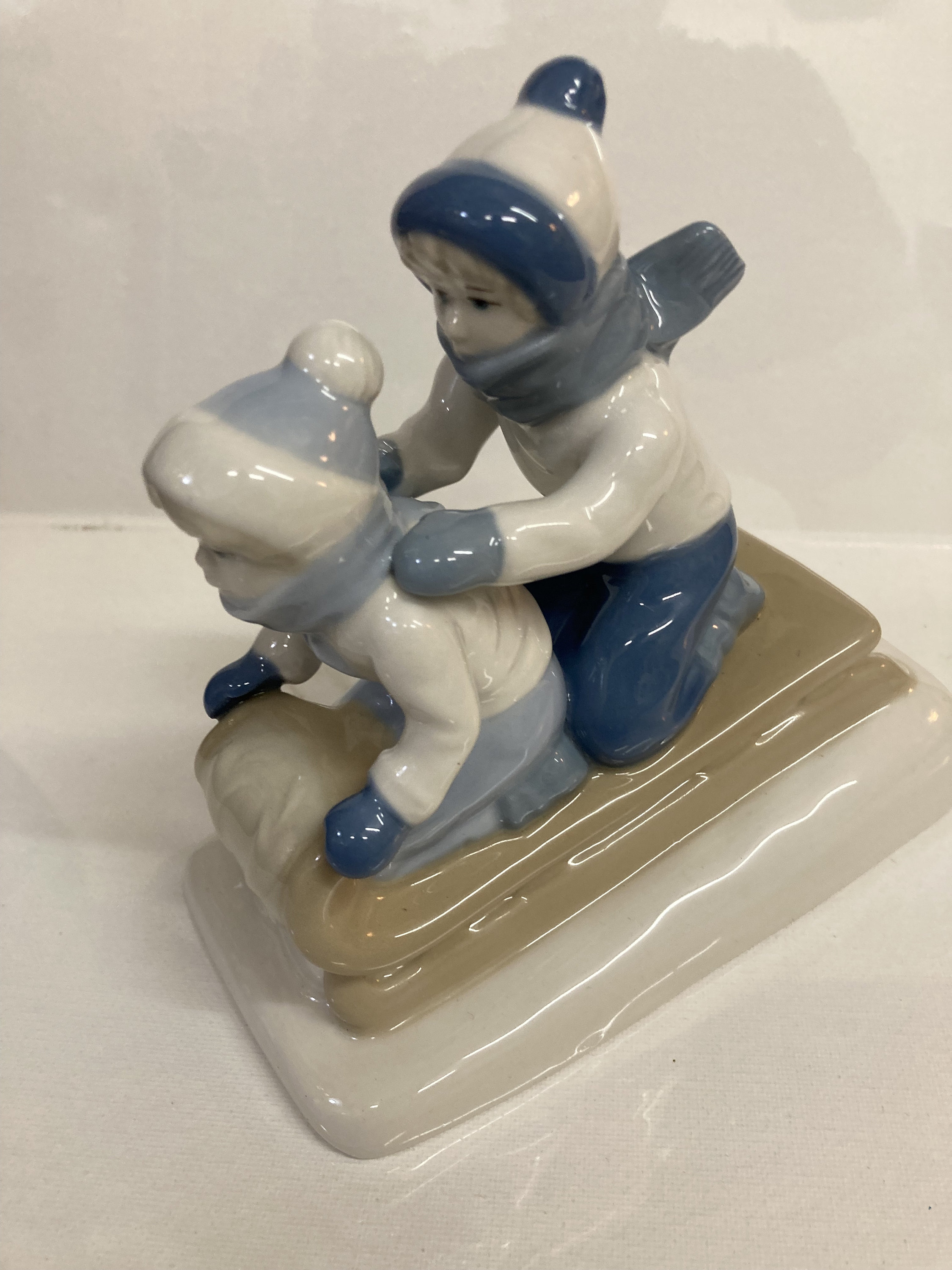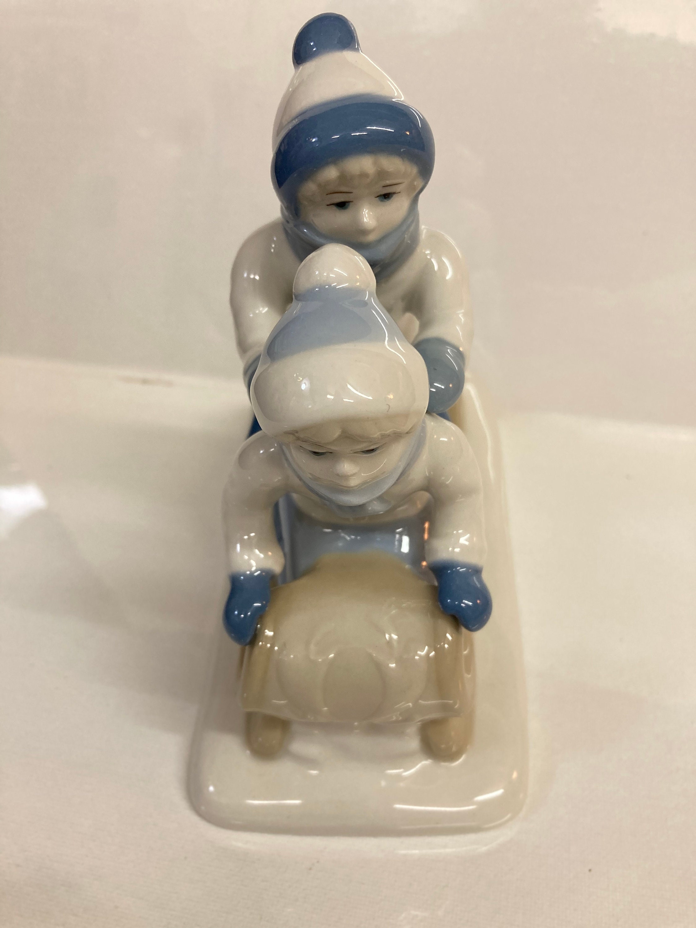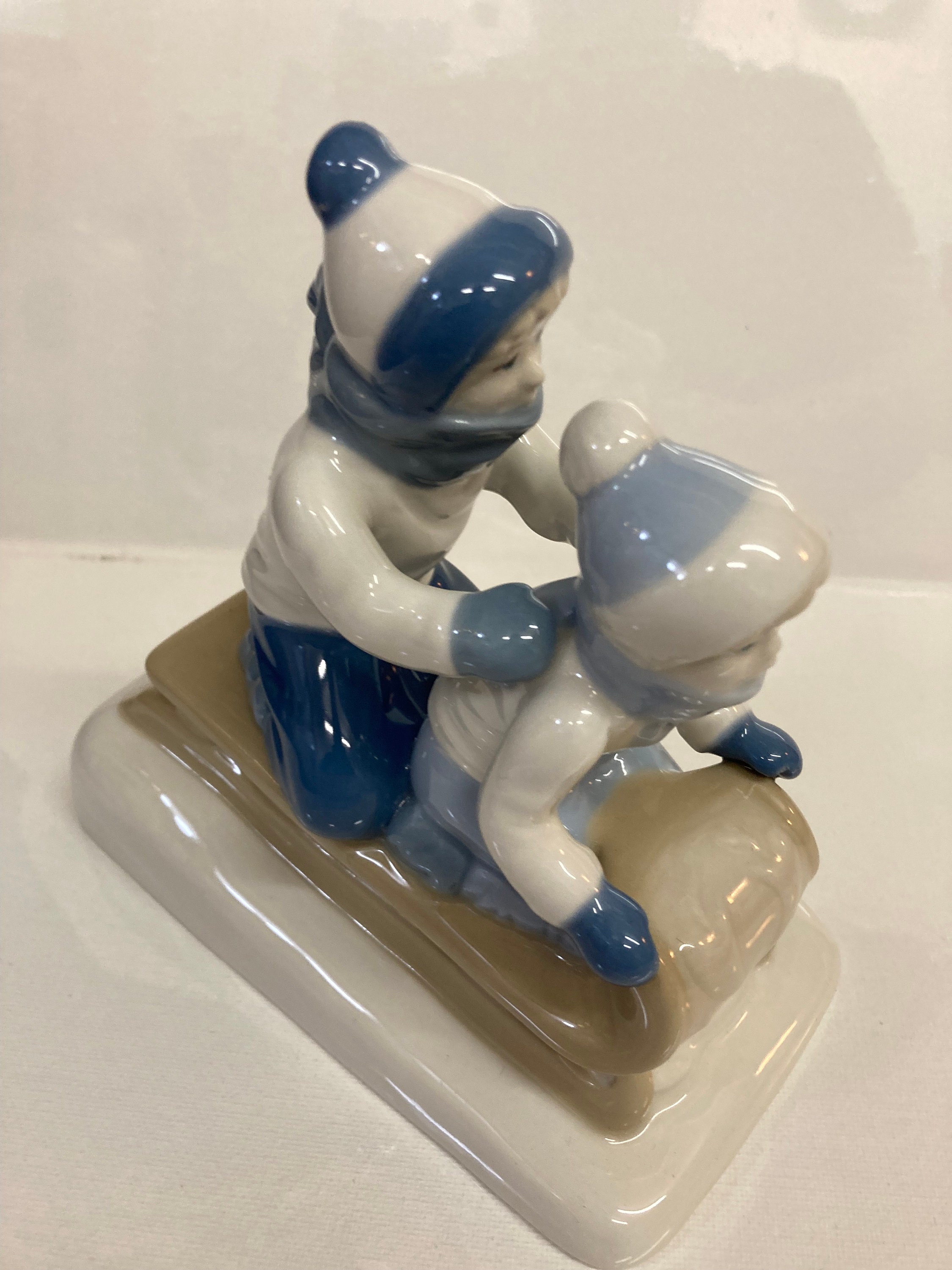 Details: This is a darling figurine from Porcelana de Cuernavaca and imported by PS-Paul Sebastian Inc, (more history in these below). The colors on this figurine are very soft, only blues, creams and white make up the entire color scheme, however, it is because of these soft colors and the gentle faces on the children that makes it such a nice figurine. This piece retains its original paper label that shows Made in Mexico. It is also stamped on the bottom with the PS logo for Paul Sebastian as well as the logo for Porcelana de Cuernavaca, Mexico. Neither of these entities is in business today, actually there’s some confusion with the number 1992 on the bottom of this piece, most stating that it’s not the year made, but rather the style number of the piece. Either way, it would make a wonderful addition to a bookshelf, or as part of a Christmas or Winter vignette or tablescape. A great present for a figurine collector!