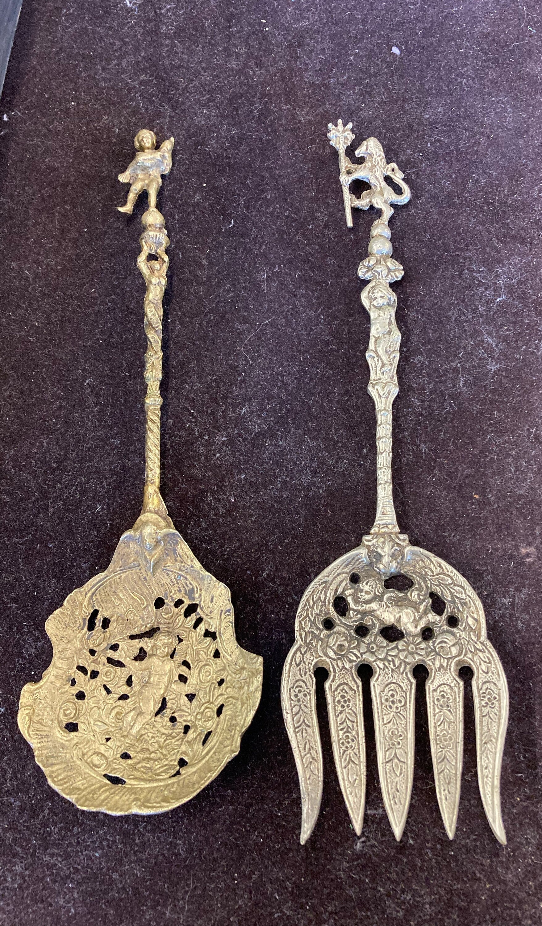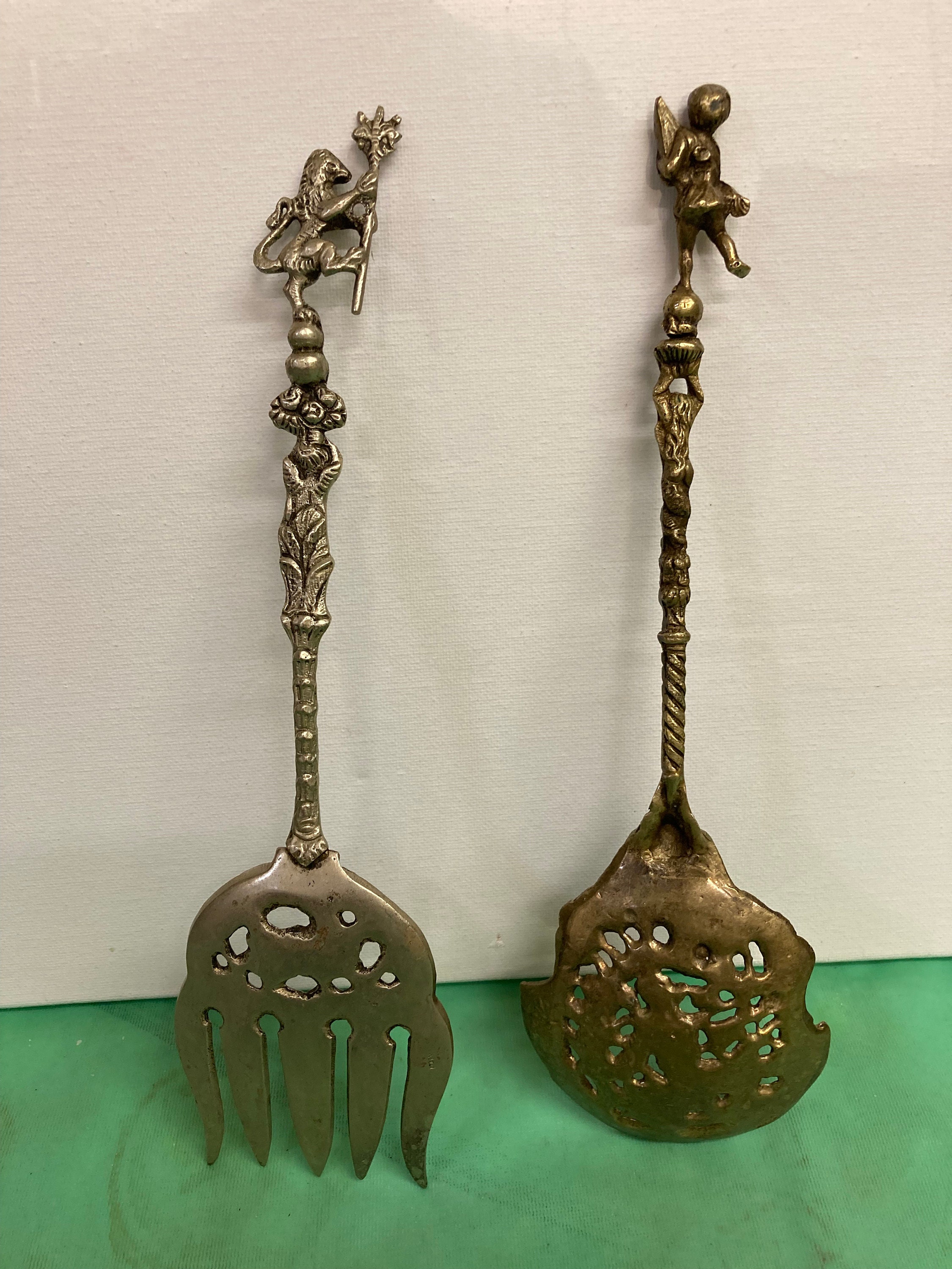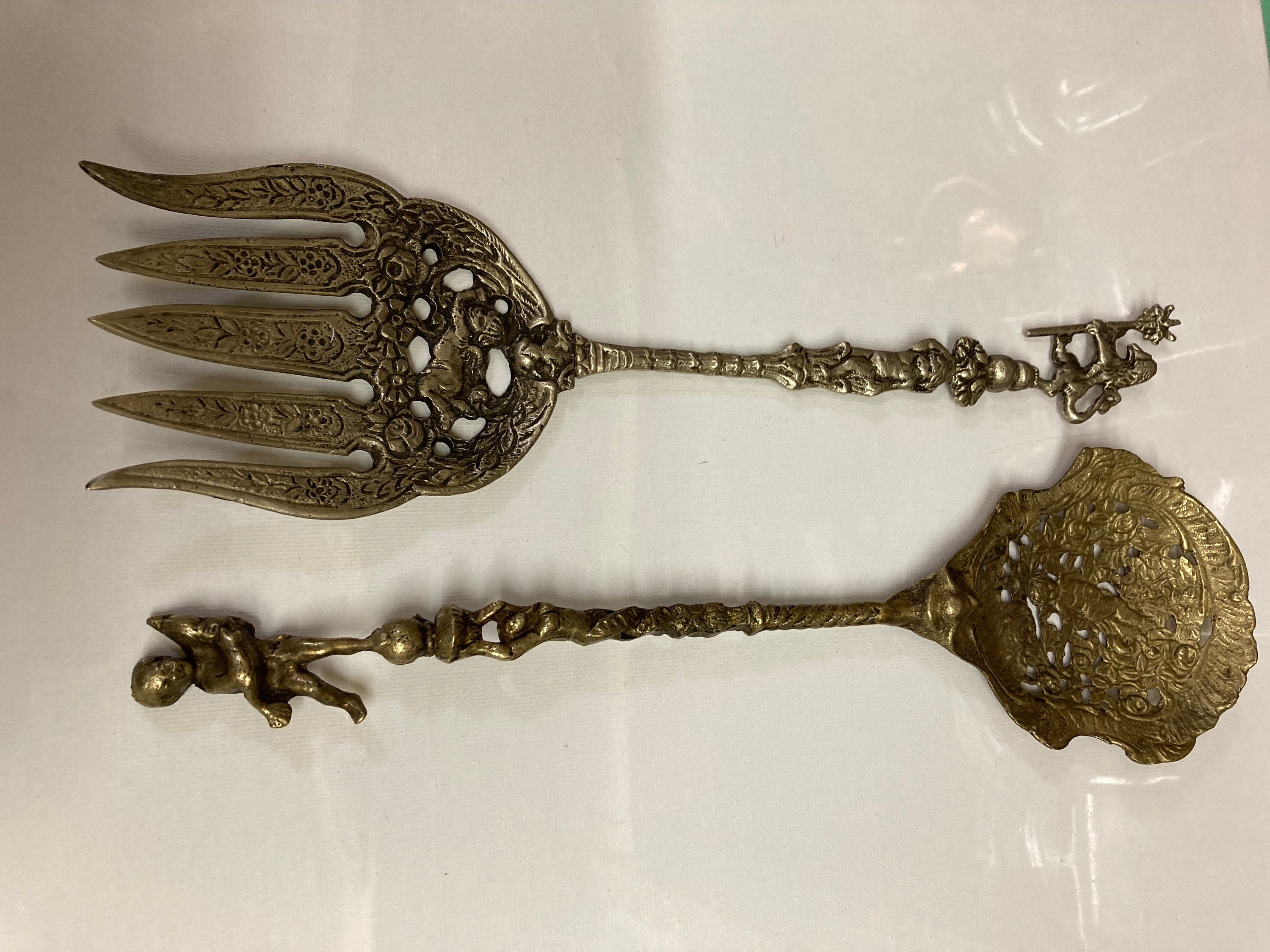 ANTIQUE 10” DECORATIVE ORNATE FORK & SPOON SERVING SET - BRASS