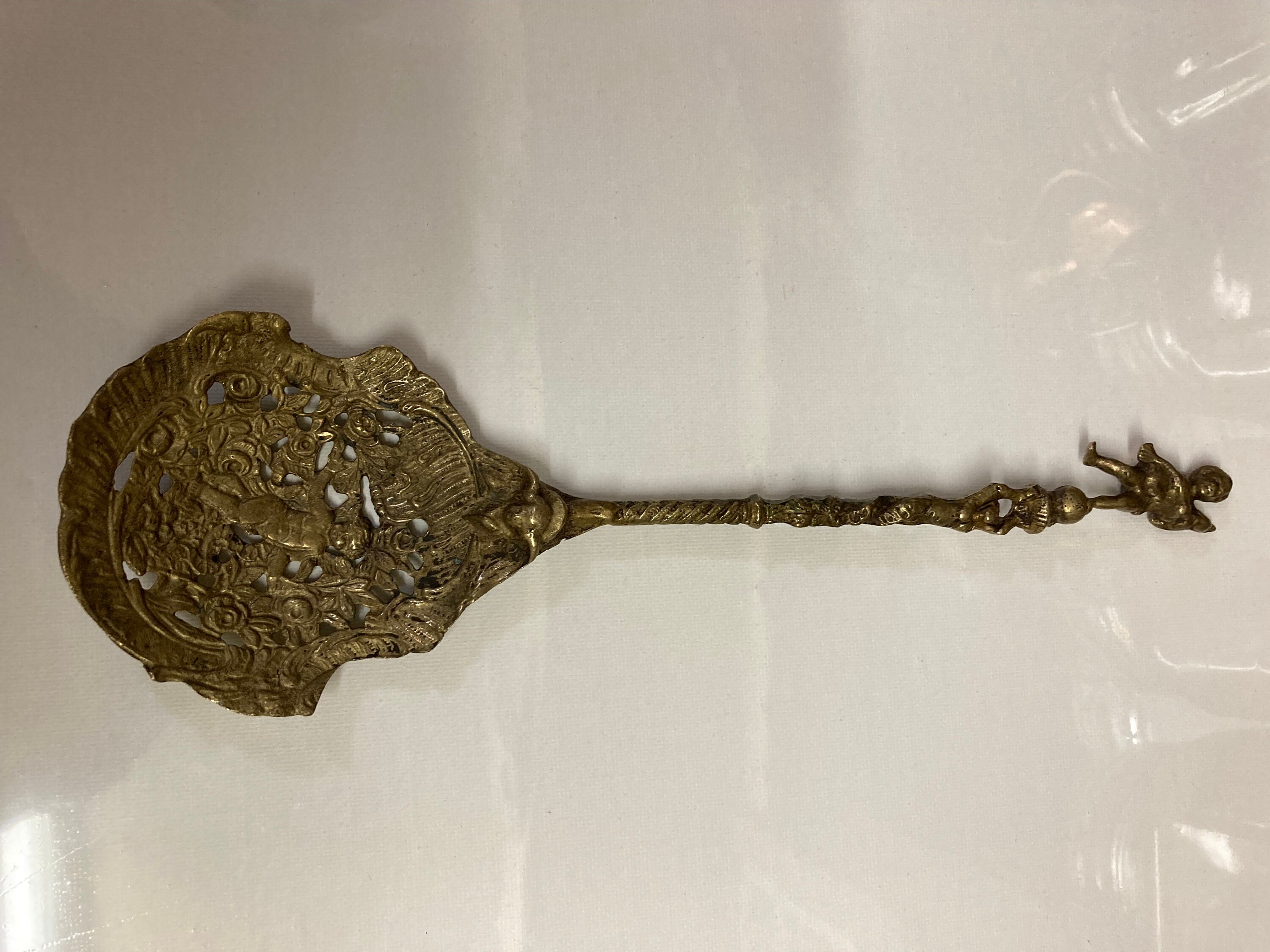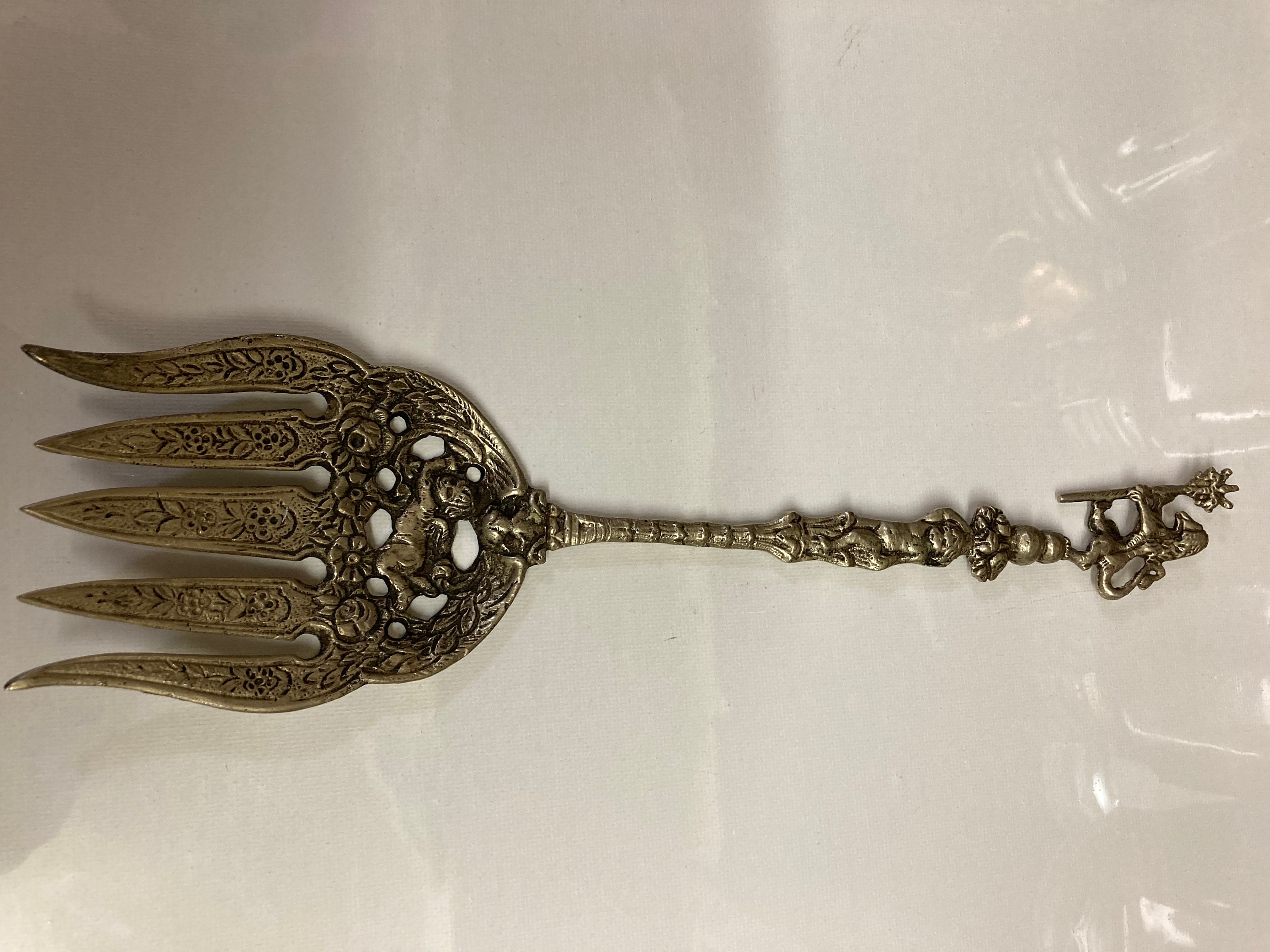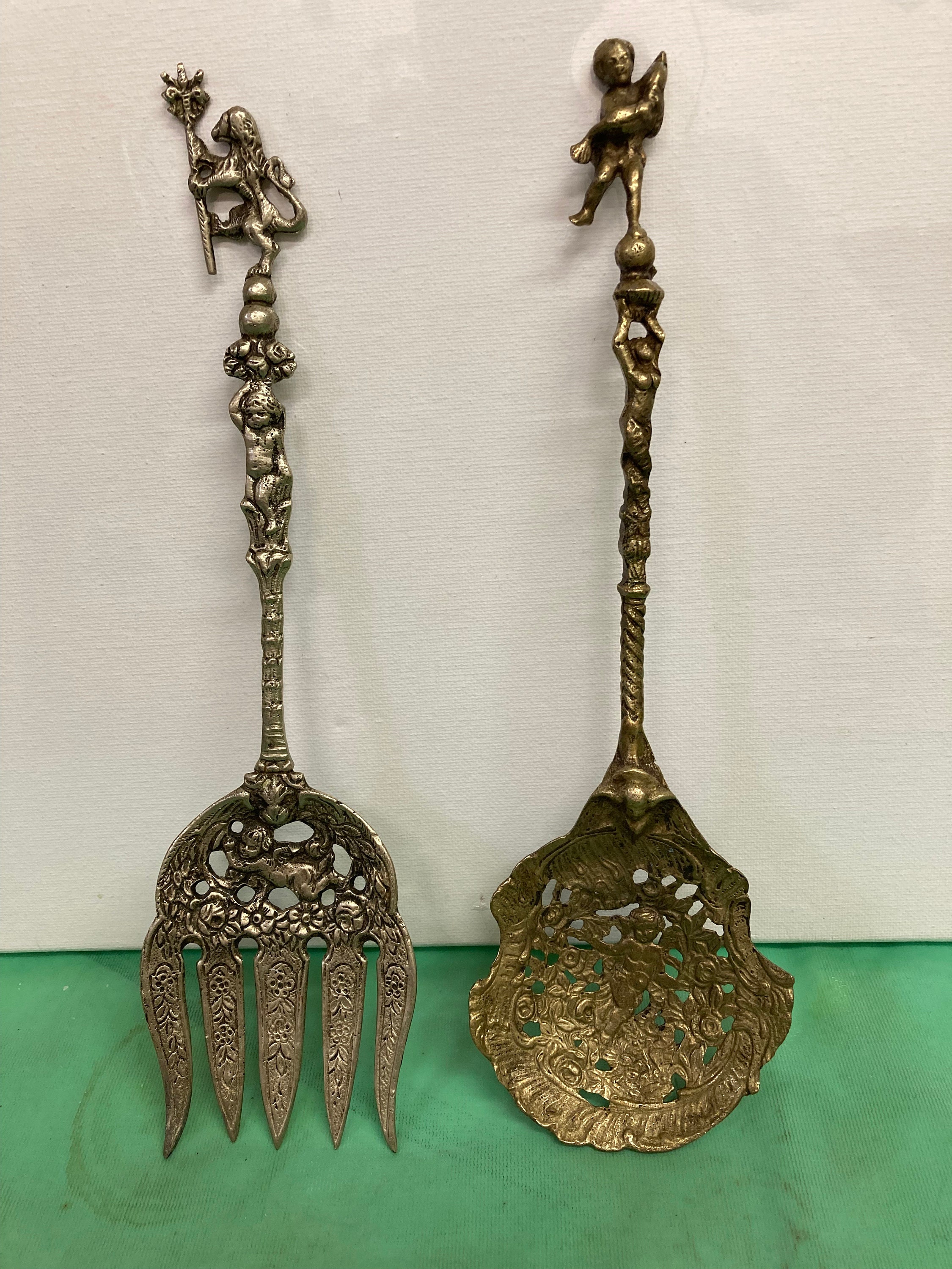 ANTIQUE 10” DECORATIVE ORNATE FORK & SPOON SERVING SET - BRASS