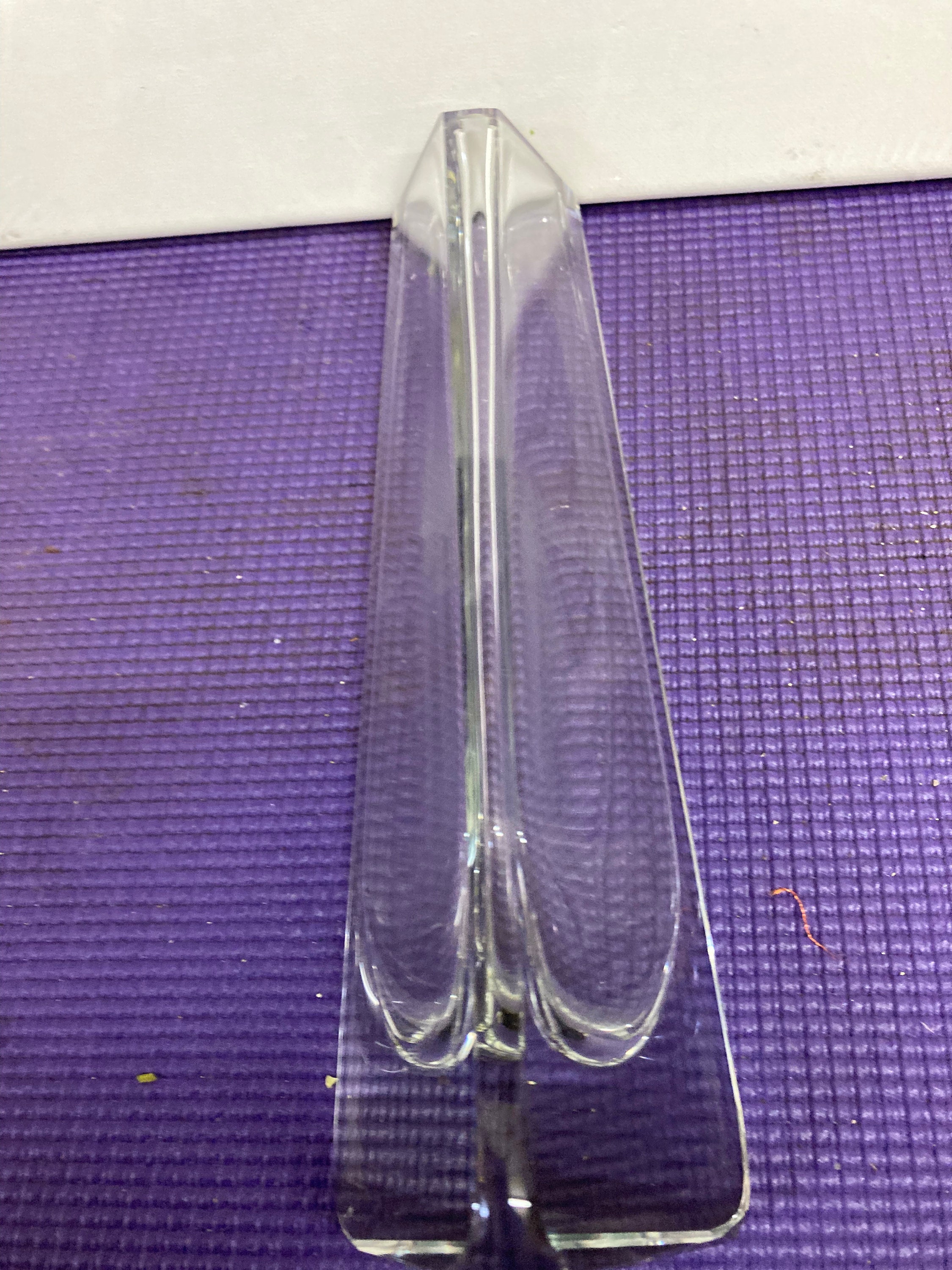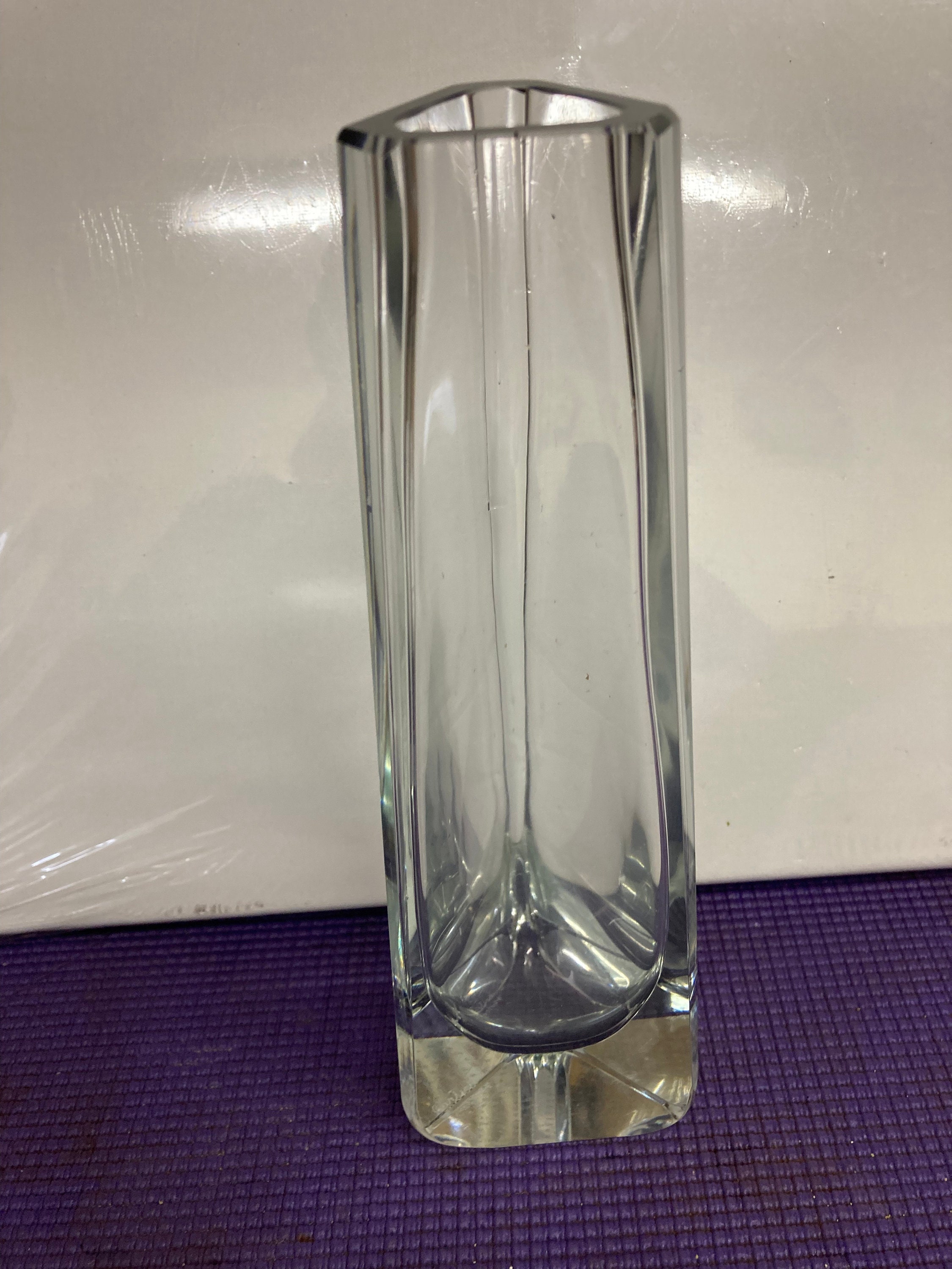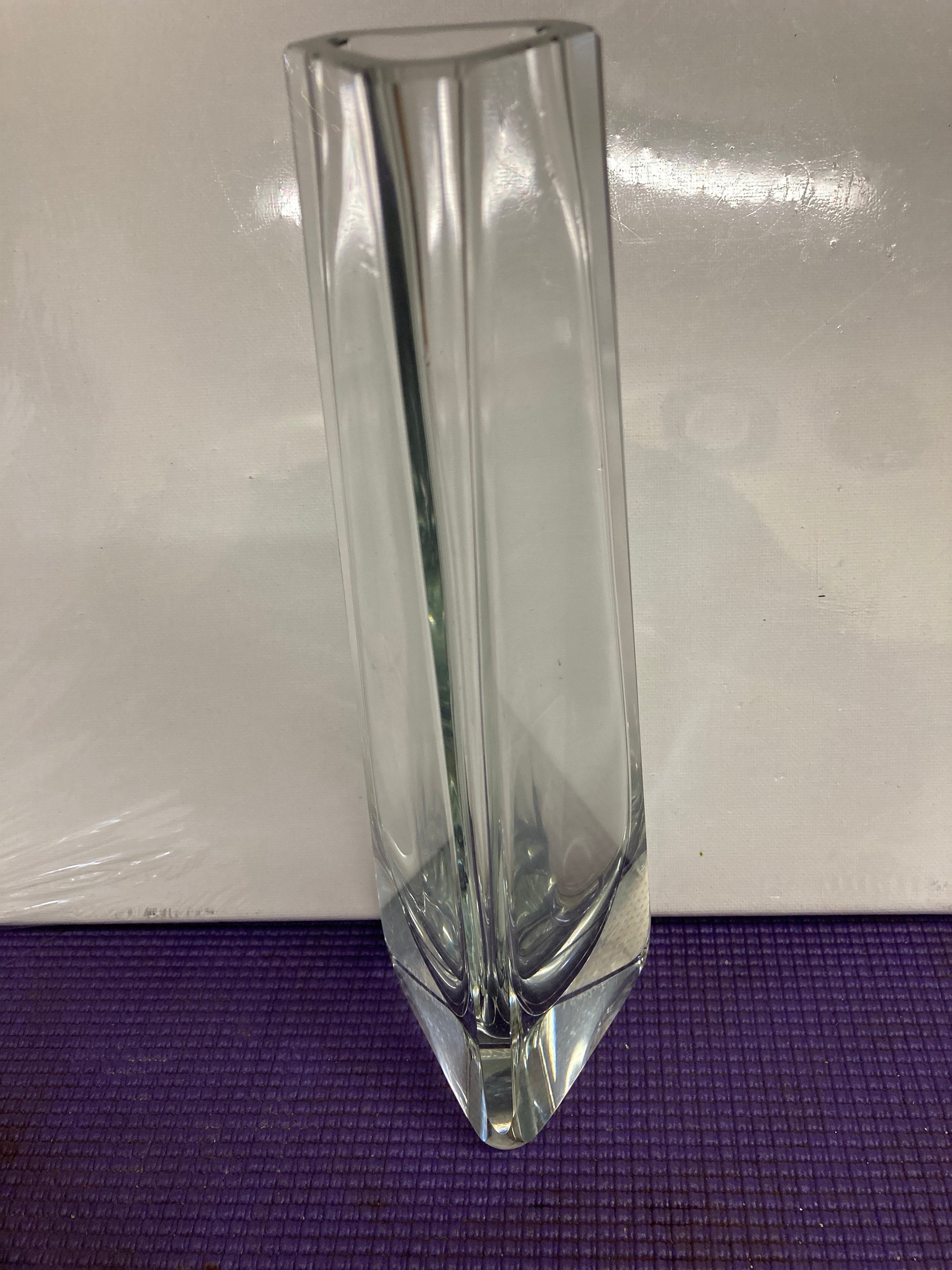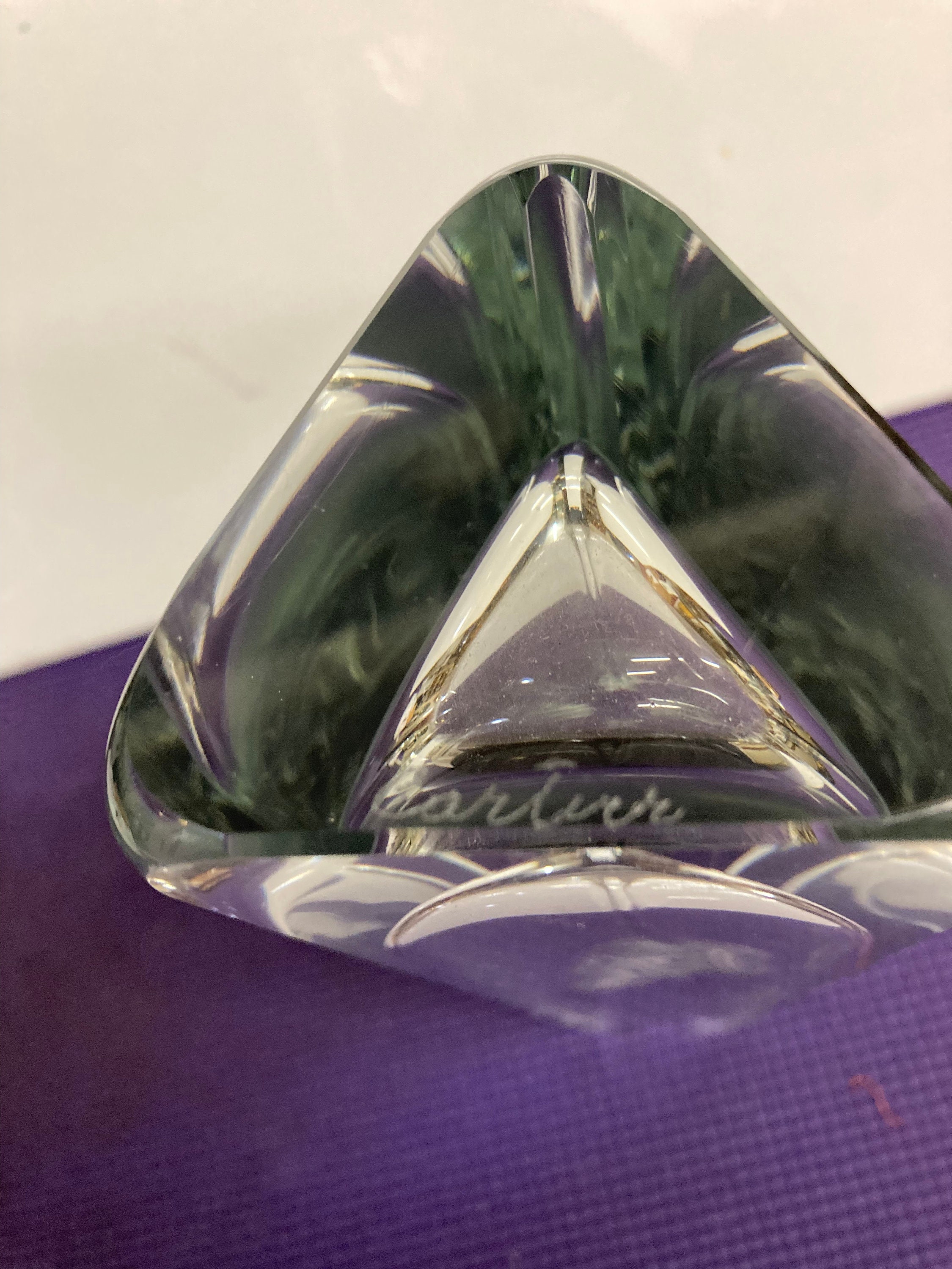 Vintage Cartier 9 1/4 " Triangle Shaped Glass Vase 9 1/4 " tall 3 " wide3" deepExcellent ConditionNo markingsNo scartchesNo chipsNo damagesSigned Cartier at the BottomMade In France